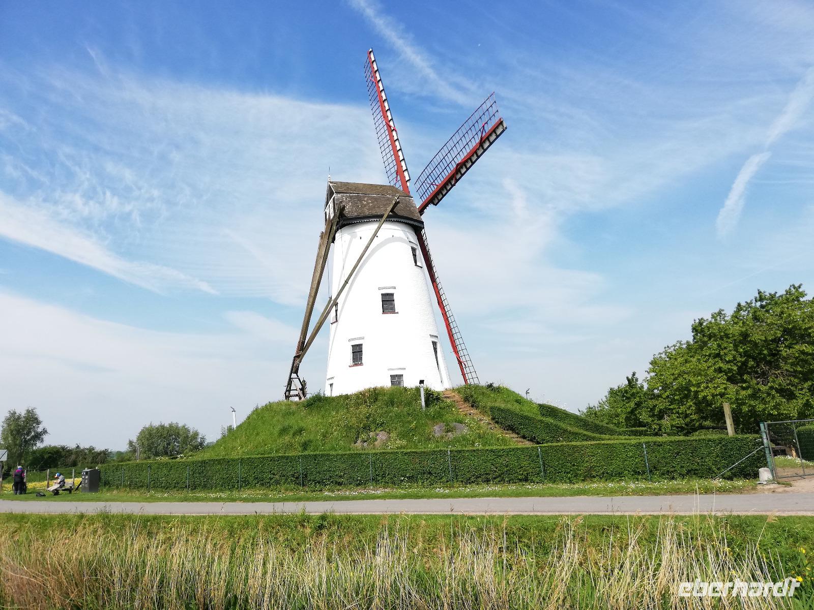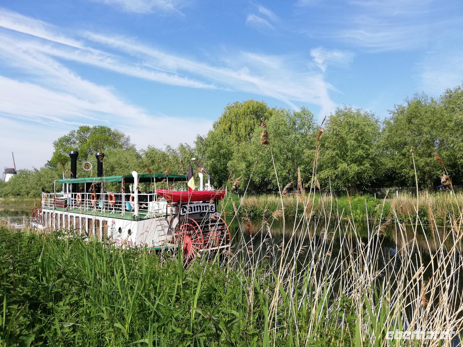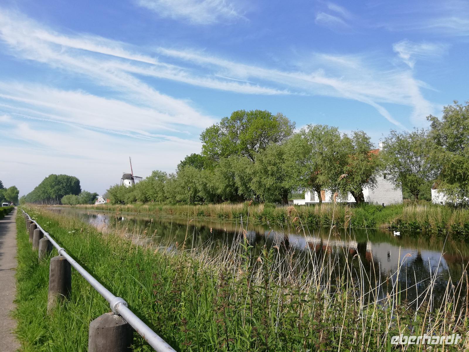 Nach einer reichlichen Stunde treffen wir uns am Kanal zwischen Damme und Brügge wieder. Frank ist schon nach Brügge gefahren. Wir werden mit dem alten Raddampfer Lamme Goedzak (Freund von Till Eulenspiegel) nach Brügge fahren. Es ist ein Erlebnis zwischen den Polderlandschaften die Ruhe zu genießen. Vorbei an einer alten Mühle, teilweise überholen uns Radgruppen. Manchmal grüßt uns auch Till Eulenspiegel. Ein tolles Erlebnis. Wir freuen uns aber auch Frank an unserem Ausstieg wieder zu sehen, um jetzt nach Oostende zu fahren.
