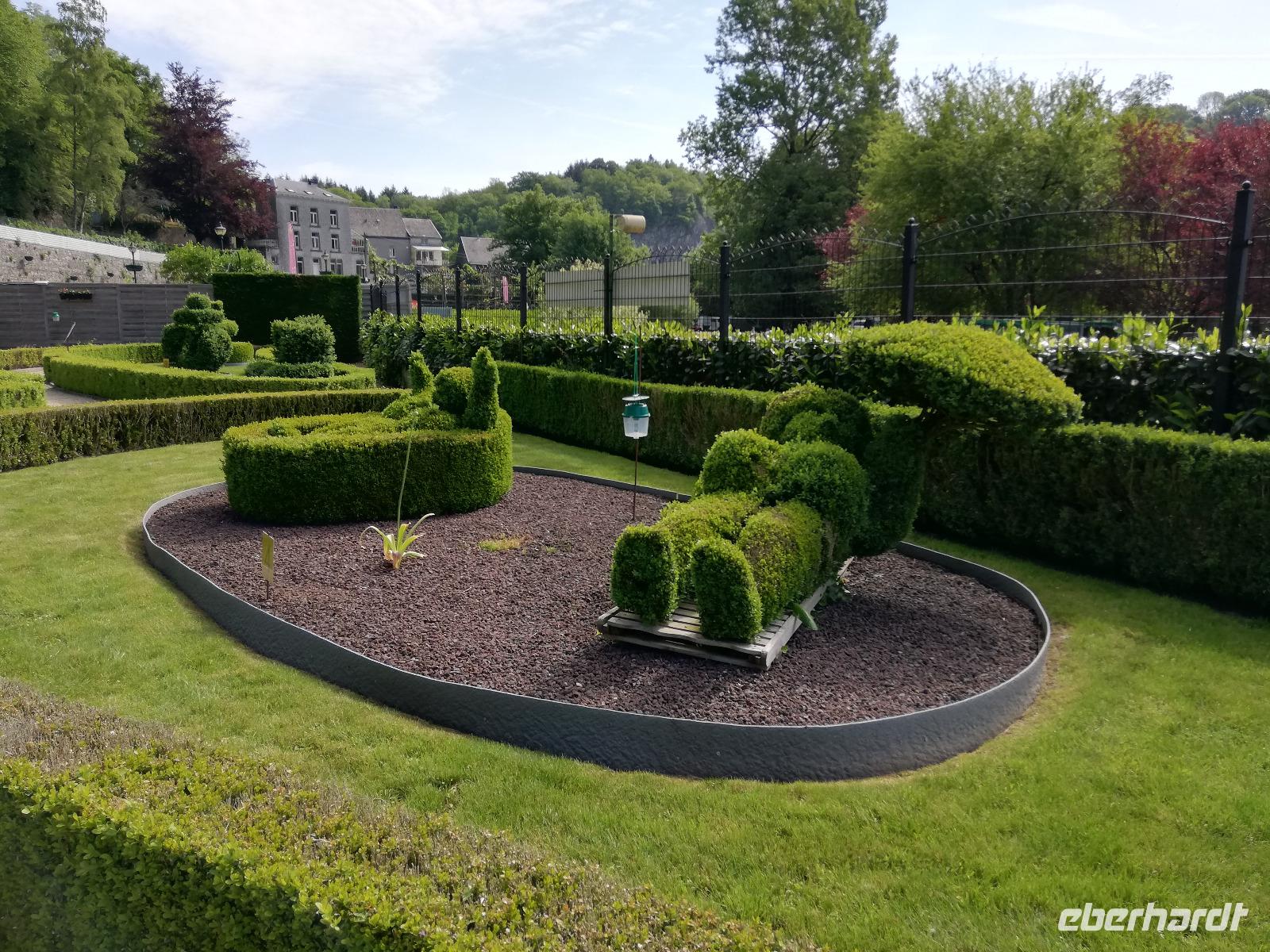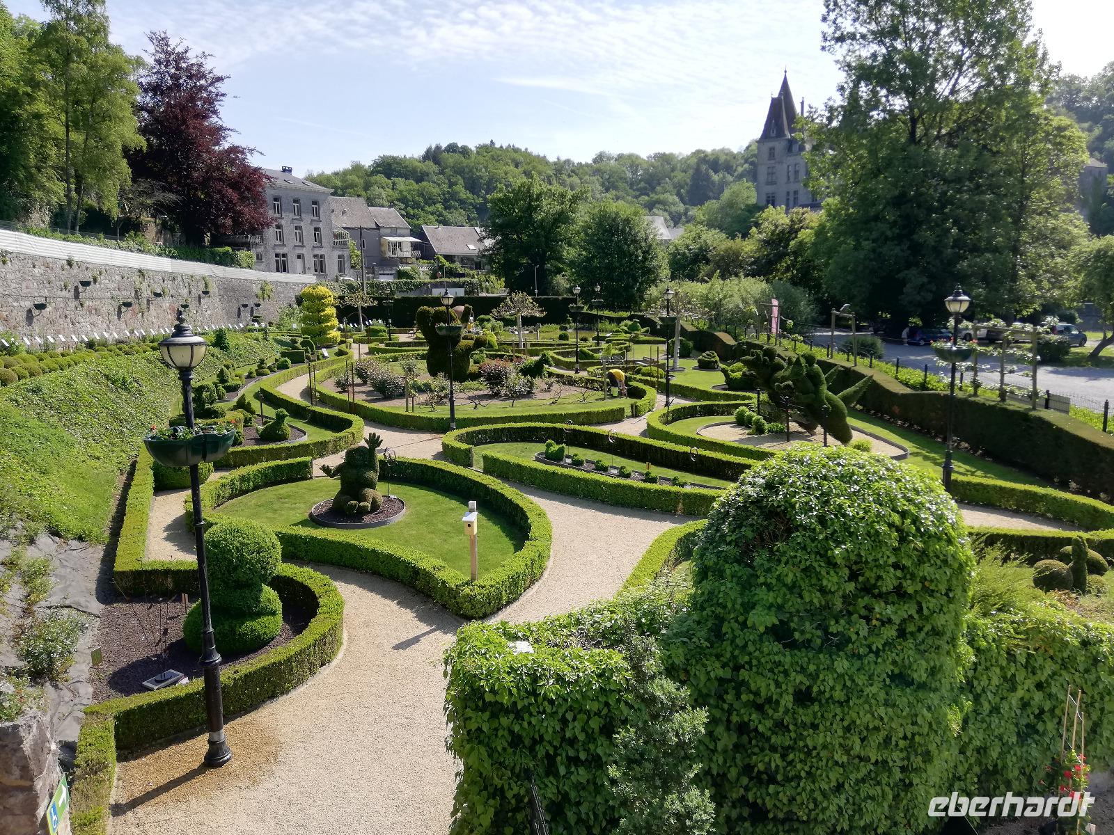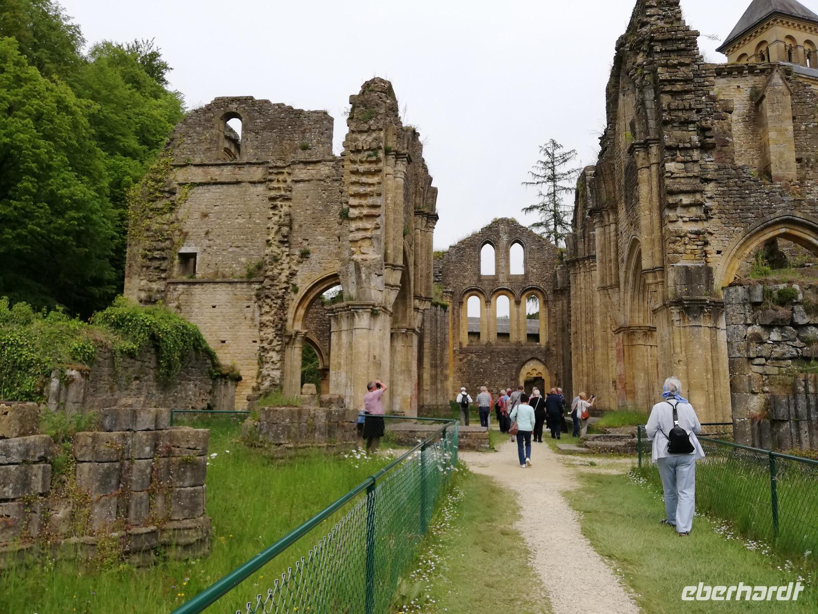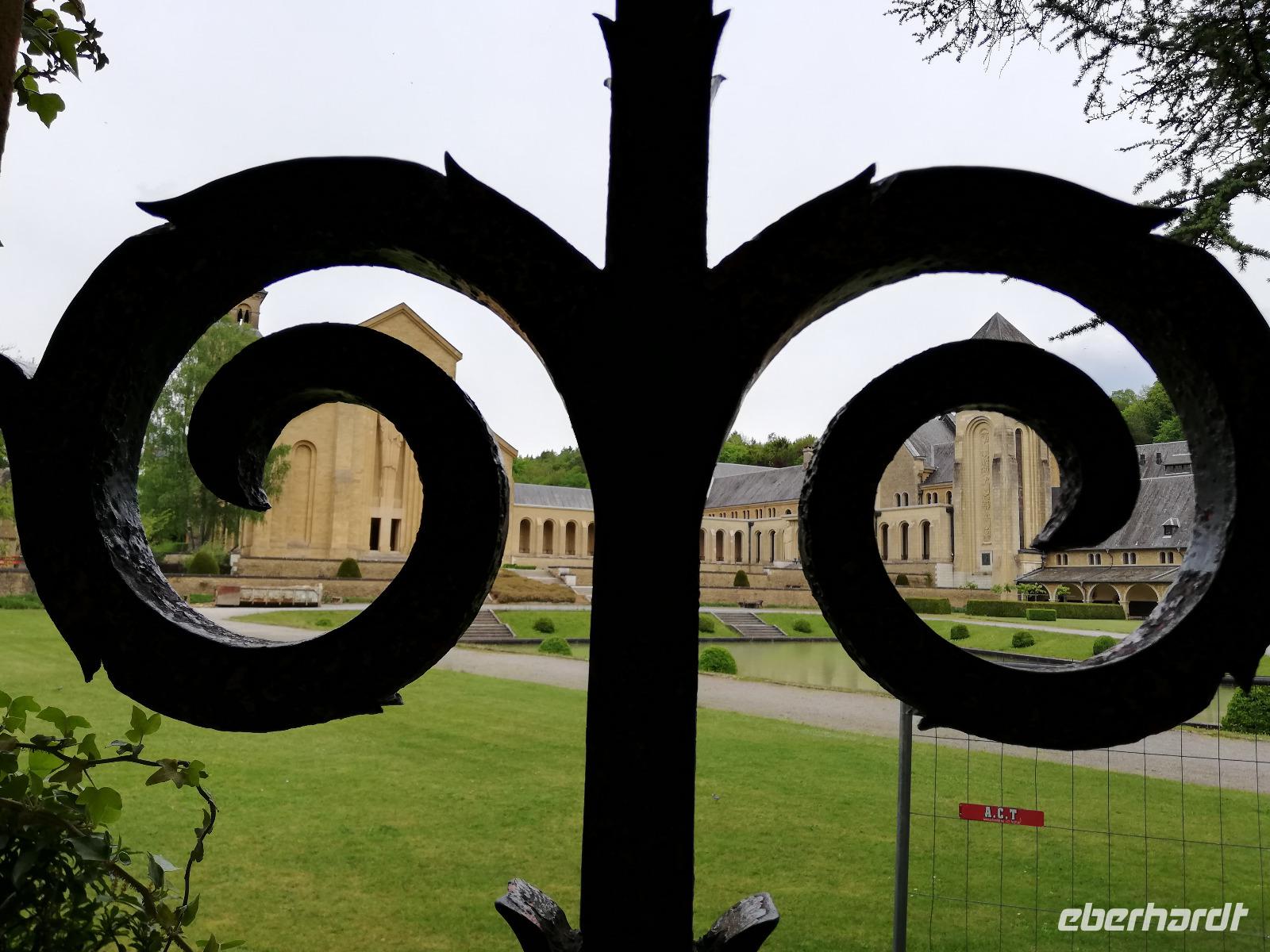 Wir starten zeitig, schon 08.00 Uhr sind die Koffer im Bus, der vor dem Hotel Ibis parken konnte. Wir verabschieden uns von Namur und fahren durch das beeindruckende Maastal. Langsam schlängelt sich der Fluss durch die beeindruckende Landschaft. Unser früher Start lohnt sich, wir können uns auf das Tal konzentrieren ohne das uns viel Verkehr aufhält. Bis Dinant bleiben wir am Fluss doch nun müssen wir auf unsere Zeit achten. Wir fahren nach Durbuy, der kleinsten Stadt der Welt. Obwohl sie nur rund 400 Einwohner hat darf sie sich seit 1331 Stadt nennen.Verwinkelte Gassen, kleine Geschäfte und Restaurants laden ein. Die kleinste Stadt hat aber auch den größten Garten der Welt, der dem Formstutzen gewidmet ist. Sehr unterhaltsam ist dieser Garten, mit geformten Tieren, interessanten Formschnitt der Bäume, wir finden hier eine Galerie und auch ein Kaffee. Wir könnten noch einige Zeit in Durbuy verbringen. Aber unser Programm sieht noch den Besuch der Abtei Orval vor und diesen Besuch möchten wir auf keinen Fall verpassen. Frank wählt für uns eine Strecke abseits der Autobahn aus und damit ist auch eine Pause mitten im Grünen möglich. Danach müssen wir uns aber sputen. Wir möchten unseren Klosterführer nicht wartend lassen. Nach unserer Ankunft nahe der französischen Grenze können wir sofort mit der Führung durch das Kloster beginnen.