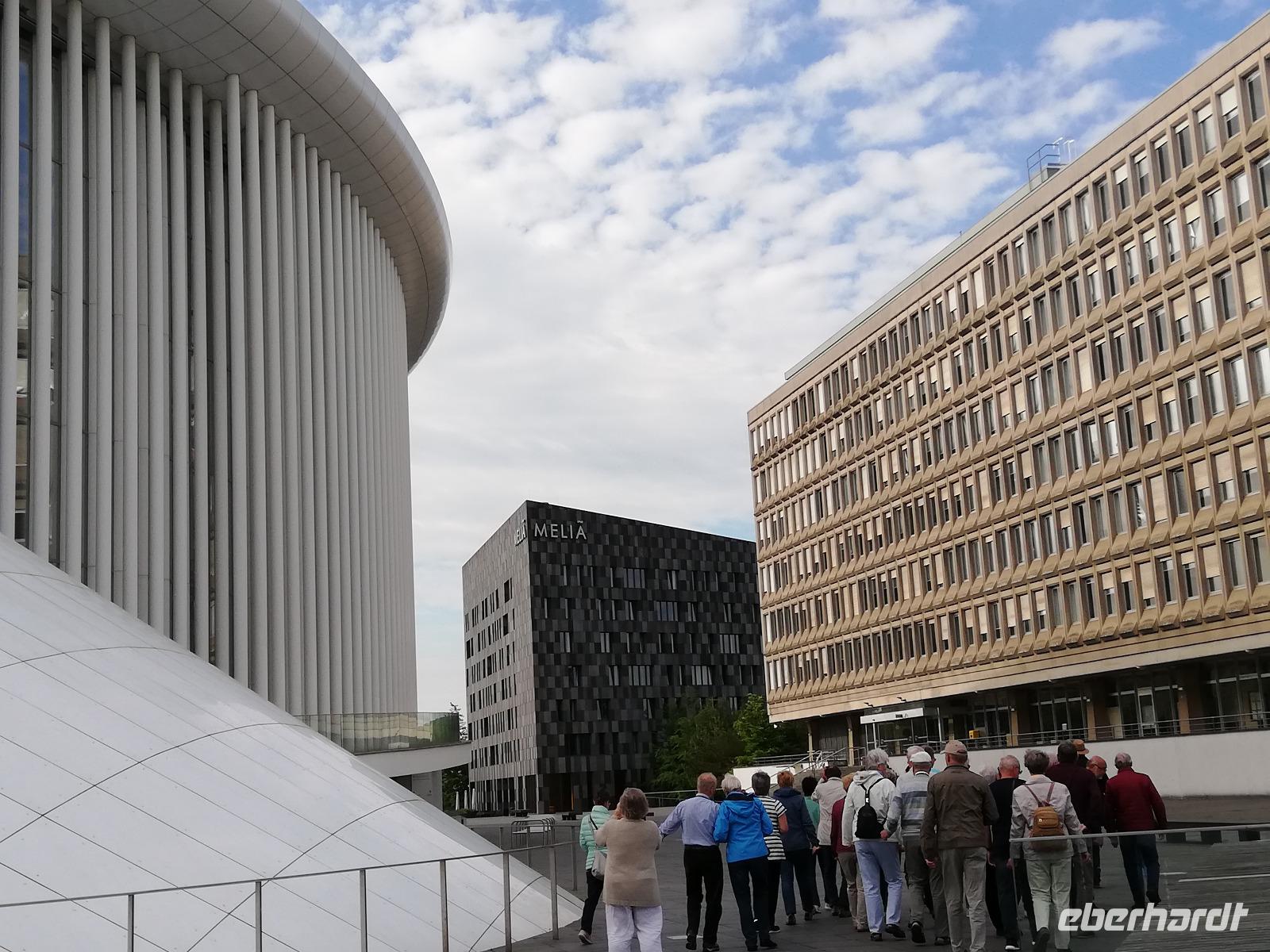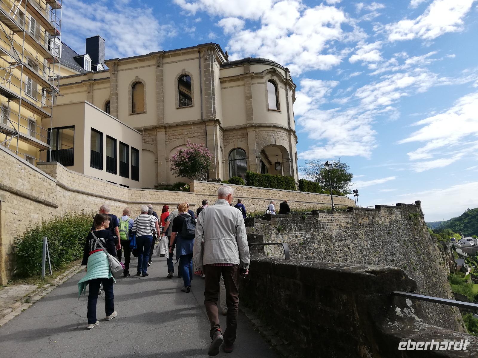 Pierre unser Stadtführer für heute, erwartet und vor dem Hotel und wir beginnen unsere Busrundfahrt.Dabei erfahren wir bereits geschichtliche Zusammenhänge, zur Europastadt Luxemburg und zur Ober-und Unterstadt. Wir fahren bis zur Philharmonie und steigen hier aus um unser Umfeld zu erkunden. Dabei haben wir einen Blick auf den Europäischen Gerichtshof.Wir erfahren viel zur Struktur der Europastadt und einiges von Herrn Junker, der in Luxemburg die Schule besucht hat. Danach fahren wir wieder in die Innenstadt. Wir möchten viel Zeit für die beschauliche Oberstadt aber auch für die beeindruckende Unterstadt haben. Nach unserer Führung bleibt noch Zeit für individuelle Wünsche.für die Stadt Nach dem Mittag treffen wir uns wieder am Hotel und fahren mit dem Bus nach Vianden, eine der schönsten Burgen in Luxemburg