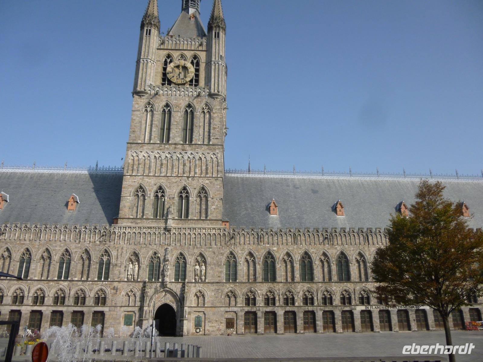 Ieper besitzt wie andere stolze Flanderntuchstädte einen prachtvollen Marktplatz mit Tuchhalle, dem man nicht ansieht, das es ihn 1918 nicht mehr gab. Ieper oder Ypern ist daher auch Synonym für die fürchterlichen sinnlosen Schlachten des ersten Weltkriegs, die im Flandern Fields Museum eindrücklich nahe gebracht werden. In vier Jahren mussten über 900.000 Soldaten ihr Leben lassen, ein täglicher Zapfenstreich 20 Uhr gedenkt ihrer am Menenpoort, wo wir ankamen. Fast 55.000 britische vermisste Tote sind hier namentlich erwähnt und werden mit roten Mohnblumen-Papierkränzen geehrt entsprechend dem Gedicht des britischen Truppenarztes McCrae „In Flandern Fields the poppies blow, Between the crosses, row by row...". Deutsche Soldaten liegen im benachbarten Langemark und Soldaten aus aller Welt werden hier stellvertretend gewürdigt. Wer mag, kann nach unserem Rundgang zum Markt mit Tuchhalle und Martinskirche auch auf den geschliffenen Vauban'schen Festungs-Wällen spazieren gehen.