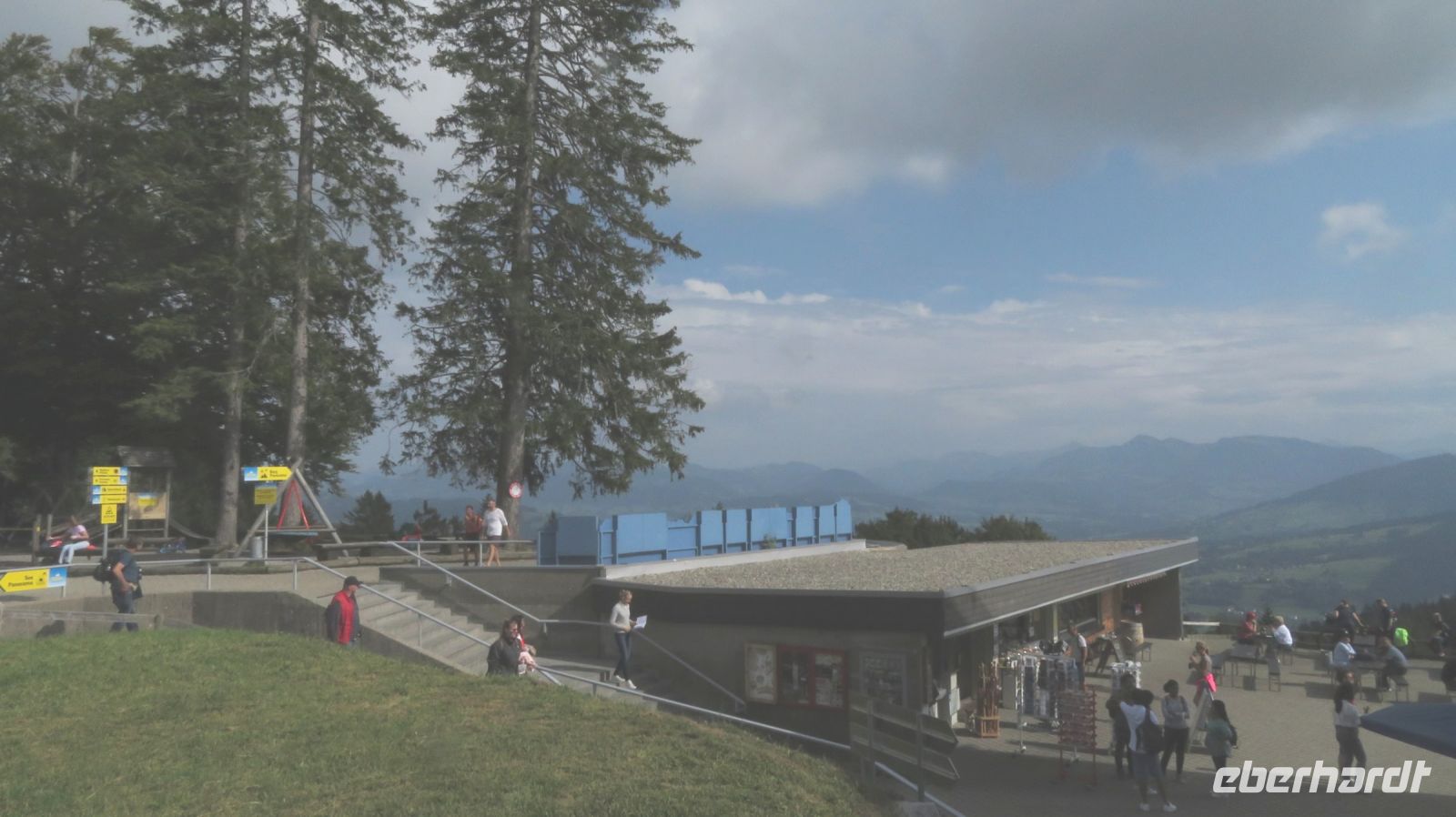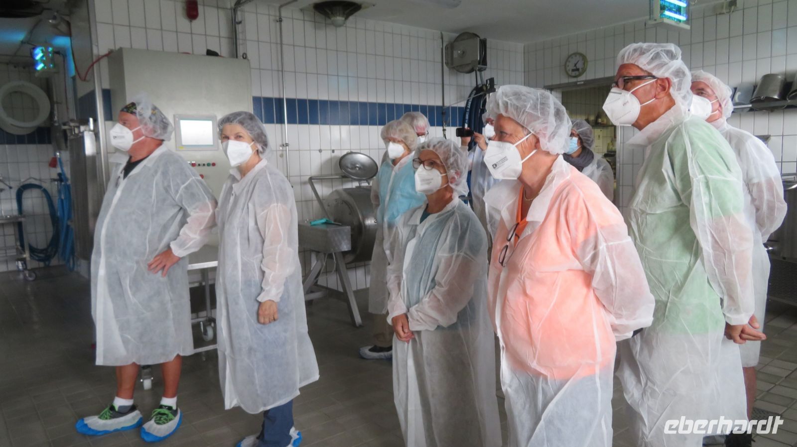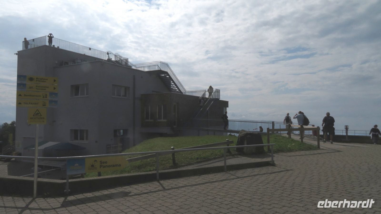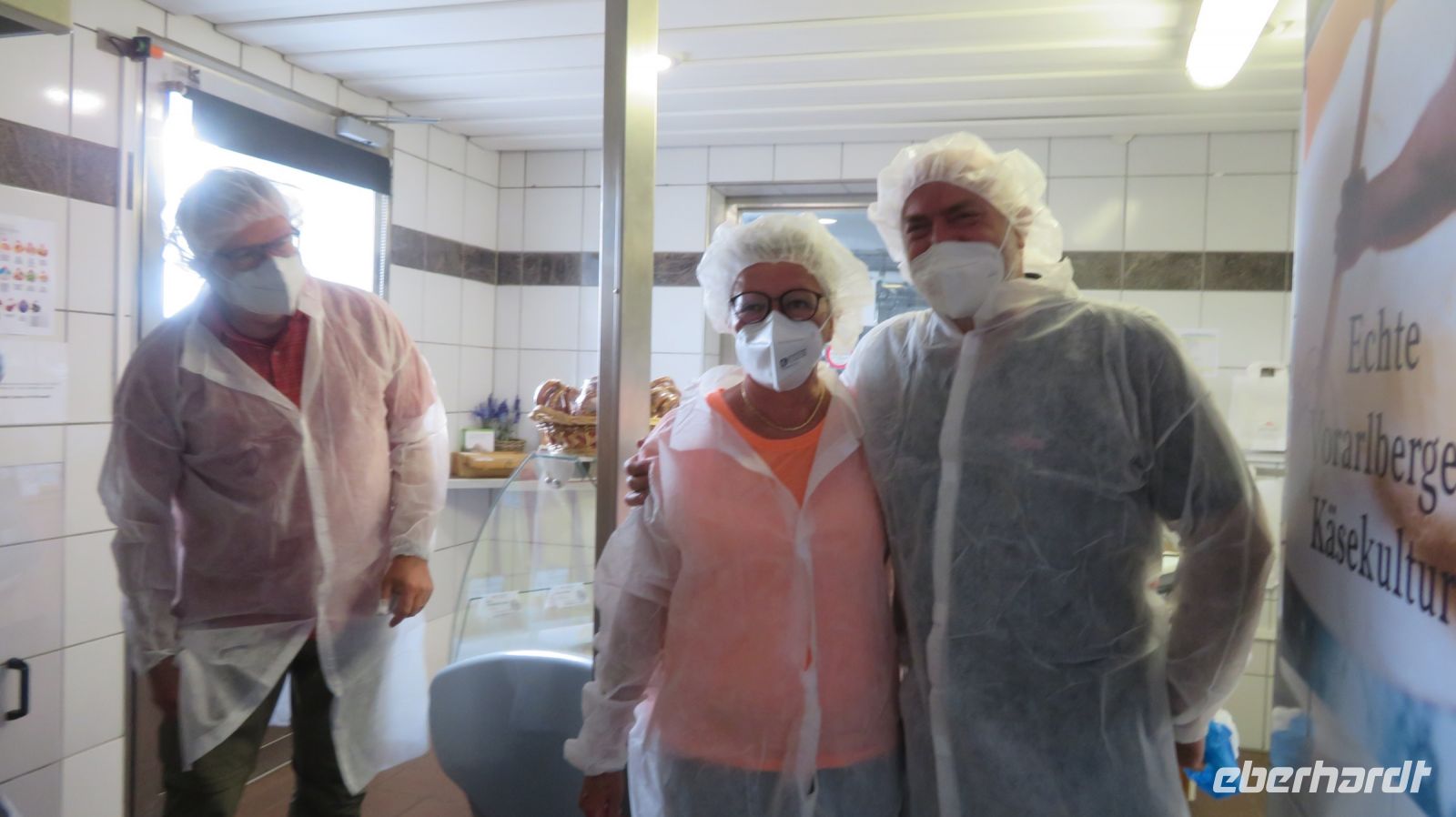 Unseren ersten Wandertag widmen wir dem Hausberg von Bregenz – dem Pfänder. Der 1064m hohe Berg gehört zu den Allgäuer Alpen und ist mit seinem prägnanten Sendemast schon von Weitem zu erkennen. Wir fahren erst einmal mit dem Bus nach Möggers – von der kleinen Gemeinde in Vorarlberg aus beginnen wir unsere Wanderung zum Pfänder hinauf. Wir starten ganz gemächlich am Riedbach entlang in Richtung Hörbranz. Nach ein paar Kilometern nutzen wir auf dem Hochberg eine kleine Rastmöglichkeit und machen es uns auf der Wiese oder der Bank gemütlich um uns etwas zu stärken. Die Sonne hat es inzwischen auch hinter den Wolken hervor geschafft und was fehlt uns jetzt zu unserem Glück? Ein schmackhaftes Schnapserl aus der Region aus den eigens von Doreen kreierten Schnaps“gläschen“. Wir stoßen an auf die Gesundheit und auf erlebnisreiche, gesellige Tage. Bevor es weitergeht, erzählt uns Armin, unser versierter Wanderleiter, noch einige interessante Dinge zur Umgebung und erklärt uns was wir in der Ferne so alles sehen können. Kurze Zeit später wandern wir nun entlang des Käsewanderweges von Josef Rupp. Dieser erstreckt sich auf circa 8 Kilometern oberhalb des schönen Bodensees und einige Tafeln erklären uns wissenswertes über die Erzeugung von Vorarlberger Käse. Die Theorie lassen wir uns dann bei einer kurzweiligen, privaten Führung in der Alma Sennerei zeigen. Nach einer kurzen Einführung über die Landwirtschaft dürfen wir die privaten Räume der Käserei besichtigen und dürfen uns dafür in eine elegante Vollmontur begeben, natürlich gemäß den Hygienevorschriften der Käserei: Häubchen, langer Mantel, Schuhüberzieher und natürlich nicht zu vergessen die Maske. Kaum wiederzuerkennen, aber der Käse war es uns wert. Im Anschluss verkosten wir zweierlei Sorten Käse, dazu etwas Brot und Getränke. Einstimmiger Sieger war der Kräuterkäse, den sich einige dann auch für die nächsten Tage als Stärkung für unterwegs mitnehmen. Nun haben wir unser heutiges Ziel auch bald erreicht – die letzten Kilometer verlaufen nun entlang einer asphaltierten Straße zum Pfänder hinauf. Wir bestaunen und genießen die Aussicht zum See, die zwar etwas diesig, aber dennoch beeindruckend ist.