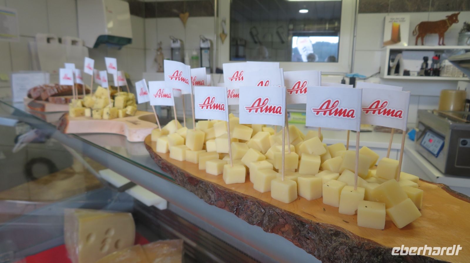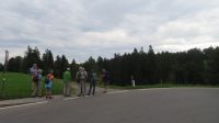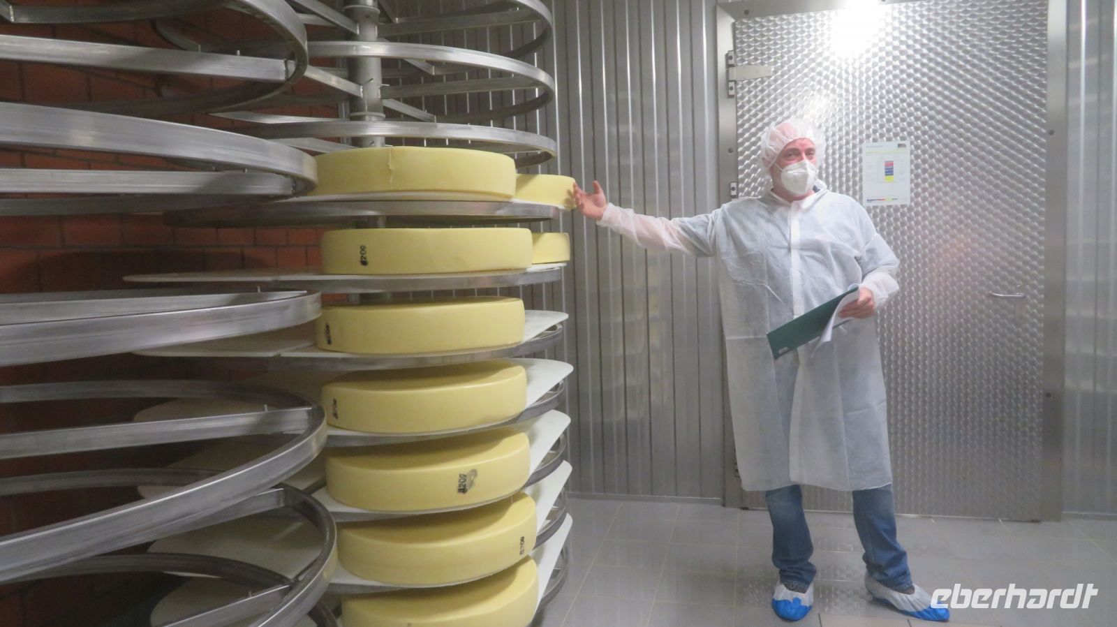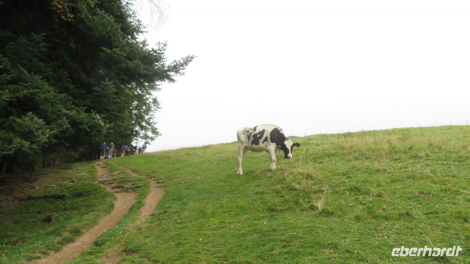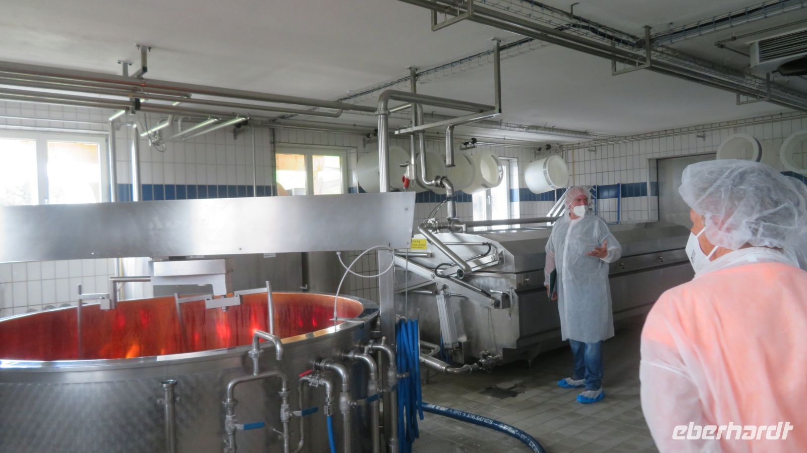 Unseren ersten Wandertag widmen wir dem Hausberg von Bregenz – dem Pfänder. Der 1064m hohe Berg gehört zu den Allgäuer Alpen und ist mit seinem prägnanten Sendemast schon von Weitem zu erkennen. Wir fahren erst einmal mit dem Bus nach Möggers – von der kleinen Gemeinde in Vorarlberg aus beginnen wir unsere Wanderung zum Pfänder hinauf. Wir starten ganz gemächlich am Riedbach entlang in Richtung Hörbranz. Nach ein paar Kilometern nutzen wir auf dem Hochberg eine kleine Rastmöglichkeit und machen es uns auf der Wiese oder der Bank gemütlich um uns etwas zu stärken. Die Sonne hat es inzwischen auch hinter den Wolken hervor geschafft und was fehlt uns jetzt zu unserem Glück? Ein schmackhaftes Schnapserl aus der Region aus den eigens von Doreen kreierten Schnaps“gläschen“. Wir stoßen an auf die Gesundheit und auf erlebnisreiche, gesellige Tage. Bevor es weitergeht, erzählt uns Armin, unser versierter Wanderleiter, noch einige interessante Dinge zur Umgebung und erklärt uns was wir in der Ferne so alles sehen können. Kurze Zeit später wandern wir nun entlang des Käsewanderweges von Josef Rupp. Dieser erstreckt sich auf circa 8 Kilometern oberhalb des schönen Bodensees und einige Tafeln erklären uns wissenswertes über die Erzeugung von Vorarlberger Käse. Die Theorie lassen wir uns dann bei einer kurzweiligen, privaten Führung in der Alma Sennerei zeigen. Nach einer kurzen Einführung über die Landwirtschaft dürfen wir die privaten Räume der Käserei besichtigen und dürfen uns dafür in eine elegante Vollmontur begeben, natürlich gemäß den Hygienevorschriften der Käserei: Häubchen, langer Mantel, Schuhüberzieher und natürlich nicht zu vergessen die Maske. Kaum wiederzuerkennen, aber der Käse war es uns wert. Im Anschluss verkosten wir zweierlei Sorten Käse, dazu etwas Brot und Getränke. Einstimmiger Sieger war der Kräuterkäse, den sich einige dann auch für die nächsten Tage als Stärkung für unterwegs mitnehmen. Nun haben wir unser heutiges Ziel auch bald erreicht – die letzten Kilometer verlaufen nun entlang einer asphaltierten Straße zum Pfänder hinauf. Wir bestaunen und genießen die Aussicht zum See, die zwar etwas diesig, aber dennoch beeindruckend ist.