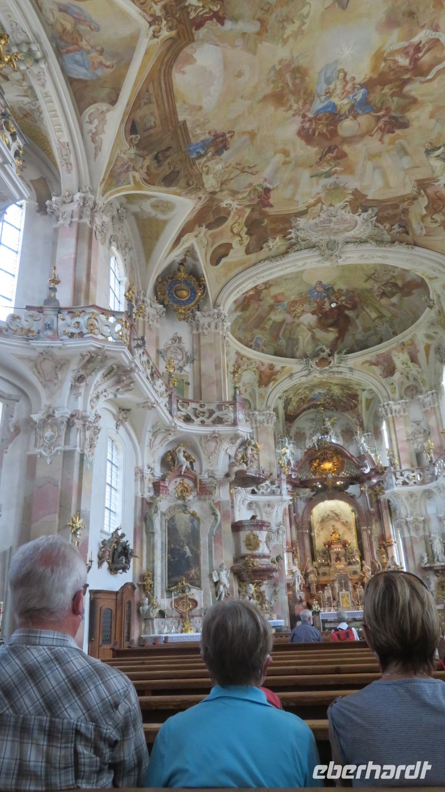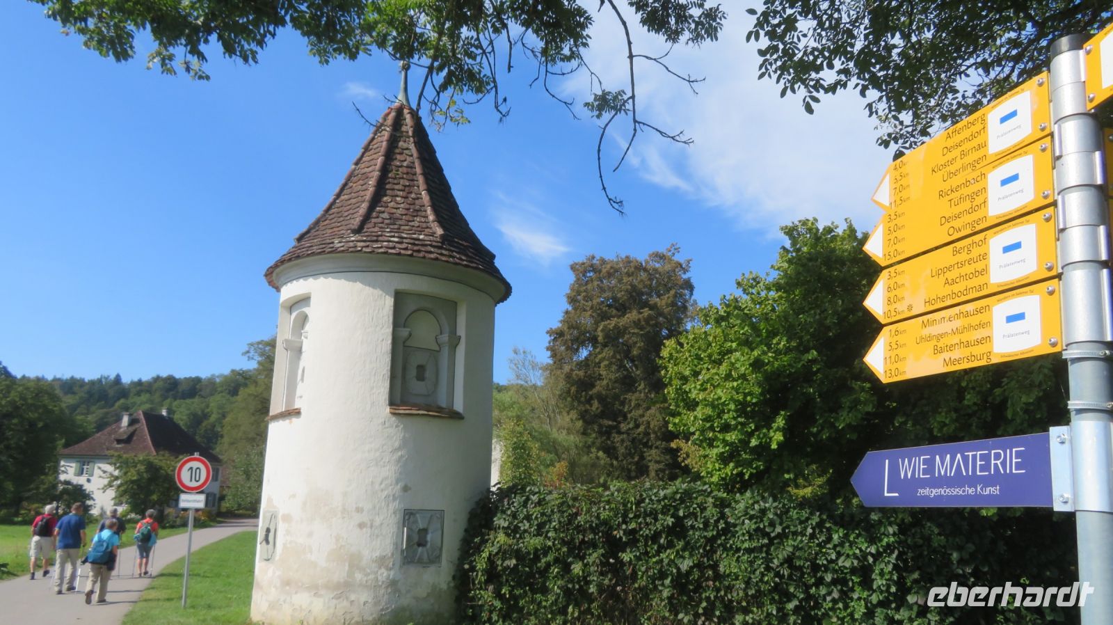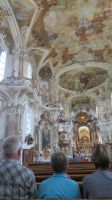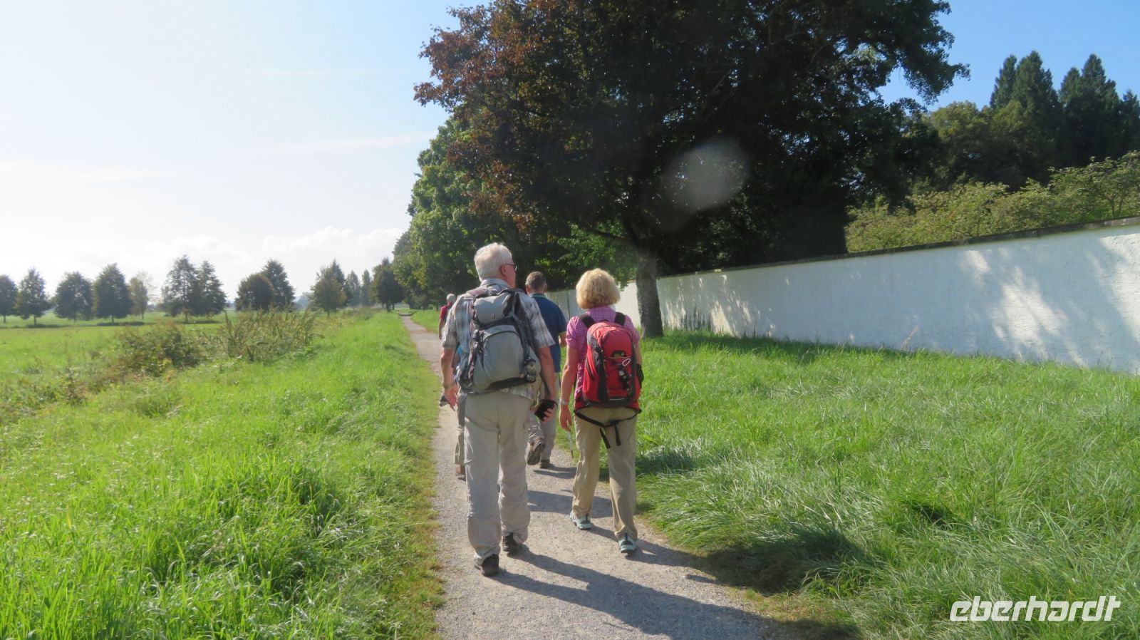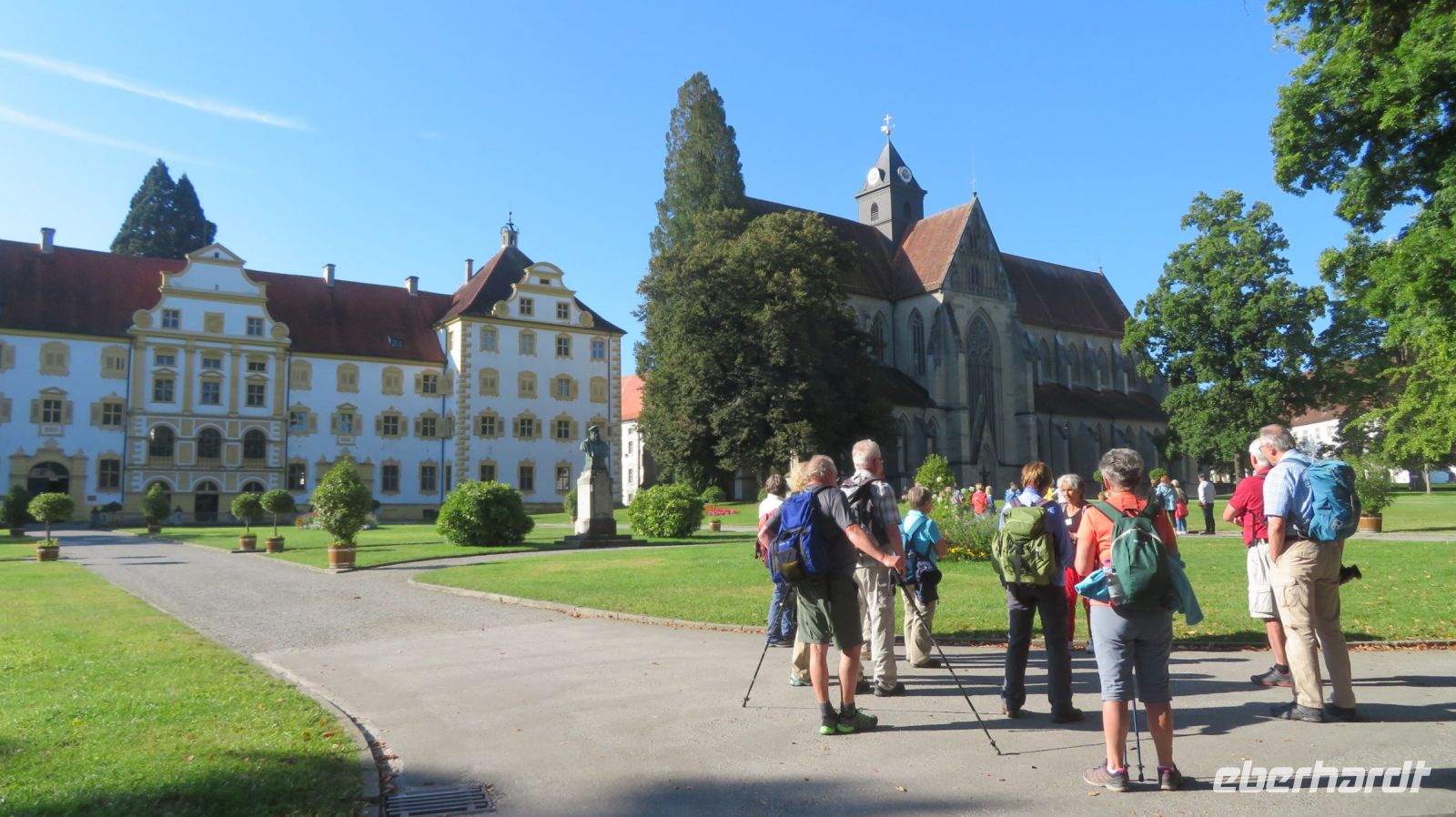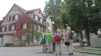 Unseren letzten Wandertag am Bodensee lassen wir ruhig angehen und lassen uns von unserem lieben Fahrer zum Schloss Salem chauffieren, in dem uns eine kleine Schlossführung erwartet. In der einstündigen Fahrt haben wir den Morgennebel überwunden und können nun eines der schönsten Kulturdenkmäler am Bodensee mit seiner großzügigen Park- und Schlossanlage kennenlernen. Die Reichsabtei war früher ein Zisterzienserkloster und ist noch heute Familiensitz des Markgrafen von Baden. Es beherbergt neben einer Schule diverse Kunsthandwerkerläden, Museen, eine Obstbrennerei, einen barocken Marstall sowie eine Goldschmiede. Wir besichtigen im Rahmen unserer Führung den Hofgarten, das gotische Münster mit seiner klassizistischen Alabasterausstattung, den ehemaligen Speisesaal der Mönche und den Kreuzgang. Anschließend schnüren wir die Wanderschuhe und „bezwingen“ den früheren Wirtschaftsweg des Klosters, der durch den Bau der Wallfahrtskirche Birnau auch als Pilgerweg genutzt wurde. Es geht also gemütlich durch Apfelhaine und Wiesen immer in Richtung Bodensee. Auf halber Strecke laufen wir am sogenannten Affenberg vorbei – 200 Berberaffen tummeln sich in Deutschlands größtem Affenfreigehege. Wir beobachten noch die Kolonie der Weißstörche, die es sich auf den Dächern des Mendlishauser Hofes gemütlich gemacht haben. Nun geht es munter weiter in Richtung Wallfahrtskirche Birnau, die war nach gut einer halben Stunde erreichen. Noch schnell die Unterführung der B31 passiert und schon haben wir einen fantastischen Blick auf den Bodensee, die vielen Segelboote und vor allem auf die imposante Klosterkirche St. Marien. Unser Armin erzählt uns einige interessante Dinge darüber, bevor wir auch die barocke Innenausstattung mit Fresken und Stuckaturen bestaunen. Wir genießen noch einmal das herrliche Panorama, bevor wir diesen gelungenen Wandertag im Birnauer Oberhof bei regionalem Wein und Flammkuchen gesellig ausklingen lassen.