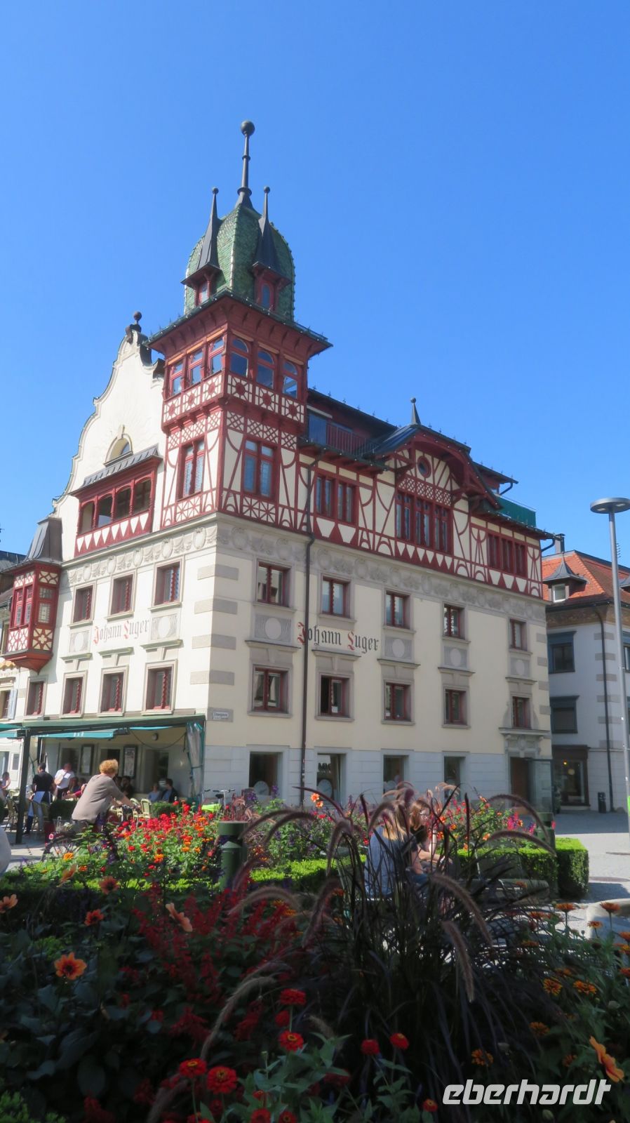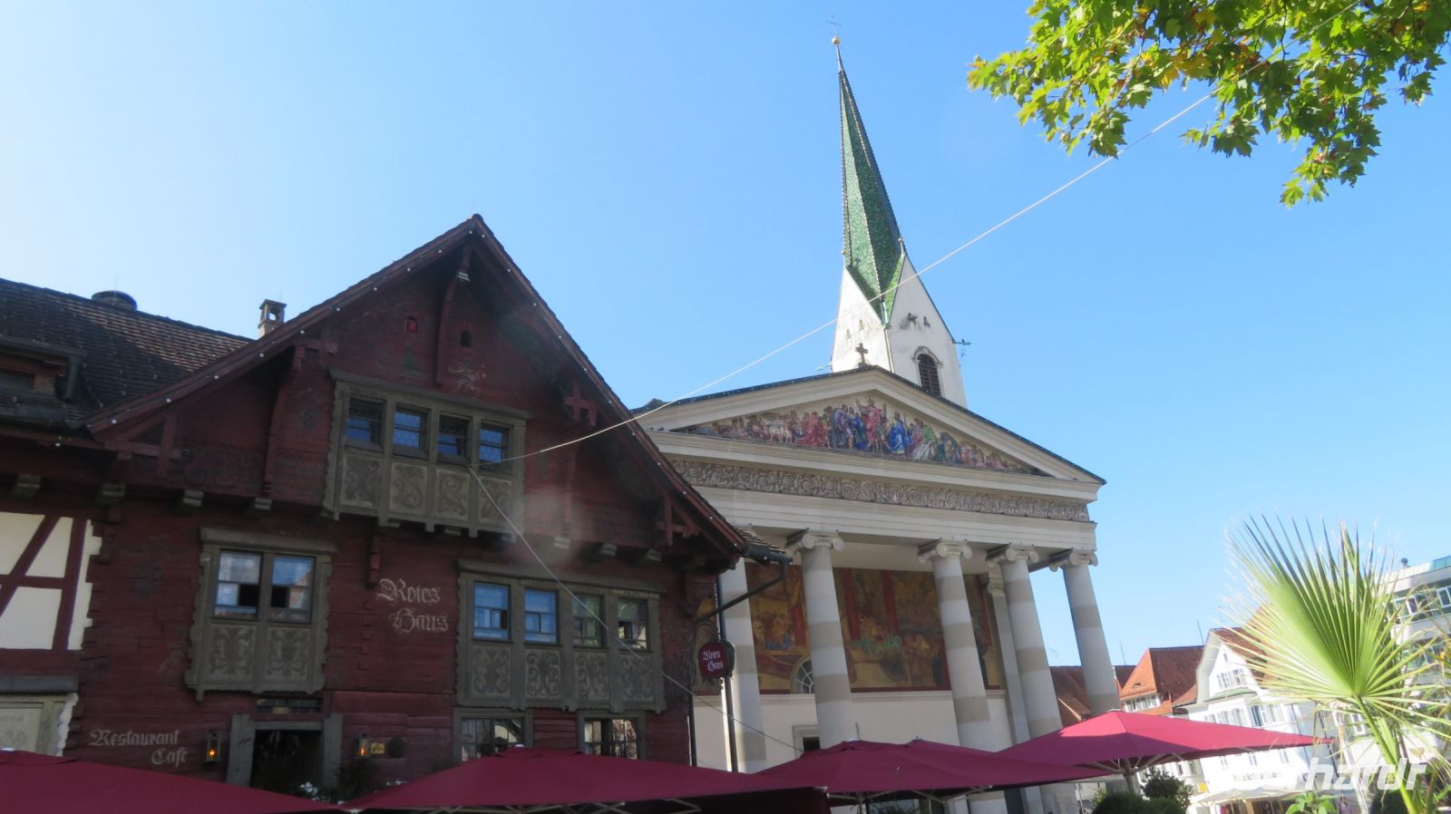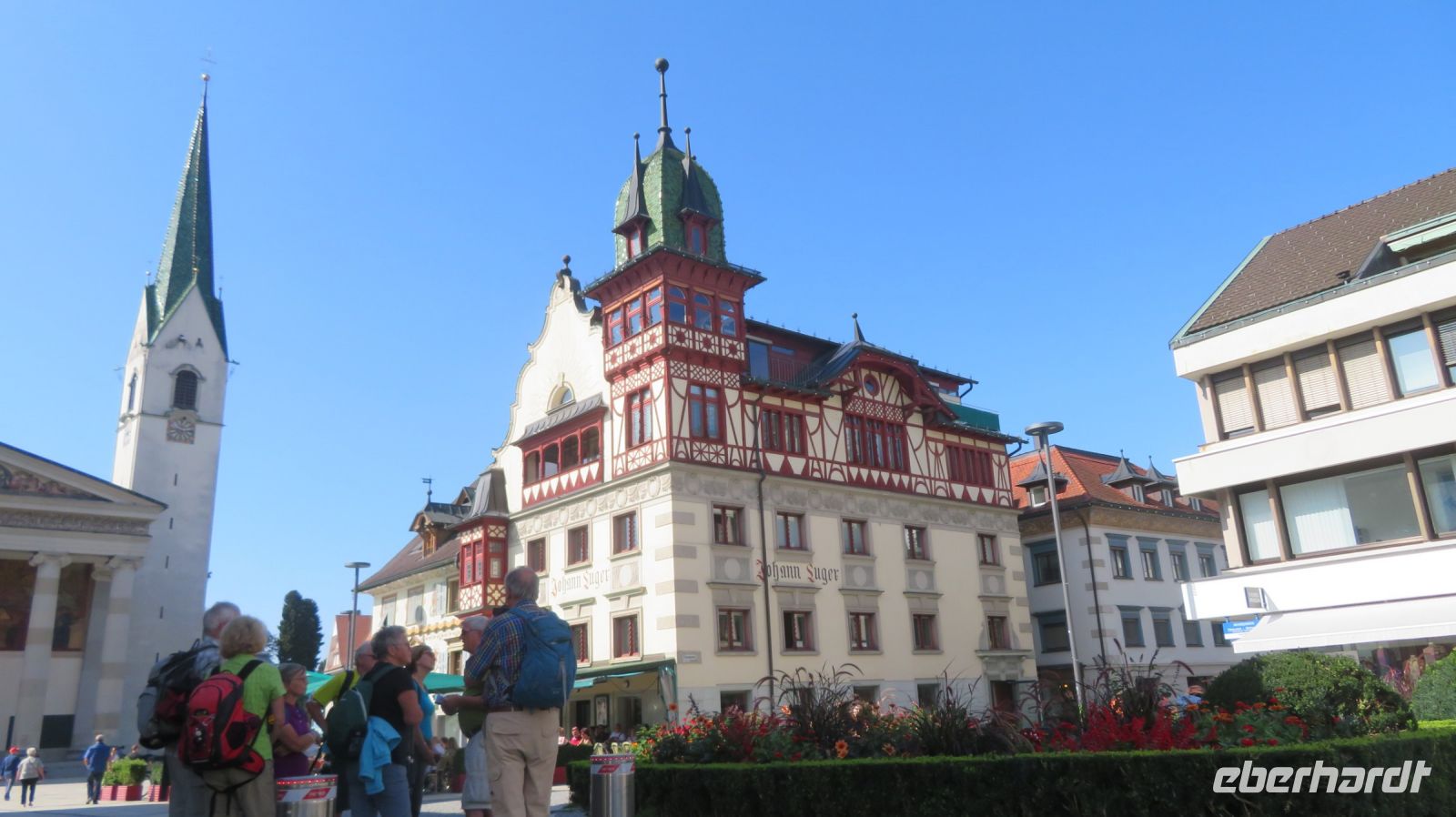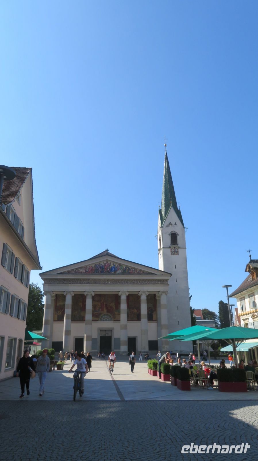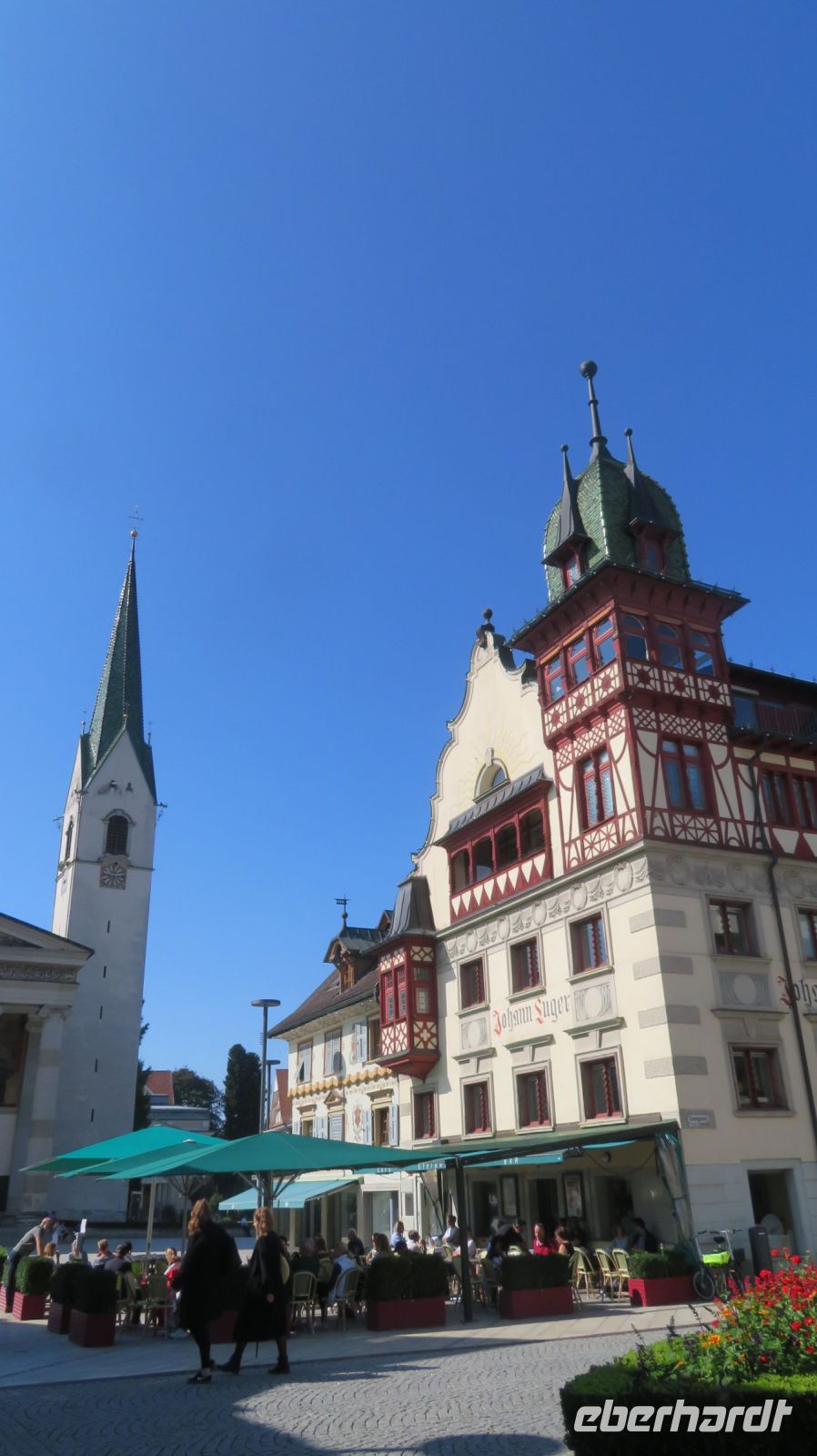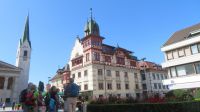 Vom Bahnhof kommend, laufen wir direkt zum urigen Marktplatz mit seinem Stadtarchiv, dem Johann-Luger-Haus und dem Roten Haus. Uns fällt aber besonders die Stadtpfarrkirche St. Martin ins Auge, denn das einschiffige Gebäude mit seinem tempelartigen Eingang gilt als das größte und bedeutendsten Vorarlbergs. Sechs mächtige Säulen und ein riesiges Gemälde über dem Eingang laden zum Bestaunen ein. Selbstverständlich darf der obligatorische Kirchturm nicht fehlen, aber der wirkt im Gegensatz zum restlichen Teil eher bescheiden. Wir lernen in Armins interessanten Ausführungen eine Menge über diese beschauliche Stadt im Vorarlberg kennen. Mit dem Zug fahren wir nach Bregenz zurück und haben nun noch etwas Zeit diesen tollen Tag Revue passieren zu lassen.