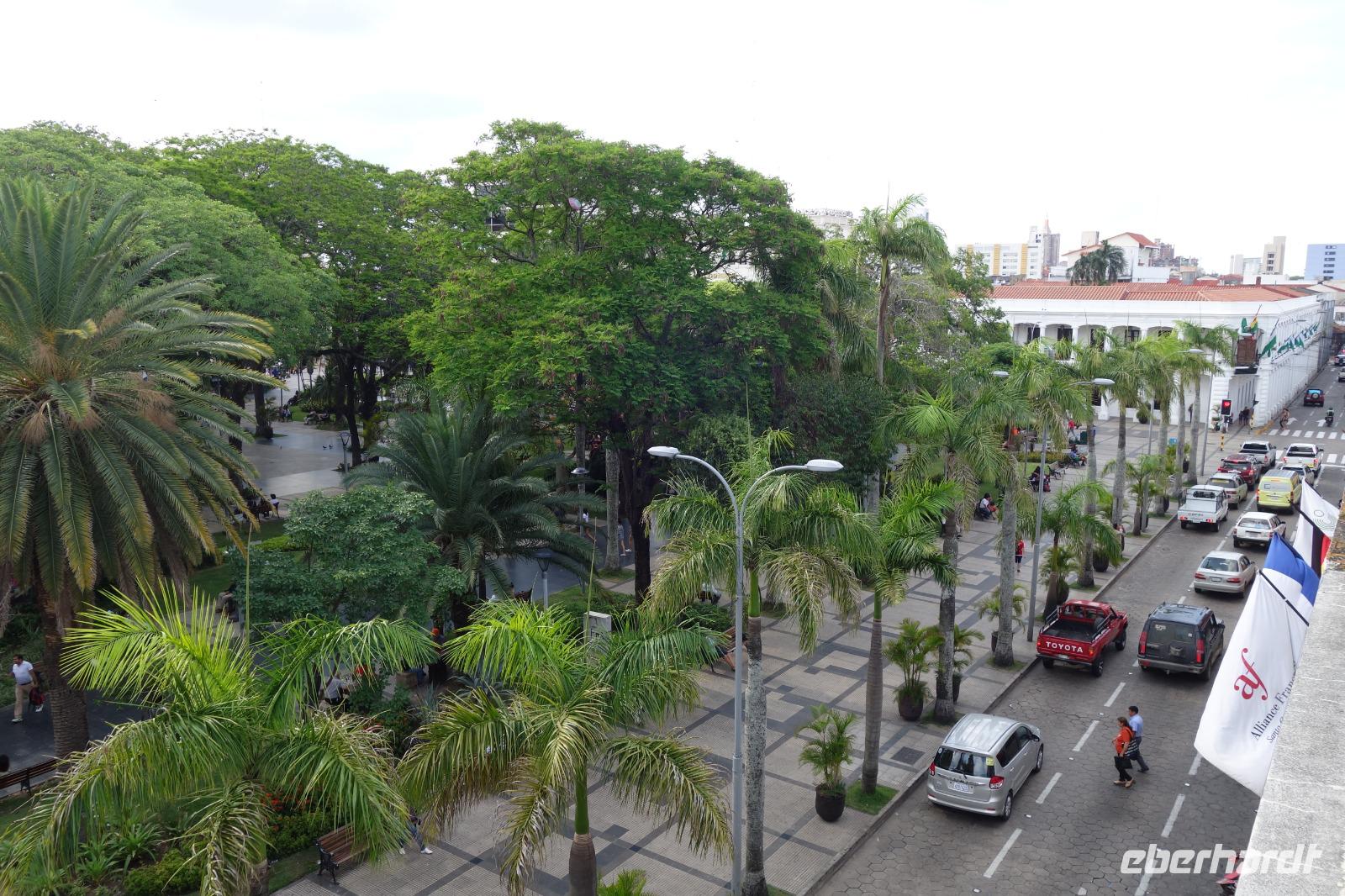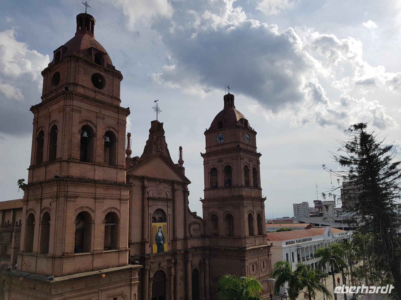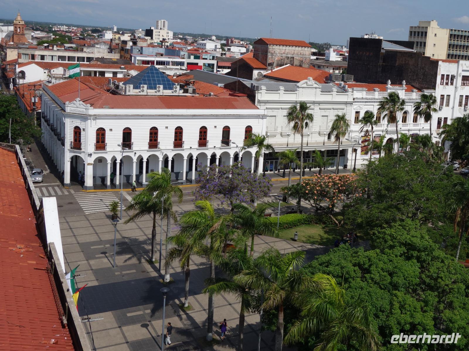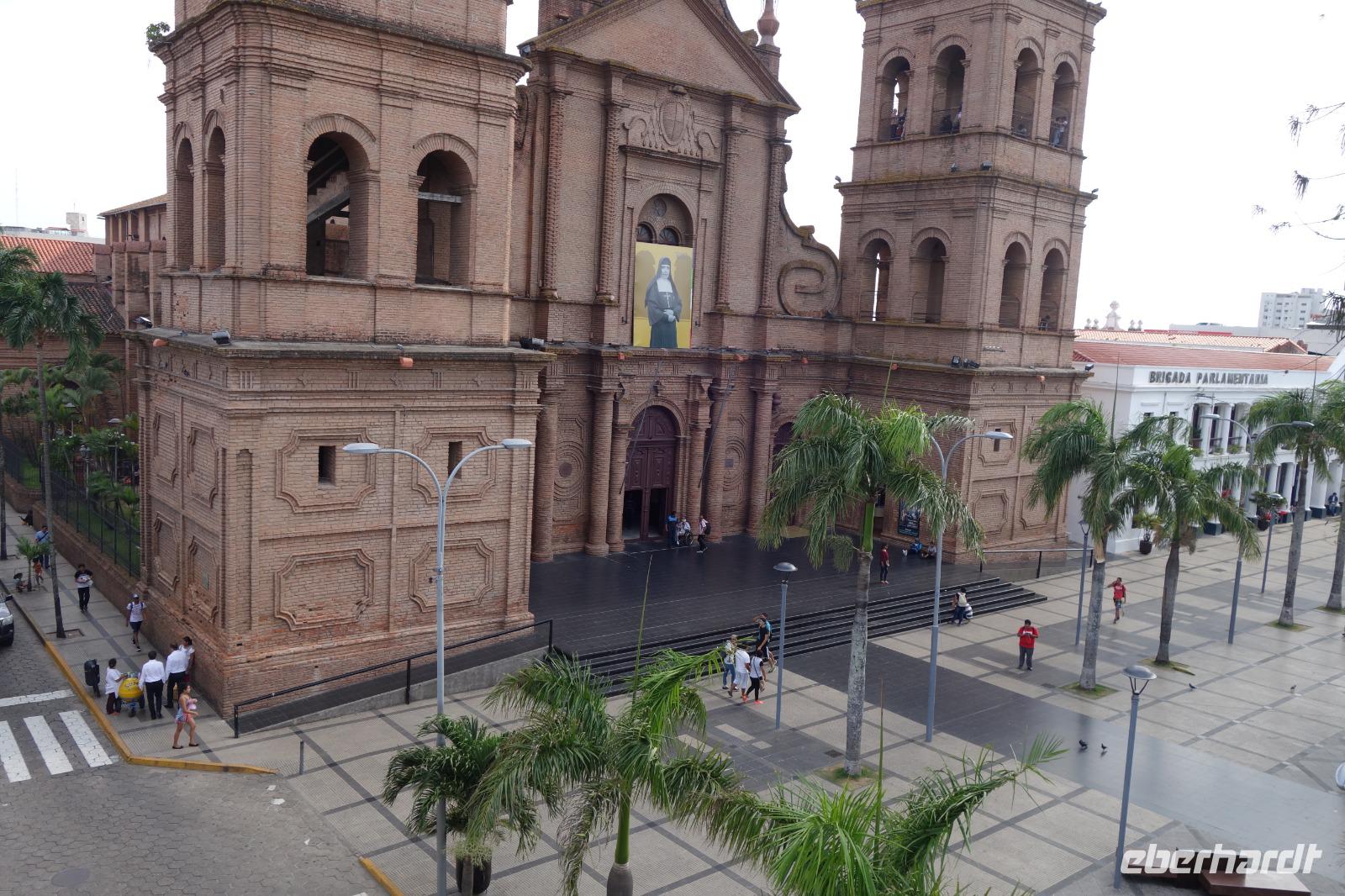 Unsere Rundreise beginnt hier im Tiefland von Bolivien, in Santa Cruz de la Sierra. Gemeinsam mit der Stadtführerin Katy erkunden wir heute zu Fuß Santa Cruz de la Sierra. Die Lage des Hotels ist einfach Spitze und so sind wir direkt am Hauptplatz und der Kathedrale. Diese hatte gerade geöffnet und wir nutzten die Gelegenheit Sie zu besichtigen. Man kann sogar hoch auf den Turm laufen, von wo man einen tollen Blick aus auf dem Hauptplatz der Stadt hat. Später besichtigten wir das Museum der Geschichte, das Land und Leute von Santa Cruz zeigt. Früher wollte Santa Cruz, im Herzen Südamerikas gelegen, das Zentrum und Hauptstadt von Amerika sein. Immer weiter zu Fuß genießen wir einen entspannten Vormittag bei angenehm warmen Temperaturen. Zuerst geht es in eine schöne Parkanlage, wo eigentlich damals Santa Cruz gegründet wurde, anschlißend geht es weiter die Markthalle, wo wir wie überall auf der Welt auf unsere Dinge aufpassen müssen. Überall leckeres Obst, Gemüse, Fleisch, rote Tomaten... und die Leute sind alle sehr freundlich und glücklich. Langsam bekommen wir Hunger und lassen uns das gute und typische Essen von Santa Cruz im Restaurant el Aljibe schmecken. Dann ist es Zeit für eine Siesta oder ein Nickerchen bis 17.30 Uhr, wo wir uns wieder im Hotel treffen und einen gemeinsamen Rundgang bis zum Sonnenuntergang um dem Hauptplatz herum machen. Herrlich hier wie lebendig alles ist. Hier im Hotel gibt es oben eine tolle Terrasse und können noch heute den ersten bolivianischen Tag ausklingen lassen. Buenas noches!