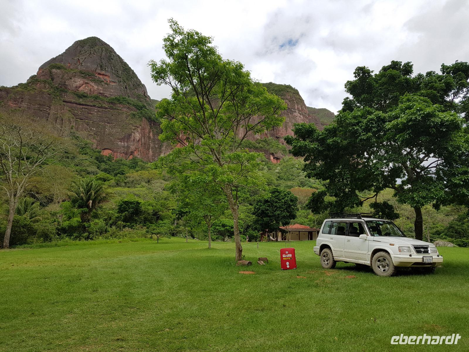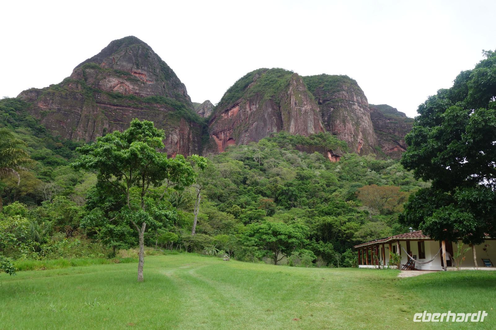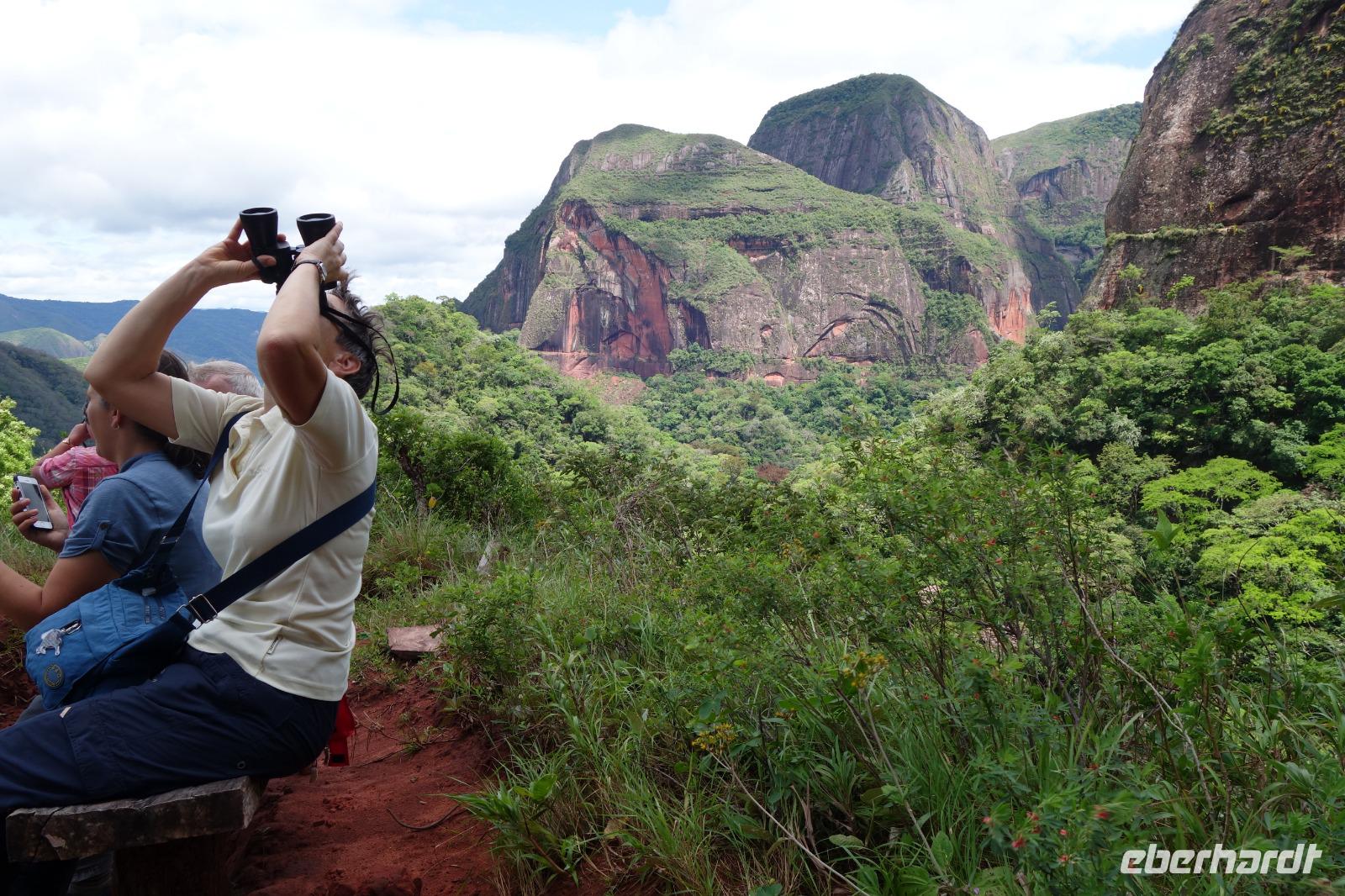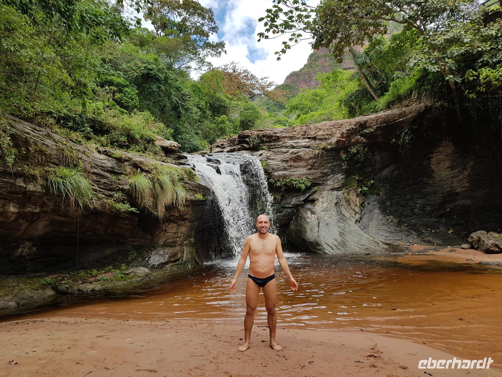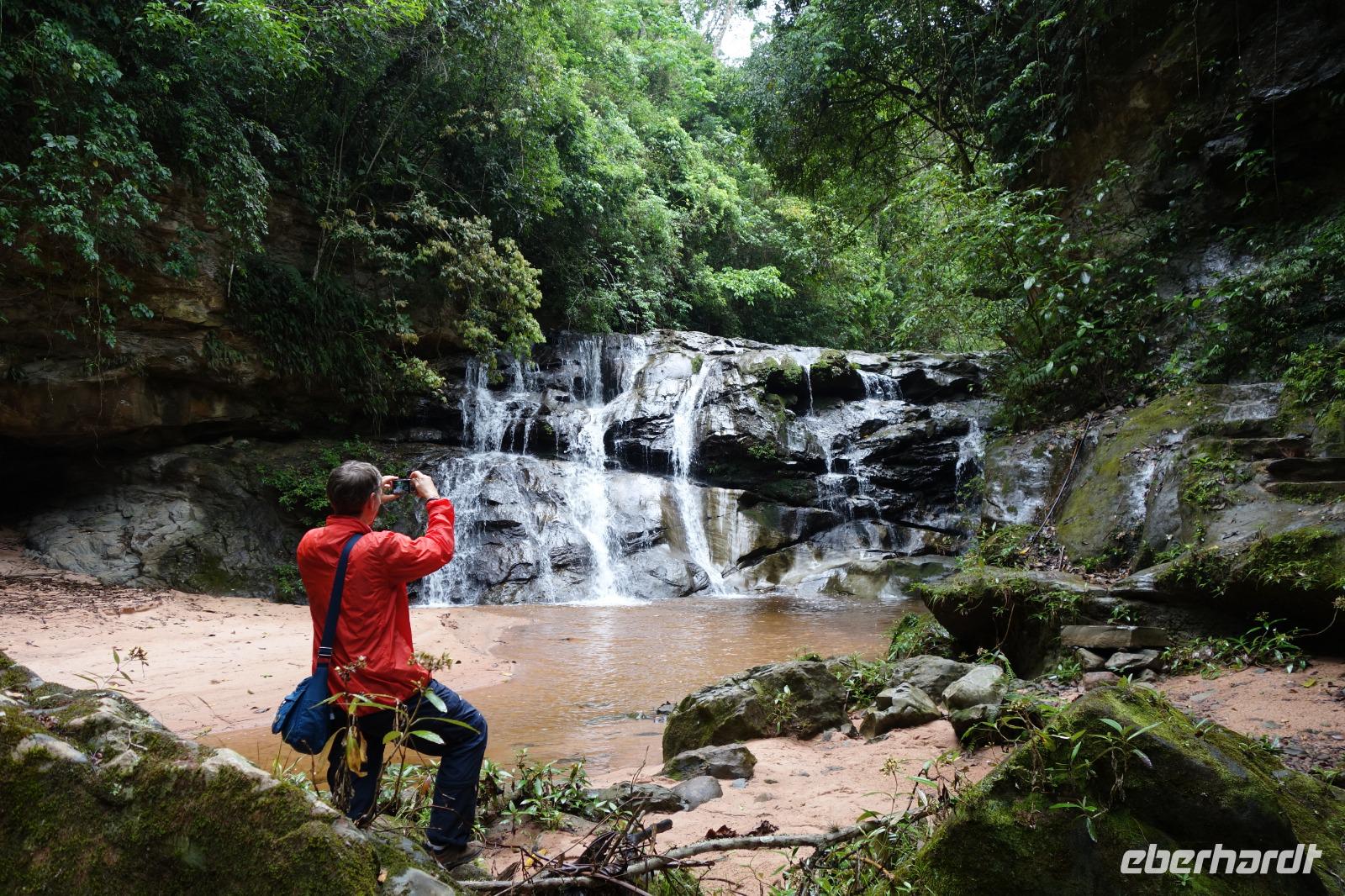 Ganz gemütlich gab es heute das Frühstück um 7.30 Uhr. Vormittags genießen wir noch einmal die spektakuläre Umgebung mit den teilweise roten Sandsteinfelsen, die aus dem tropischen Wald herausragen. Wir entscheiden uns heute für die Wanderung "Senda de los Loros" oder "Papageien-Weg" und entdecken dabei weiter die vielfältige Fauna und Flora. Den ganzen Vormittag haben wir noch genügend Zeit um verschiedene Beobachtungspfade am Refugio de los Volcanes zu erkunden, bevor wir nach dem Mittagessen nach Santa Cruz zurückreisen. Uns hat es hier sehr sehr gut gefallen. So grün haben wir uns Bolivien nicht vorgestellt und diese Felsformationen... Die Ruhe und die Natur hier sind herrlich. Kurz vor dem Mittagsessen gingen Katy und Benjamin noch ans Wasser und unter den Wasserfall.