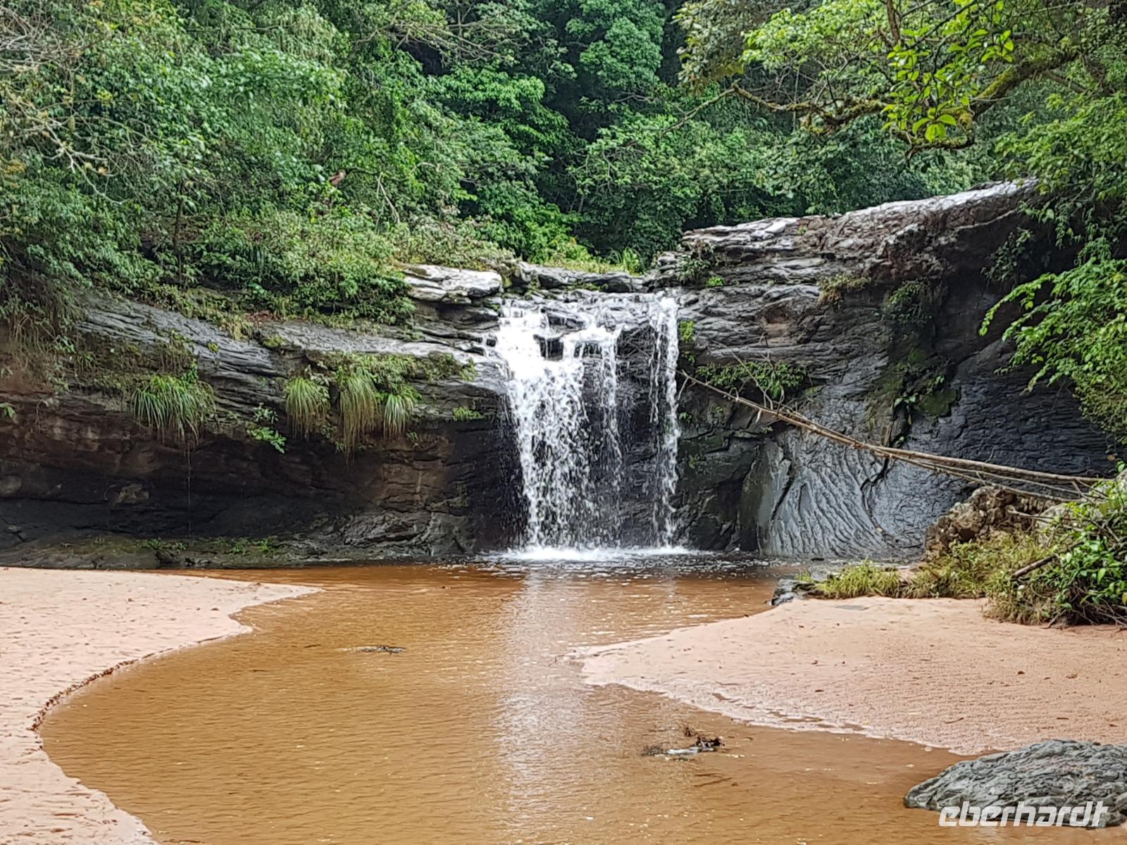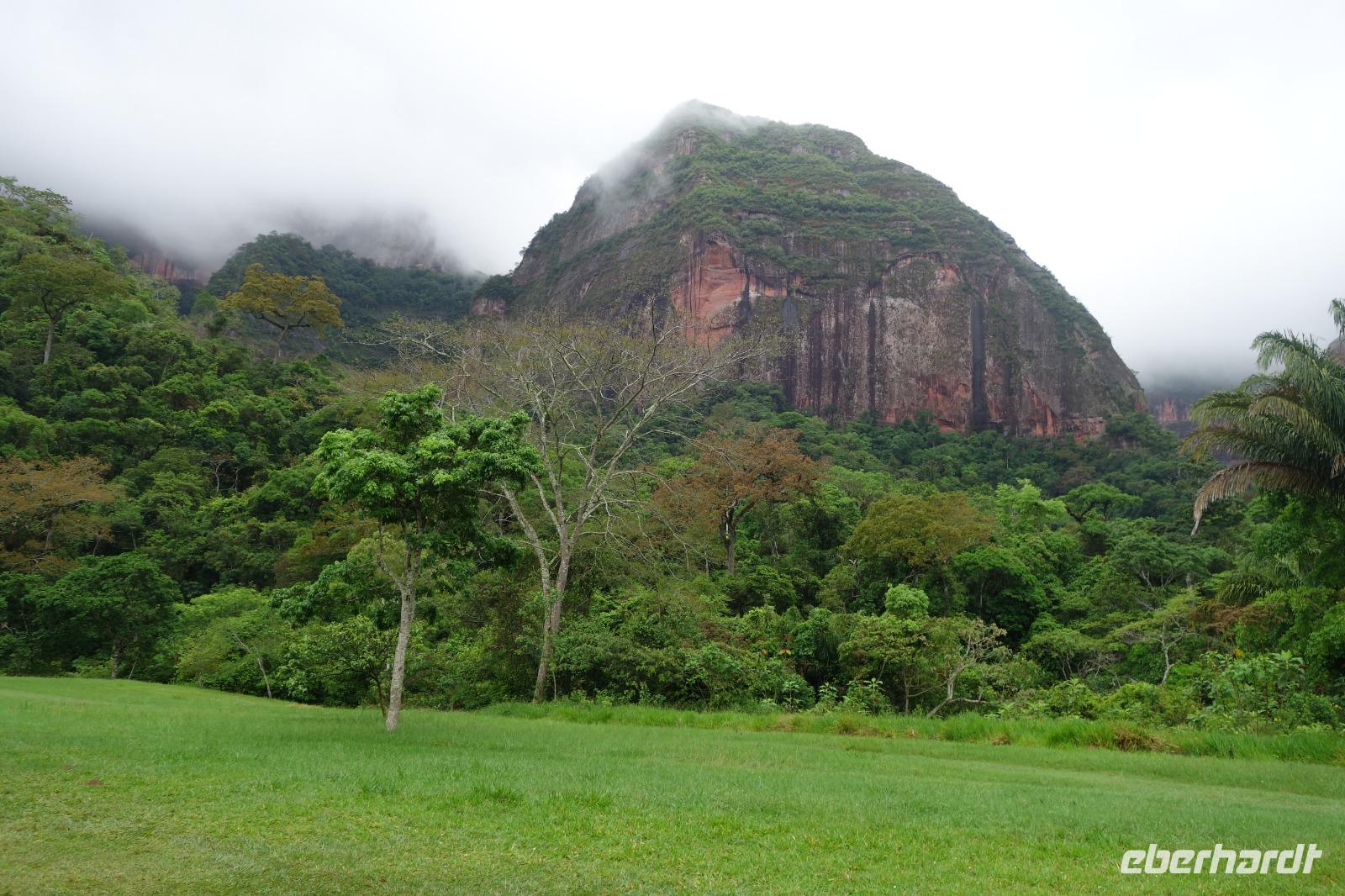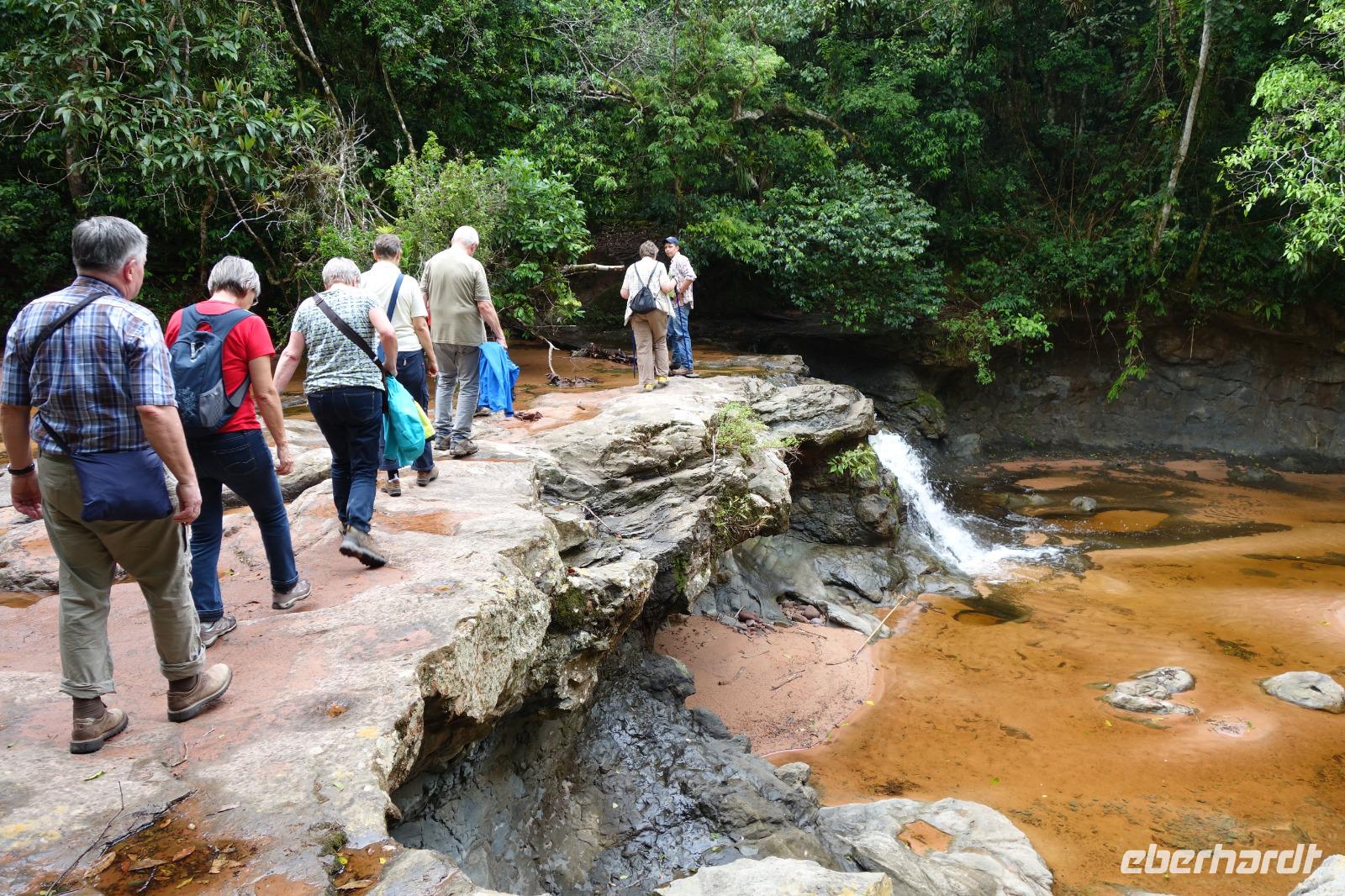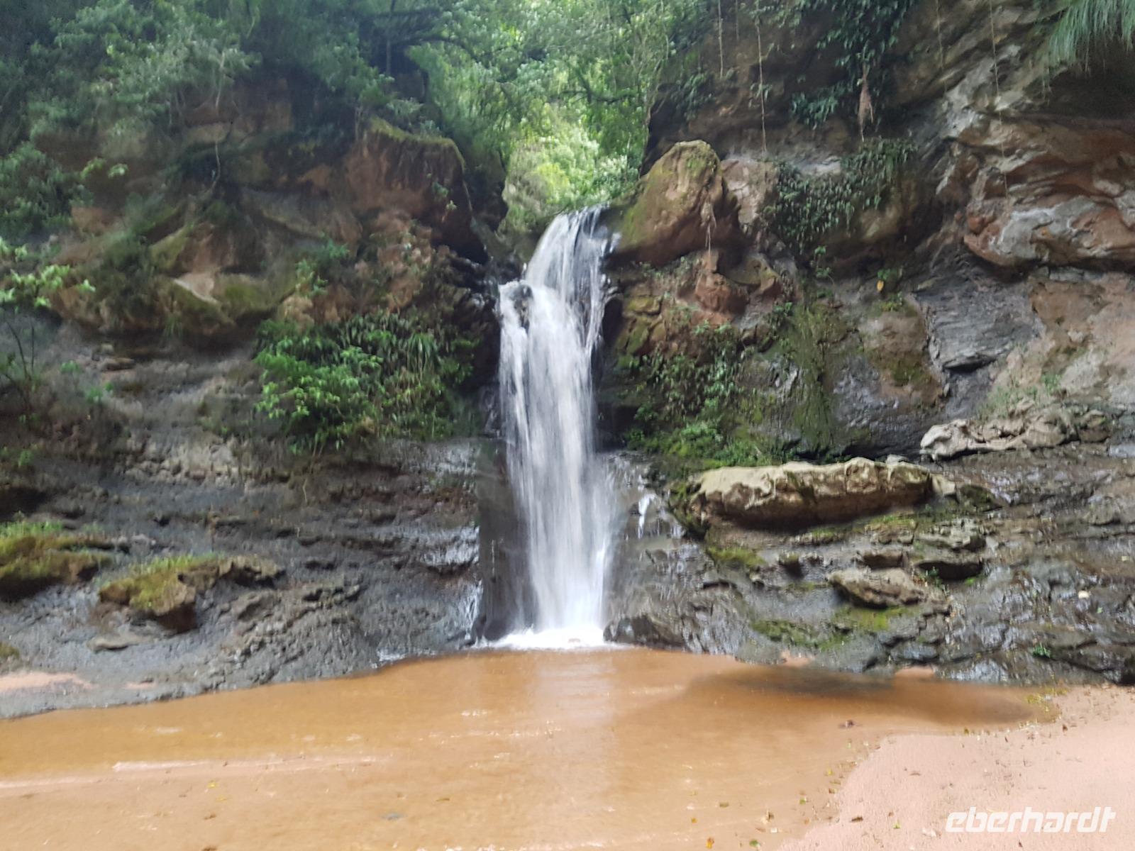 Ganz gemütlich gab es heute das Frühstück um 7.30 Uhr. Vormittags genießen wir noch einmal die spektakuläre Umgebung mit den teilweise roten Sandsteinfelsen, die aus dem tropischen Wald herausragen. Wir entscheiden uns heute für die Wanderung "Senda de los Loros" oder "Papageien-Weg" und entdecken dabei weiter die vielfältige Fauna und Flora. Den ganzen Vormittag haben wir noch genügend Zeit um verschiedene Beobachtungspfade am Refugio de los Volcanes zu erkunden, bevor wir nach dem Mittagessen nach Santa Cruz zurückreisen. Uns hat es hier sehr sehr gut gefallen. So grün haben wir uns Bolivien nicht vorgestellt und diese Felsformationen... Die Ruhe und die Natur hier sind herrlich. Kurz vor dem Mittagsessen gingen Katy und Benjamin noch ans Wasser und unter den Wasserfall.