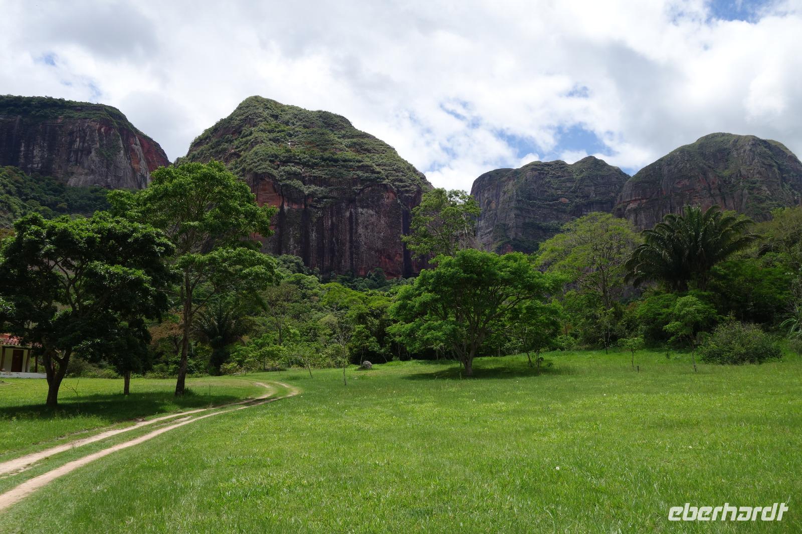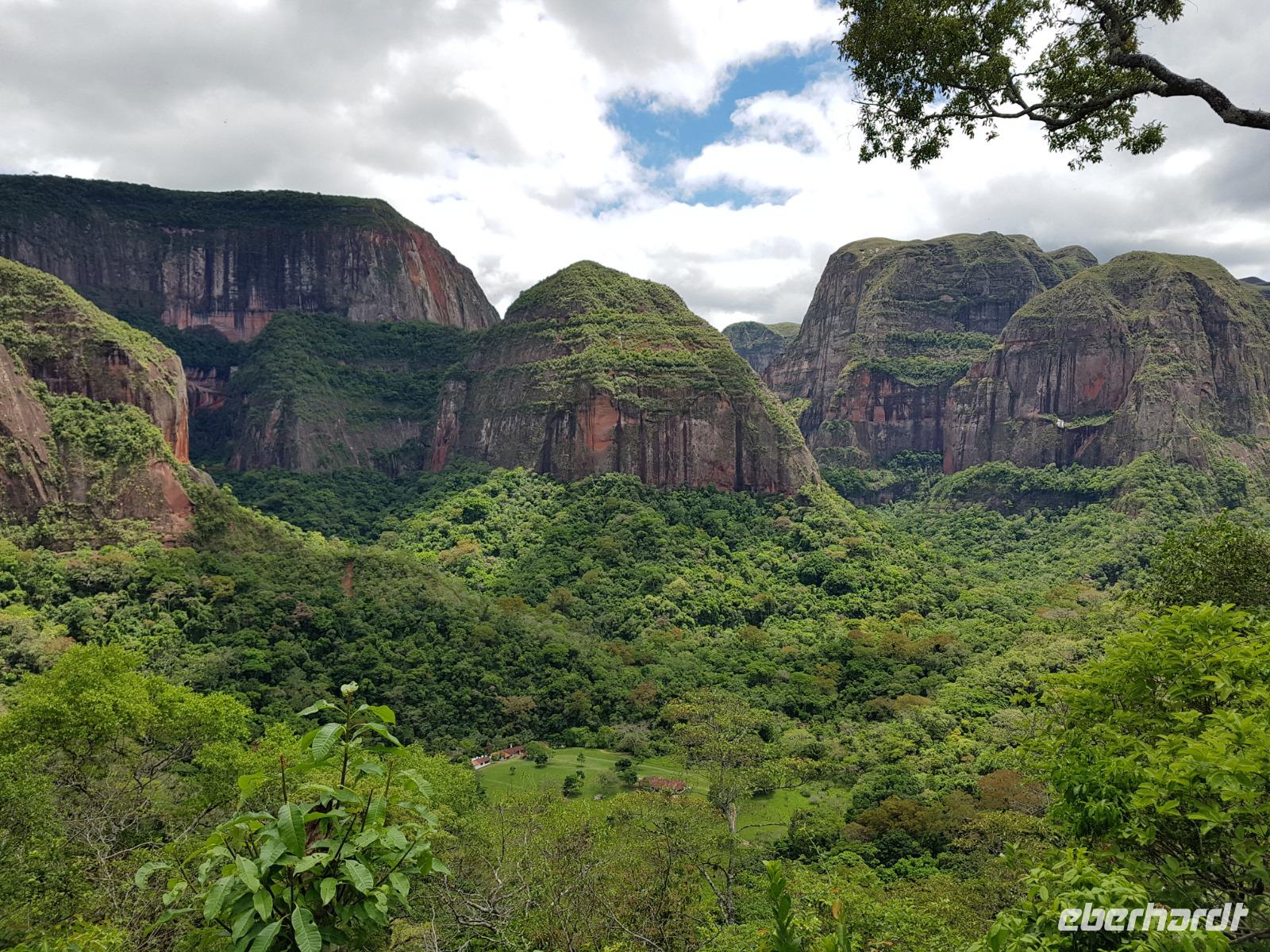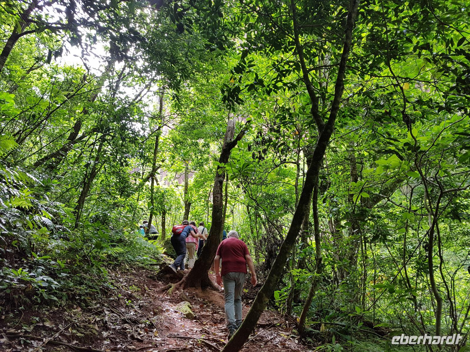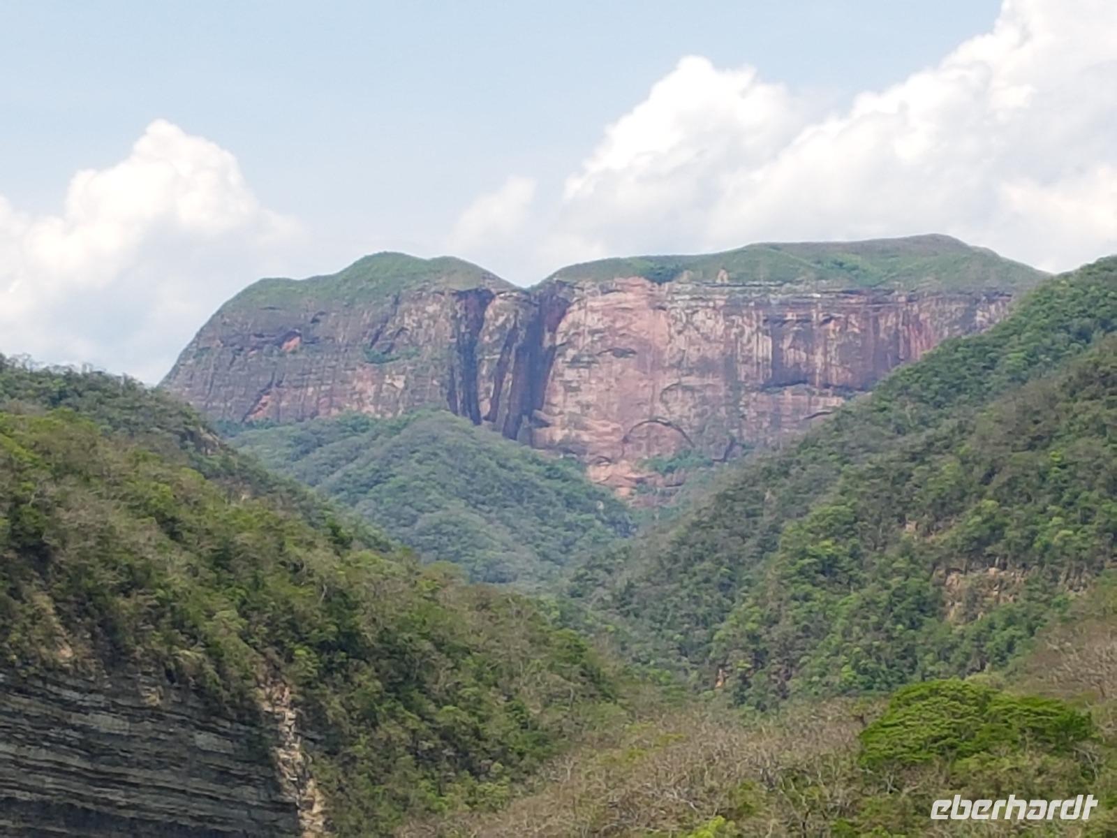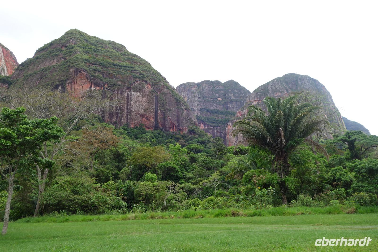 Ganz gemütlich gab es heute das Frühstück um 7.30 Uhr. Vormittags genießen wir noch einmal die spektakuläre Umgebung mit den teilweise roten Sandsteinfelsen, die aus dem tropischen Wald herausragen. Wir entscheiden uns heute für die Wanderung "Senda de los Loros" oder "Papageien-Weg" und entdecken dabei weiter die vielfältige Fauna und Flora. Den ganzen Vormittag haben wir noch genügend Zeit um verschiedene Beobachtungspfade am Refugio de los Volcanes zu erkunden, bevor wir nach dem Mittagessen nach Santa Cruz zurückreisen. Uns hat es hier sehr sehr gut gefallen. So grün haben wir uns Bolivien nicht vorgestellt und diese Felsformationen... Die Ruhe und die Natur hier sind herrlich. Kurz vor dem Mittagsessen gingen Katy und Benjamin noch ans Wasser und unter den Wasserfall.