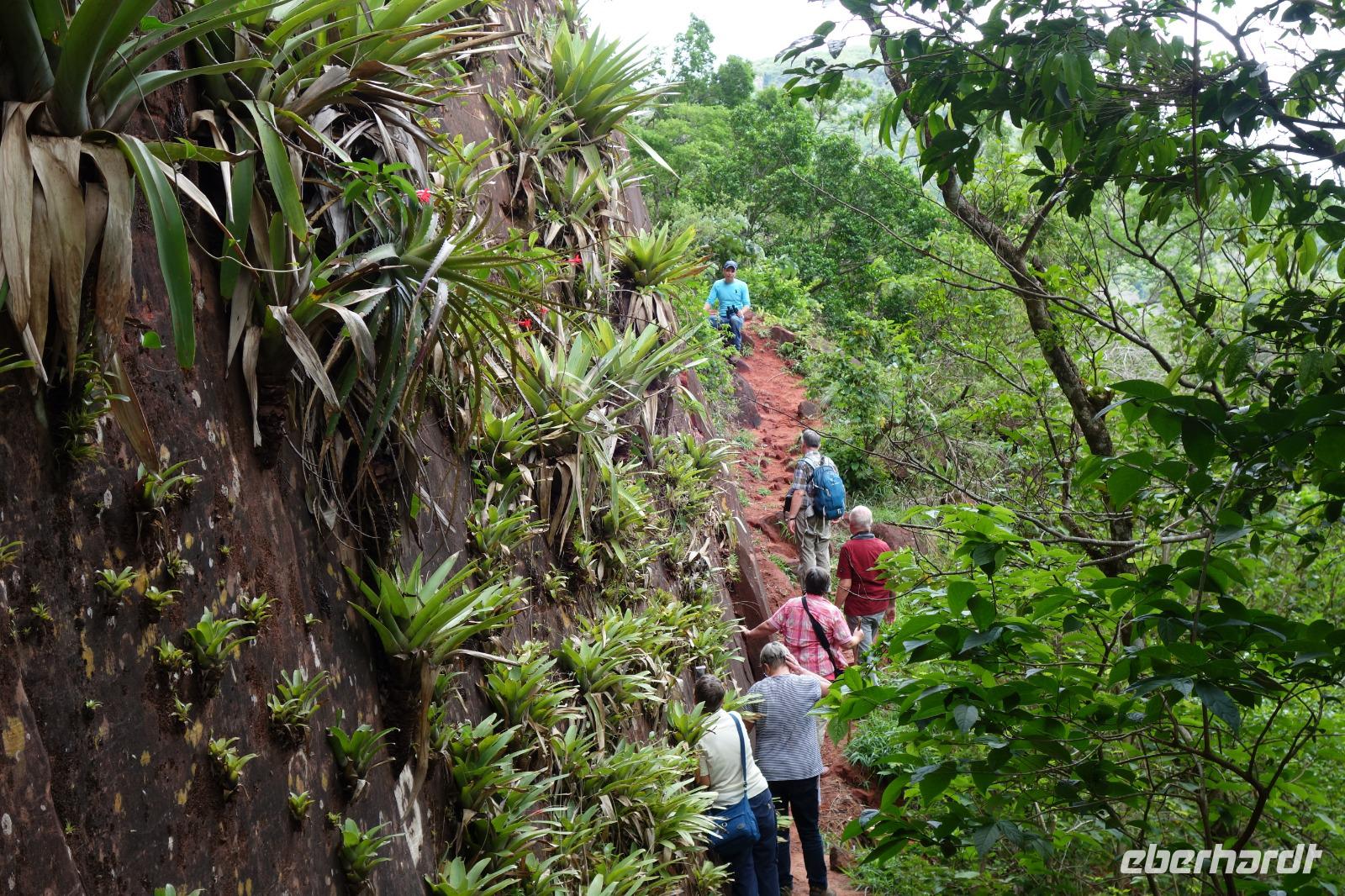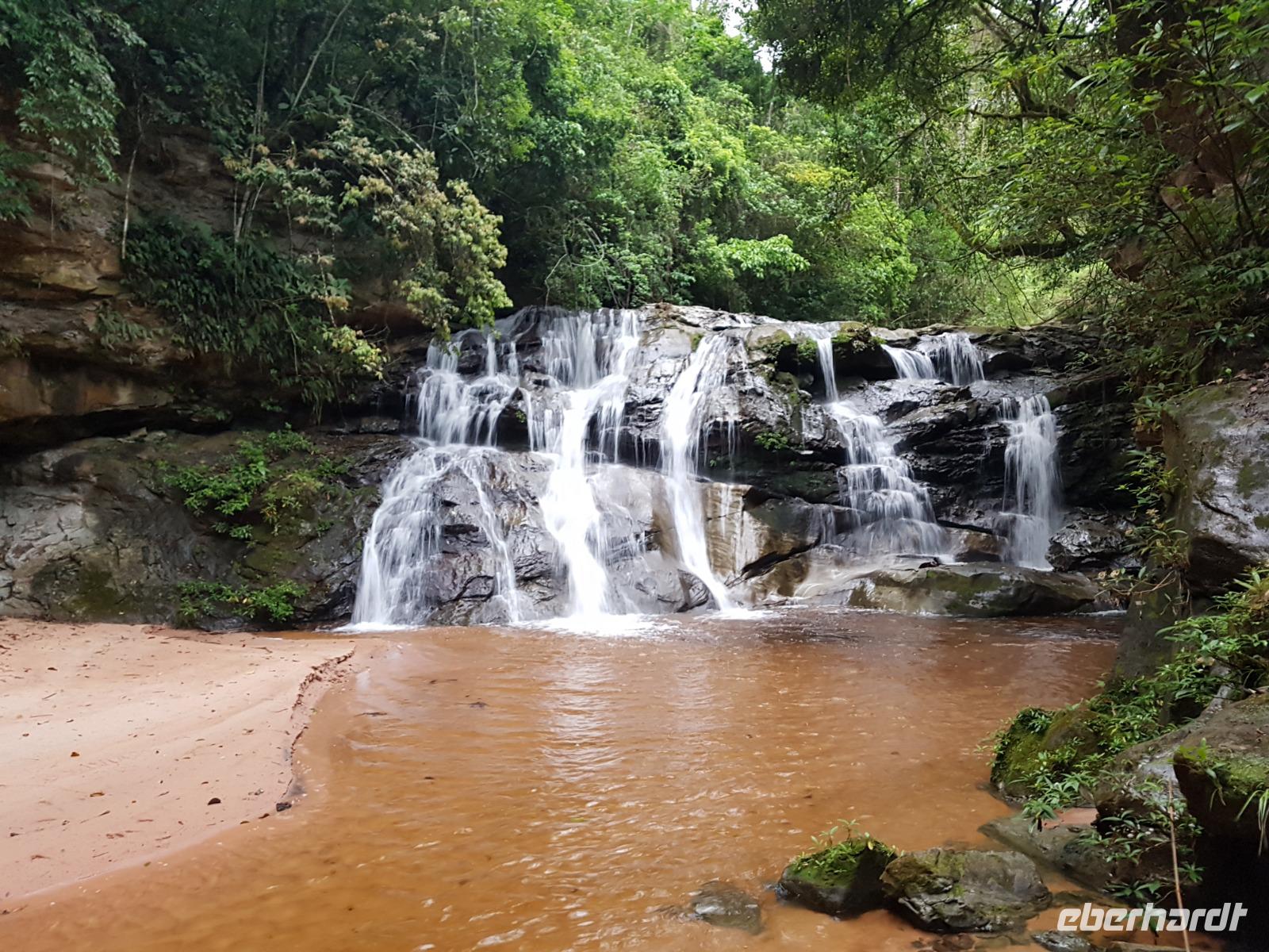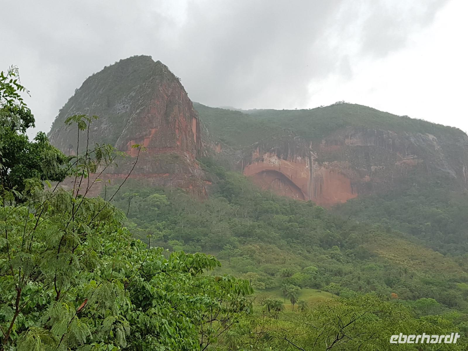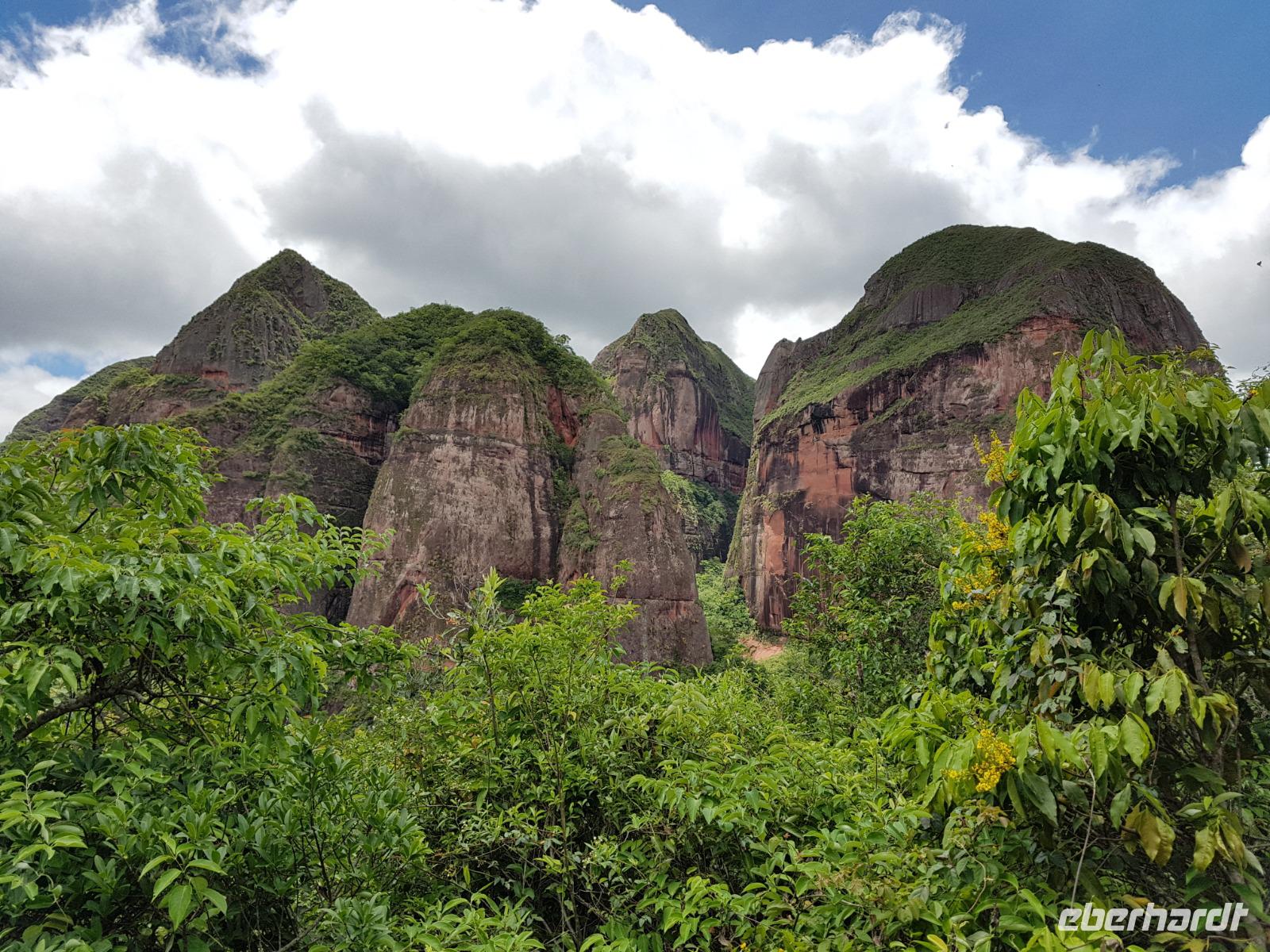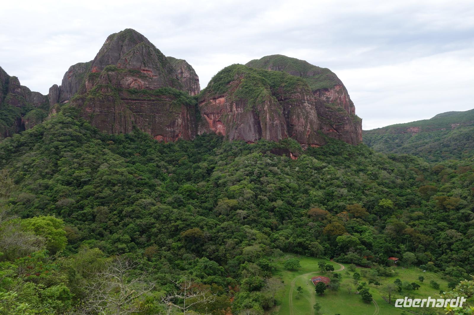 Ganz gemütlich gab es heute das Frühstück um 7.30 Uhr. Vormittags genießen wir noch einmal die spektakuläre Umgebung mit den teilweise roten Sandsteinfelsen, die aus dem tropischen Wald herausragen. Wir entscheiden uns heute für die Wanderung "Senda de los Loros" oder "Papageien-Weg" und entdecken dabei weiter die vielfältige Fauna und Flora. Den ganzen Vormittag haben wir noch genügend Zeit um verschiedene Beobachtungspfade am Refugio de los Volcanes zu erkunden, bevor wir nach dem Mittagessen nach Santa Cruz zurückreisen. Uns hat es hier sehr sehr gut gefallen. So grün haben wir uns Bolivien nicht vorgestellt und diese Felsformationen... Die Ruhe und die Natur hier sind herrlich. Kurz vor dem Mittagsessen gingen Katy und Benjamin noch ans Wasser und unter den Wasserfall.