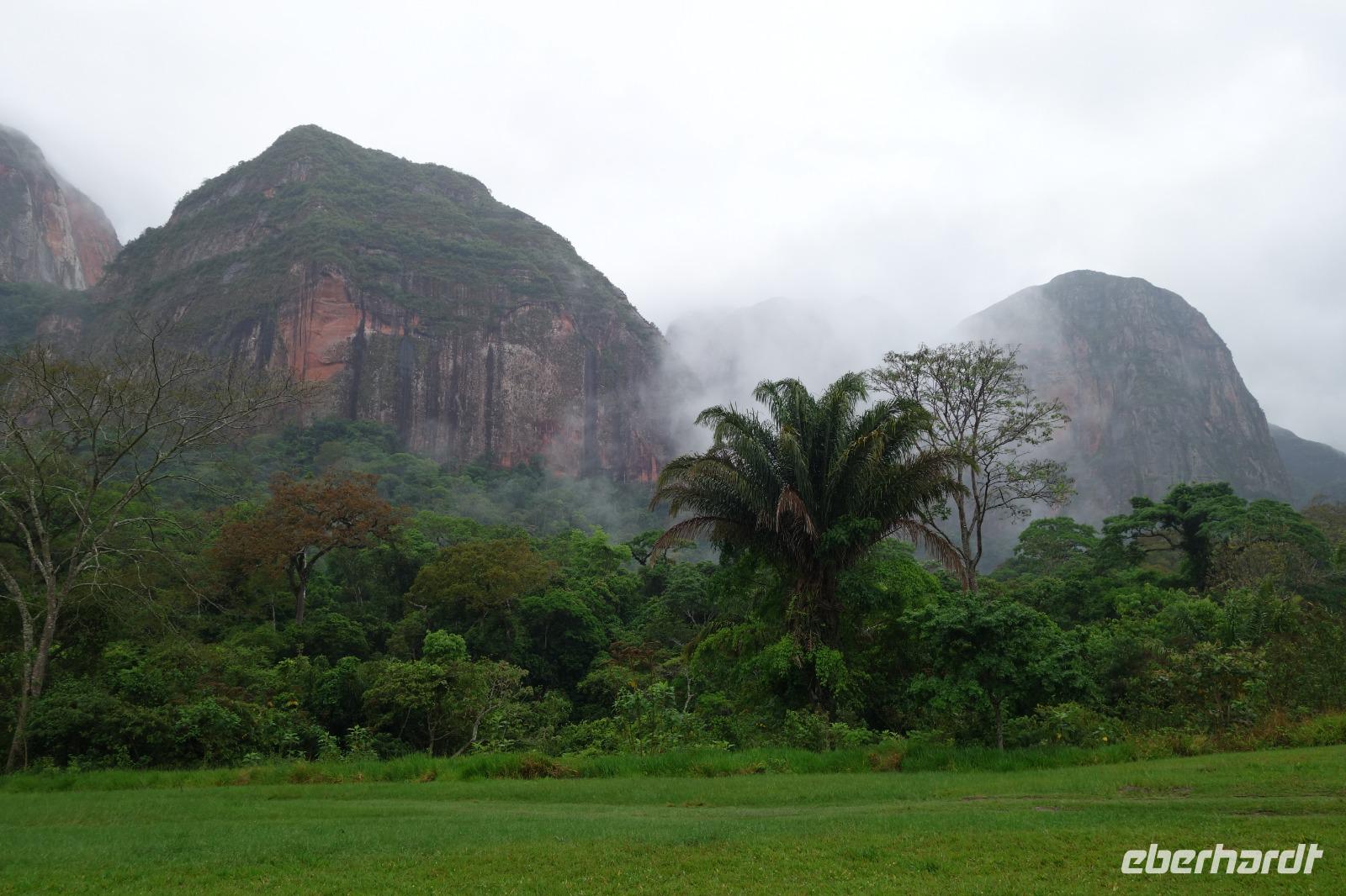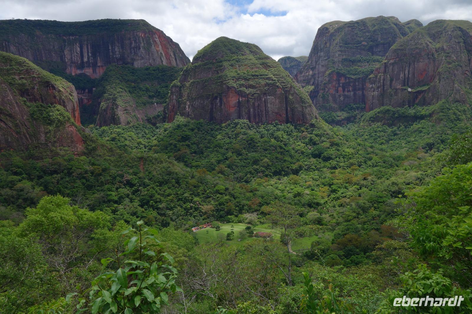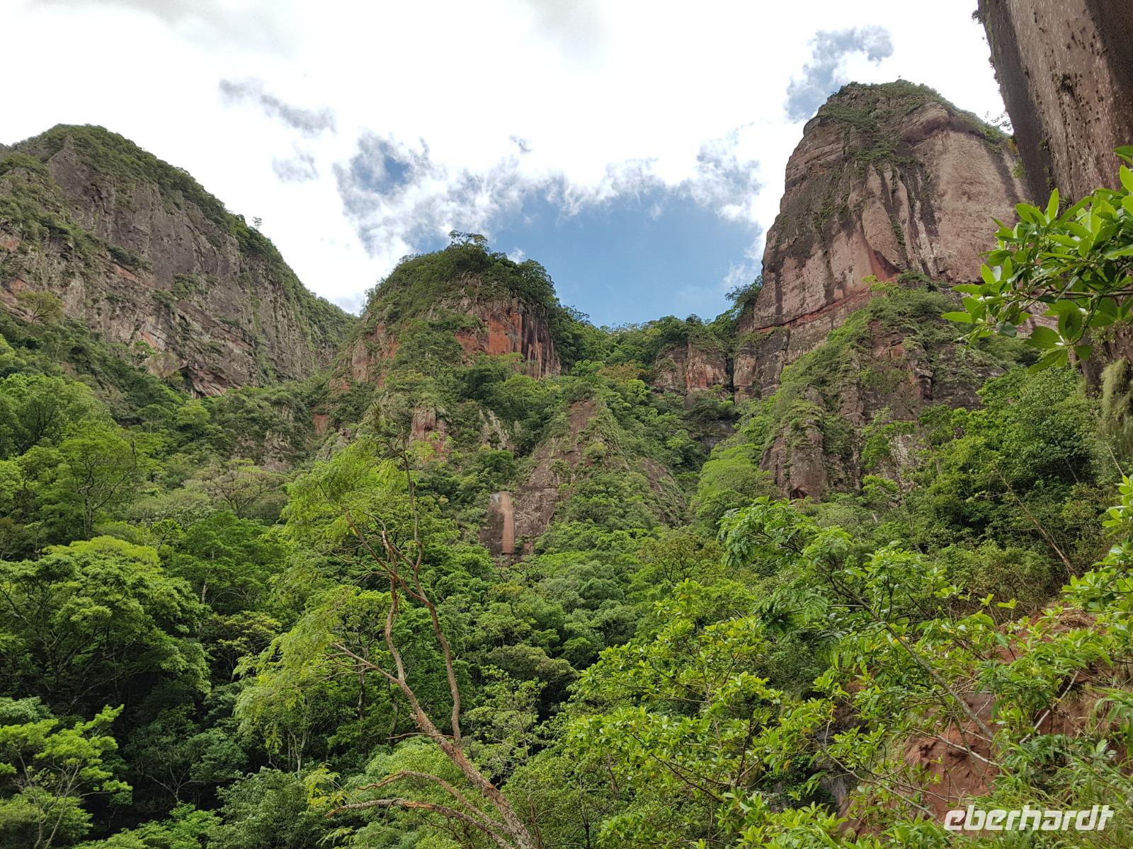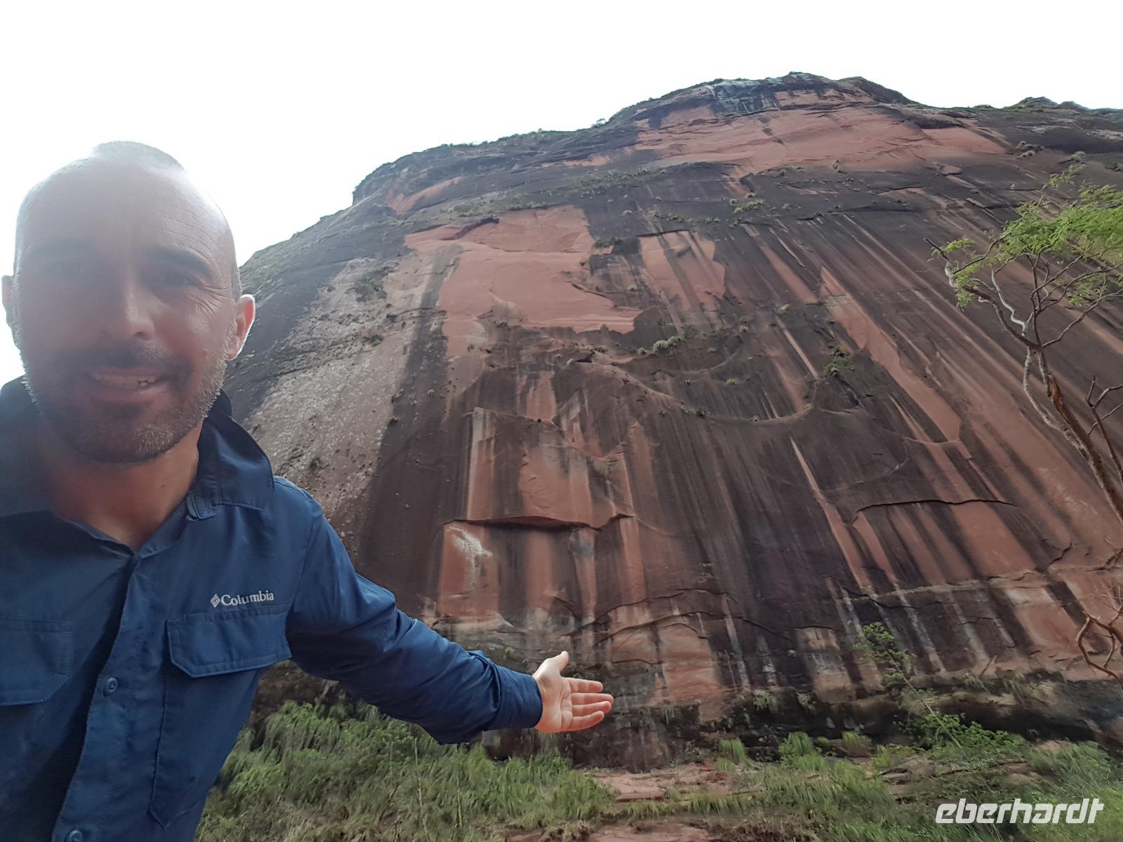 Ganz gemütlich gab es heute das Frühstück um 7.30 Uhr. Vormittags genießen wir noch einmal die spektakuläre Umgebung mit den teilweise roten Sandsteinfelsen, die aus dem tropischen Wald herausragen. Wir entscheiden uns heute für die Wanderung "Senda de los Loros" oder "Papageien-Weg" und entdecken dabei weiter die vielfältige Fauna und Flora. Den ganzen Vormittag haben wir noch genügend Zeit um verschiedene Beobachtungspfade am Refugio de los Volcanes zu erkunden, bevor wir nach dem Mittagessen nach Santa Cruz zurückreisen. Uns hat es hier sehr sehr gut gefallen. So grün haben wir uns Bolivien nicht vorgestellt und diese Felsformationen... Die Ruhe und die Natur hier sind herrlich. Kurz vor dem Mittagsessen gingen Katy und Benjamin noch ans Wasser und unter den Wasserfall.