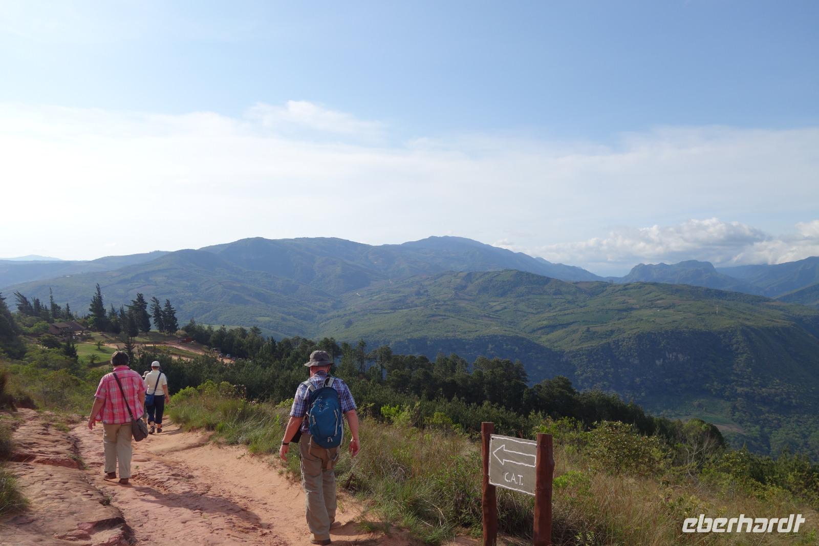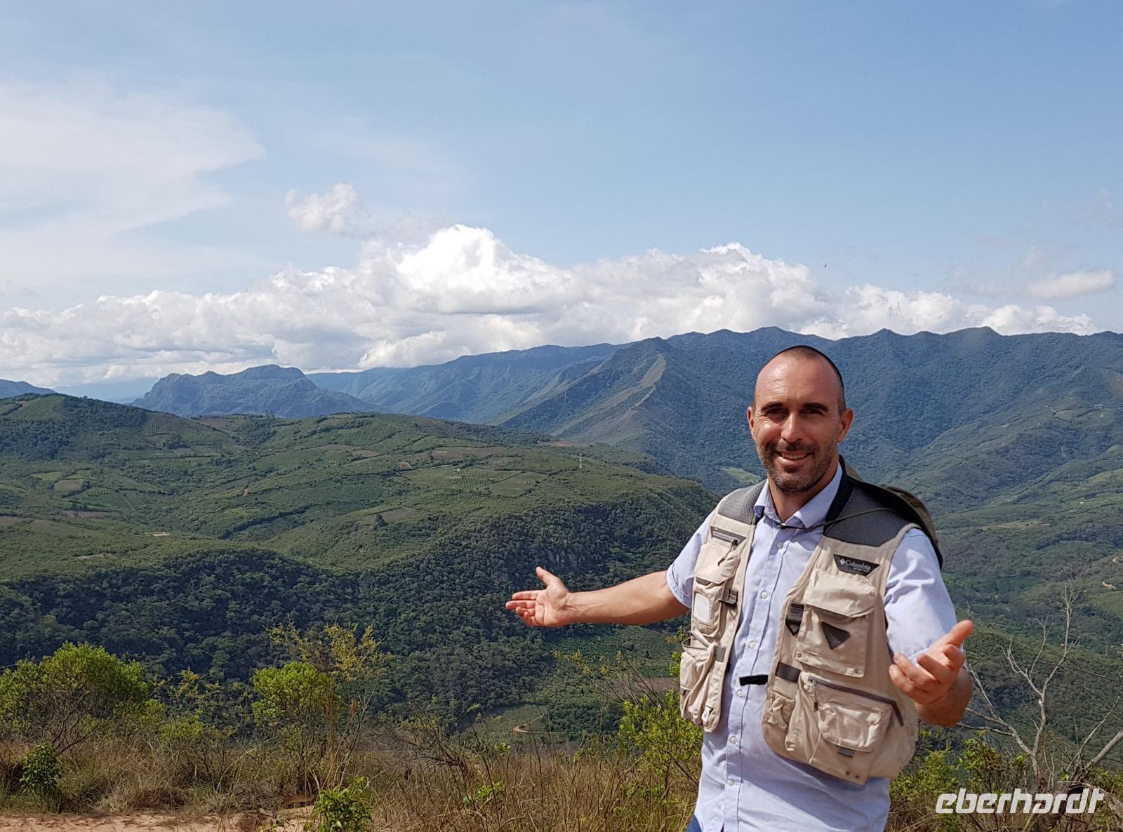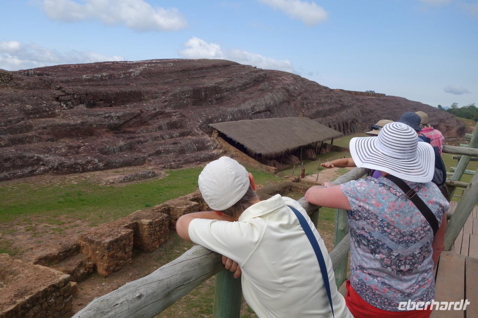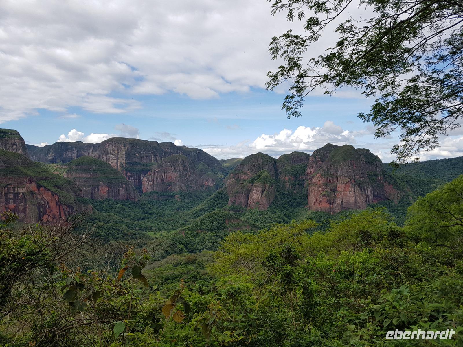 Heute gibt es Frühstück ab 7 Uhr. Um 9 Uhr checken wir aus dem Hotel aus und fahren ganz gemütlich in Richtung Anden. Nach den langen Nachtflug von gestern haben wir heute alle sehr gut geschlafen. Ab heute beginnt unsere Rundreise in Bolivien und wir freuen uns auf die Fahrt nach Samaipata. Wir fahren zum artenreichen tropischen Urwald an den Osthängen der Anden sowie auch zu den wichtigsten Inkaruinen Boliviens, El Fuerte in Samaipata. Wir sehen plötzlich ganz gut, wie sich die Landschaft nach und nach verändert. Wir fahren in Richtung Berge und schon nach einer Stunde Fahrt sind wir in der subtropischen Bergregion, in denen sich der kleine und nette Ort Samaipata befindet. Wir lassen erstmal die Koffer in unserer heutigen Unterkunft "Landhaus" mit Pool. Es ist schon Mittag und wir genießen eine Quinoa Suppe, die sehr gut tut, bevor wir den Rundgang mit Stadtführerin Katy durch die Inkaruine "El Fuerte" unternehmen. El Fuerte de Samaipata gehört zum UNESCO-Weltkulturerbe. Während des über einstündigen Spazierganges um El Fuerte herum sehen wir die Siedlungsreste der Inkas und den bearbeiteten Sandsteinfelsen auf den Gipfeln von zwei Bergen. Die Natur und Landschaft sind herrlich. Von hier oben sehen wir auch den Amboro Nationalpark und ihre besondere Bergformationen.