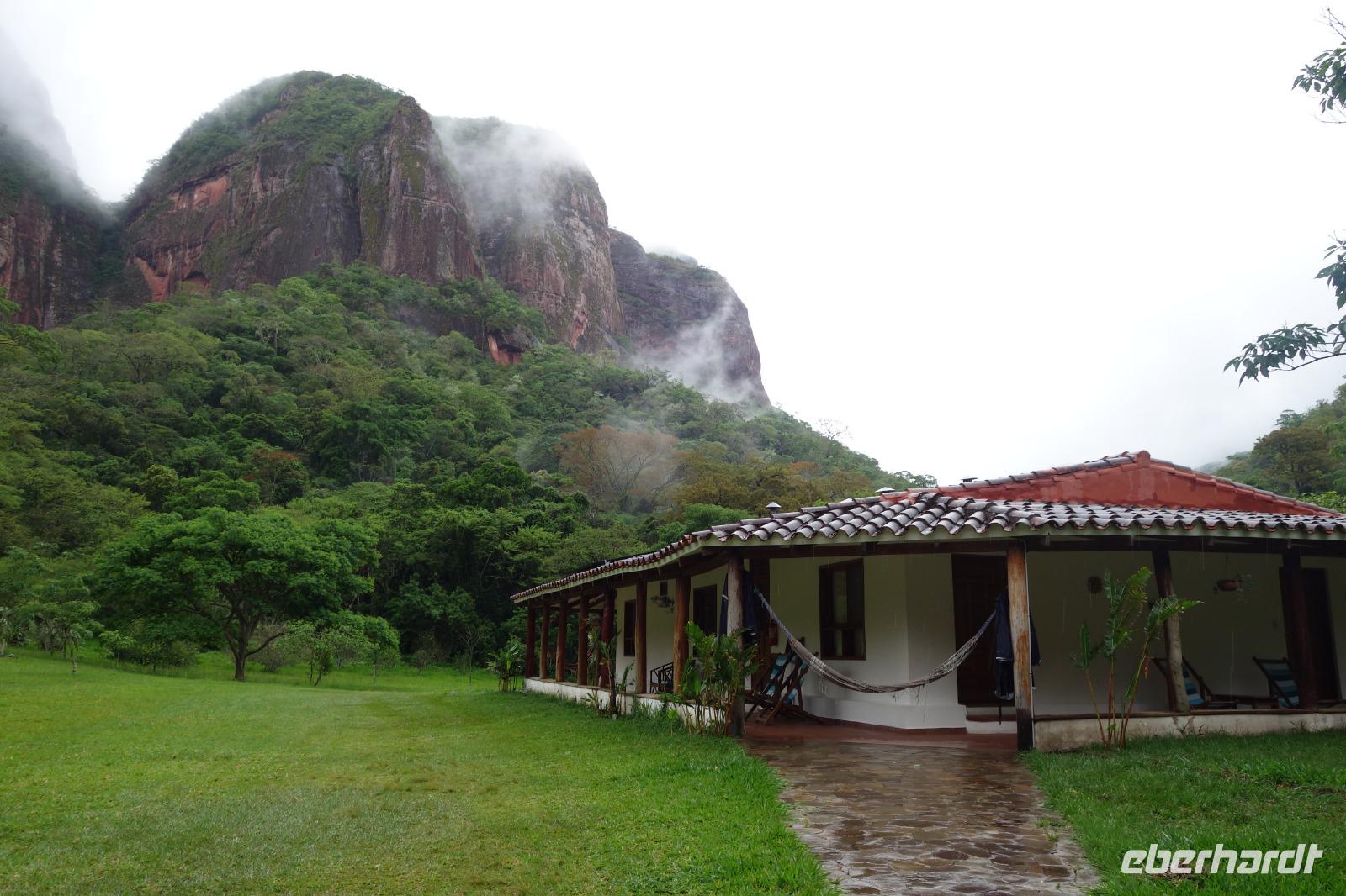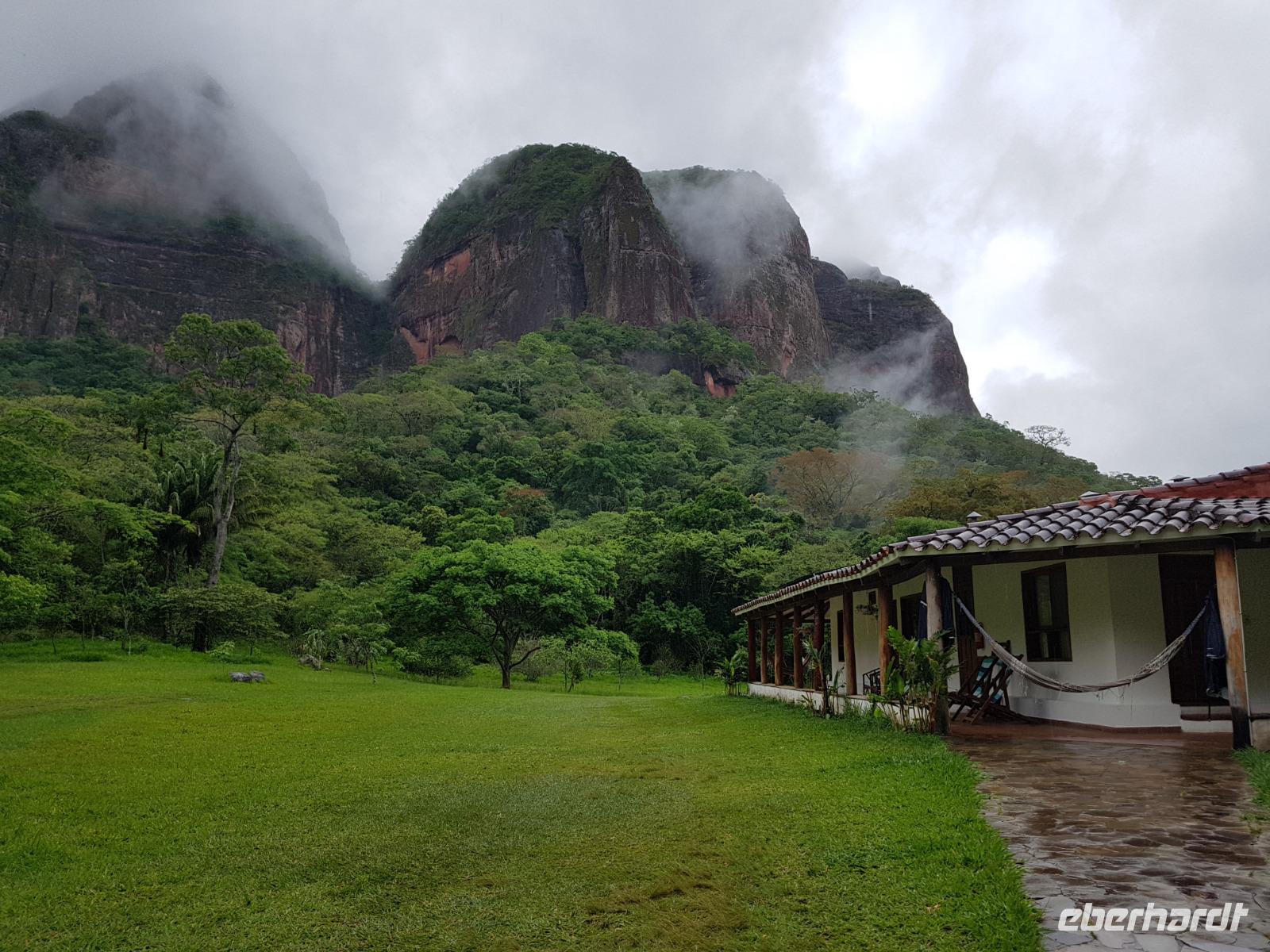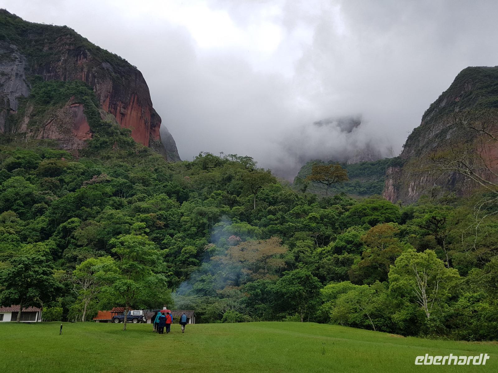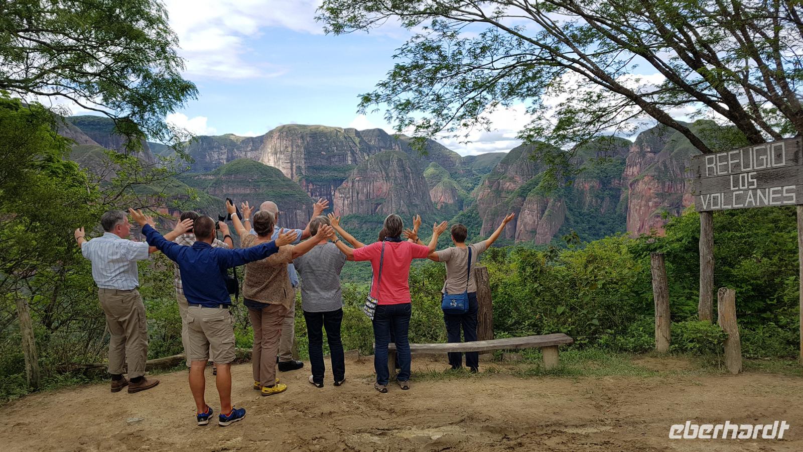 Heute haben wir keinen Wecker gebraucht. Um ca. 6 Uhr blitzte und donnerte es so doll, dass wir schon wach waren. Wir hatten dann am Nachmittag für die Wanderung im Refugio de los Volcanes Glück mit dem Wetter, aber während des Vormittages und auf dem Weg dorthin hat uns der Regen begleitet. Wir verlassen Samaipata und erleben hautnah den tropischen Regenwald im Amboro-Nationalpark. Ein wahres Naturerlebnis erwartet uns heute. Das Hotel Refugio de los Volcanes - wo wir heute übernachten - liegt direkt in mitten des Nationalparks und ist privat. Deswegen holten uns zwei 4WD-Jeeps unten an der Hauptstraße ab und fuhren uns gemütlich bis zu unserer Unterkunft - weg von der Welt und mitten ins Paradies. Nach dem guten und einfachen Mittagessen unternehmen wir die Wanderung bis zum Condor Aussichtspunkt mit Joel, einem örtlichen Führer. Dabei lernen wir die Bewohner des Waldes näher kennen. Der Amboro Nationalpark umfasst tropischen Urwald mit beeindruckenden und steil aufragenden Sandsteinfelsen. Gleichzeitig ist es auch der beste Platz, um die verschiedenen Vögel zu beobachten. Auf dem Weg sehen wir Bromelien und Orchideen. Oben vom "Condor-Aussichtspunkt" ist die Sicht einfach bombastisch. Es ist ein Traum hier zu sein, gegenüber von den roten Felsriesen. Nach der Wanderung am Nachmittag entspannen einige von uns, wie Benjamin in den Naturpools mit Wasserfall, die sich nur unweit vom Refugio befinden. Ja, man könnte baden und einmal unter einem echten Anden-Wasserfall stehen! Danach eine warme Dusche mitten in der Natur ist einfach Luxus. Das Abendessen schmeckt wieder sehr lecker und wir fühlen uns wie zu Hause - weit weg von der schnelllebigen Welt ohne Wifi oder Wlan. Nachts hört man nur die Natur und sieht überall Glühwürmchen. Uns hat der heutige Tag sehr gut gefallen.