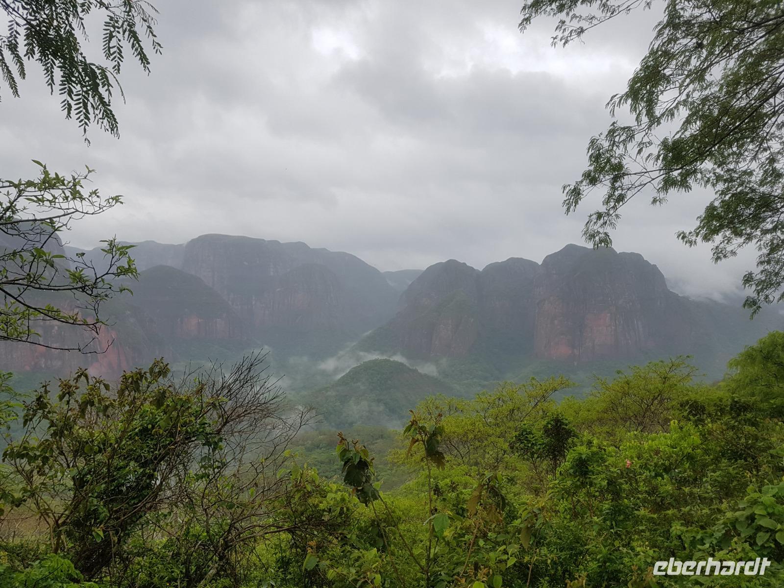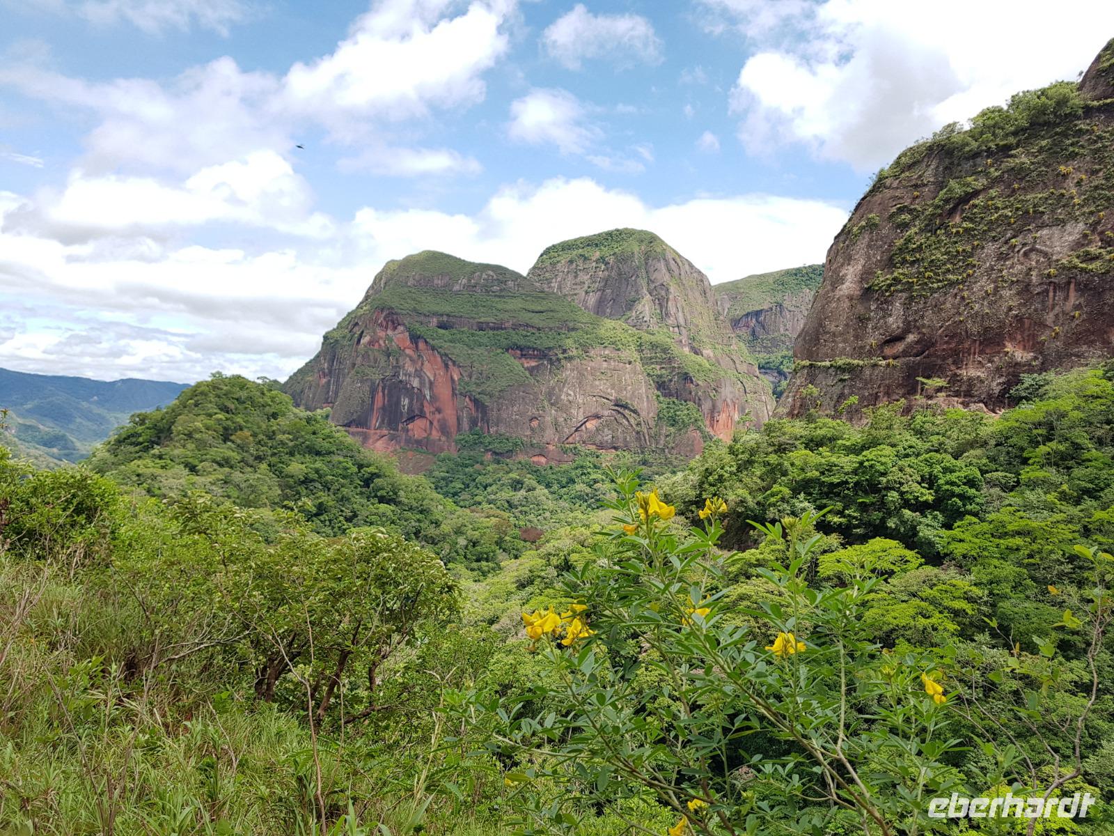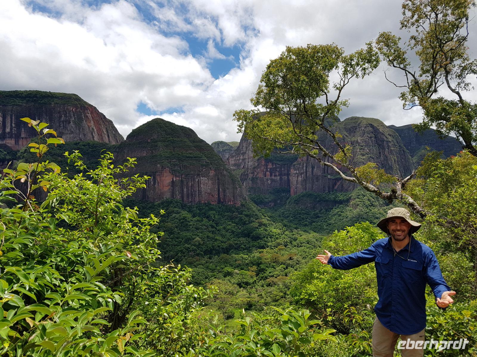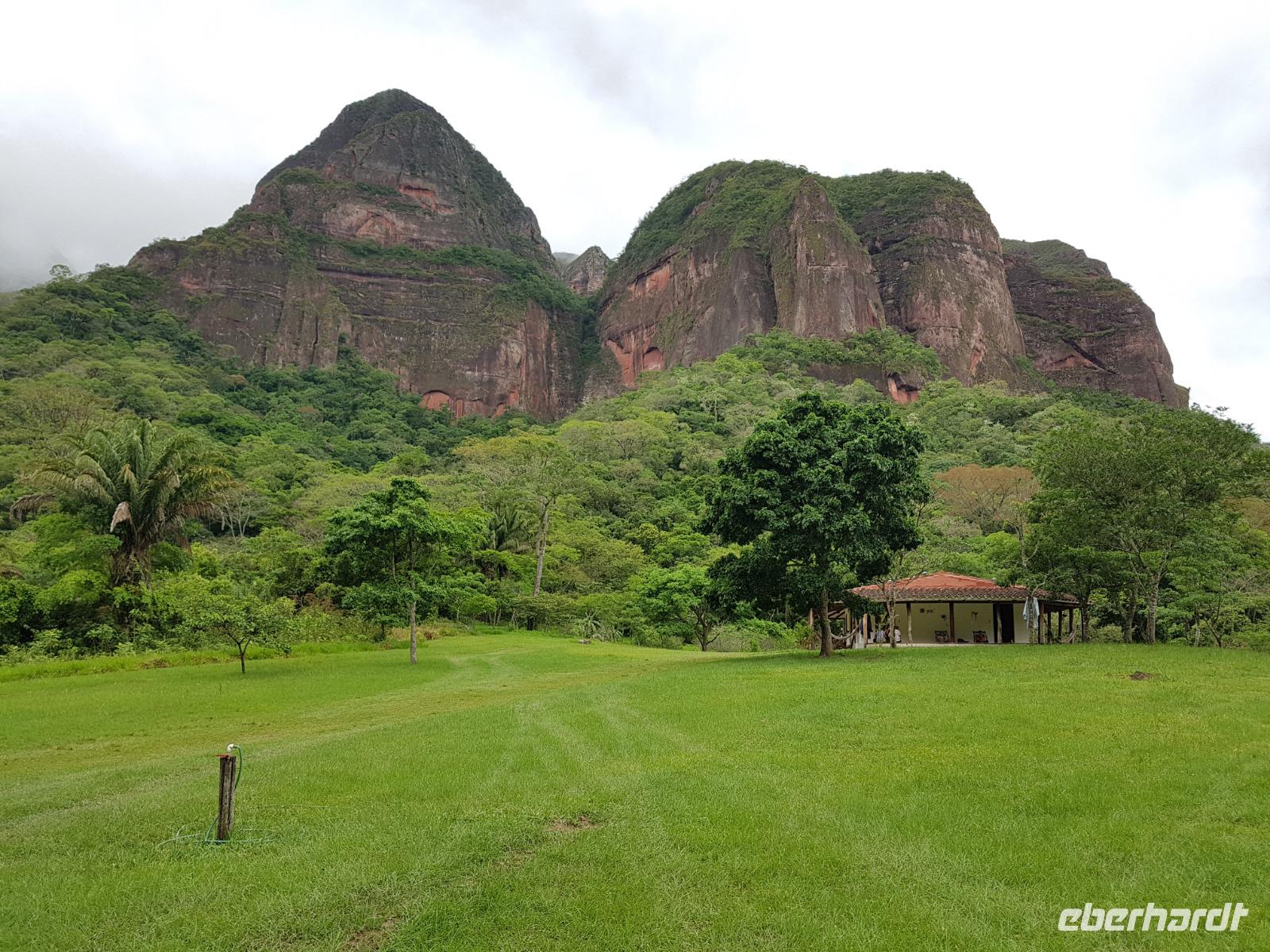 Heute haben wir keinen Wecker gebraucht. Um ca. 6 Uhr blitzte und donnerte es so doll, dass wir schon wach waren. Wir hatten dann am Nachmittag für die Wanderung im Refugio de los Volcanes Glück mit dem Wetter, aber während des Vormittages und auf dem Weg dorthin hat uns der Regen begleitet. Wir verlassen Samaipata und erleben hautnah den tropischen Regenwald im Amboro-Nationalpark. Ein wahres Naturerlebnis erwartet uns heute. Das Hotel Refugio de los Volcanes - wo wir heute übernachten - liegt direkt in mitten des Nationalparks und ist privat. Deswegen holten uns zwei 4WD-Jeeps unten an der Hauptstraße ab und fuhren uns gemütlich bis zu unserer Unterkunft - weg von der Welt und mitten ins Paradies. Nach dem guten und einfachen Mittagessen unternehmen wir die Wanderung bis zum Condor Aussichtspunkt mit Joel, einem örtlichen Führer. Dabei lernen wir die Bewohner des Waldes näher kennen. Der Amboro Nationalpark umfasst tropischen Urwald mit beeindruckenden und steil aufragenden Sandsteinfelsen. Gleichzeitig ist es auch der beste Platz, um die verschiedenen Vögel zu beobachten. Auf dem Weg sehen wir Bromelien und Orchideen. Oben vom "Condor-Aussichtspunkt" ist die Sicht einfach bombastisch. Es ist ein Traum hier zu sein, gegenüber von den roten Felsriesen. Nach der Wanderung am Nachmittag entspannen einige von uns, wie Benjamin in den Naturpools mit Wasserfall, die sich nur unweit vom Refugio befinden. Ja, man könnte baden und einmal unter einem echten Anden-Wasserfall stehen! Danach eine warme Dusche mitten in der Natur ist einfach Luxus. Das Abendessen schmeckt wieder sehr lecker und wir fühlen uns wie zu Hause - weit weg von der schnelllebigen Welt ohne Wifi oder Wlan. Nachts hört man nur die Natur und sieht überall Glühwürmchen. Uns hat der heutige Tag sehr gut gefallen.