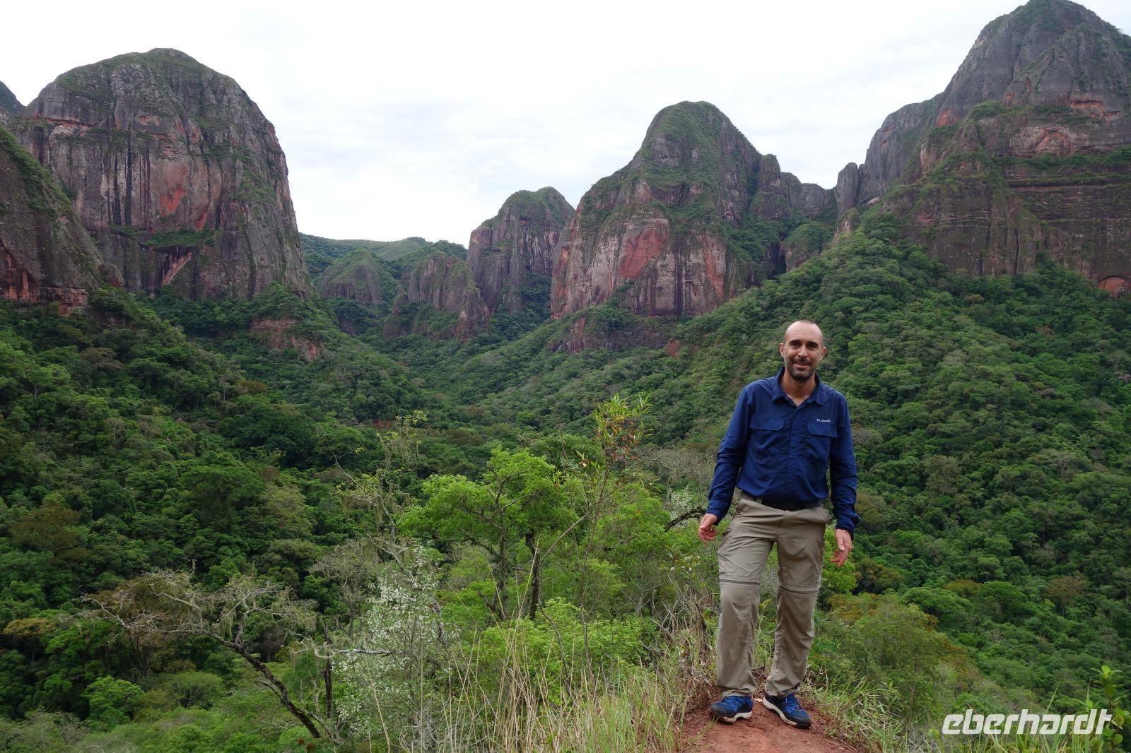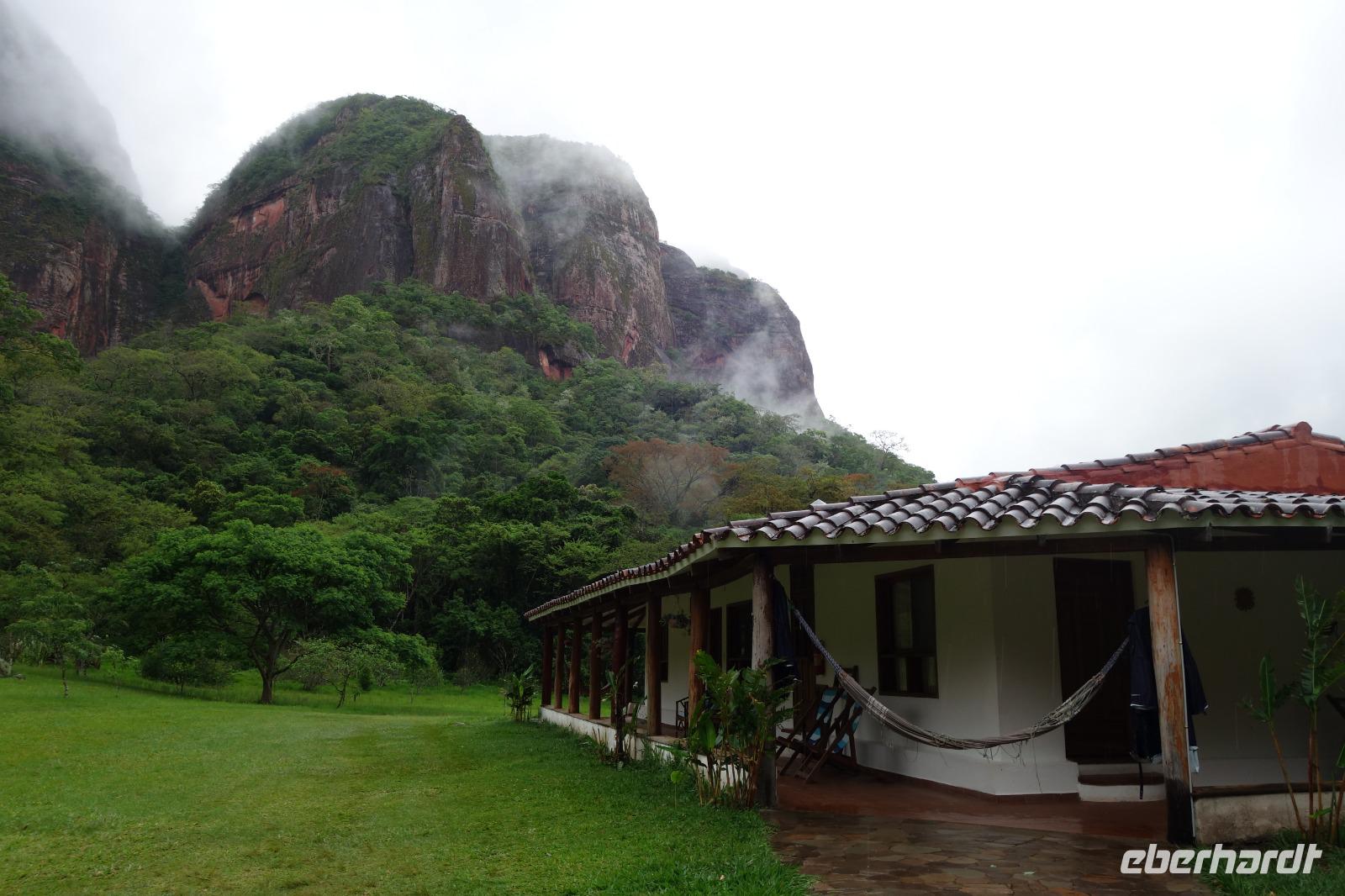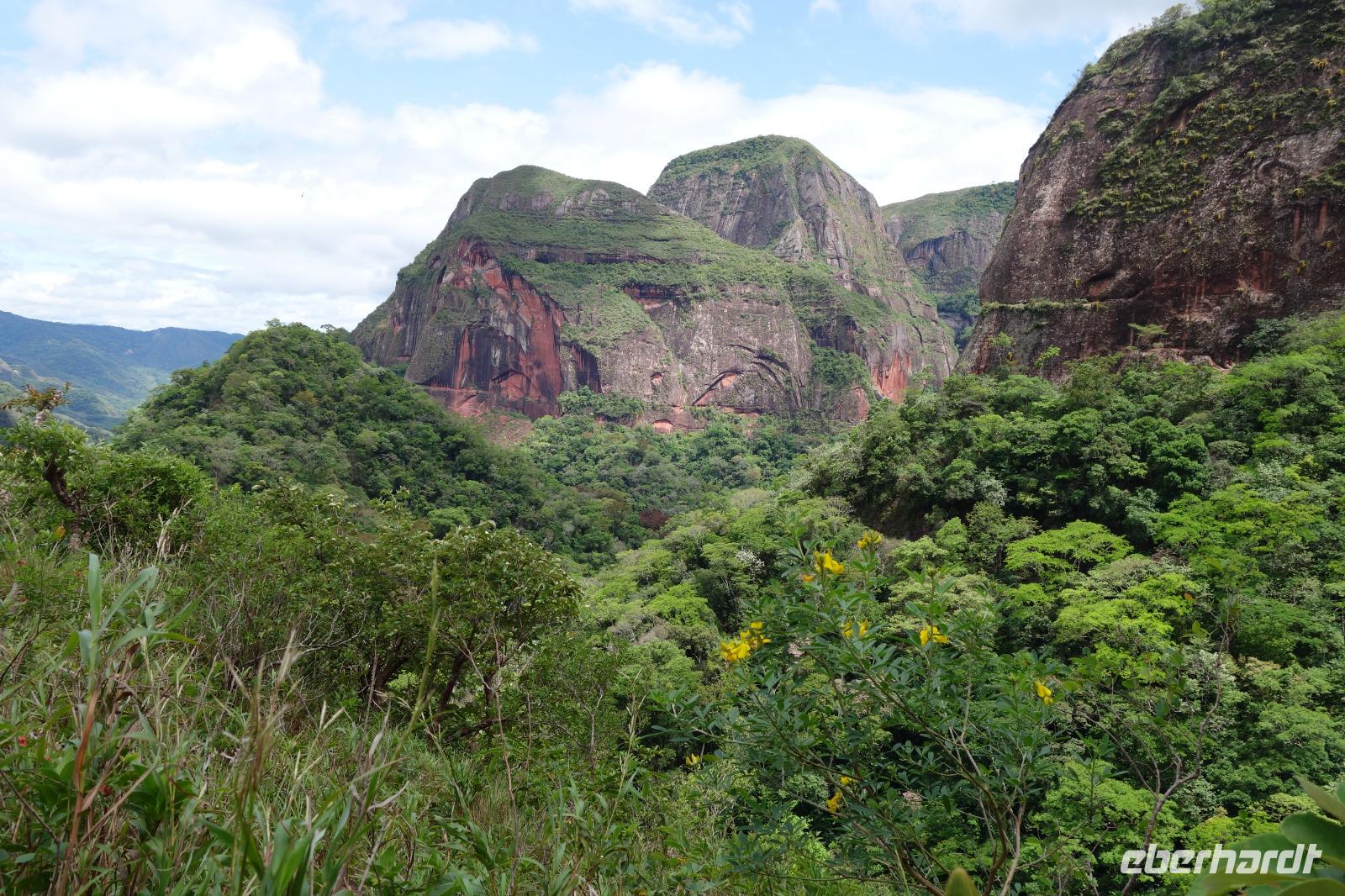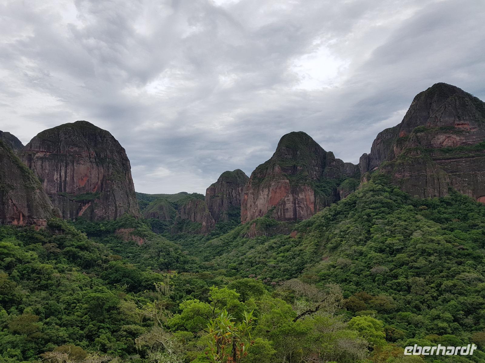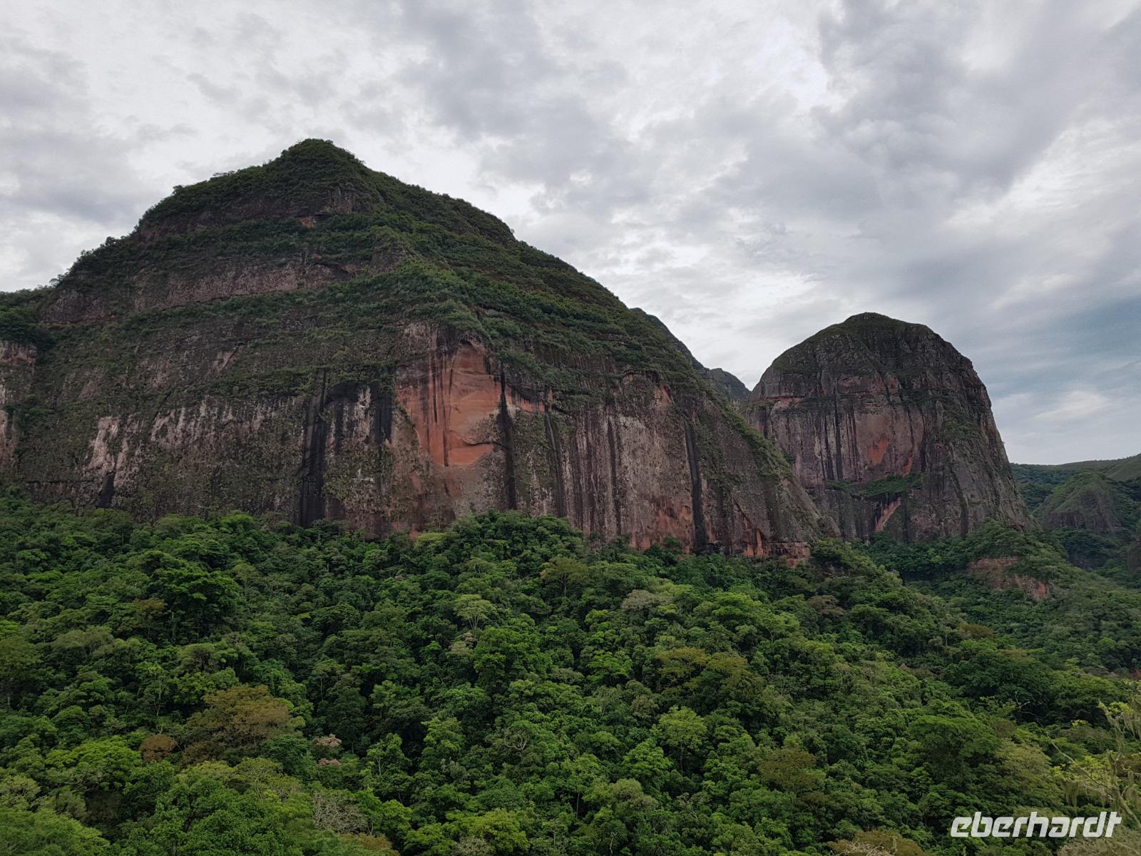 Heute haben wir keinen Wecker gebraucht. Um ca. 6 Uhr blitzte und donnerte es so doll, dass wir schon wach waren. Wir hatten dann am Nachmittag für die Wanderung im Refugio de los Volcanes Glück mit dem Wetter, aber während des Vormittages und auf dem Weg dorthin hat uns der Regen begleitet. Wir verlassen Samaipata und erleben hautnah den tropischen Regenwald im Amboro-Nationalpark. Ein wahres Naturerlebnis erwartet uns heute. Das Hotel Refugio de los Volcanes - wo wir heute übernachten - liegt direkt in mitten des Nationalparks und ist privat. Deswegen holten uns zwei 4WD-Jeeps unten an der Hauptstraße ab und fuhren uns gemütlich bis zu unserer Unterkunft - weg von der Welt und mitten ins Paradies. Nach dem guten und einfachen Mittagessen unternehmen wir die Wanderung bis zum Condor Aussichtspunkt mit Joel, einem örtlichen Führer. Dabei lernen wir die Bewohner des Waldes näher kennen. Der Amboro Nationalpark umfasst tropischen Urwald mit beeindruckenden und steil aufragenden Sandsteinfelsen. Gleichzeitig ist es auch der beste Platz, um die verschiedenen Vögel zu beobachten. Auf dem Weg sehen wir Bromelien und Orchideen. Oben vom "Condor-Aussichtspunkt" ist die Sicht einfach bombastisch. Es ist ein Traum hier zu sein, gegenüber von den roten Felsriesen. Nach der Wanderung am Nachmittag entspannen einige von uns, wie Benjamin in den Naturpools mit Wasserfall, die sich nur unweit vom Refugio befinden. Ja, man könnte baden und einmal unter einem echten Anden-Wasserfall stehen! Danach eine warme Dusche mitten in der Natur ist einfach Luxus. Das Abendessen schmeckt wieder sehr lecker und wir fühlen uns wie zu Hause - weit weg von der schnelllebigen Welt ohne Wifi oder Wlan. Nachts hört man nur die Natur und sieht überall Glühwürmchen. Uns hat der heutige Tag sehr gut gefallen.