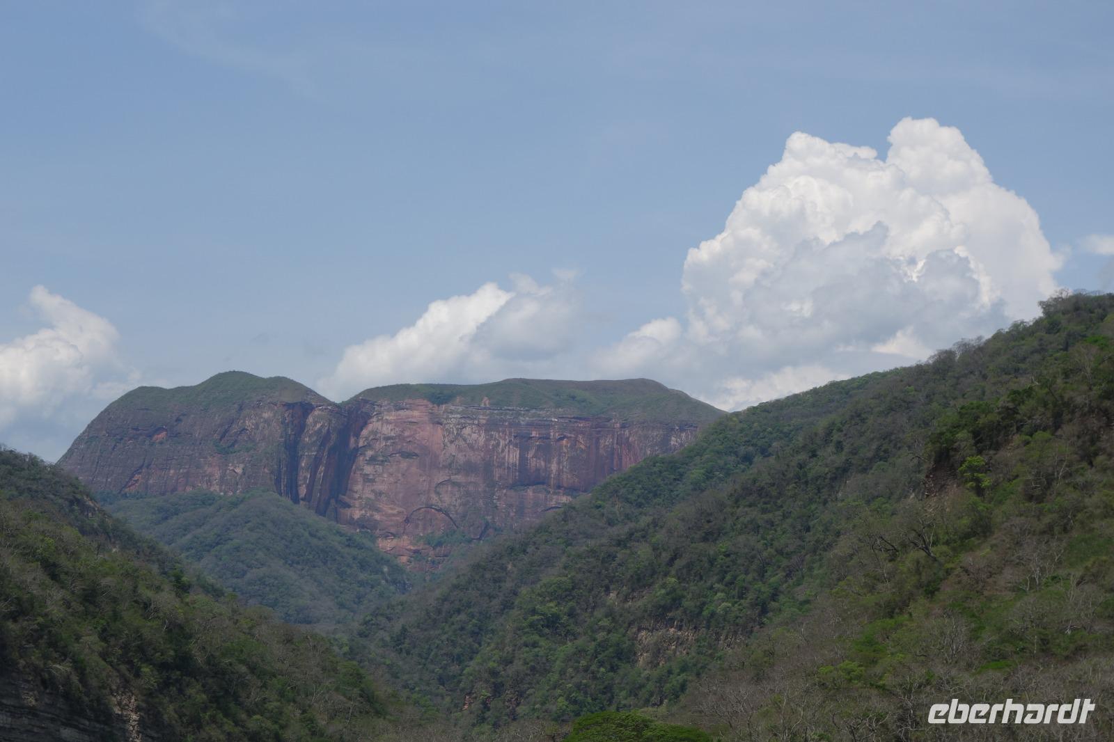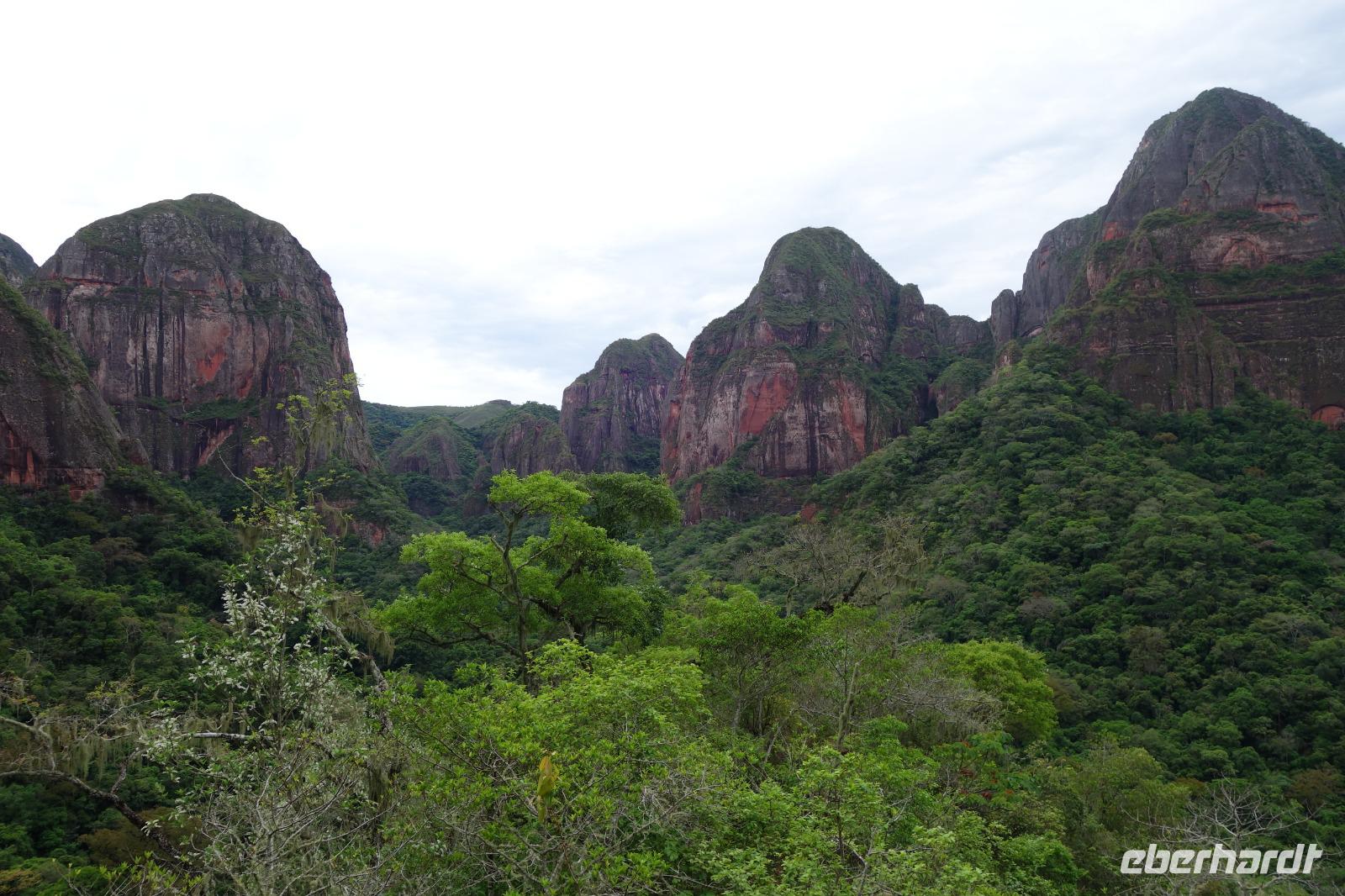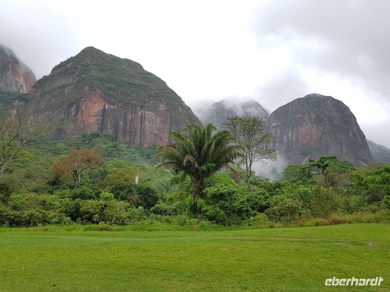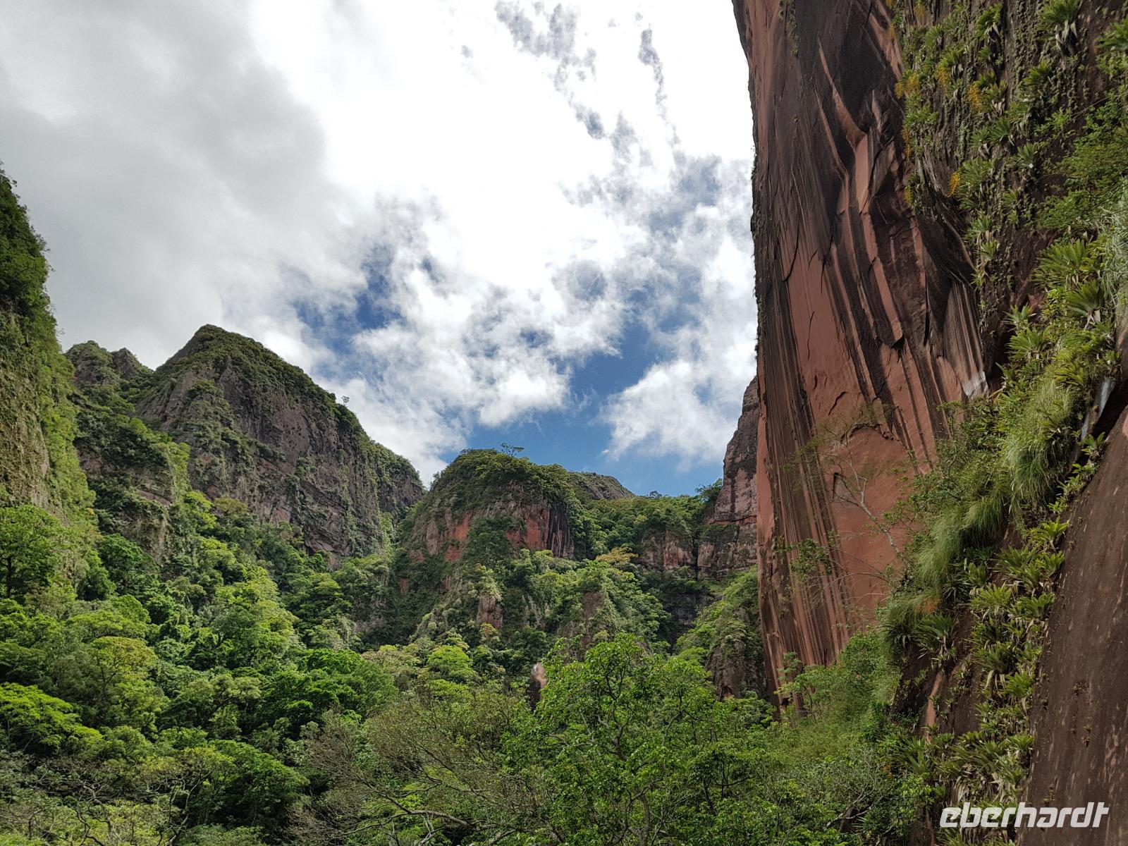 Heute haben wir keinen Wecker gebraucht. Um ca. 6 Uhr blitzte und donnerte es so doll, dass wir schon wach waren. Wir hatten dann am Nachmittag für die Wanderung im Refugio de los Volcanes Glück mit dem Wetter, aber während des Vormittages und auf dem Weg dorthin hat uns der Regen begleitet. Wir verlassen Samaipata und erleben hautnah den tropischen Regenwald im Amboro-Nationalpark. Ein wahres Naturerlebnis erwartet uns heute. Das Hotel Refugio de los Volcanes - wo wir heute übernachten - liegt direkt in mitten des Nationalparks und ist privat. Deswegen holten uns zwei 4WD-Jeeps unten an der Hauptstraße ab und fuhren uns gemütlich bis zu unserer Unterkunft - weg von der Welt und mitten ins Paradies. Nach dem guten und einfachen Mittagessen unternehmen wir die Wanderung bis zum Condor Aussichtspunkt mit Joel, einem örtlichen Führer. Dabei lernen wir die Bewohner des Waldes näher kennen. Der Amboro Nationalpark umfasst tropischen Urwald mit beeindruckenden und steil aufragenden Sandsteinfelsen. Gleichzeitig ist es auch der beste Platz, um die verschiedenen Vögel zu beobachten. Auf dem Weg sehen wir Bromelien und Orchideen. Oben vom "Condor-Aussichtspunkt" ist die Sicht einfach bombastisch. Es ist ein Traum hier zu sein, gegenüber von den roten Felsriesen. Nach der Wanderung am Nachmittag entspannen einige von uns, wie Benjamin in den Naturpools mit Wasserfall, die sich nur unweit vom Refugio befinden. Ja, man könnte baden und einmal unter einem echten Anden-Wasserfall stehen! Danach eine warme Dusche mitten in der Natur ist einfach Luxus. Das Abendessen schmeckt wieder sehr lecker und wir fühlen uns wie zu Hause - weit weg von der schnelllebigen Welt ohne Wifi oder Wlan. Nachts hört man nur die Natur und sieht überall Glühwürmchen. Uns hat der heutige Tag sehr gut gefallen.