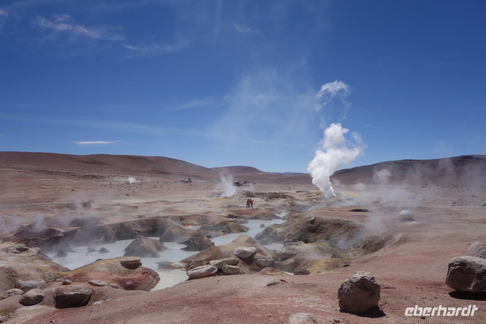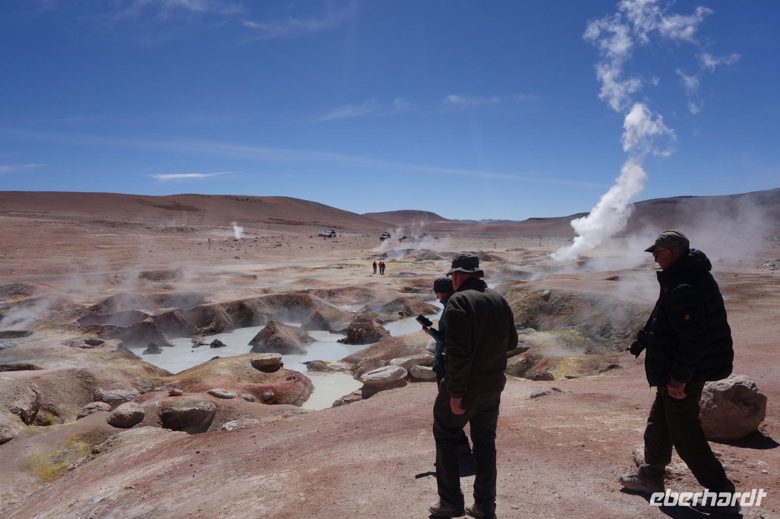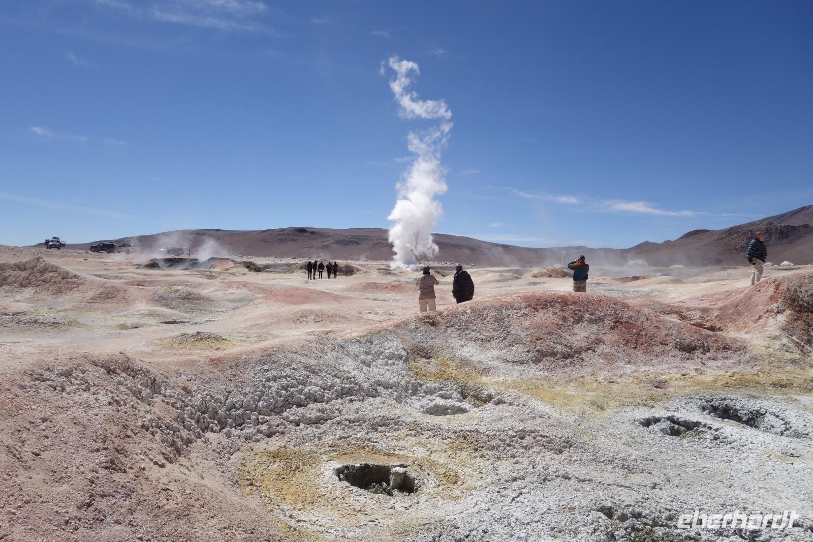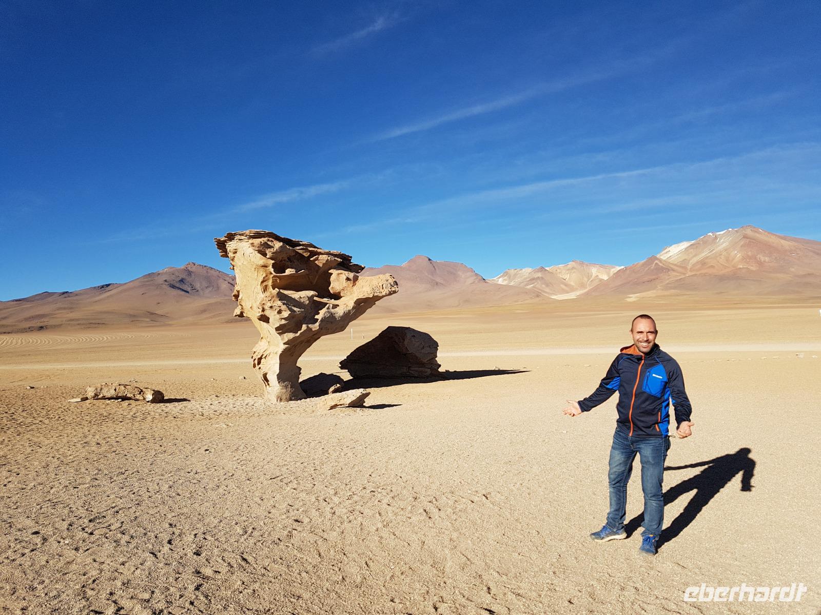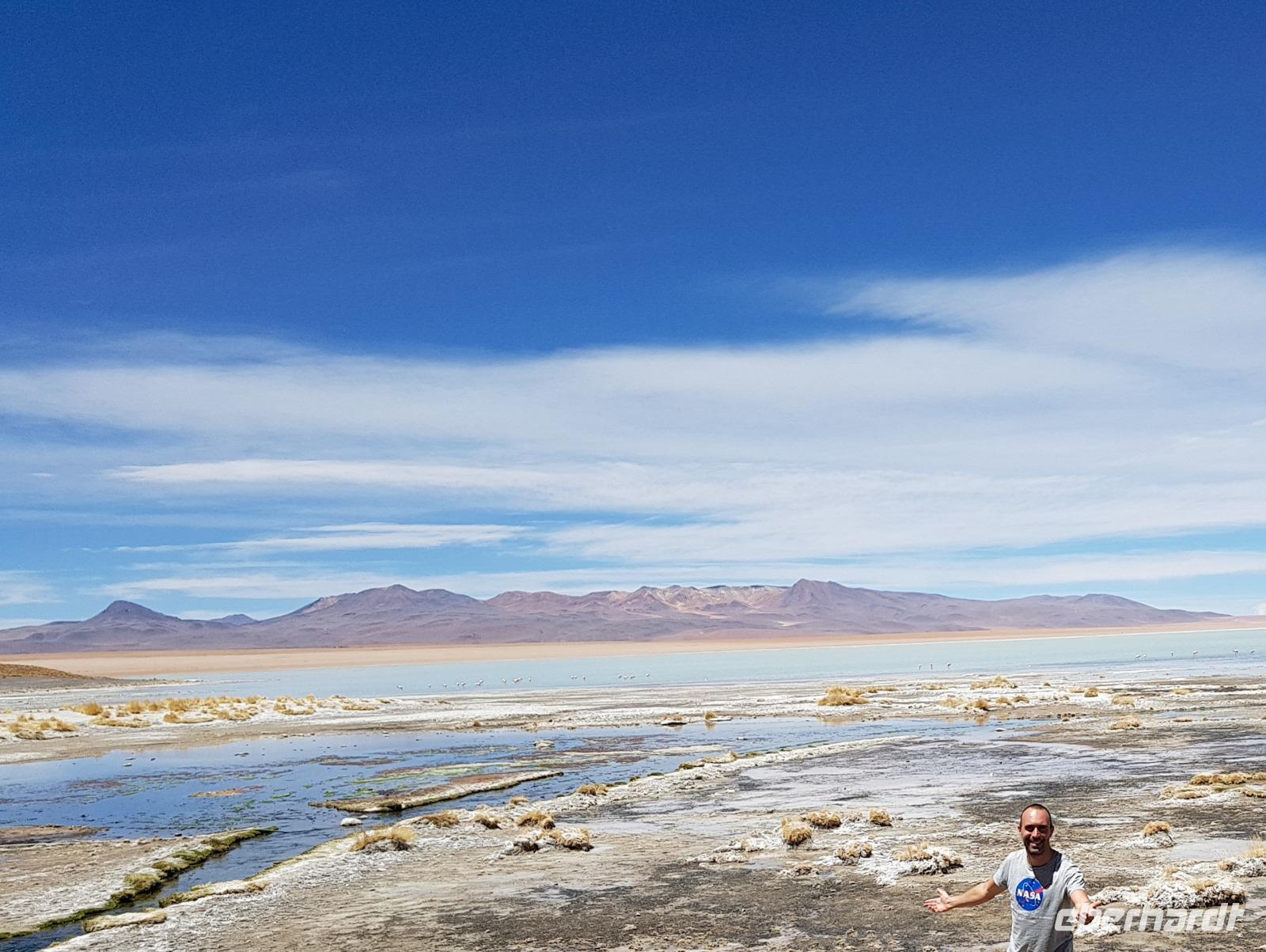 Wir haben sehr gut geschlafen. Heute haben wir wieder viel schönes vor und viele Kilometern liegen vor uns. Um 6 Uhr gibt es Frühstück und nur eine halbe Stunde später ist Abfahrt. Jeder Tag bis jetzt war wunderschön aber heute wird wieder ein ganz besonderes Highlight auf uns warten. Ob man es alles verarbeiten kann. Bestimmt wenn man in Deutschland zurück ist. Wir fahren erstmal zum "Steinbaum". Wir treffen auf eine Steinformation in Form eines Baumes mitten in der Wüste. Durch den Wind und die Kälte werden solche bizarren Formen geschaffen. Wir sind über 4000 Meter hoch und fahren durch die Wüste. Tolle Farben überall. Oben bei den Vulkanen sieht man verschiedene Farben, als wären sie von einem Künstler gemalt. Heute erwartet es uns ein wahres Farbenspiel im Reserva Nacional Eduardo Avaroa. Erstmal besuchen wir die Laguna Colorada (oder farbige Lagune), die ihrem Namen alle Ehre macht. Hier spazieren wir gemütlich ca. 40 Minuten und sehen die langbeinigen Andenflamingos. Ein Traum. Wir entdecken warmes Wasser am Rand und bald werden wir erfahren warum. Nicht weit von hier befindet sich der Geysir "Sol de Manana" (oder Morgensonne). Hier beobachten wir die geotektonischen Aktivitäten an den Schlamm-Vulkanen in Sol de Manana. Überall sind riesige und mehrfarbige blubbernde Erdlöcher und dampfende Fontänen. Die Erde kocht gerade unter unseren Füßen. Hier oben machen wir keine großen Bewegungen, da wir uns auf fast 5000 Meter Höhe befinden, aber alles ist gut und wir merken langsam nicht mehr die Höhe.