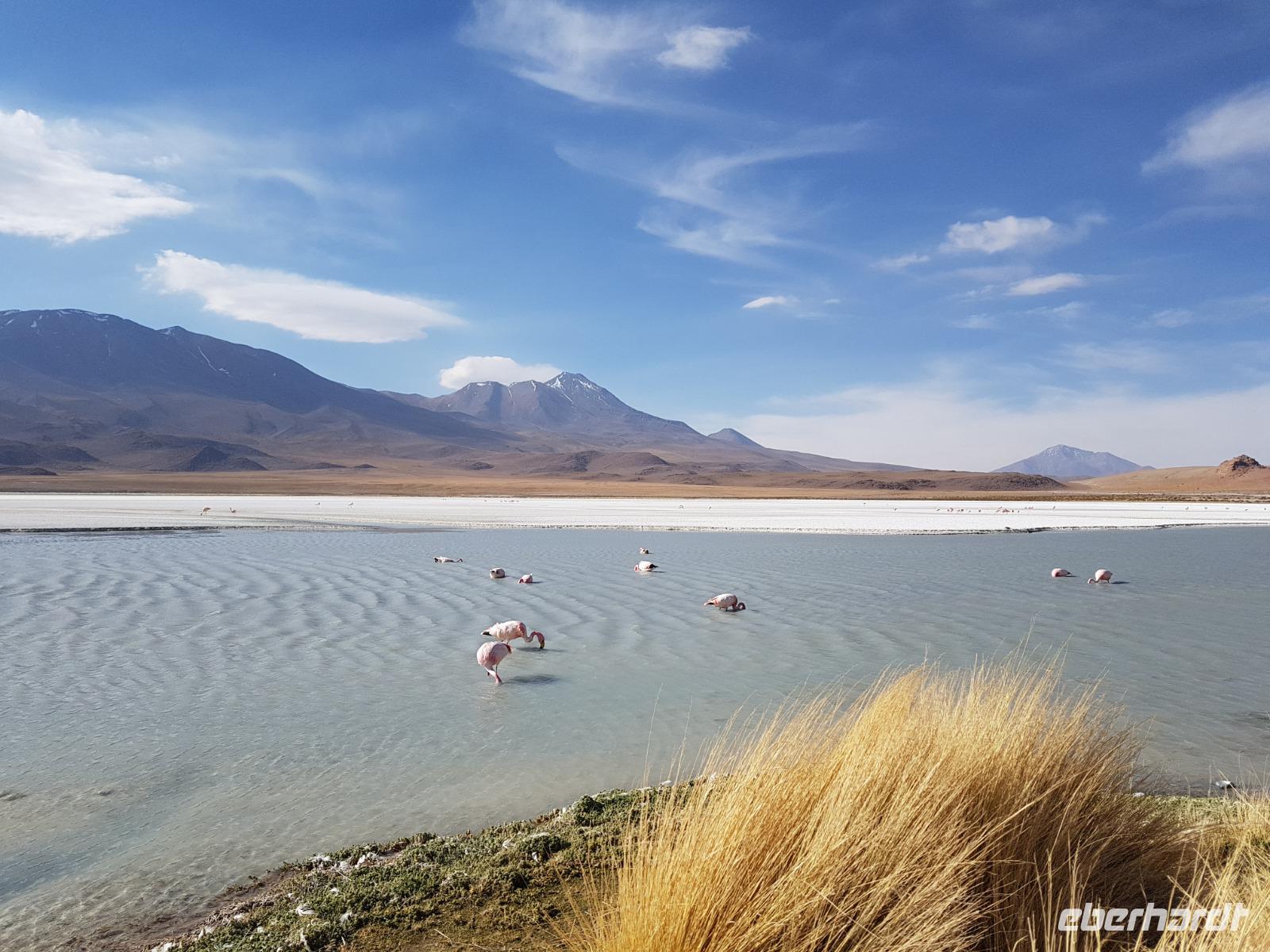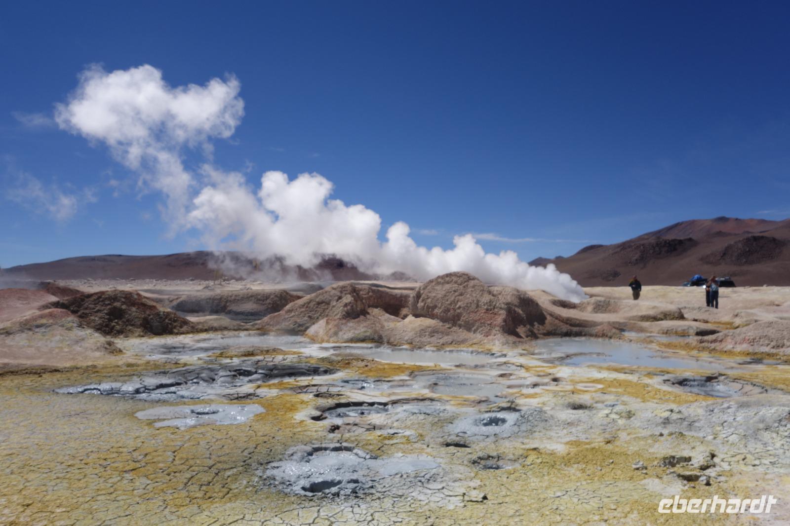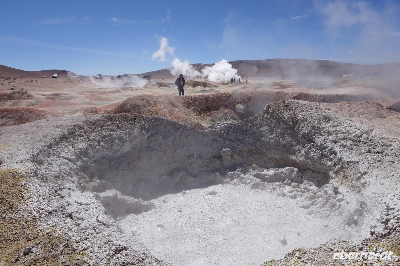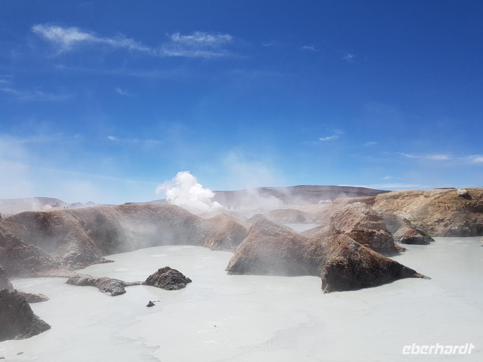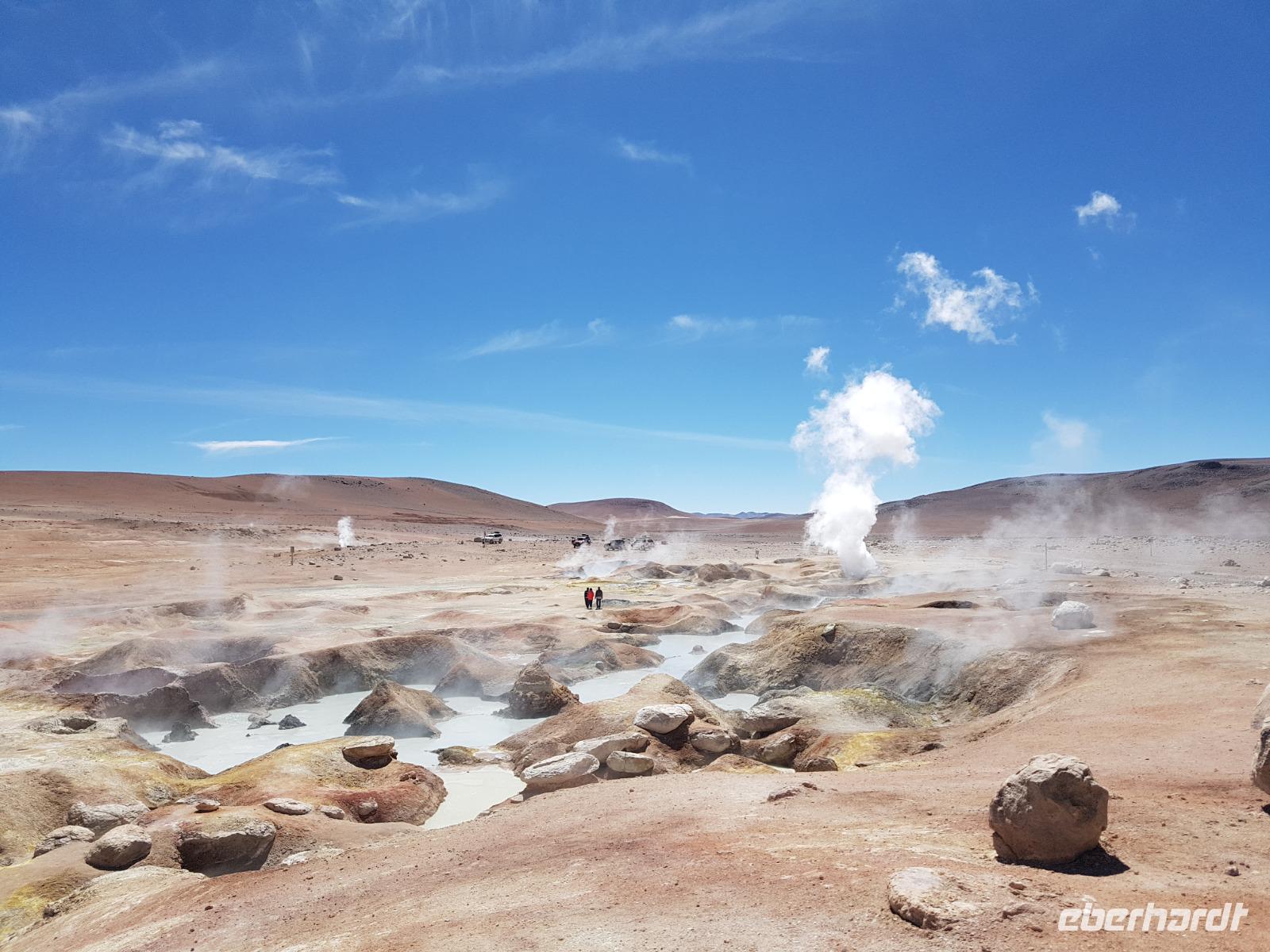 Wir haben sehr gut geschlafen. Heute haben wir wieder viel schönes vor und viele Kilometern liegen vor uns. Um 6 Uhr gibt es Frühstück und nur eine halbe Stunde später ist Abfahrt. Jeder Tag bis jetzt war wunderschön aber heute wird wieder ein ganz besonderes Highlight auf uns warten. Ob man es alles verarbeiten kann. Bestimmt wenn man in Deutschland zurück ist. Wir fahren erstmal zum "Steinbaum". Wir treffen auf eine Steinformation in Form eines Baumes mitten in der Wüste. Durch den Wind und die Kälte werden solche bizarren Formen geschaffen. Wir sind über 4000 Meter hoch und fahren durch die Wüste. Tolle Farben überall. Oben bei den Vulkanen sieht man verschiedene Farben, als wären sie von einem Künstler gemalt. Heute erwartet es uns ein wahres Farbenspiel im Reserva Nacional Eduardo Avaroa. Erstmal besuchen wir die Laguna Colorada (oder farbige Lagune), die ihrem Namen alle Ehre macht. Hier spazieren wir gemütlich ca. 40 Minuten und sehen die langbeinigen Andenflamingos. Ein Traum. Wir entdecken warmes Wasser am Rand und bald werden wir erfahren warum. Nicht weit von hier befindet sich der Geysir "Sol de Manana" (oder Morgensonne). Hier beobachten wir die geotektonischen Aktivitäten an den Schlamm-Vulkanen in Sol de Manana. Überall sind riesige und mehrfarbige blubbernde Erdlöcher und dampfende Fontänen. Die Erde kocht gerade unter unseren Füßen. Hier oben machen wir keine großen Bewegungen, da wir uns auf fast 5000 Meter Höhe befinden, aber alles ist gut und wir merken langsam nicht mehr die Höhe.