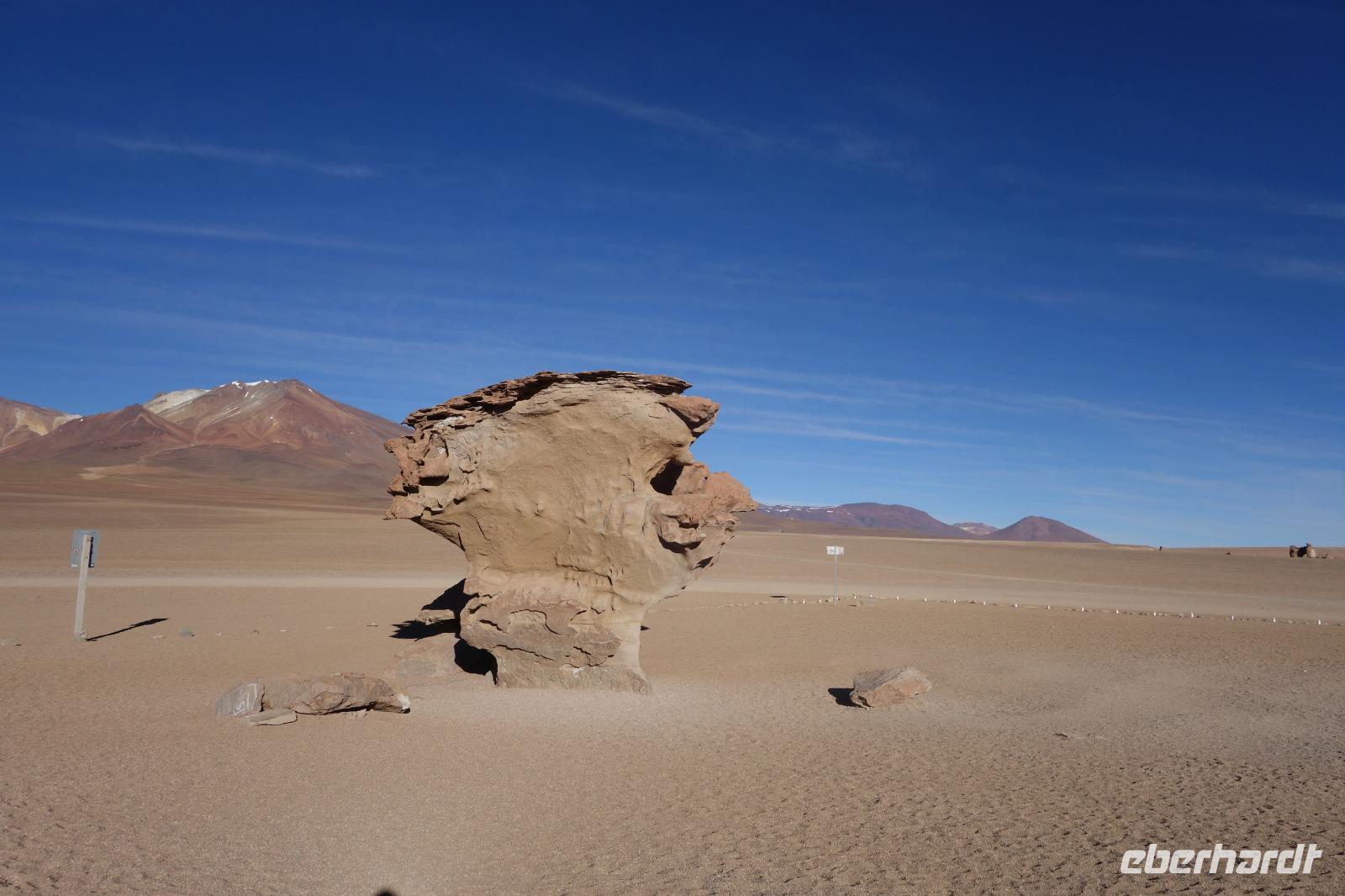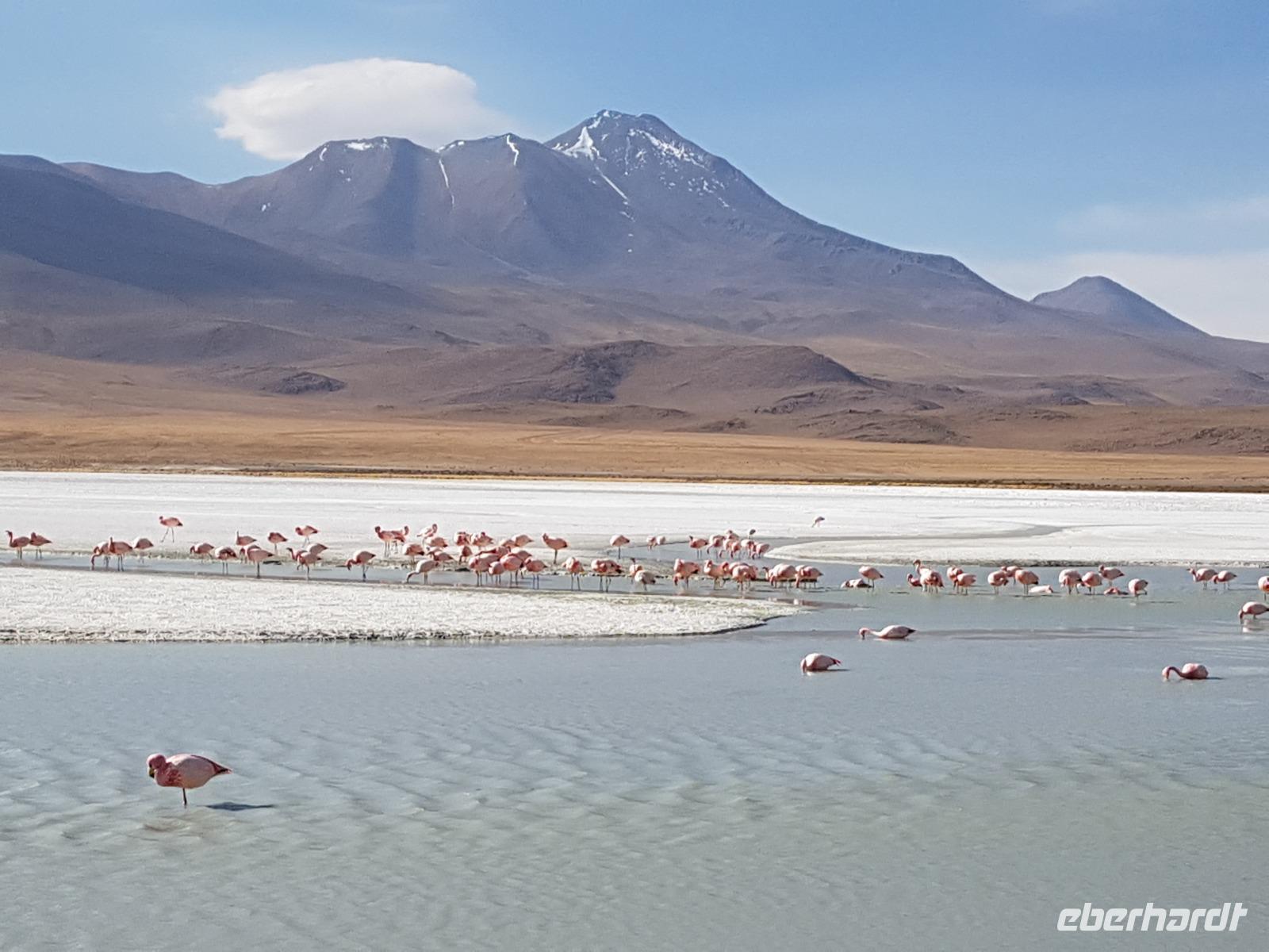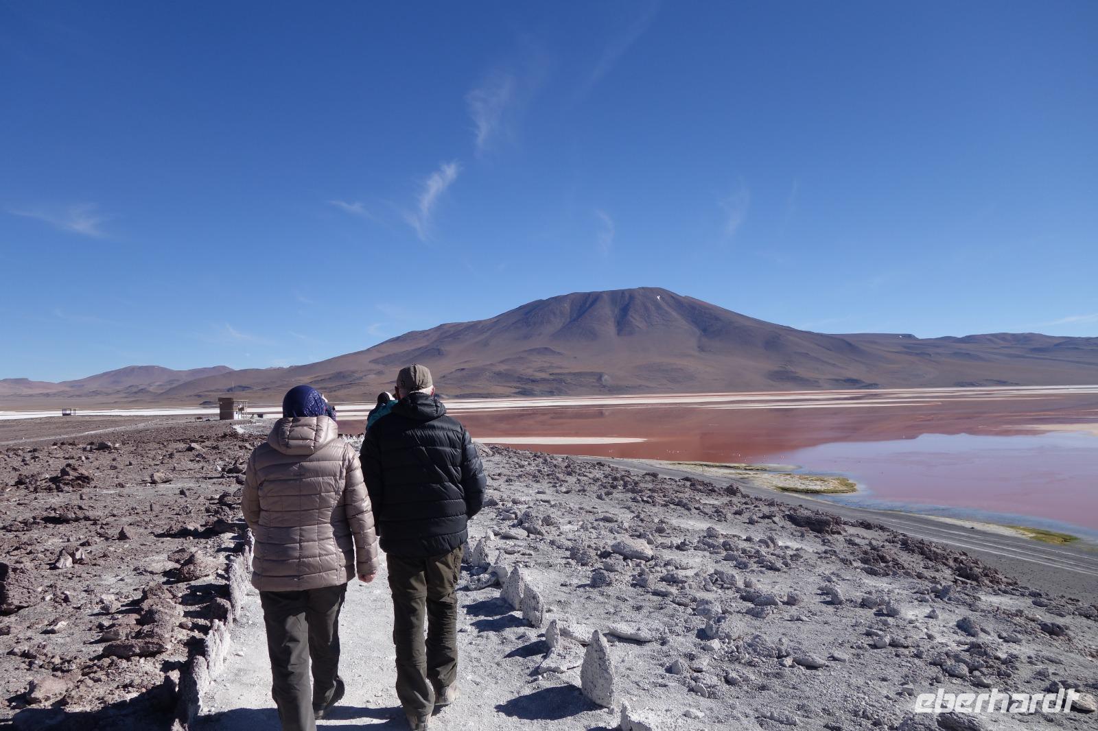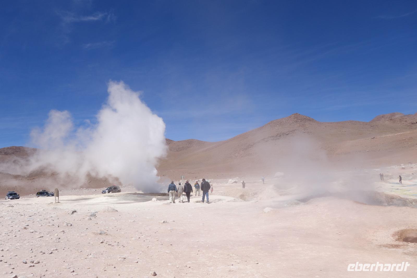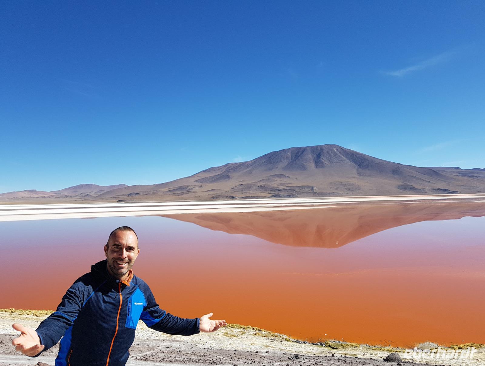 Wir haben sehr gut geschlafen. Heute haben wir wieder viel schönes vor und viele Kilometern liegen vor uns. Um 6 Uhr gibt es Frühstück und nur eine halbe Stunde später ist Abfahrt. Jeder Tag bis jetzt war wunderschön aber heute wird wieder ein ganz besonderes Highlight auf uns warten. Ob man es alles verarbeiten kann. Bestimmt wenn man in Deutschland zurück ist. Wir fahren erstmal zum "Steinbaum". Wir treffen auf eine Steinformation in Form eines Baumes mitten in der Wüste. Durch den Wind und die Kälte werden solche bizarren Formen geschaffen. Wir sind über 4000 Meter hoch und fahren durch die Wüste. Tolle Farben überall. Oben bei den Vulkanen sieht man verschiedene Farben, als wären sie von einem Künstler gemalt. Heute erwartet es uns ein wahres Farbenspiel im Reserva Nacional Eduardo Avaroa. Erstmal besuchen wir die Laguna Colorada (oder farbige Lagune), die ihrem Namen alle Ehre macht. Hier spazieren wir gemütlich ca. 40 Minuten und sehen die langbeinigen Andenflamingos. Ein Traum. Wir entdecken warmes Wasser am Rand und bald werden wir erfahren warum. Nicht weit von hier befindet sich der Geysir "Sol de Manana" (oder Morgensonne). Hier beobachten wir die geotektonischen Aktivitäten an den Schlamm-Vulkanen in Sol de Manana. Überall sind riesige und mehrfarbige blubbernde Erdlöcher und dampfende Fontänen. Die Erde kocht gerade unter unseren Füßen. Hier oben machen wir keine großen Bewegungen, da wir uns auf fast 5000 Meter Höhe befinden, aber alles ist gut und wir merken langsam nicht mehr die Höhe.