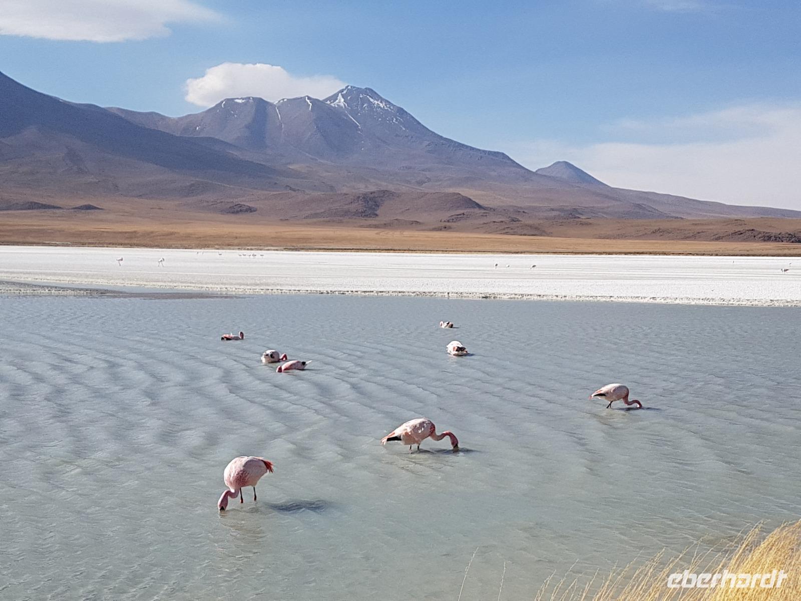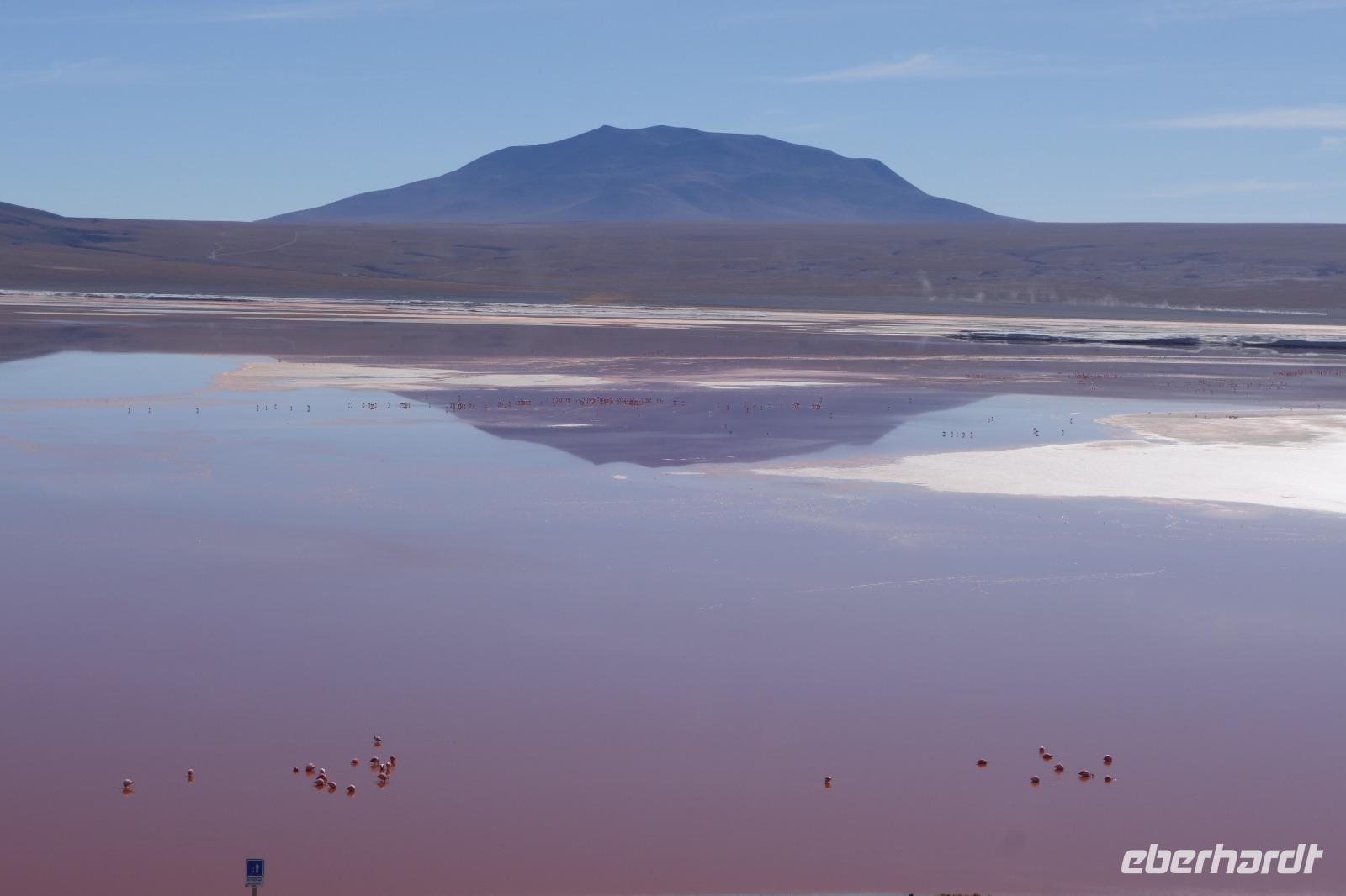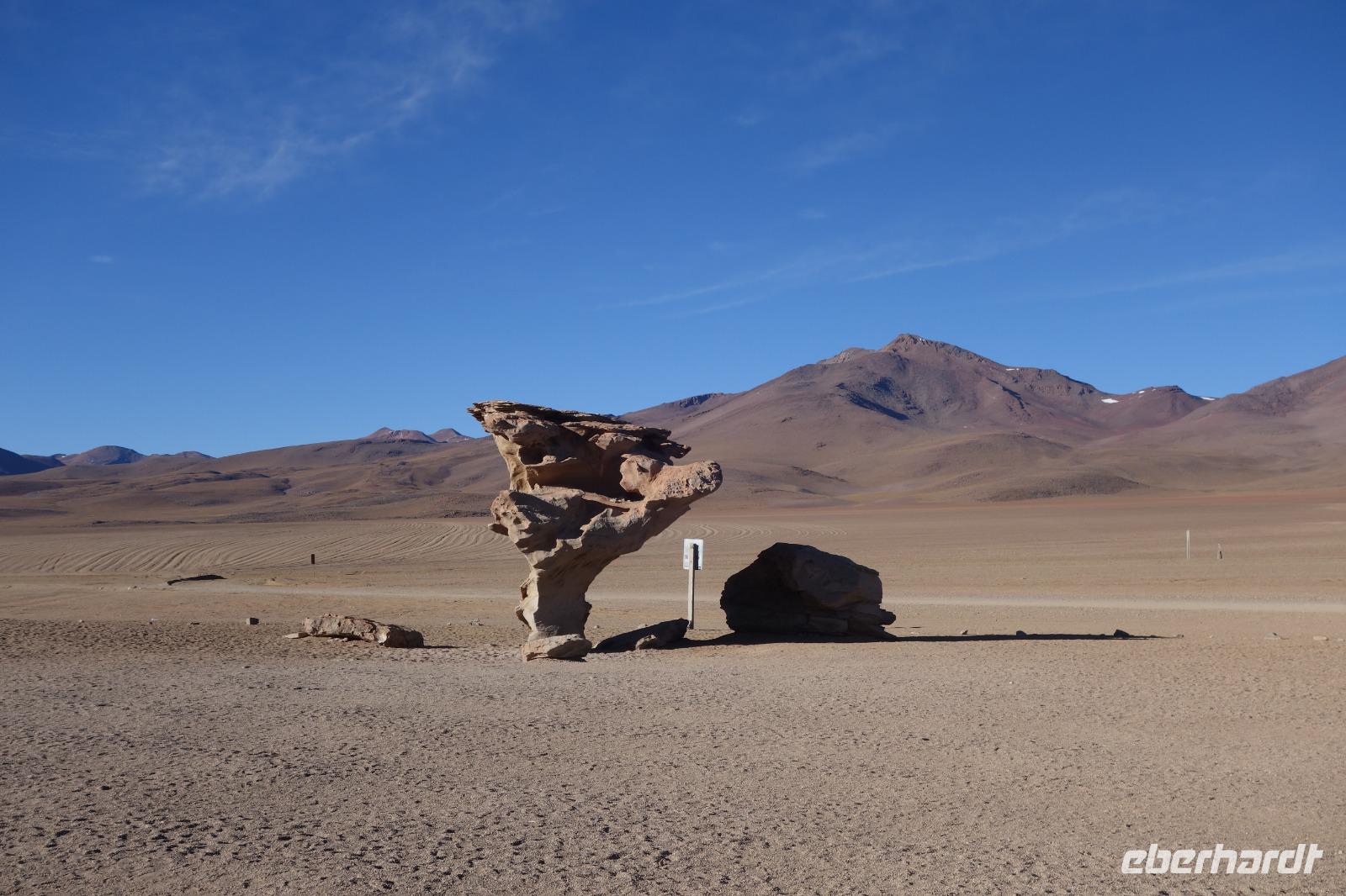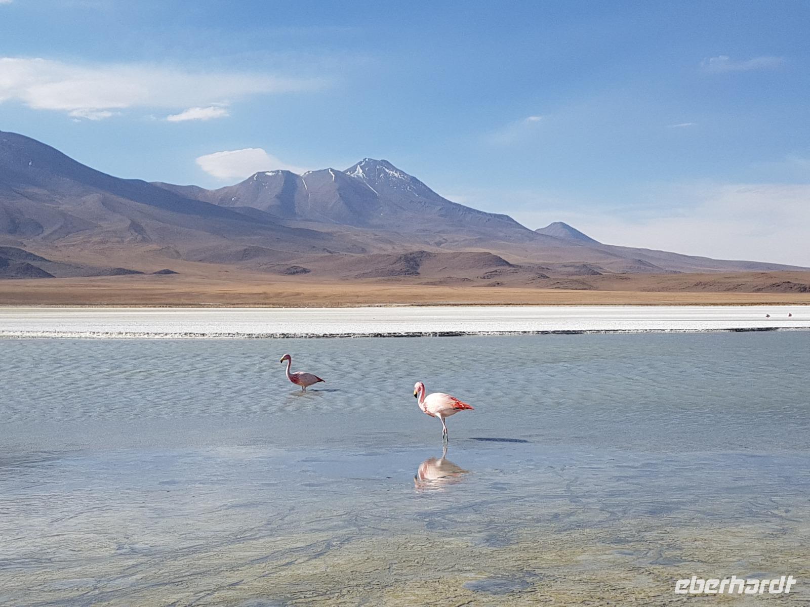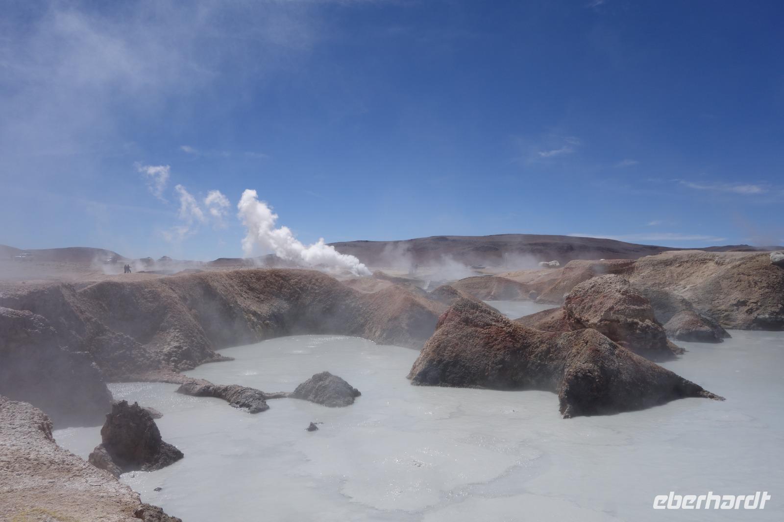 Wir haben sehr gut geschlafen. Heute haben wir wieder viel schönes vor und viele Kilometern liegen vor uns. Um 6 Uhr gibt es Frühstück und nur eine halbe Stunde später ist Abfahrt. Jeder Tag bis jetzt war wunderschön aber heute wird wieder ein ganz besonderes Highlight auf uns warten. Ob man es alles verarbeiten kann. Bestimmt wenn man in Deutschland zurück ist. Wir fahren erstmal zum "Steinbaum". Wir treffen auf eine Steinformation in Form eines Baumes mitten in der Wüste. Durch den Wind und die Kälte werden solche bizarren Formen geschaffen. Wir sind über 4000 Meter hoch und fahren durch die Wüste. Tolle Farben überall. Oben bei den Vulkanen sieht man verschiedene Farben, als wären sie von einem Künstler gemalt. Heute erwartet es uns ein wahres Farbenspiel im Reserva Nacional Eduardo Avaroa. Erstmal besuchen wir die Laguna Colorada (oder farbige Lagune), die ihrem Namen alle Ehre macht. Hier spazieren wir gemütlich ca. 40 Minuten und sehen die langbeinigen Andenflamingos. Ein Traum. Wir entdecken warmes Wasser am Rand und bald werden wir erfahren warum. Nicht weit von hier befindet sich der Geysir "Sol de Manana" (oder Morgensonne). Hier beobachten wir die geotektonischen Aktivitäten an den Schlamm-Vulkanen in Sol de Manana. Überall sind riesige und mehrfarbige blubbernde Erdlöcher und dampfende Fontänen. Die Erde kocht gerade unter unseren Füßen. Hier oben machen wir keine großen Bewegungen, da wir uns auf fast 5000 Meter Höhe befinden, aber alles ist gut und wir merken langsam nicht mehr die Höhe.