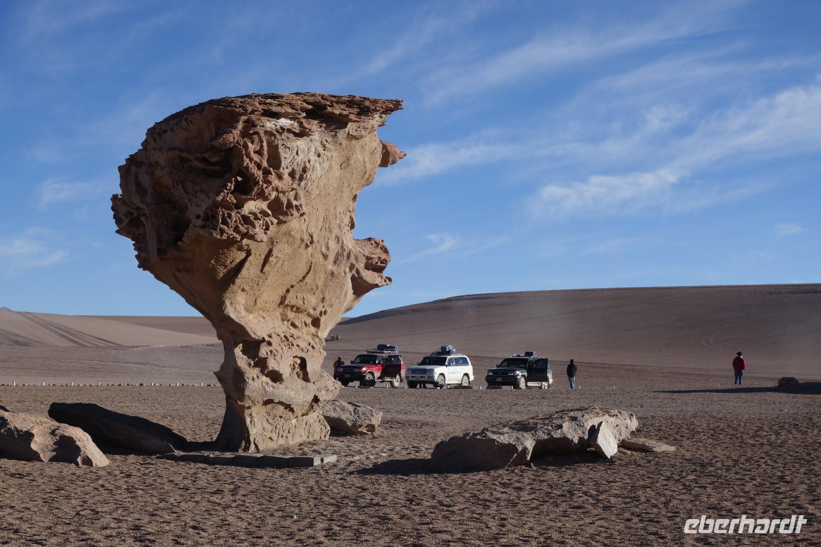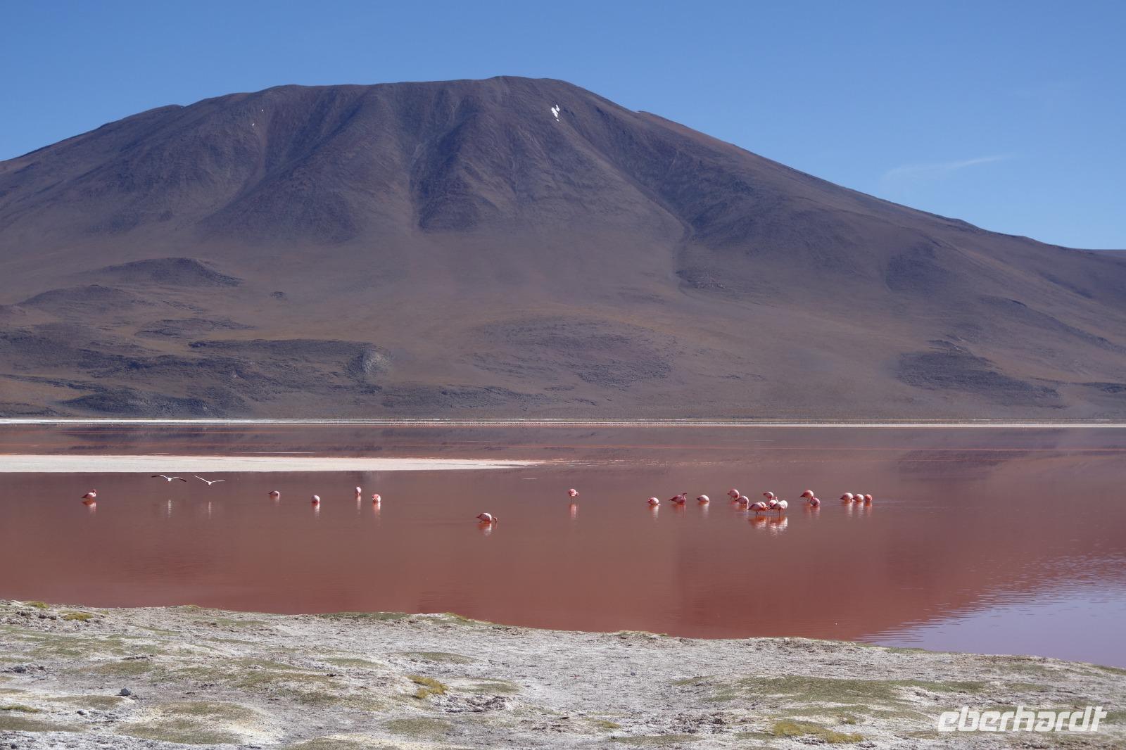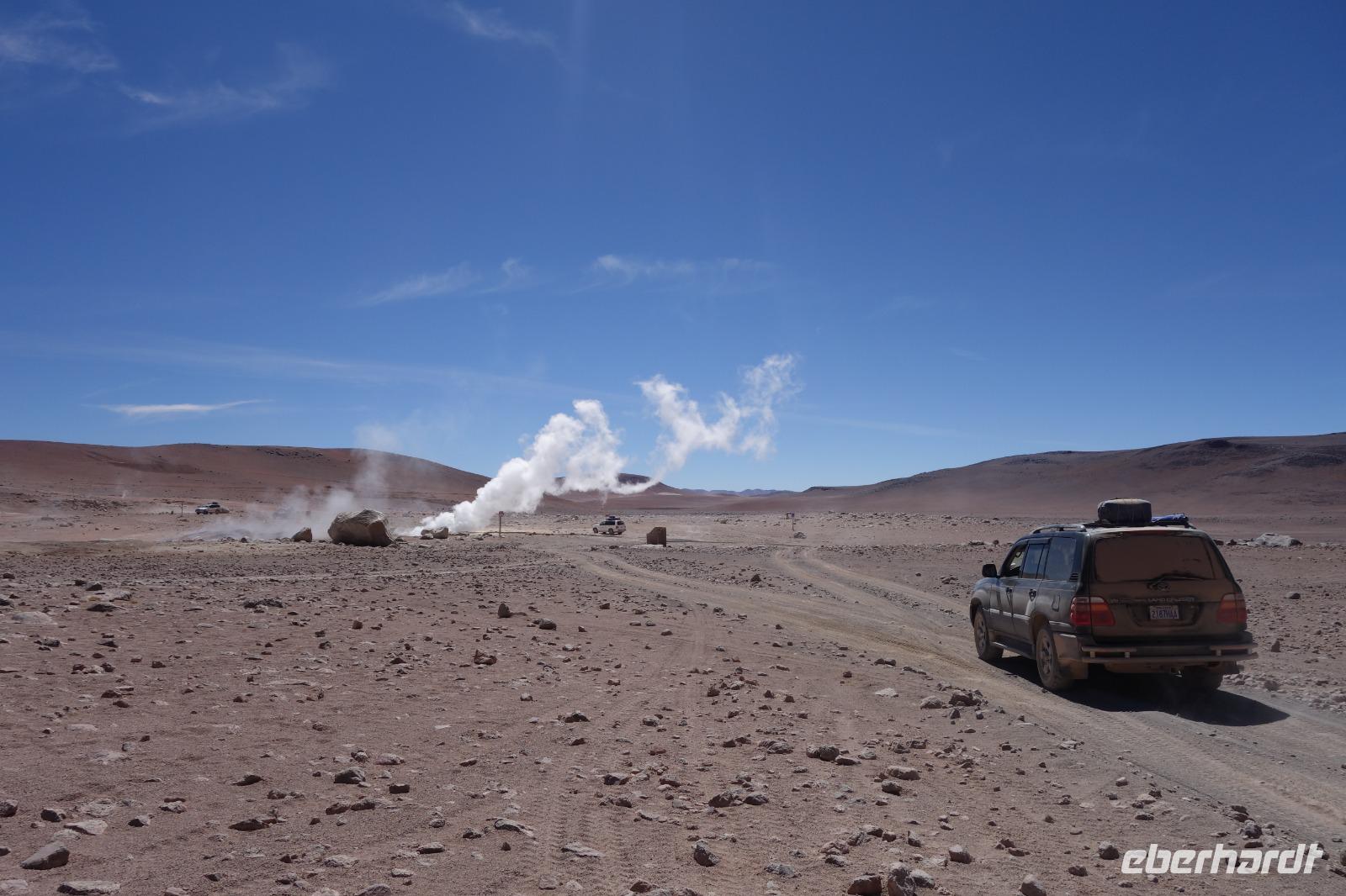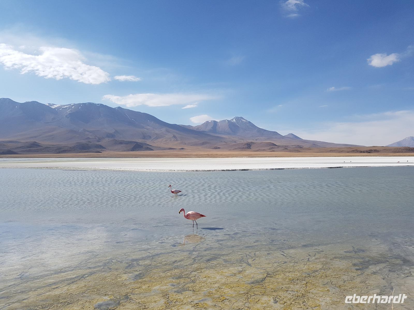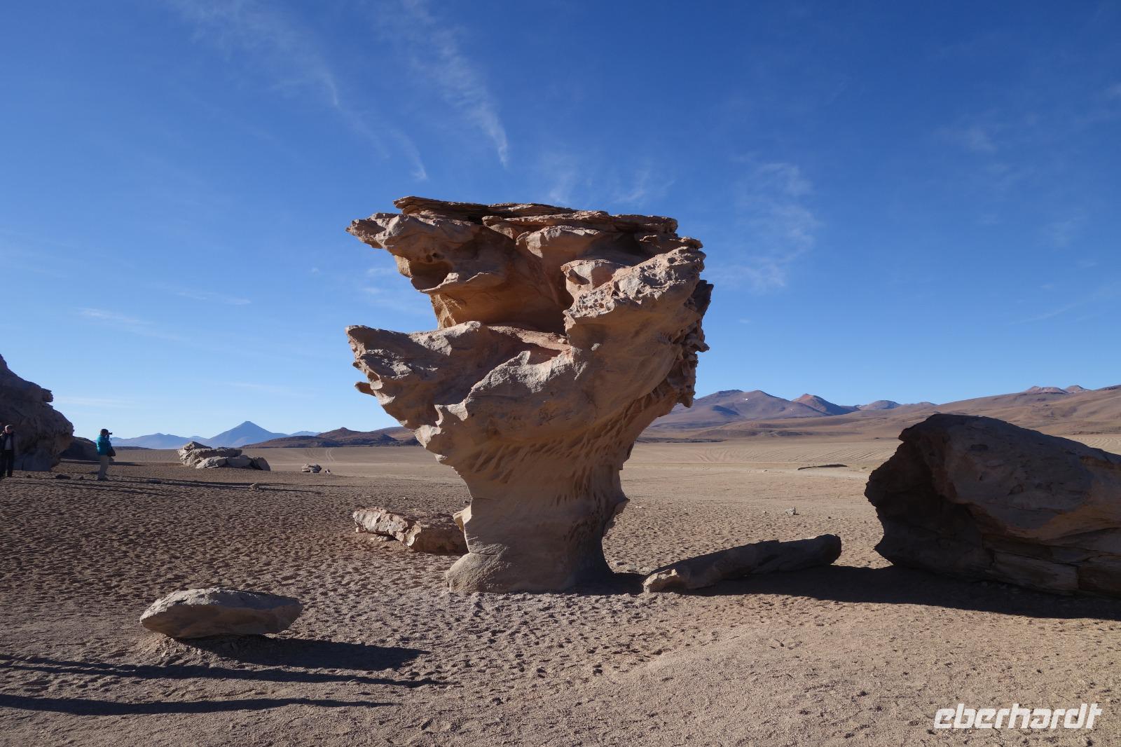 Wir haben sehr gut geschlafen. Heute haben wir wieder viel schönes vor und viele Kilometern liegen vor uns. Um 6 Uhr gibt es Frühstück und nur eine halbe Stunde später ist Abfahrt. Jeder Tag bis jetzt war wunderschön aber heute wird wieder ein ganz besonderes Highlight auf uns warten. Ob man es alles verarbeiten kann. Bestimmt wenn man in Deutschland zurück ist. Wir fahren erstmal zum "Steinbaum". Wir treffen auf eine Steinformation in Form eines Baumes mitten in der Wüste. Durch den Wind und die Kälte werden solche bizarren Formen geschaffen. Wir sind über 4000 Meter hoch und fahren durch die Wüste. Tolle Farben überall. Oben bei den Vulkanen sieht man verschiedene Farben, als wären sie von einem Künstler gemalt. Heute erwartet es uns ein wahres Farbenspiel im Reserva Nacional Eduardo Avaroa. Erstmal besuchen wir die Laguna Colorada (oder farbige Lagune), die ihrem Namen alle Ehre macht. Hier spazieren wir gemütlich ca. 40 Minuten und sehen die langbeinigen Andenflamingos. Ein Traum. Wir entdecken warmes Wasser am Rand und bald werden wir erfahren warum. Nicht weit von hier befindet sich der Geysir "Sol de Manana" (oder Morgensonne). Hier beobachten wir die geotektonischen Aktivitäten an den Schlamm-Vulkanen in Sol de Manana. Überall sind riesige und mehrfarbige blubbernde Erdlöcher und dampfende Fontänen. Die Erde kocht gerade unter unseren Füßen. Hier oben machen wir keine großen Bewegungen, da wir uns auf fast 5000 Meter Höhe befinden, aber alles ist gut und wir merken langsam nicht mehr die Höhe.