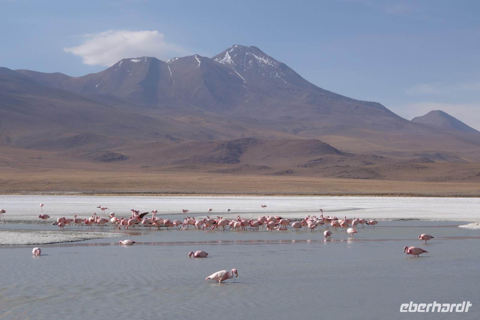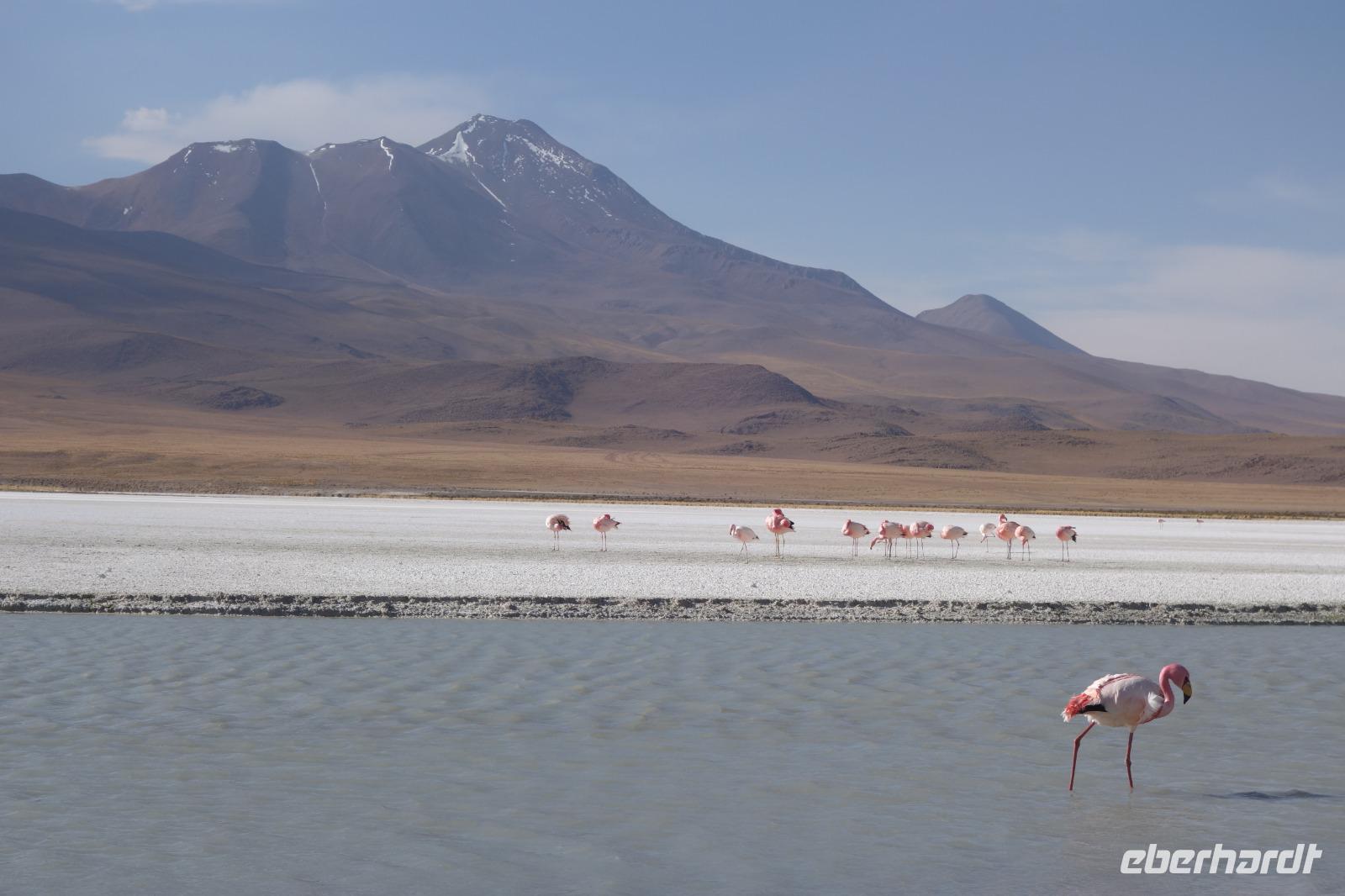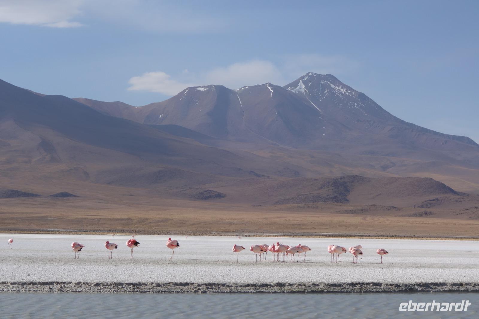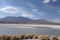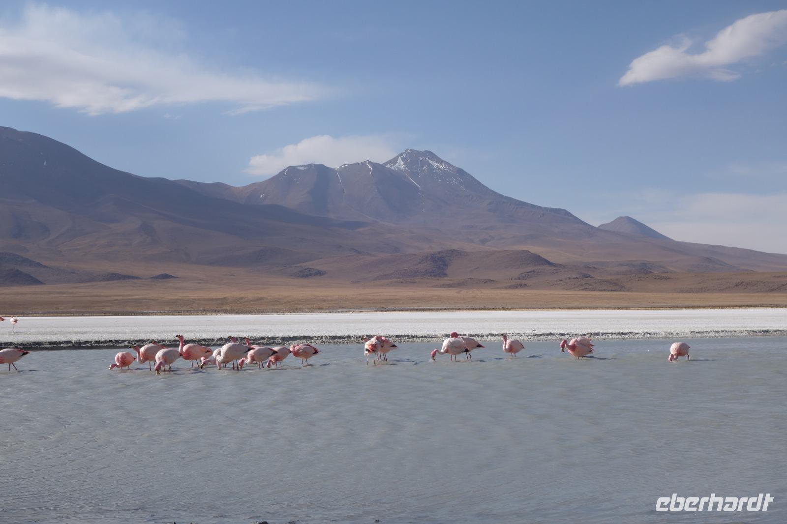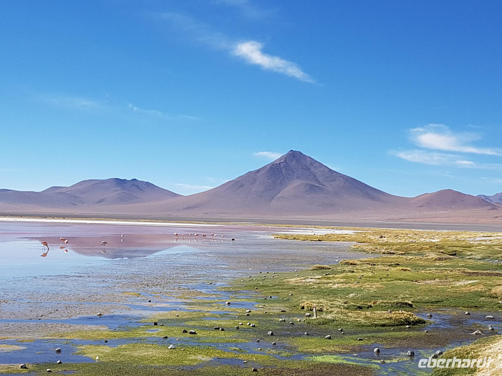 Wir haben sehr gut geschlafen. Heute haben wir wieder viel schönes vor und viele Kilometern liegen vor uns. Um 6 Uhr gibt es Frühstück und nur eine halbe Stunde später ist Abfahrt. Jeder Tag bis jetzt war wunderschön aber heute wird wieder ein ganz besonderes Highlight auf uns warten. Ob man es alles verarbeiten kann. Bestimmt wenn man in Deutschland zurück ist. Wir fahren erstmal zum "Steinbaum". Wir treffen auf eine Steinformation in Form eines Baumes mitten in der Wüste. Durch den Wind und die Kälte werden solche bizarren Formen geschaffen. Wir sind über 4000 Meter hoch und fahren durch die Wüste. Tolle Farben überall. Oben bei den Vulkanen sieht man verschiedene Farben, als wären sie von einem Künstler gemalt. Heute erwartet es uns ein wahres Farbenspiel im Reserva Nacional Eduardo Avaroa. Erstmal besuchen wir die Laguna Colorada (oder farbige Lagune), die ihrem Namen alle Ehre macht. Hier spazieren wir gemütlich ca. 40 Minuten und sehen die langbeinigen Andenflamingos. Ein Traum. Wir entdecken warmes Wasser am Rand und bald werden wir erfahren warum. Nicht weit von hier befindet sich der Geysir "Sol de Manana" (oder Morgensonne). Hier beobachten wir die geotektonischen Aktivitäten an den Schlamm-Vulkanen in Sol de Manana. Überall sind riesige und mehrfarbige blubbernde Erdlöcher und dampfende Fontänen. Die Erde kocht gerade unter unseren Füßen. Hier oben machen wir keine großen Bewegungen, da wir uns auf fast 5000 Meter Höhe befinden, aber alles ist gut und wir merken langsam nicht mehr die Höhe.