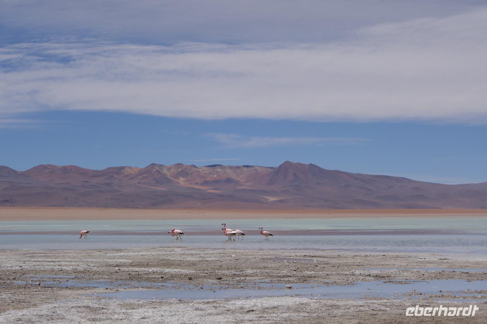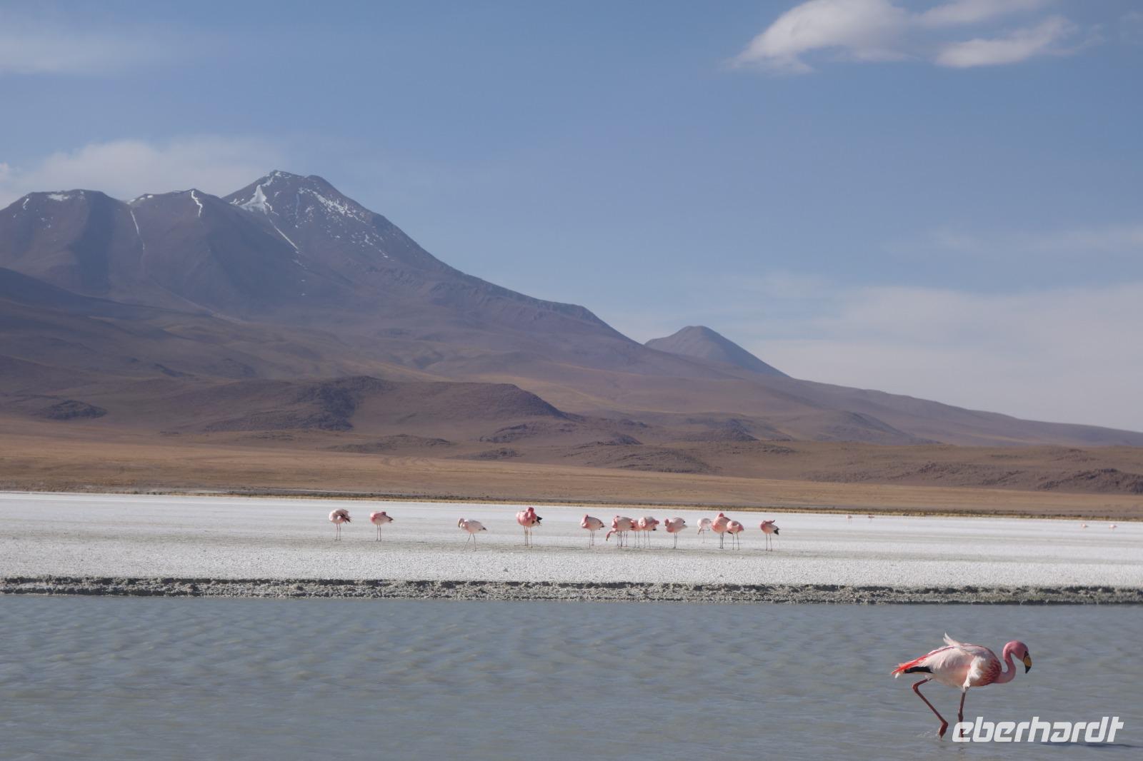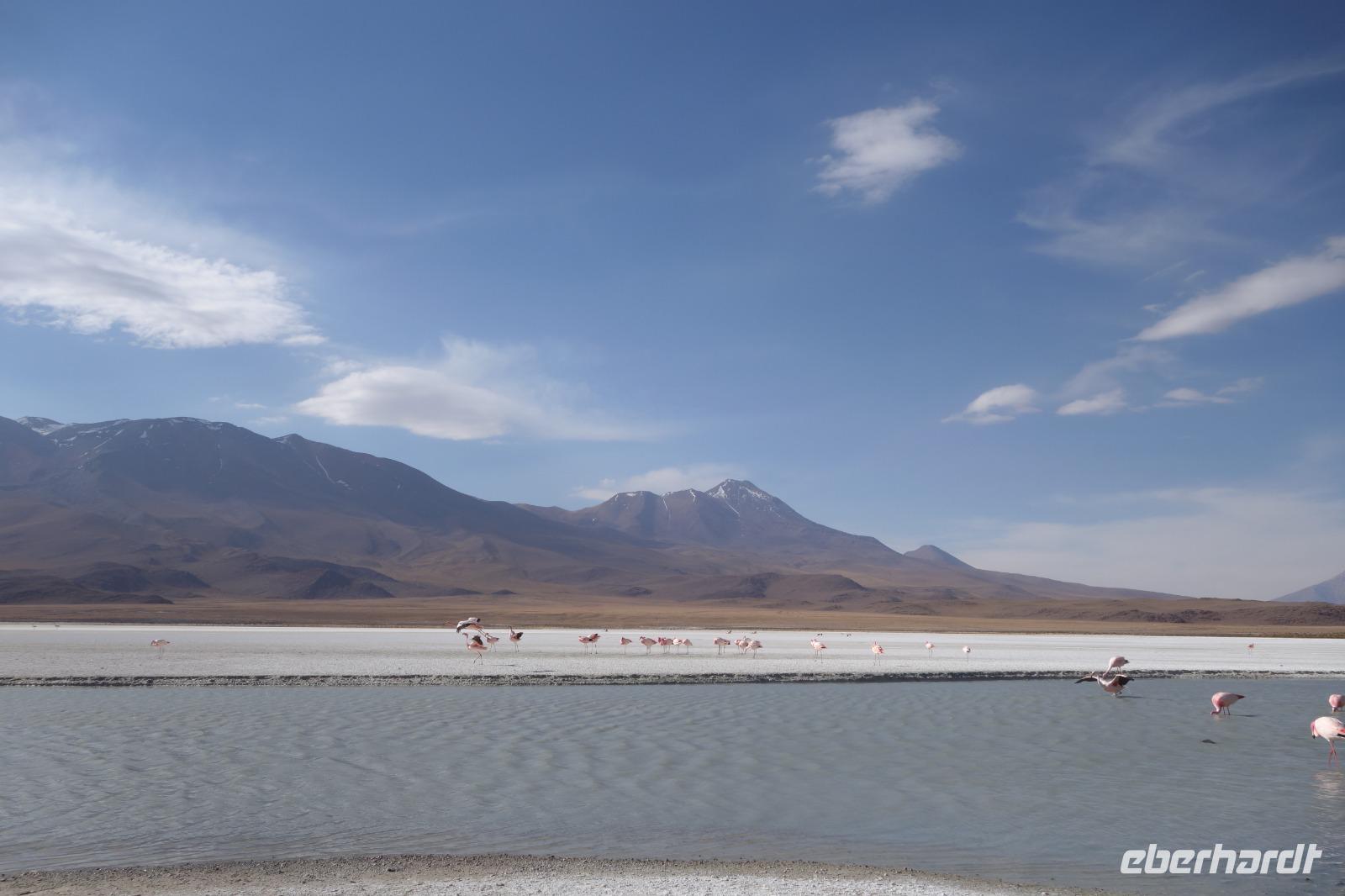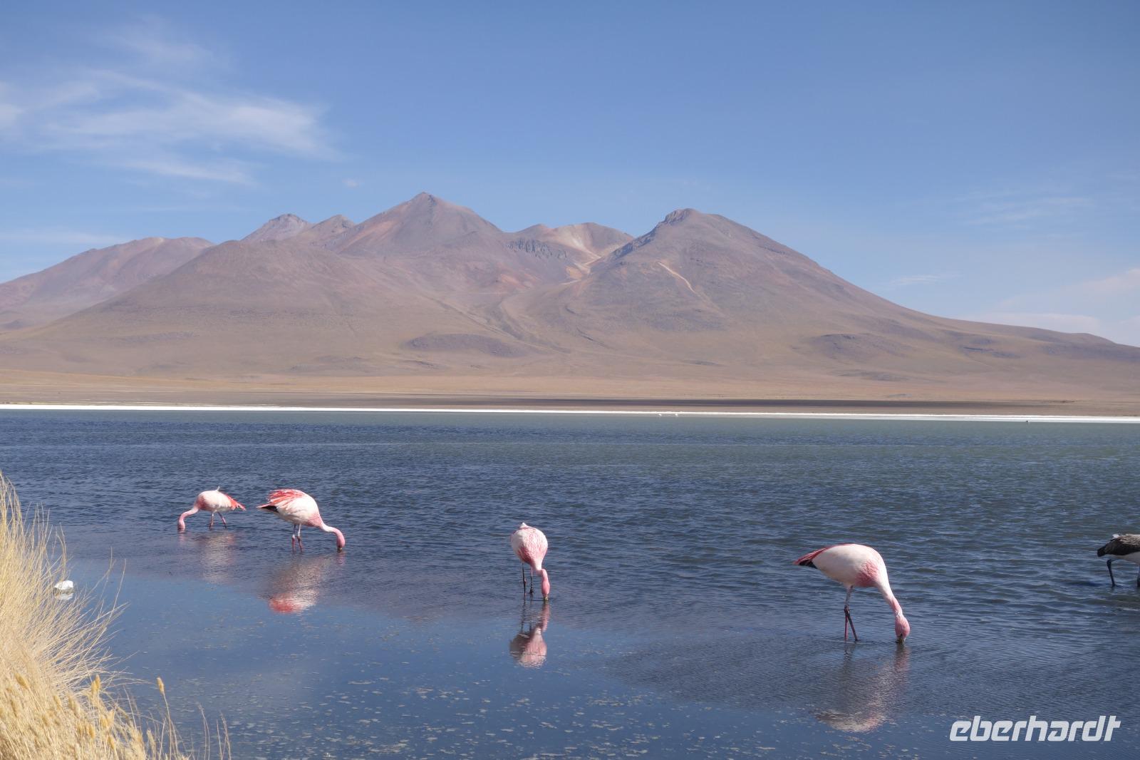 Wir haben sehr gut geschlafen. Heute haben wir wieder viel schönes vor und viele Kilometern liegen vor uns. Um 6 Uhr gibt es Frühstück und nur eine halbe Stunde später ist Abfahrt. Jeder Tag bis jetzt war wunderschön aber heute wird wieder ein ganz besonderes Highlight auf uns warten. Ob man es alles verarbeiten kann. Bestimmt wenn man in Deutschland zurück ist. Wir fahren erstmal zum "Steinbaum". Wir treffen auf eine Steinformation in Form eines Baumes mitten in der Wüste. Durch den Wind und die Kälte werden solche bizarren Formen geschaffen. Wir sind über 4000 Meter hoch und fahren durch die Wüste. Tolle Farben überall. Oben bei den Vulkanen sieht man verschiedene Farben, als wären sie von einem Künstler gemalt. Heute erwartet es uns ein wahres Farbenspiel im Reserva Nacional Eduardo Avaroa. Erstmal besuchen wir die Laguna Colorada (oder farbige Lagune), die ihrem Namen alle Ehre macht. Hier spazieren wir gemütlich ca. 40 Minuten und sehen die langbeinigen Andenflamingos. Ein Traum. Wir entdecken warmes Wasser am Rand und bald werden wir erfahren warum. Nicht weit von hier befindet sich der Geysir "Sol de Manana" (oder Morgensonne). Hier beobachten wir die geotektonischen Aktivitäten an den Schlamm-Vulkanen in Sol de Manana. Überall sind riesige und mehrfarbige blubbernde Erdlöcher und dampfende Fontänen. Die Erde kocht gerade unter unseren Füßen. Hier oben machen wir keine großen Bewegungen, da wir uns auf fast 5000 Meter Höhe befinden, aber alles ist gut und wir merken langsam nicht mehr die Höhe.