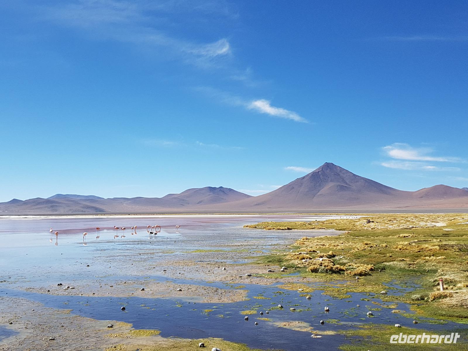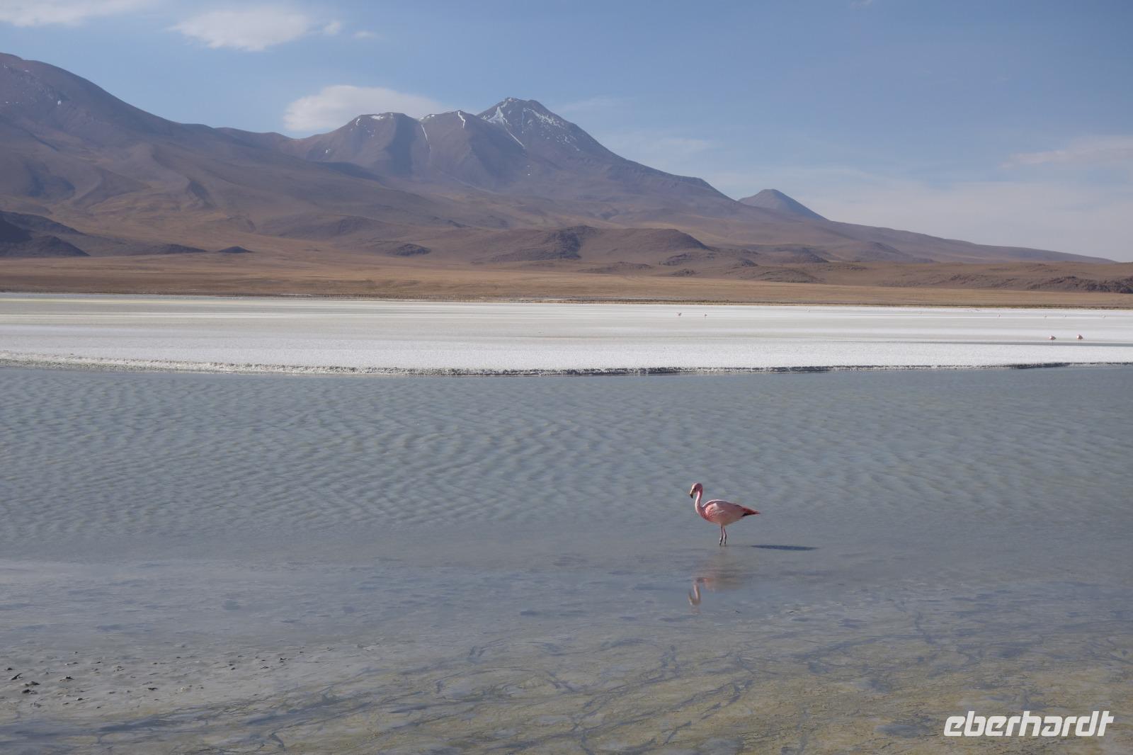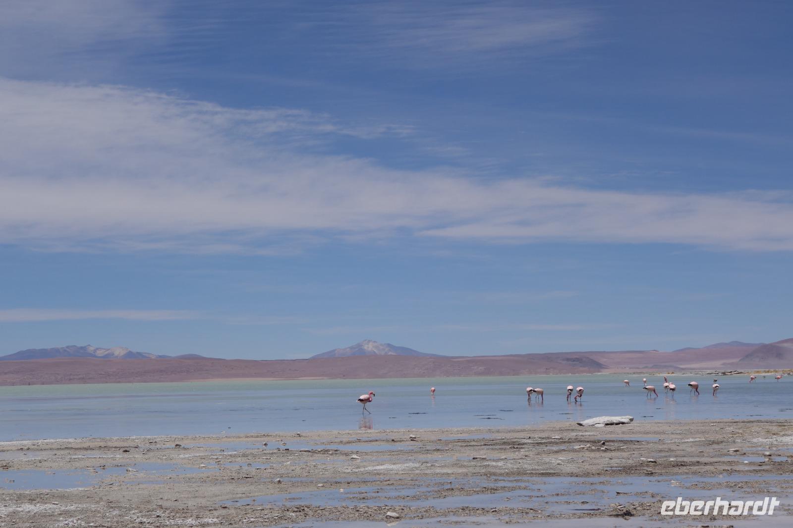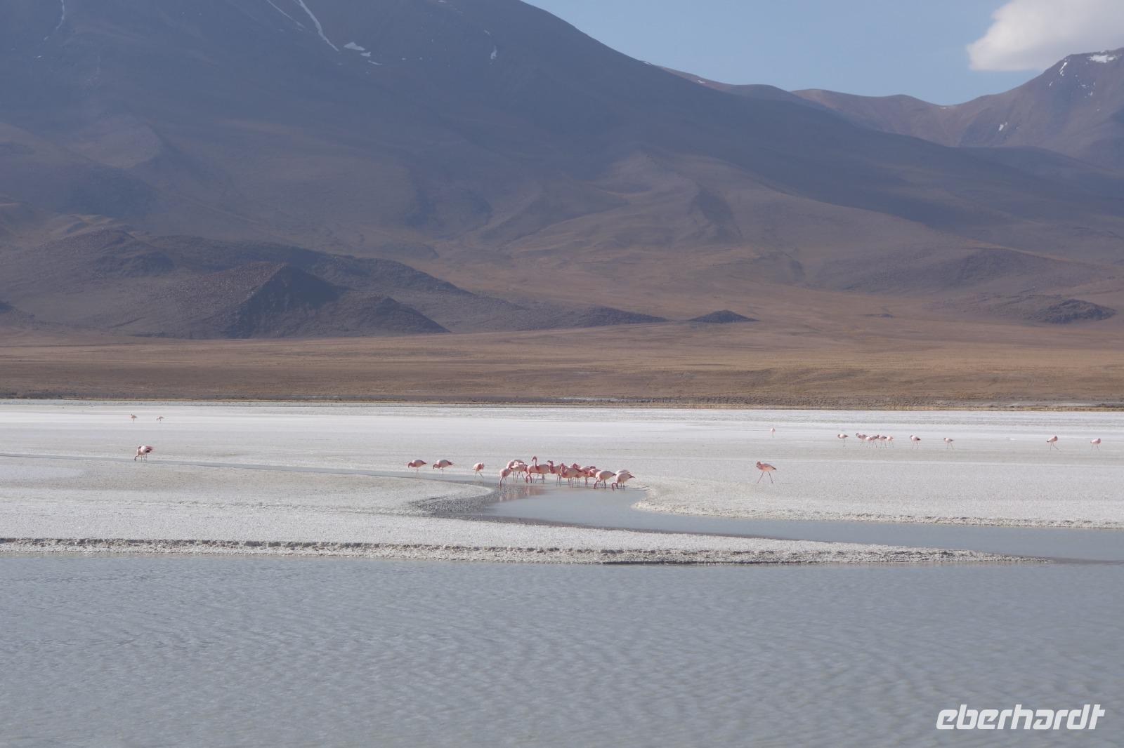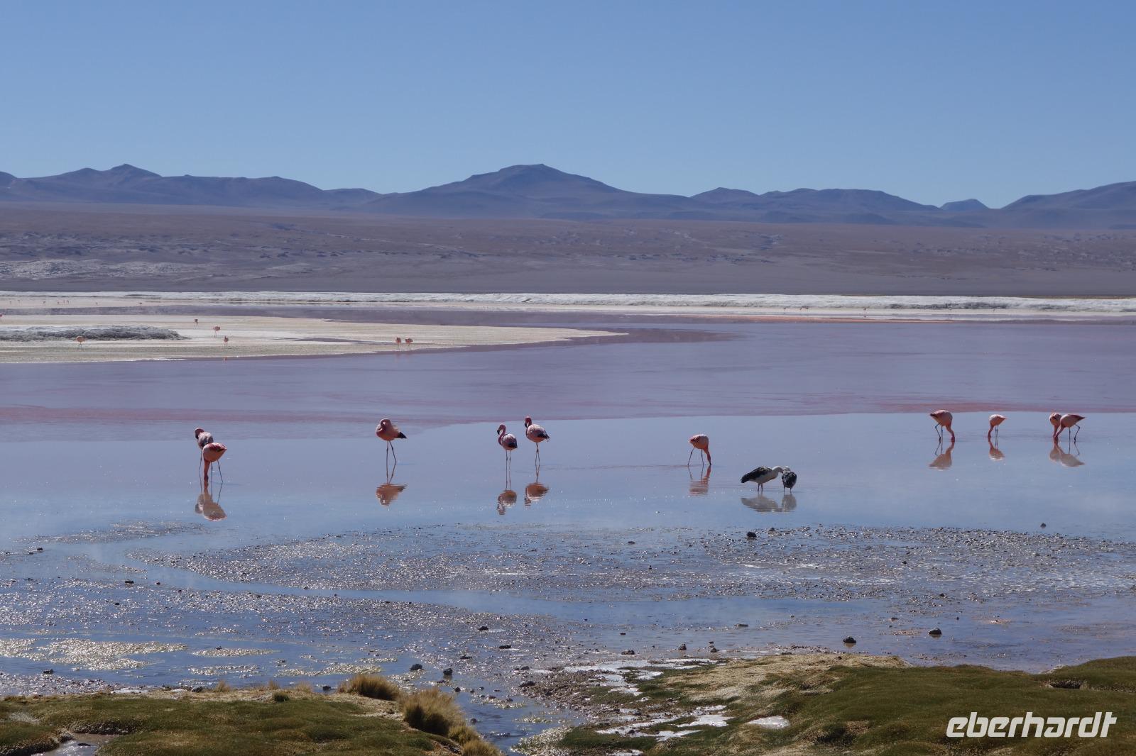 Wir haben sehr gut geschlafen. Heute haben wir wieder viel schönes vor und viele Kilometern liegen vor uns. Um 6 Uhr gibt es Frühstück und nur eine halbe Stunde später ist Abfahrt. Jeder Tag bis jetzt war wunderschön aber heute wird wieder ein ganz besonderes Highlight auf uns warten. Ob man es alles verarbeiten kann. Bestimmt wenn man in Deutschland zurück ist. Wir fahren erstmal zum "Steinbaum". Wir treffen auf eine Steinformation in Form eines Baumes mitten in der Wüste. Durch den Wind und die Kälte werden solche bizarren Formen geschaffen. Wir sind über 4000 Meter hoch und fahren durch die Wüste. Tolle Farben überall. Oben bei den Vulkanen sieht man verschiedene Farben, als wären sie von einem Künstler gemalt. Heute erwartet es uns ein wahres Farbenspiel im Reserva Nacional Eduardo Avaroa. Erstmal besuchen wir die Laguna Colorada (oder farbige Lagune), die ihrem Namen alle Ehre macht. Hier spazieren wir gemütlich ca. 40 Minuten und sehen die langbeinigen Andenflamingos. Ein Traum. Wir entdecken warmes Wasser am Rand und bald werden wir erfahren warum. Nicht weit von hier befindet sich der Geysir "Sol de Manana" (oder Morgensonne). Hier beobachten wir die geotektonischen Aktivitäten an den Schlamm-Vulkanen in Sol de Manana. Überall sind riesige und mehrfarbige blubbernde Erdlöcher und dampfende Fontänen. Die Erde kocht gerade unter unseren Füßen. Hier oben machen wir keine großen Bewegungen, da wir uns auf fast 5000 Meter Höhe befinden, aber alles ist gut und wir merken langsam nicht mehr die Höhe.