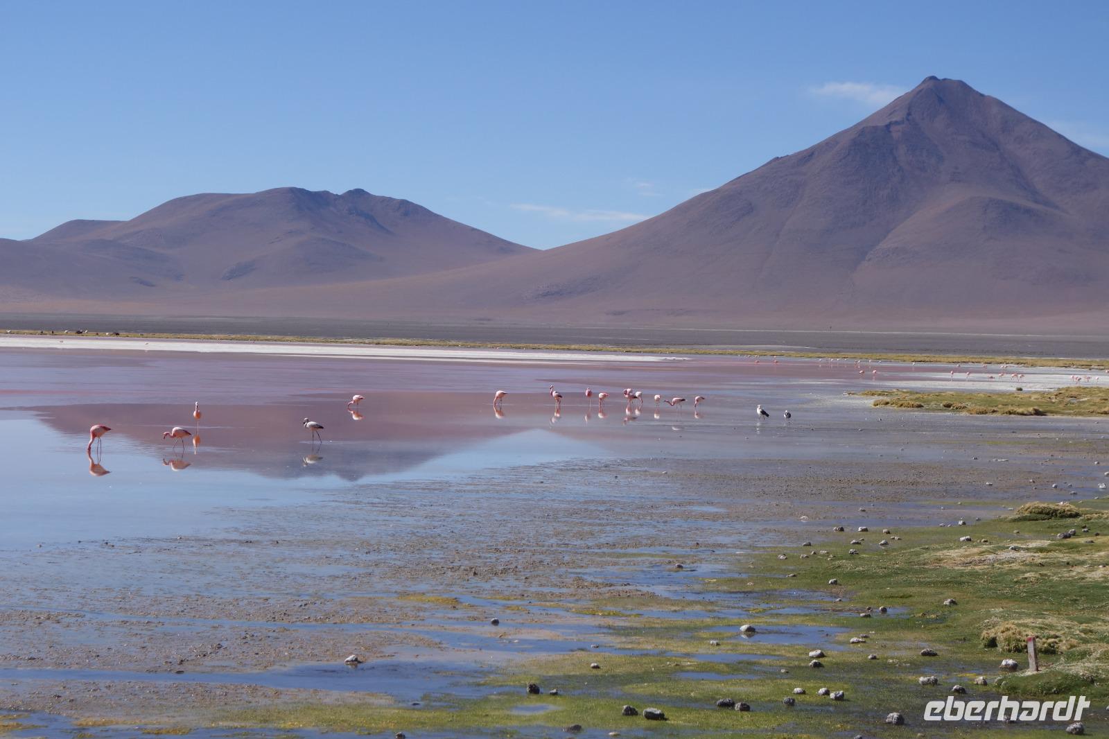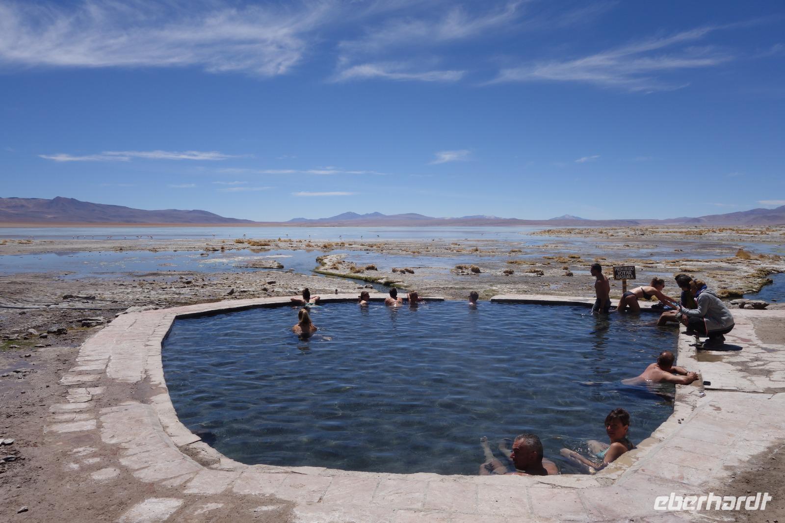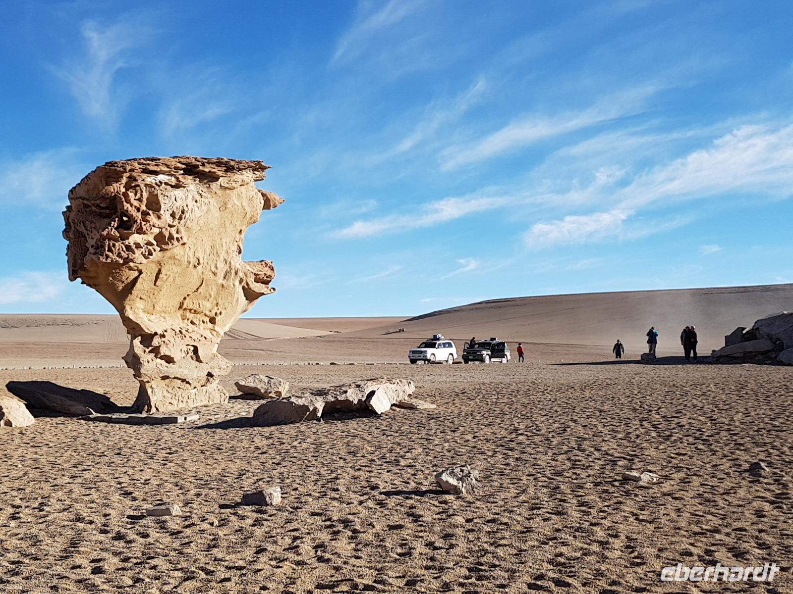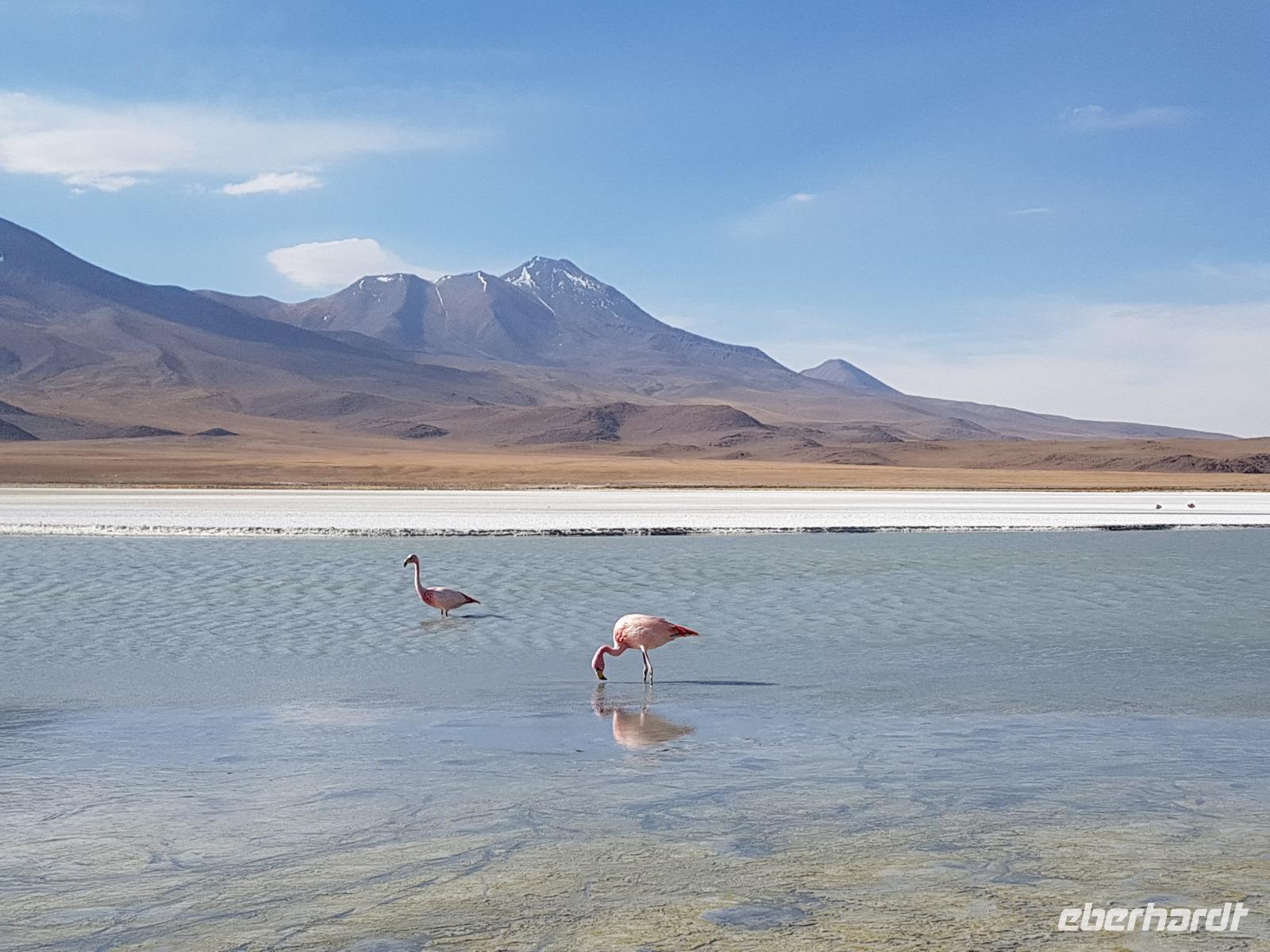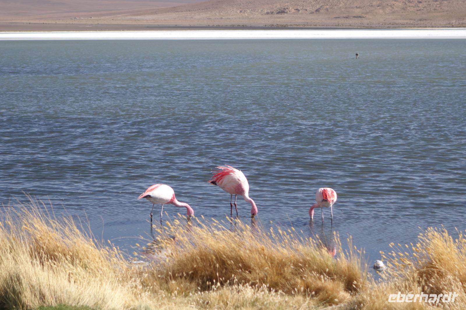 Wir haben sehr gut geschlafen. Heute haben wir wieder viel schönes vor und viele Kilometern liegen vor uns. Um 6 Uhr gibt es Frühstück und nur eine halbe Stunde später ist Abfahrt. Jeder Tag bis jetzt war wunderschön aber heute wird wieder ein ganz besonderes Highlight auf uns warten. Ob man es alles verarbeiten kann. Bestimmt wenn man in Deutschland zurück ist. Wir fahren erstmal zum "Steinbaum". Wir treffen auf eine Steinformation in Form eines Baumes mitten in der Wüste. Durch den Wind und die Kälte werden solche bizarren Formen geschaffen. Wir sind über 4000 Meter hoch und fahren durch die Wüste. Tolle Farben überall. Oben bei den Vulkanen sieht man verschiedene Farben, als wären sie von einem Künstler gemalt. Heute erwartet es uns ein wahres Farbenspiel im Reserva Nacional Eduardo Avaroa. Erstmal besuchen wir die Laguna Colorada (oder farbige Lagune), die ihrem Namen alle Ehre macht. Hier spazieren wir gemütlich ca. 40 Minuten und sehen die langbeinigen Andenflamingos. Ein Traum. Wir entdecken warmes Wasser am Rand und bald werden wir erfahren warum. Nicht weit von hier befindet sich der Geysir "Sol de Manana" (oder Morgensonne). Hier beobachten wir die geotektonischen Aktivitäten an den Schlamm-Vulkanen in Sol de Manana. Überall sind riesige und mehrfarbige blubbernde Erdlöcher und dampfende Fontänen. Die Erde kocht gerade unter unseren Füßen. Hier oben machen wir keine großen Bewegungen, da wir uns auf fast 5000 Meter Höhe befinden, aber alles ist gut und wir merken langsam nicht mehr die Höhe.