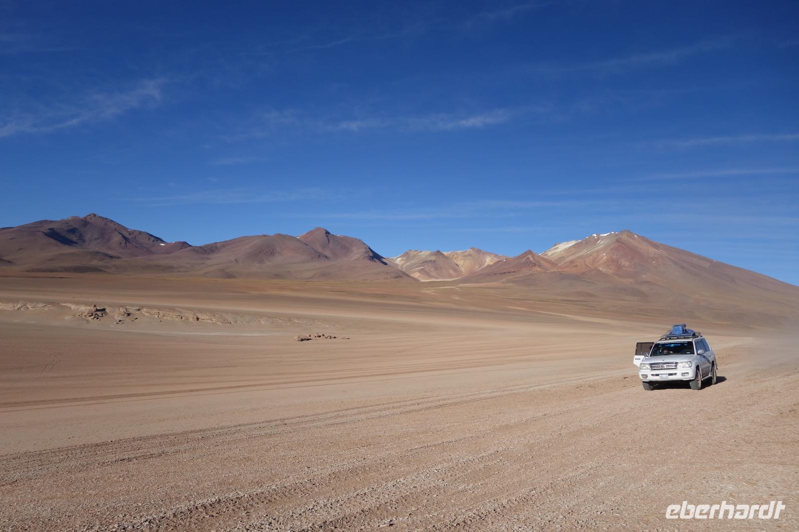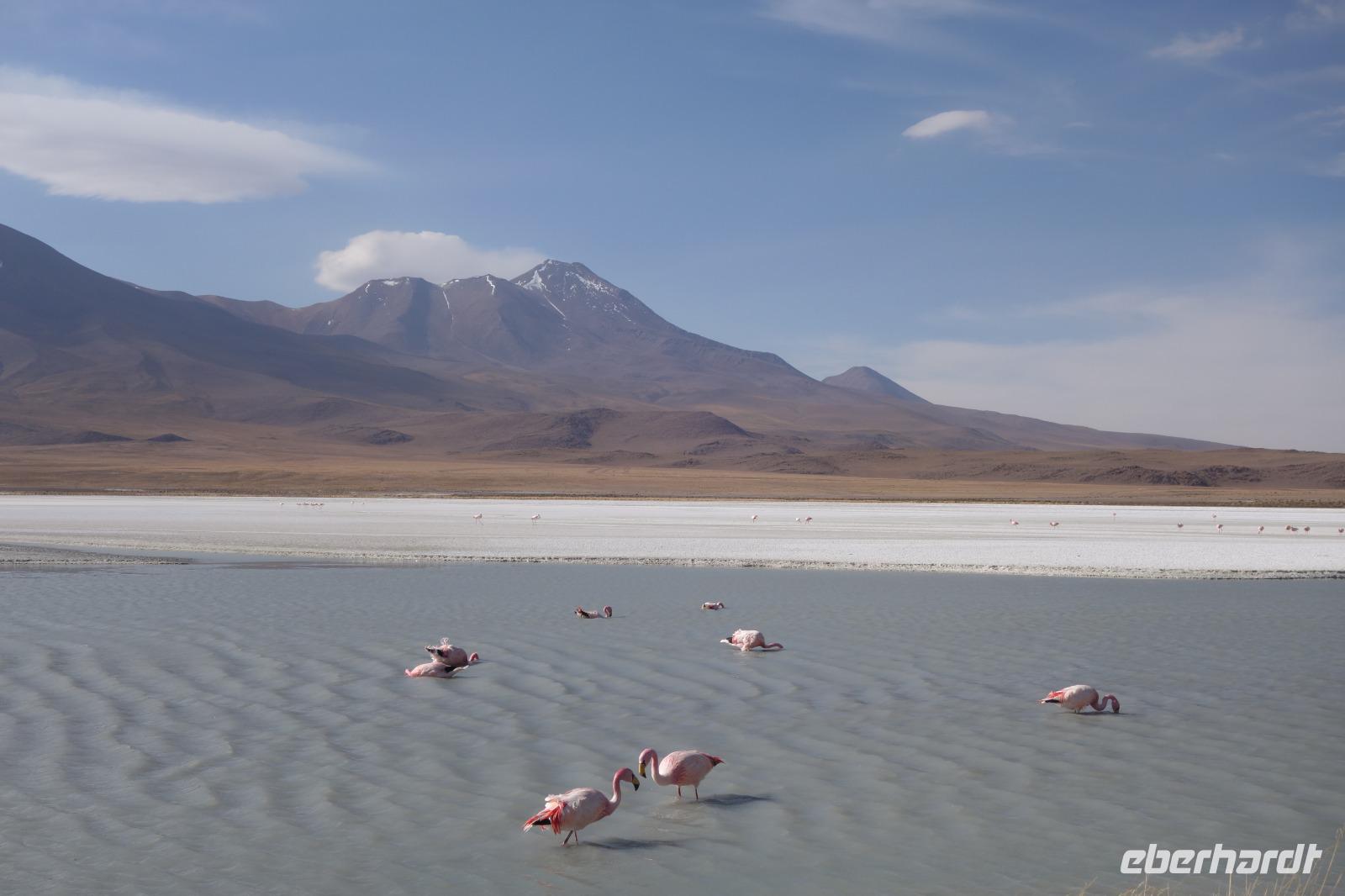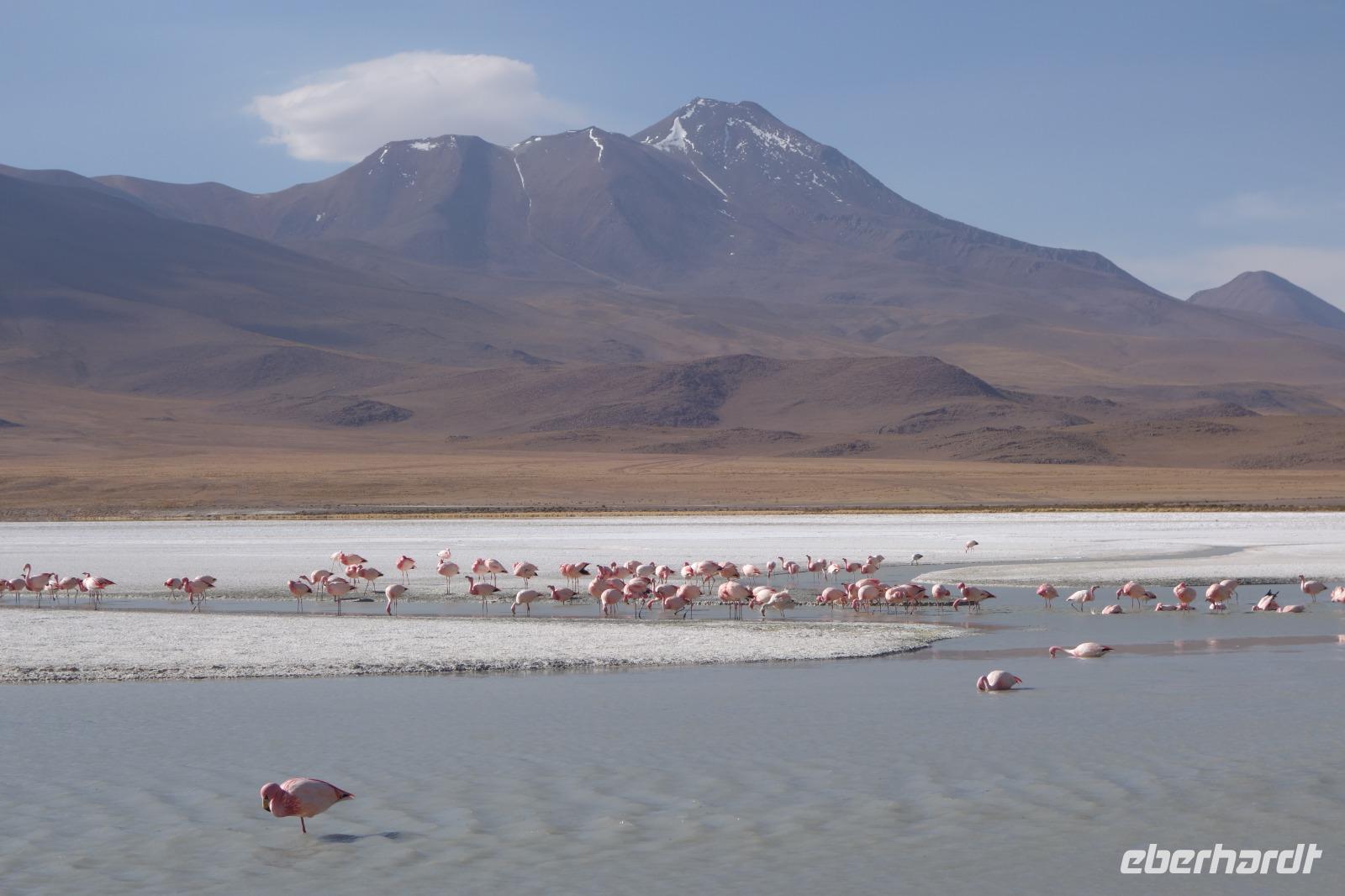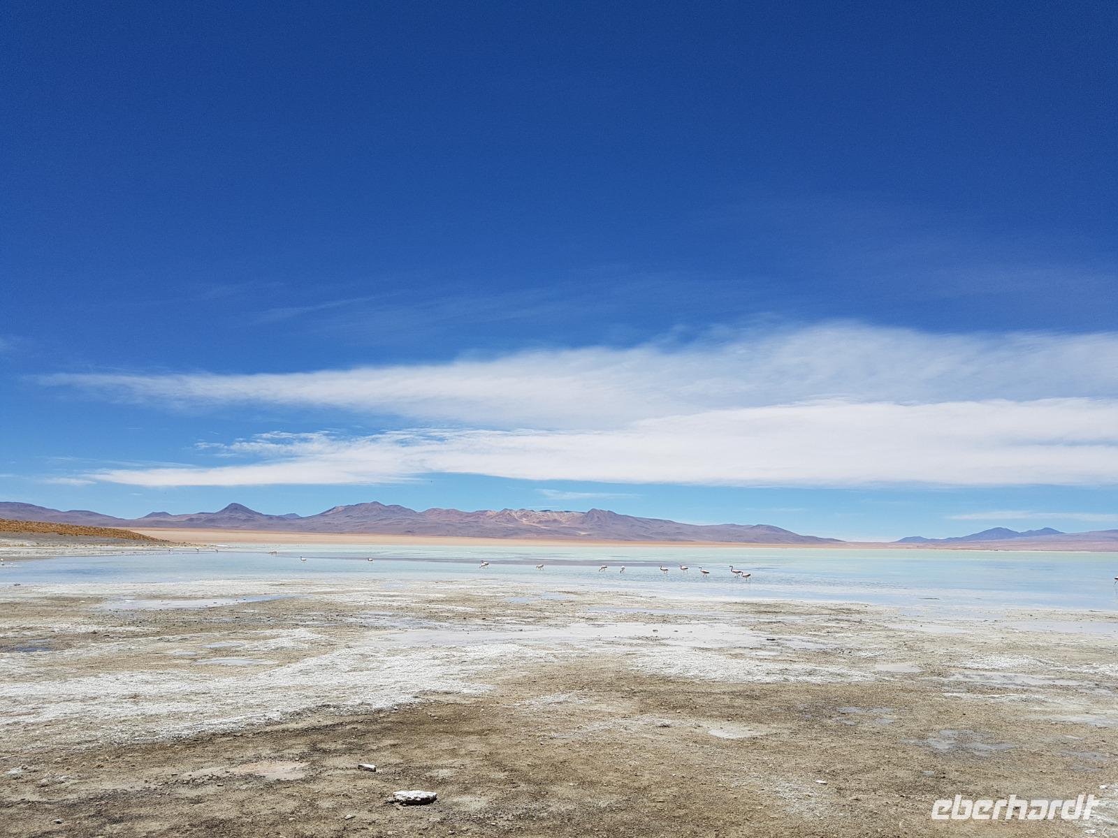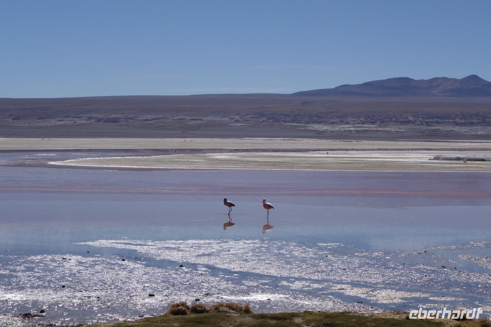 Wir haben sehr gut geschlafen. Heute haben wir wieder viel schönes vor und viele Kilometern liegen vor uns. Um 6 Uhr gibt es Frühstück und nur eine halbe Stunde später ist Abfahrt. Jeder Tag bis jetzt war wunderschön aber heute wird wieder ein ganz besonderes Highlight auf uns warten. Ob man es alles verarbeiten kann. Bestimmt wenn man in Deutschland zurück ist. Wir fahren erstmal zum "Steinbaum". Wir treffen auf eine Steinformation in Form eines Baumes mitten in der Wüste. Durch den Wind und die Kälte werden solche bizarren Formen geschaffen. Wir sind über 4000 Meter hoch und fahren durch die Wüste. Tolle Farben überall. Oben bei den Vulkanen sieht man verschiedene Farben, als wären sie von einem Künstler gemalt. Heute erwartet es uns ein wahres Farbenspiel im Reserva Nacional Eduardo Avaroa. Erstmal besuchen wir die Laguna Colorada (oder farbige Lagune), die ihrem Namen alle Ehre macht. Hier spazieren wir gemütlich ca. 40 Minuten und sehen die langbeinigen Andenflamingos. Ein Traum. Wir entdecken warmes Wasser am Rand und bald werden wir erfahren warum. Nicht weit von hier befindet sich der Geysir "Sol de Manana" (oder Morgensonne). Hier beobachten wir die geotektonischen Aktivitäten an den Schlamm-Vulkanen in Sol de Manana. Überall sind riesige und mehrfarbige blubbernde Erdlöcher und dampfende Fontänen. Die Erde kocht gerade unter unseren Füßen. Hier oben machen wir keine großen Bewegungen, da wir uns auf fast 5000 Meter Höhe befinden, aber alles ist gut und wir merken langsam nicht mehr die Höhe.