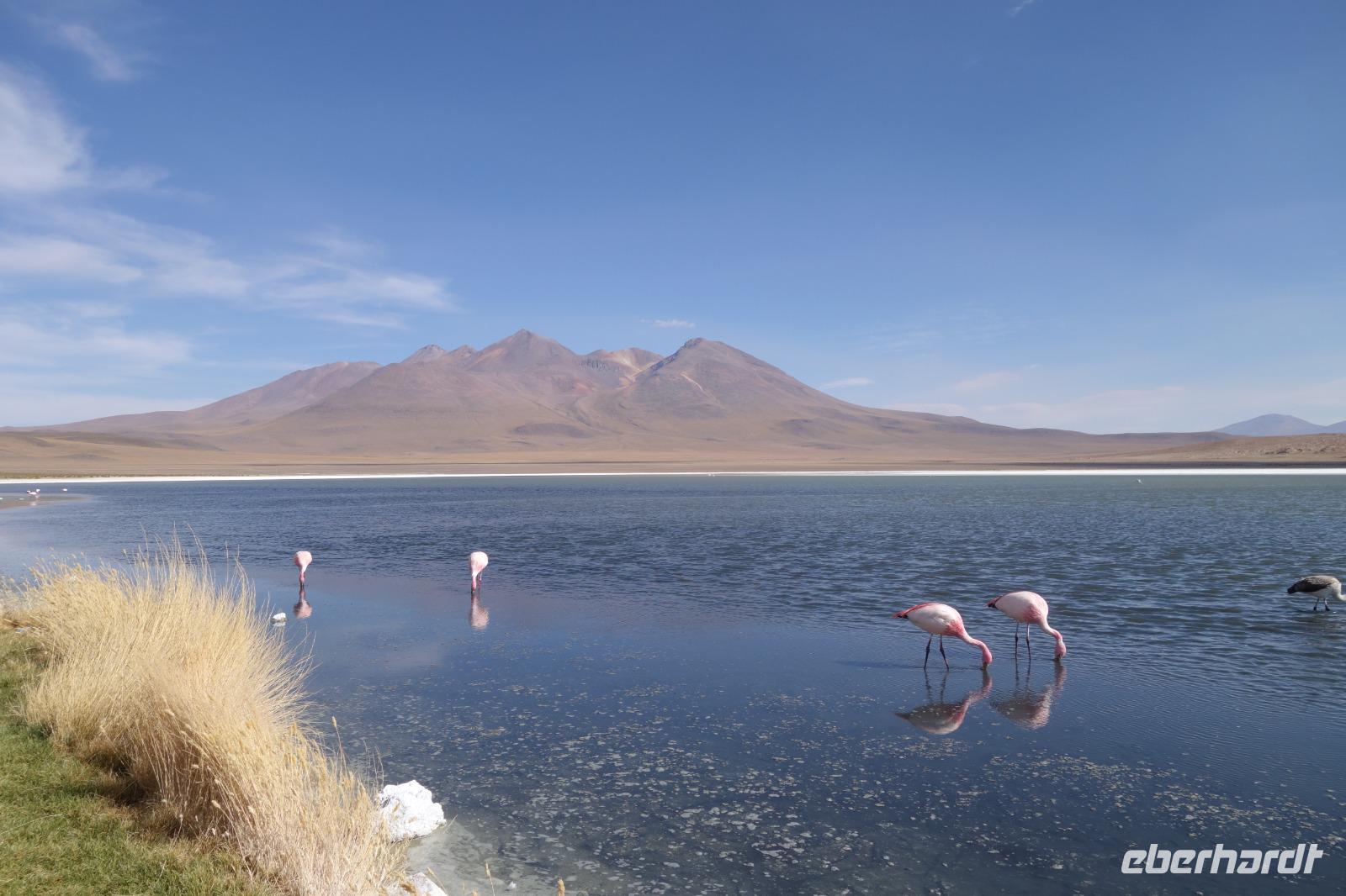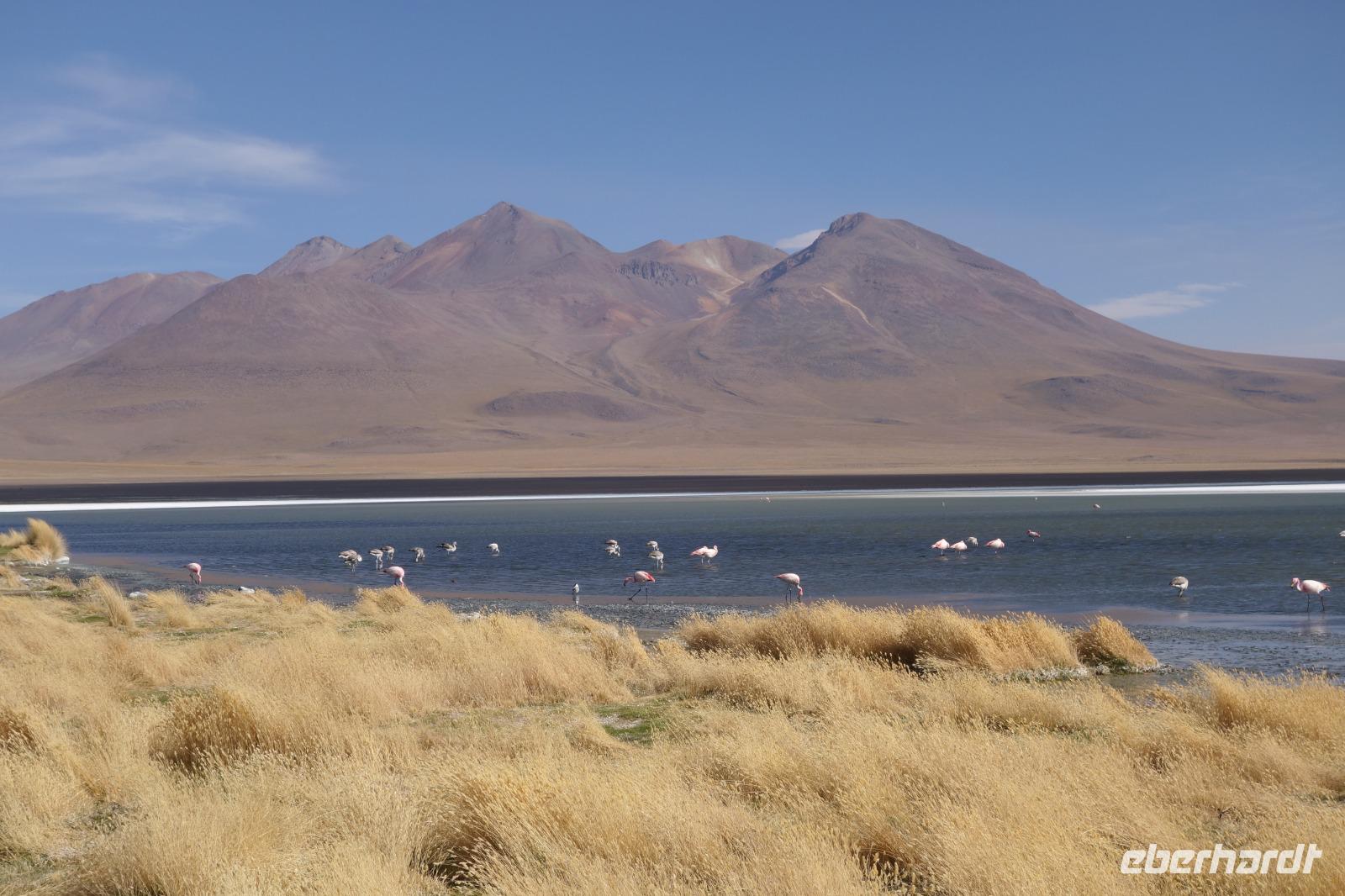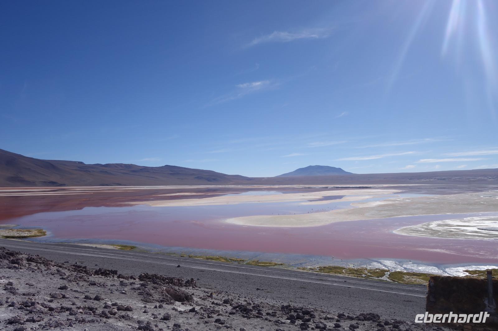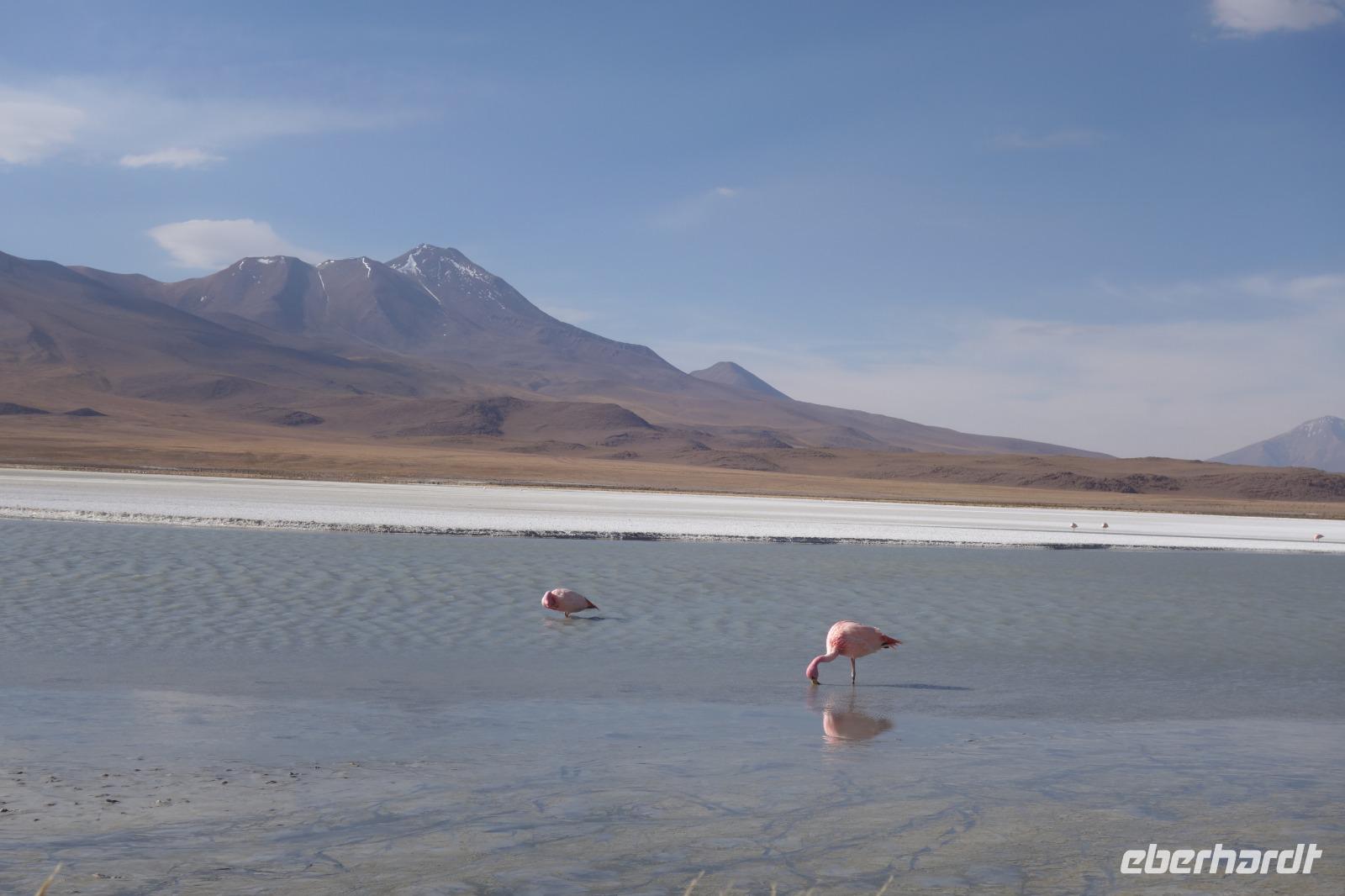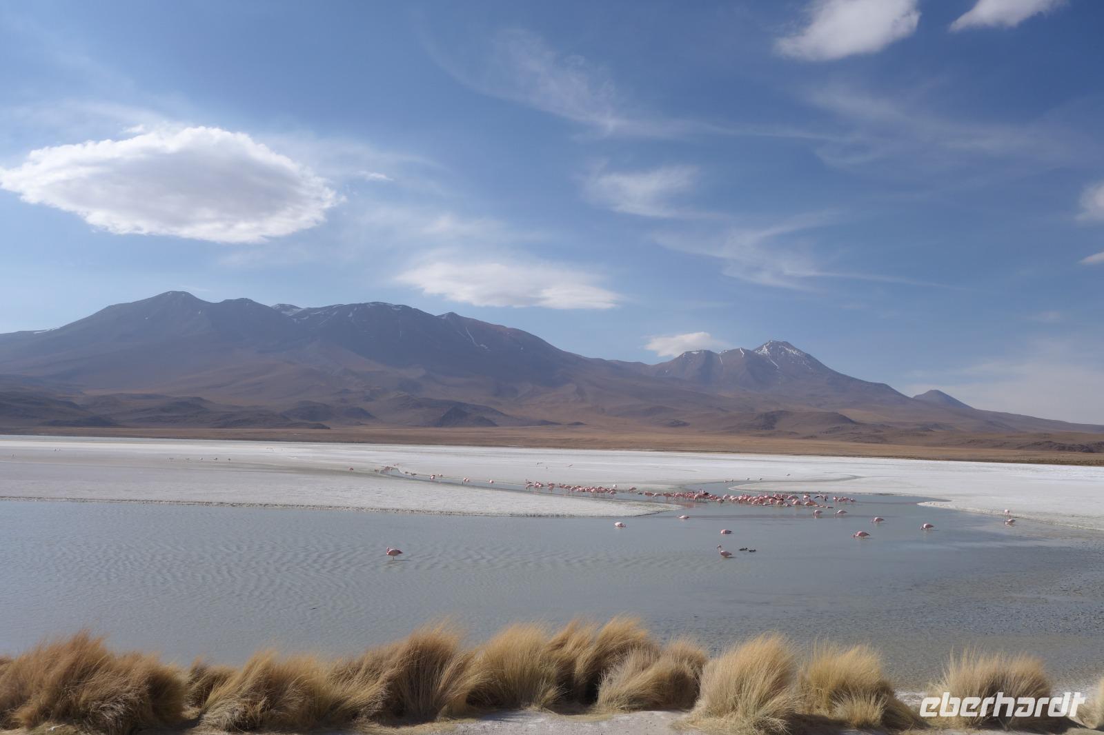 Wir haben sehr gut geschlafen. Heute haben wir wieder viel schönes vor und viele Kilometern liegen vor uns. Um 6 Uhr gibt es Frühstück und nur eine halbe Stunde später ist Abfahrt. Jeder Tag bis jetzt war wunderschön aber heute wird wieder ein ganz besonderes Highlight auf uns warten. Ob man es alles verarbeiten kann. Bestimmt wenn man in Deutschland zurück ist. Wir fahren erstmal zum "Steinbaum". Wir treffen auf eine Steinformation in Form eines Baumes mitten in der Wüste. Durch den Wind und die Kälte werden solche bizarren Formen geschaffen. Wir sind über 4000 Meter hoch und fahren durch die Wüste. Tolle Farben überall. Oben bei den Vulkanen sieht man verschiedene Farben, als wären sie von einem Künstler gemalt. Heute erwartet es uns ein wahres Farbenspiel im Reserva Nacional Eduardo Avaroa. Erstmal besuchen wir die Laguna Colorada (oder farbige Lagune), die ihrem Namen alle Ehre macht. Hier spazieren wir gemütlich ca. 40 Minuten und sehen die langbeinigen Andenflamingos. Ein Traum. Wir entdecken warmes Wasser am Rand und bald werden wir erfahren warum. Nicht weit von hier befindet sich der Geysir "Sol de Manana" (oder Morgensonne). Hier beobachten wir die geotektonischen Aktivitäten an den Schlamm-Vulkanen in Sol de Manana. Überall sind riesige und mehrfarbige blubbernde Erdlöcher und dampfende Fontänen. Die Erde kocht gerade unter unseren Füßen. Hier oben machen wir keine großen Bewegungen, da wir uns auf fast 5000 Meter Höhe befinden, aber alles ist gut und wir merken langsam nicht mehr die Höhe.