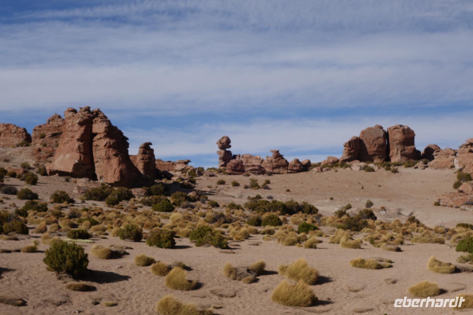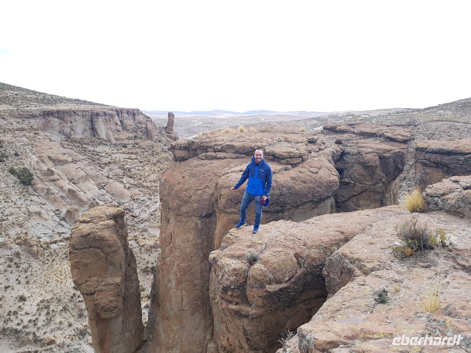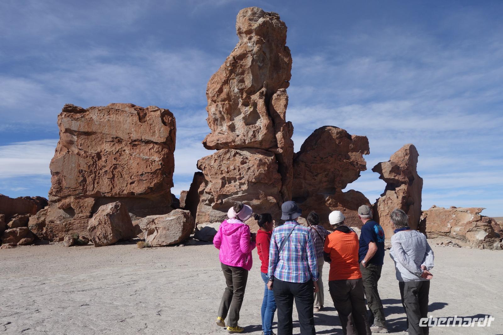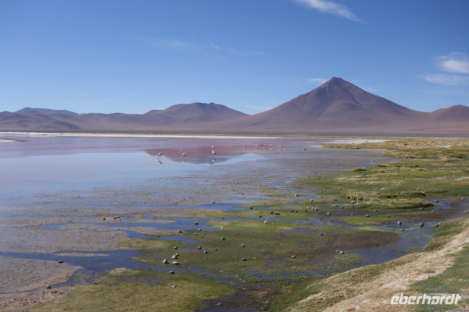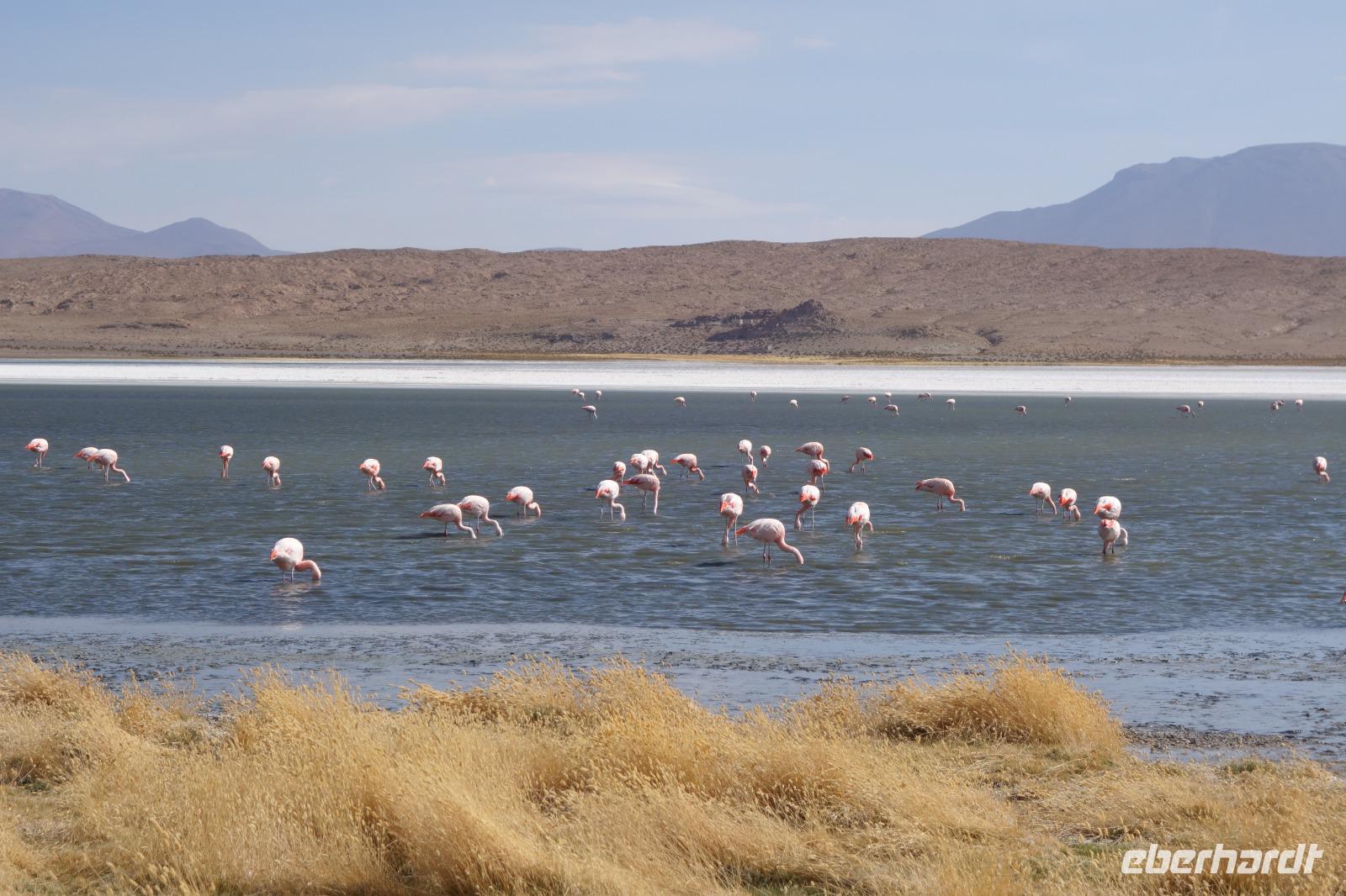 Wir haben sehr gut geschlafen. Heute haben wir wieder viel schönes vor und viele Kilometern liegen vor uns. Um 6 Uhr gibt es Frühstück und nur eine halbe Stunde später ist Abfahrt. Jeder Tag bis jetzt war wunderschön aber heute wird wieder ein ganz besonderes Highlight auf uns warten. Ob man es alles verarbeiten kann. Bestimmt wenn man in Deutschland zurück ist. Wir fahren erstmal zum "Steinbaum". Wir treffen auf eine Steinformation in Form eines Baumes mitten in der Wüste. Durch den Wind und die Kälte werden solche bizarren Formen geschaffen. Wir sind über 4000 Meter hoch und fahren durch die Wüste. Tolle Farben überall. Oben bei den Vulkanen sieht man verschiedene Farben, als wären sie von einem Künstler gemalt. Heute erwartet es uns ein wahres Farbenspiel im Reserva Nacional Eduardo Avaroa. Erstmal besuchen wir die Laguna Colorada (oder farbige Lagune), die ihrem Namen alle Ehre macht. Hier spazieren wir gemütlich ca. 40 Minuten und sehen die langbeinigen Andenflamingos. Ein Traum. Wir entdecken warmes Wasser am Rand und bald werden wir erfahren warum. Nicht weit von hier befindet sich der Geysir "Sol de Manana" (oder Morgensonne). Hier beobachten wir die geotektonischen Aktivitäten an den Schlamm-Vulkanen in Sol de Manana. Überall sind riesige und mehrfarbige blubbernde Erdlöcher und dampfende Fontänen. Die Erde kocht gerade unter unseren Füßen. Hier oben machen wir keine großen Bewegungen, da wir uns auf fast 5000 Meter Höhe befinden, aber alles ist gut und wir merken langsam nicht mehr die Höhe.