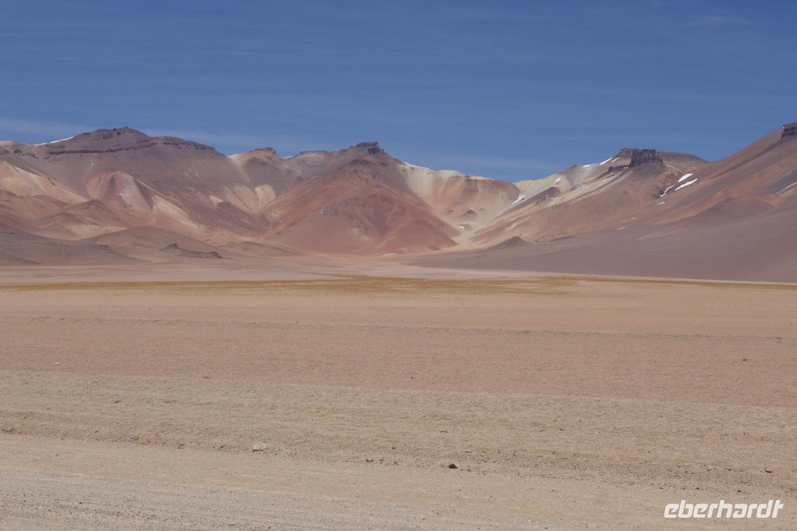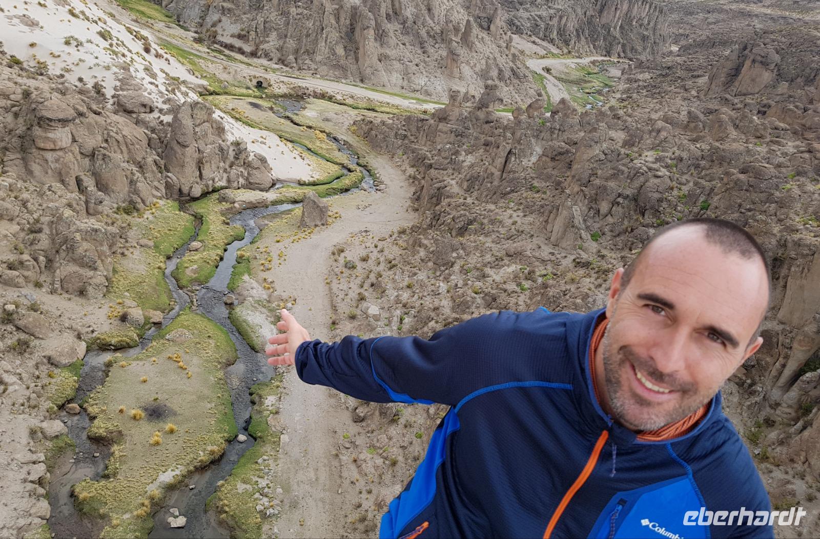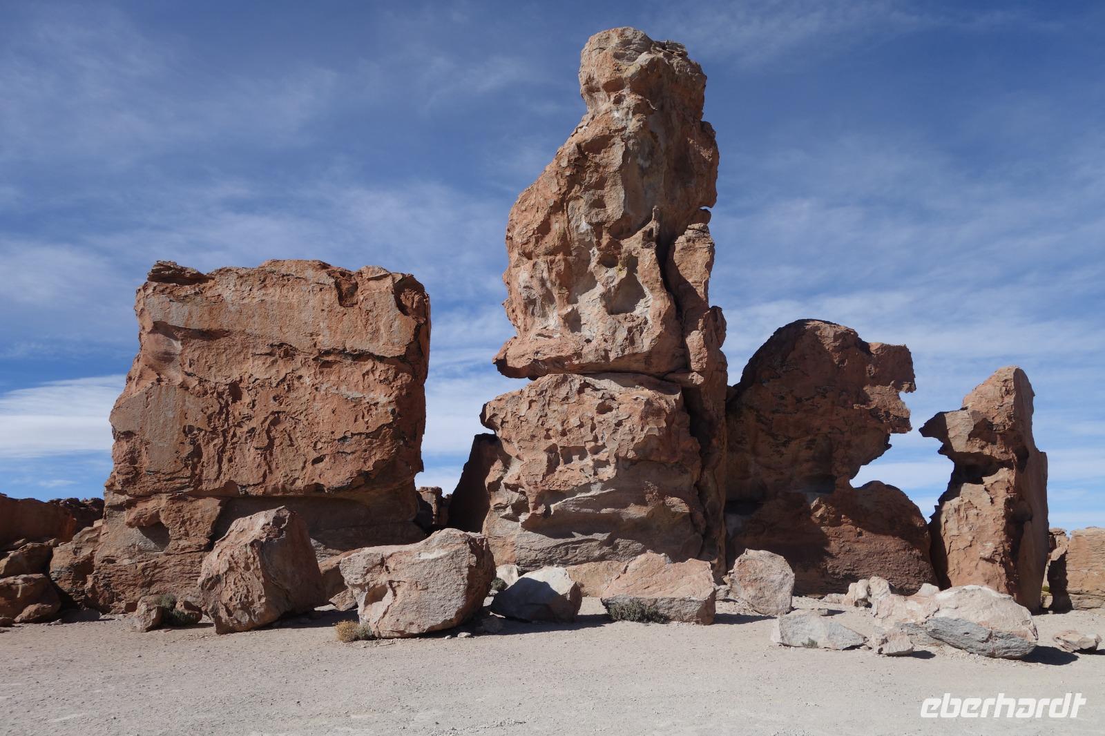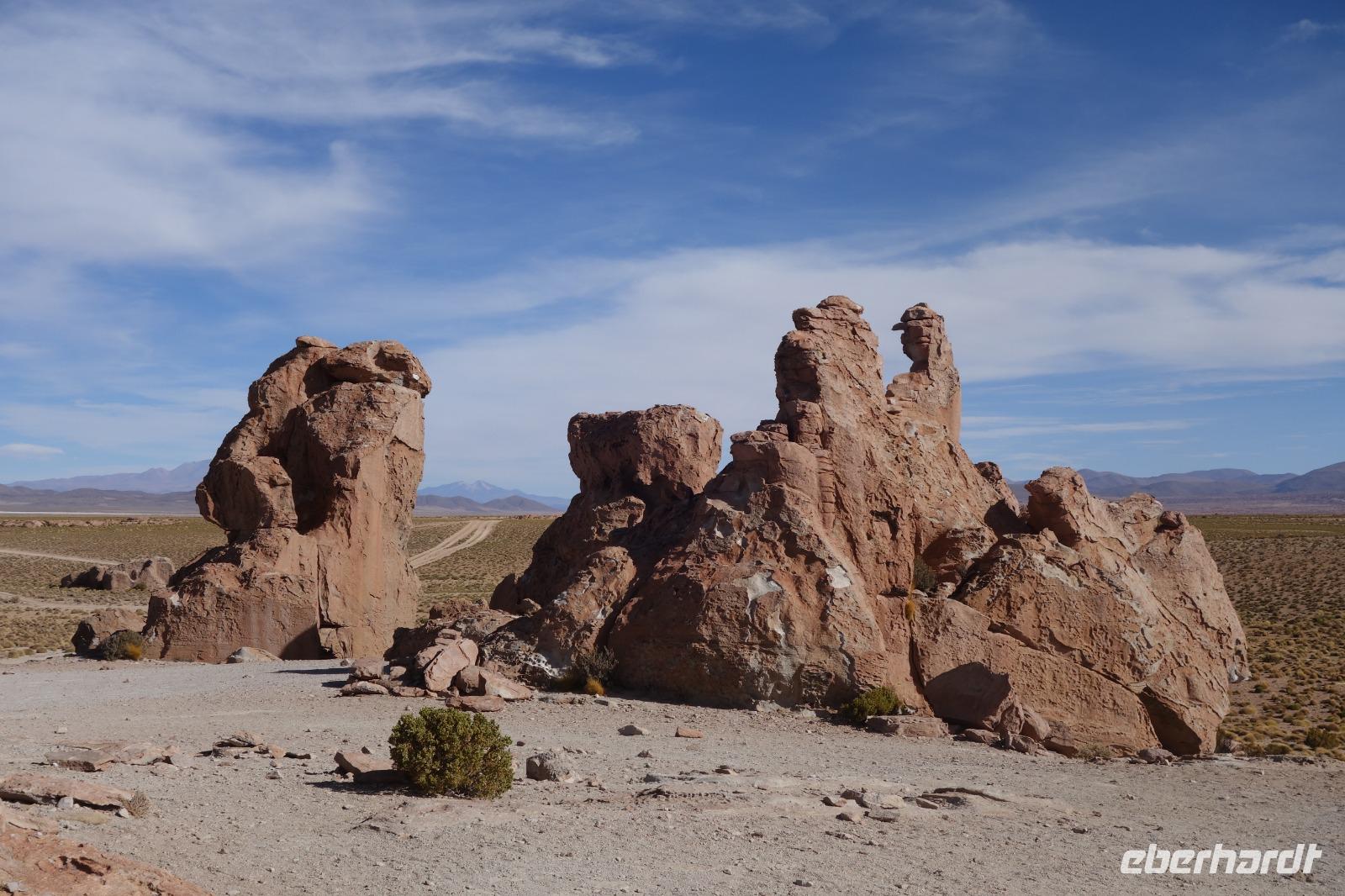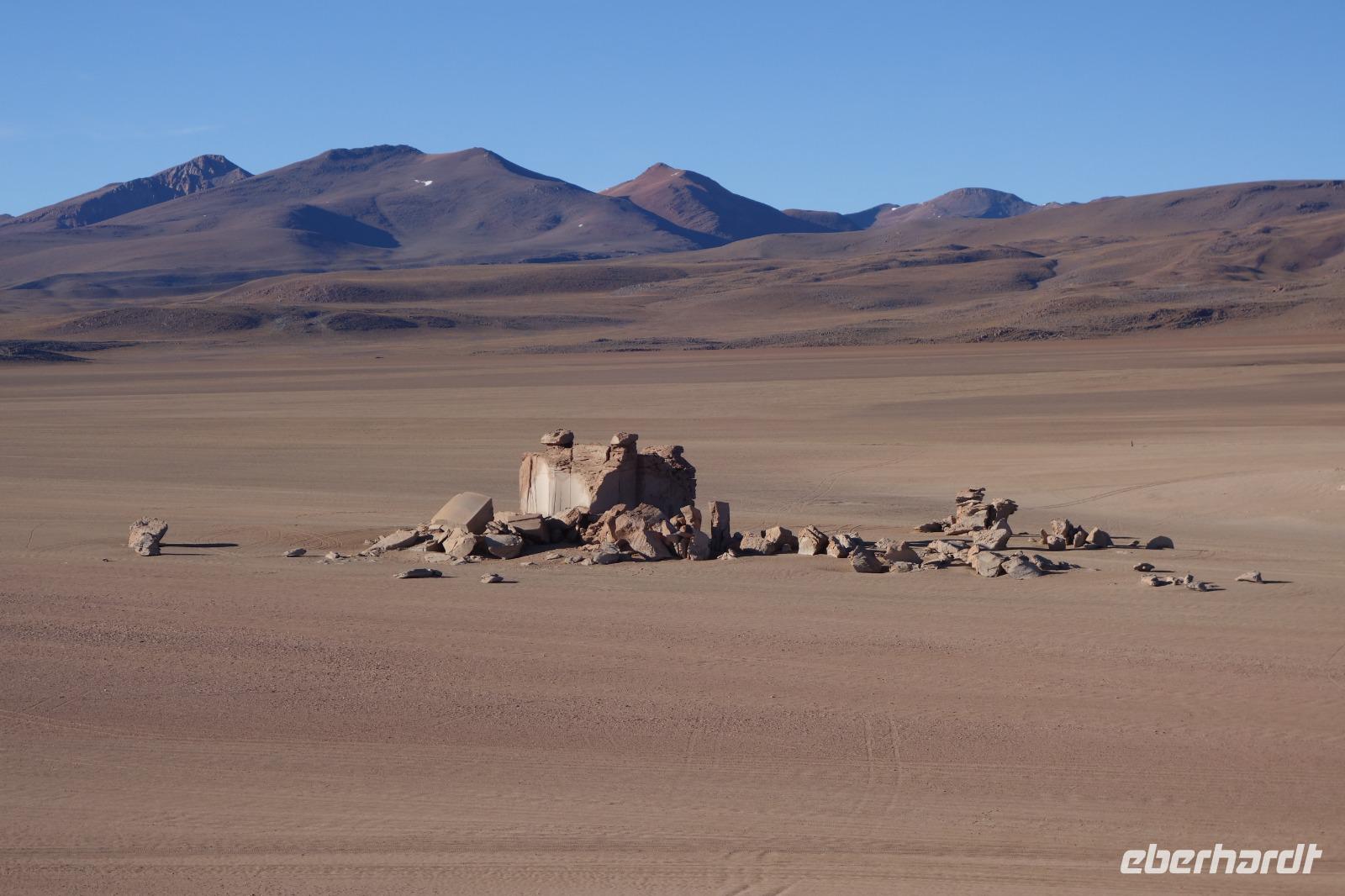 Wir haben sehr gut geschlafen. Heute haben wir wieder viel schönes vor und viele Kilometern liegen vor uns. Um 6 Uhr gibt es Frühstück und nur eine halbe Stunde später ist Abfahrt. Jeder Tag bis jetzt war wunderschön aber heute wird wieder ein ganz besonderes Highlight auf uns warten. Ob man es alles verarbeiten kann. Bestimmt wenn man in Deutschland zurück ist. Wir fahren erstmal zum "Steinbaum". Wir treffen auf eine Steinformation in Form eines Baumes mitten in der Wüste. Durch den Wind und die Kälte werden solche bizarren Formen geschaffen. Wir sind über 4000 Meter hoch und fahren durch die Wüste. Tolle Farben überall. Oben bei den Vulkanen sieht man verschiedene Farben, als wären sie von einem Künstler gemalt. Heute erwartet es uns ein wahres Farbenspiel im Reserva Nacional Eduardo Avaroa. Erstmal besuchen wir die Laguna Colorada (oder farbige Lagune), die ihrem Namen alle Ehre macht. Hier spazieren wir gemütlich ca. 40 Minuten und sehen die langbeinigen Andenflamingos. Ein Traum. Wir entdecken warmes Wasser am Rand und bald werden wir erfahren warum. Nicht weit von hier befindet sich der Geysir "Sol de Manana" (oder Morgensonne). Hier beobachten wir die geotektonischen Aktivitäten an den Schlamm-Vulkanen in Sol de Manana. Überall sind riesige und mehrfarbige blubbernde Erdlöcher und dampfende Fontänen. Die Erde kocht gerade unter unseren Füßen. Hier oben machen wir keine großen Bewegungen, da wir uns auf fast 5000 Meter Höhe befinden, aber alles ist gut und wir merken langsam nicht mehr die Höhe.