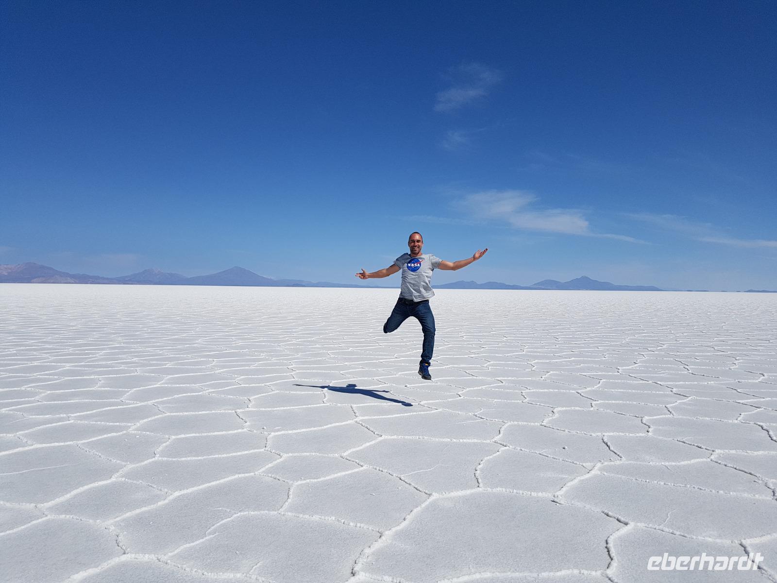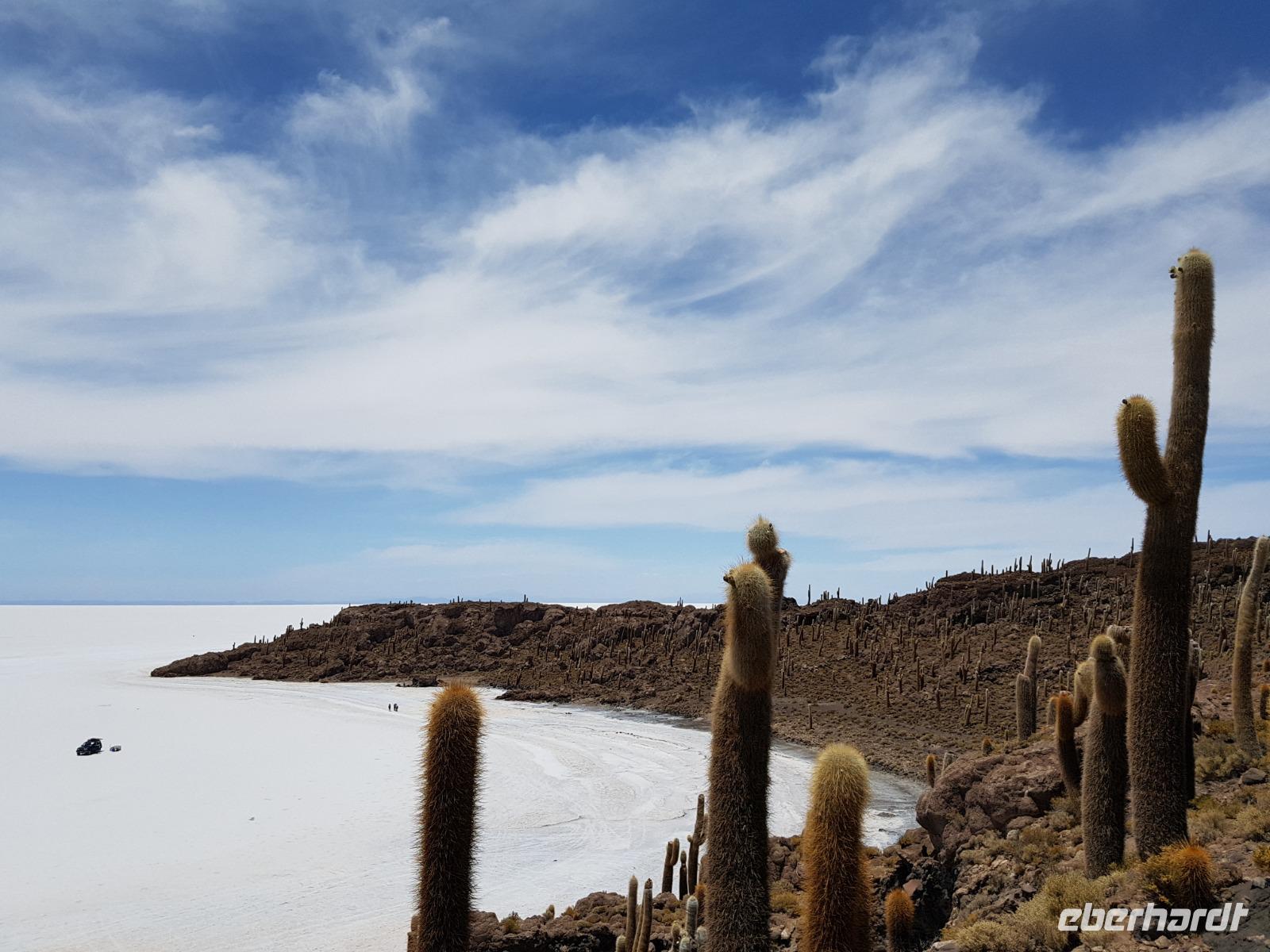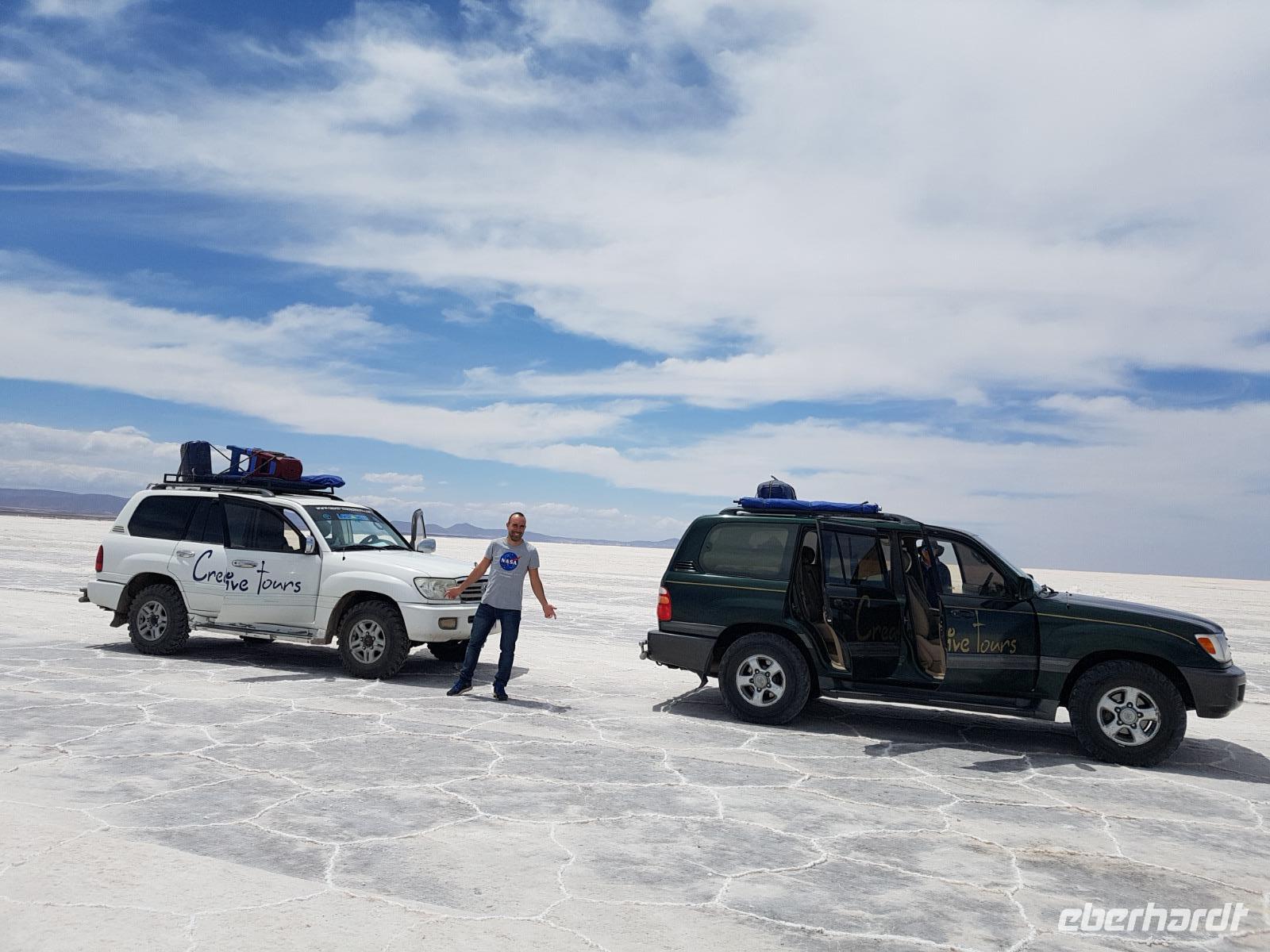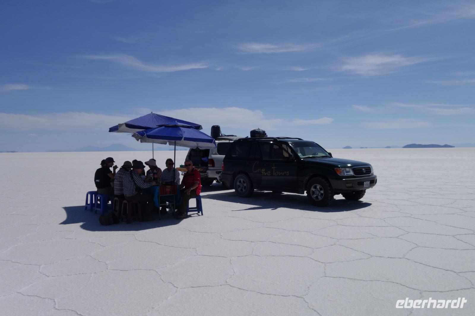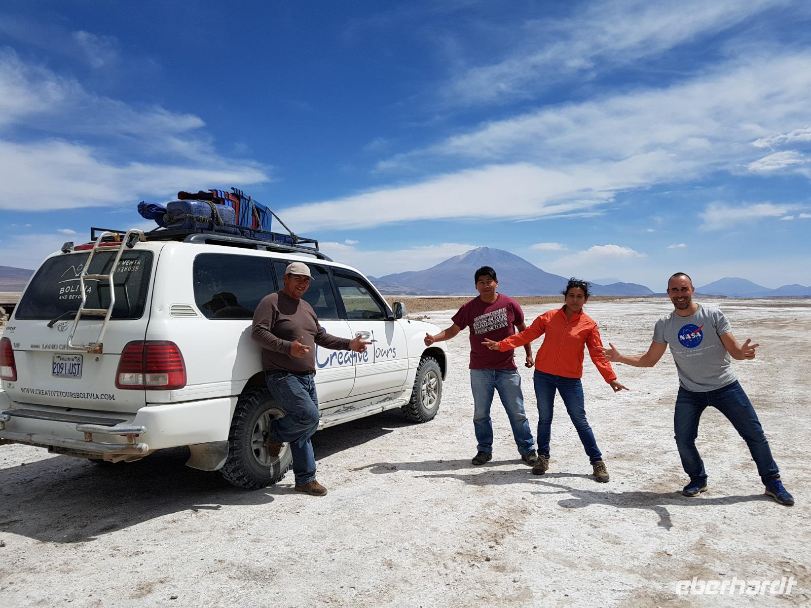 Alles kommt im Leben und heute ist der Tag gekommen. Wir freuen uns auf die kommende 3-tägige Jeepsafari durch das Andenhochland zum Uyuni-Salzsee, zur Laguna Colorada, zu den Lagunen Canapa, Honda und Hedionda sowie zu den Geysiren Sol de Manana. Als Höhepunkt unserer Rundreise schließt sich ab heute das bolivianische Andenhochland mit dem größten Salzsee der Welt, Uyuni, farbenfrohen Lagunen und unzähligen Andenflamingos an. Wir genießen eine aufregende Jeepfahrt auf dem Salzsee von Uyuni, der größten Salzfläche der Erde. In den nächsten 3 Tage bewegen wir uns in 2 Jeeps fort und überqueren den strahlend weißen Salzsee von Uyuni. Sonnenbrillen, Sonnenschutz, Zwiebel-Jacken-Prinzip und Mütze nicht vergessen. Um 9 Uhr holen uns Cesar und Gustavo, unsere 2 Jeep-Fahrer der nächsten 3 Tage, ab. Wir erleben heute einen unvergesslichen Tag auf dem größten Salzsee der Welt, der einem riesigen Gletscher gleicht. Den ersten Stopp machen wir bei Colchani, wo wir bei einem Familienbetrieb sehen, wie das Salz des Salzsees verarbeitet und direkt verkauft wird. Es war sehr interessant den ganzen Prozess zu sehen und jeder hat ein bisschen Salz mit nach Deutschland gebracht. Wir fahren weiter zu "Los Ojos del Salar" oder zu den "Augen des Salzsees", wo klares und frisches Wasser von unten direkt nach oben fließt. Einige von uns testeten die Temperatur mit der Hand und als das Wasser verschwand, blieb eine Hand voller Salz zurück. Es ist ein unvergessliches Erlebnis auf diesem Salzsee zu fahren und rechts, links, vorne und hinten nur strahlendes Weiß und weißes Salz bis in die Ferne sehen zu können. Man fühlt sich wie auf einem anderen Planeten oder auf dem Mond. Der nächste Stopp ist auf der Insel Incahuasi, inmitten des ausgetrockneten Sees gelegen. Dort bestimmen exotisch wirkende Kakteen das Bild und bieten sich einfach perfekt als Fotomotive an. Hier machen wir eine 40-minütige Wanderung bis zum höchsten Punkt der Insel. Von hier aus realisiert man erst, wo wir uns befinden. Vor 10.000 Jahren gab es hier einen See aus Salz, Korallen, Fische und alles was es im Meer gibt. Und heute nur Salz. Die Sonne und das Salz sehen aus, wie schneebedeckte Berge auf denen man im Winter Ski fährt. Es blendet die Sonne und Salz wie verrückt. Wir hatten Glück und die Kakteen waren gerade voll in Blüte. Herrlich. Der Tag ist voll mit Highlights und der nächste Tag steht schon bevor. Wir fahren mitten über den Salzsee und Cesar und Gustavo bereiteten für uns ein Luxus-Mittagessen. Es ist einfach ein Traum. Purer Luxus und es hat wunderbar geschmeckt. Es gab sogar zum Anstoßen Rotwein aus Bolivien. Wir haben auch hier lustige und verrückte Bilder gemacht, da die Entfernung auf dem See eine optische Täuschung verursacht.