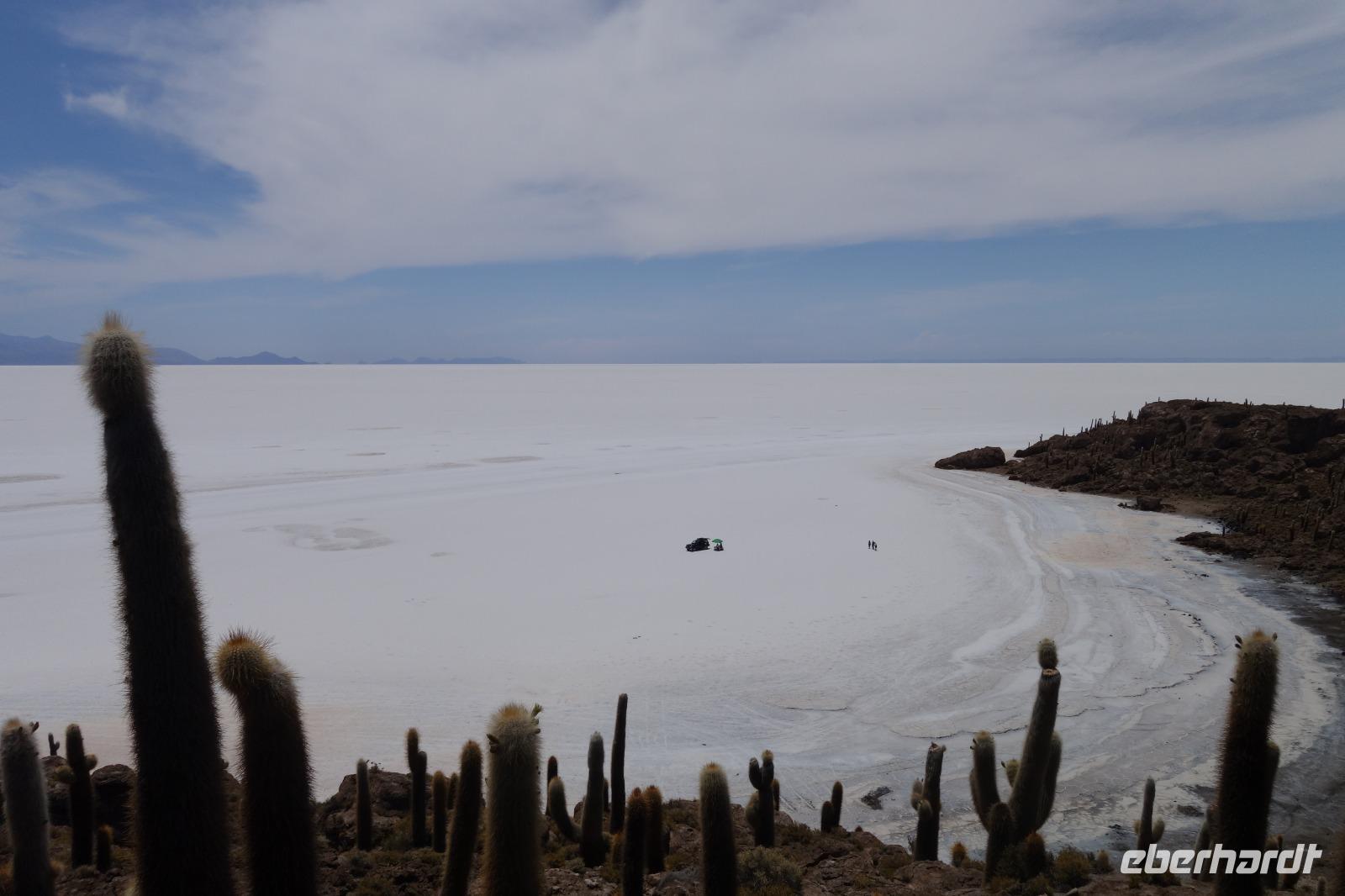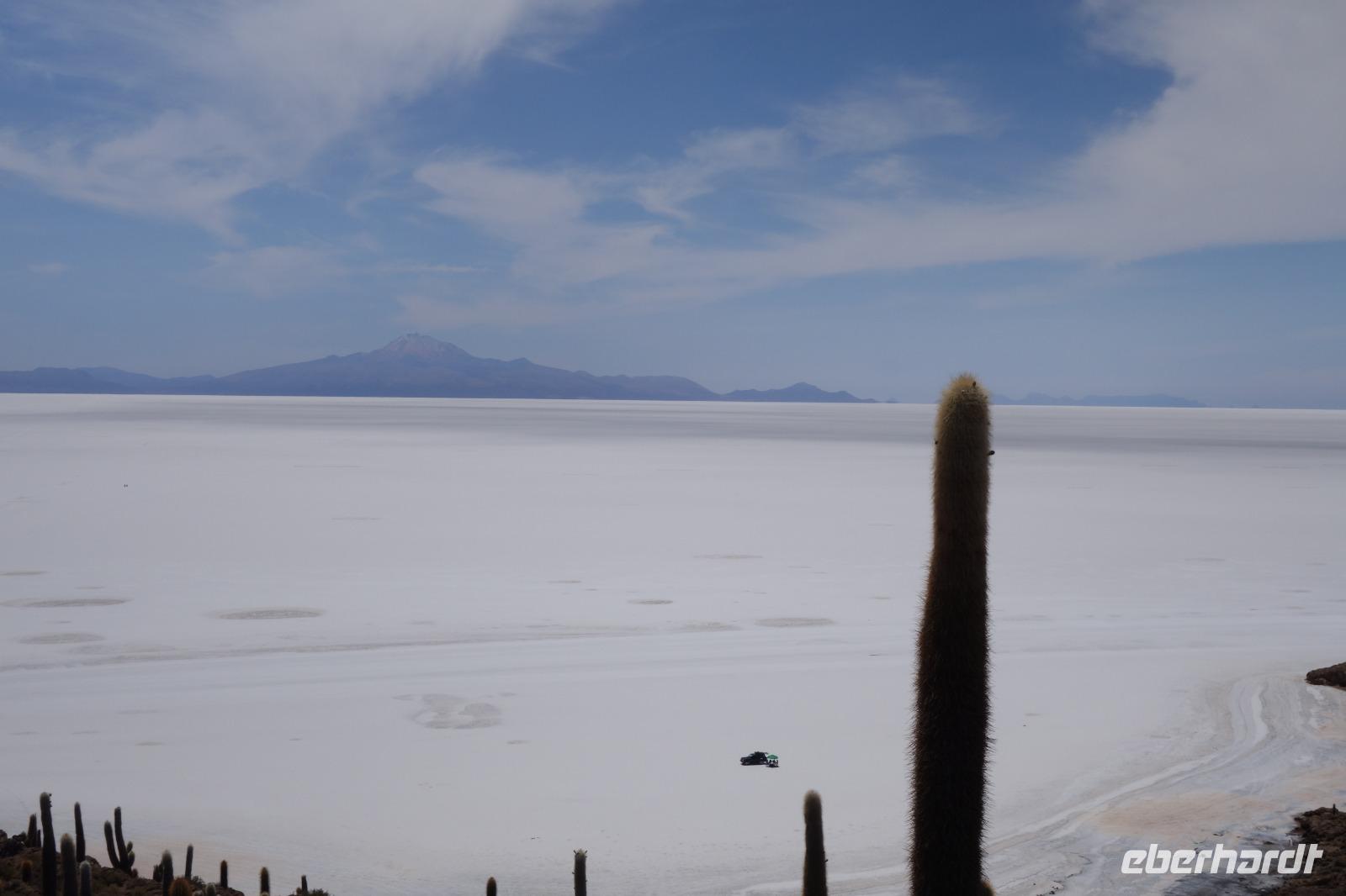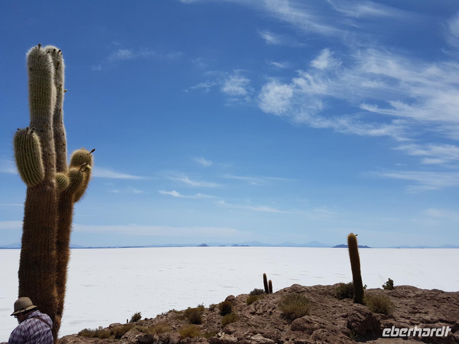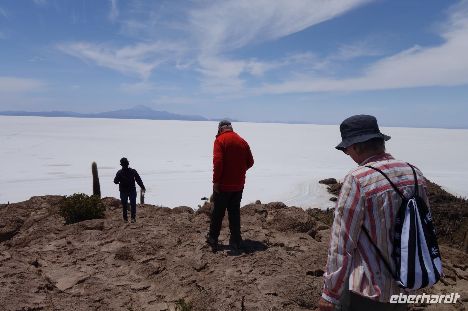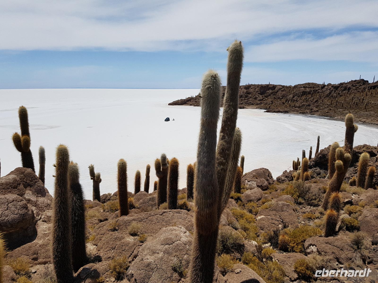 Alles kommt im Leben und heute ist der Tag gekommen. Wir freuen uns auf die kommende 3-tägige Jeepsafari durch das Andenhochland zum Uyuni-Salzsee, zur Laguna Colorada, zu den Lagunen Canapa, Honda und Hedionda sowie zu den Geysiren Sol de Manana. Als Höhepunkt unserer Rundreise schließt sich ab heute das bolivianische Andenhochland mit dem größten Salzsee der Welt, Uyuni, farbenfrohen Lagunen und unzähligen Andenflamingos an. Wir genießen eine aufregende Jeepfahrt auf dem Salzsee von Uyuni, der größten Salzfläche der Erde. In den nächsten 3 Tage bewegen wir uns in 2 Jeeps fort und überqueren den strahlend weißen Salzsee von Uyuni. Sonnenbrillen, Sonnenschutz, Zwiebel-Jacken-Prinzip und Mütze nicht vergessen. Um 9 Uhr holen uns Cesar und Gustavo, unsere 2 Jeep-Fahrer der nächsten 3 Tage, ab. Wir erleben heute einen unvergesslichen Tag auf dem größten Salzsee der Welt, der einem riesigen Gletscher gleicht. Den ersten Stopp machen wir bei Colchani, wo wir bei einem Familienbetrieb sehen, wie das Salz des Salzsees verarbeitet und direkt verkauft wird. Es war sehr interessant den ganzen Prozess zu sehen und jeder hat ein bisschen Salz mit nach Deutschland gebracht. Wir fahren weiter zu "Los Ojos del Salar" oder zu den "Augen des Salzsees", wo klares und frisches Wasser von unten direkt nach oben fließt. Einige von uns testeten die Temperatur mit der Hand und als das Wasser verschwand, blieb eine Hand voller Salz zurück. Es ist ein unvergessliches Erlebnis auf diesem Salzsee zu fahren und rechts, links, vorne und hinten nur strahlendes Weiß und weißes Salz bis in die Ferne sehen zu können. Man fühlt sich wie auf einem anderen Planeten oder auf dem Mond. Der nächste Stopp ist auf der Insel Incahuasi, inmitten des ausgetrockneten Sees gelegen. Dort bestimmen exotisch wirkende Kakteen das Bild und bieten sich einfach perfekt als Fotomotive an. Hier machen wir eine 40-minütige Wanderung bis zum höchsten Punkt der Insel. Von hier aus realisiert man erst, wo wir uns befinden. Vor 10.000 Jahren gab es hier einen See aus Salz, Korallen, Fische und alles was es im Meer gibt. Und heute nur Salz. Die Sonne und das Salz sehen aus, wie schneebedeckte Berge auf denen man im Winter Ski fährt. Es blendet die Sonne und Salz wie verrückt. Wir hatten Glück und die Kakteen waren gerade voll in Blüte. Herrlich. Der Tag ist voll mit Highlights und der nächste Tag steht schon bevor. Wir fahren mitten über den Salzsee und Cesar und Gustavo bereiteten für uns ein Luxus-Mittagessen. Es ist einfach ein Traum. Purer Luxus und es hat wunderbar geschmeckt. Es gab sogar zum Anstoßen Rotwein aus Bolivien. Wir haben auch hier lustige und verrückte Bilder gemacht, da die Entfernung auf dem See eine optische Täuschung verursacht.
