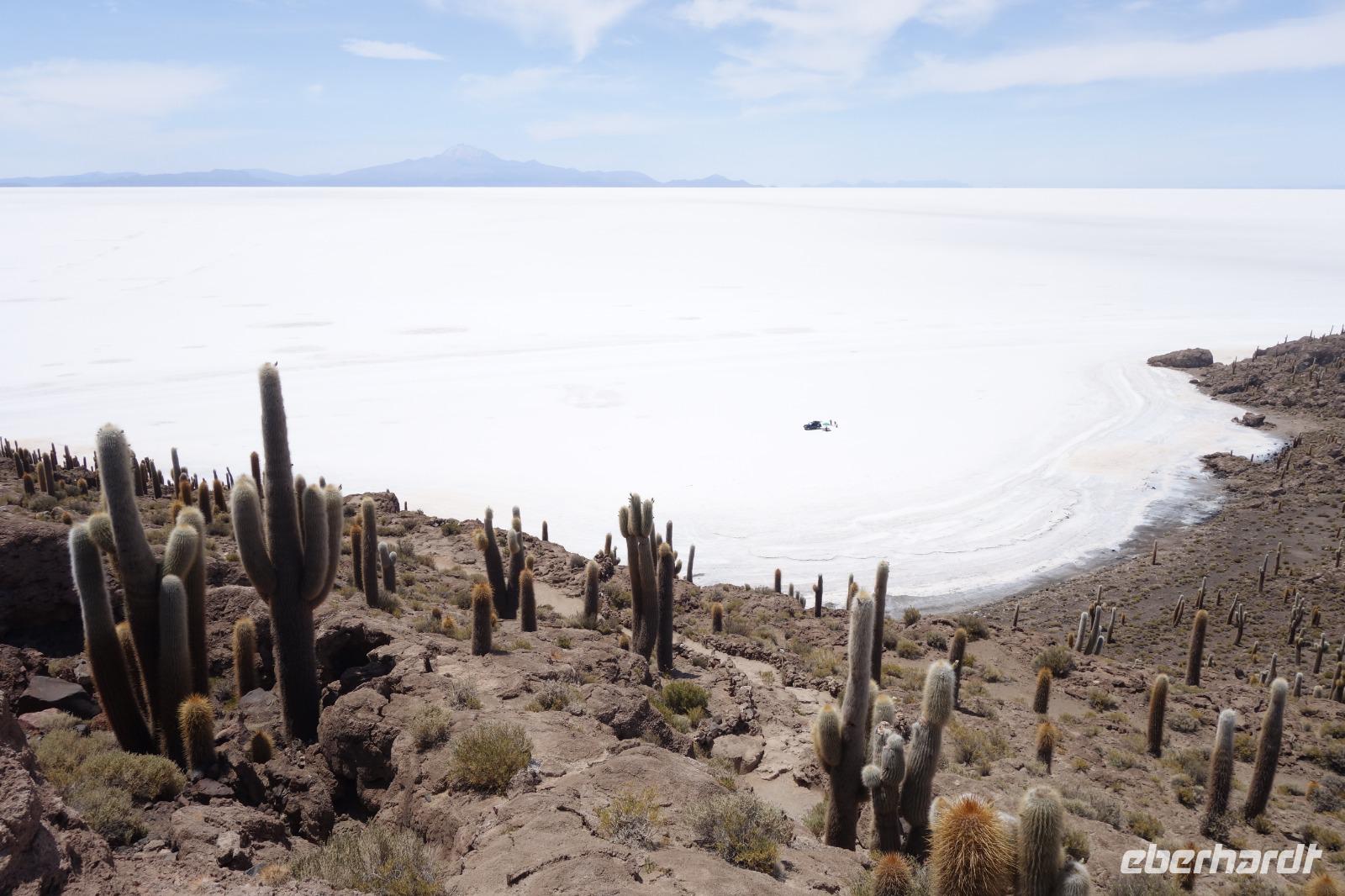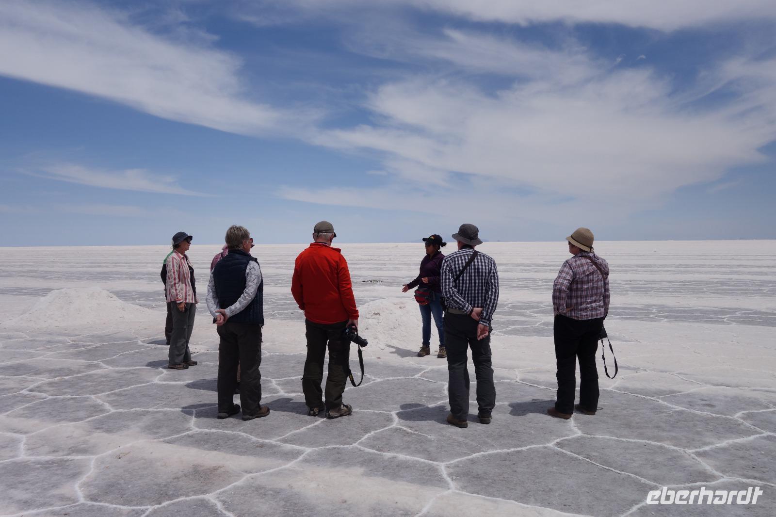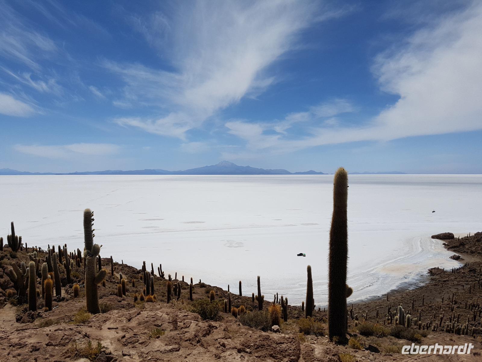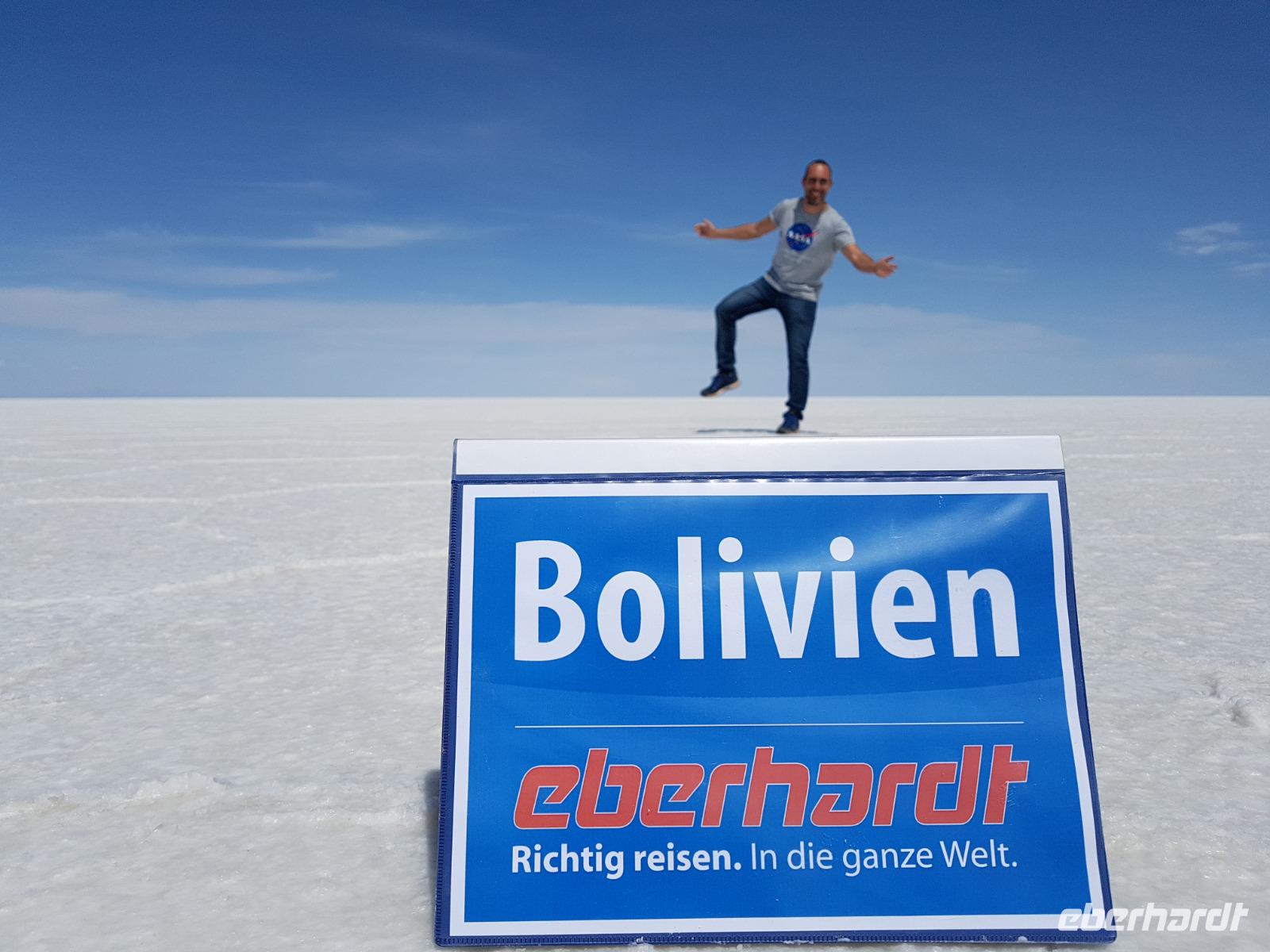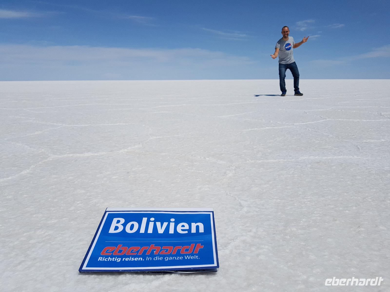 Alles kommt im Leben und heute ist der Tag gekommen. Wir freuen uns auf die kommende 3-tägige Jeepsafari durch das Andenhochland zum Uyuni-Salzsee, zur Laguna Colorada, zu den Lagunen Canapa, Honda und Hedionda sowie zu den Geysiren Sol de Manana. Als Höhepunkt unserer Rundreise schließt sich ab heute das bolivianische Andenhochland mit dem größten Salzsee der Welt, Uyuni, farbenfrohen Lagunen und unzähligen Andenflamingos an. Wir genießen eine aufregende Jeepfahrt auf dem Salzsee von Uyuni, der größten Salzfläche der Erde. In den nächsten 3 Tage bewegen wir uns in 2 Jeeps fort und überqueren den strahlend weißen Salzsee von Uyuni. Sonnenbrillen, Sonnenschutz, Zwiebel-Jacken-Prinzip und Mütze nicht vergessen. Um 9 Uhr holen uns Cesar und Gustavo, unsere 2 Jeep-Fahrer der nächsten 3 Tage, ab. Wir erleben heute einen unvergesslichen Tag auf dem größten Salzsee der Welt, der einem riesigen Gletscher gleicht. Den ersten Stopp machen wir bei Colchani, wo wir bei einem Familienbetrieb sehen, wie das Salz des Salzsees verarbeitet und direkt verkauft wird. Es war sehr interessant den ganzen Prozess zu sehen und jeder hat ein bisschen Salz mit nach Deutschland gebracht. Wir fahren weiter zu "Los Ojos del Salar" oder zu den "Augen des Salzsees", wo klares und frisches Wasser von unten direkt nach oben fließt. Einige von uns testeten die Temperatur mit der Hand und als das Wasser verschwand, blieb eine Hand voller Salz zurück. Es ist ein unvergessliches Erlebnis auf diesem Salzsee zu fahren und rechts, links, vorne und hinten nur strahlendes Weiß und weißes Salz bis in die Ferne sehen zu können. Man fühlt sich wie auf einem anderen Planeten oder auf dem Mond. Der nächste Stopp ist auf der Insel Incahuasi, inmitten des ausgetrockneten Sees gelegen. Dort bestimmen exotisch wirkende Kakteen das Bild und bieten sich einfach perfekt als Fotomotive an. Hier machen wir eine 40-minütige Wanderung bis zum höchsten Punkt der Insel. Von hier aus realisiert man erst, wo wir uns befinden. Vor 10.000 Jahren gab es hier einen See aus Salz, Korallen, Fische und alles was es im Meer gibt. Und heute nur Salz. Die Sonne und das Salz sehen aus, wie schneebedeckte Berge auf denen man im Winter Ski fährt. Es blendet die Sonne und Salz wie verrückt. Wir hatten Glück und die Kakteen waren gerade voll in Blüte. Herrlich. Der Tag ist voll mit Highlights und der nächste Tag steht schon bevor. Wir fahren mitten über den Salzsee und Cesar und Gustavo bereiteten für uns ein Luxus-Mittagessen. Es ist einfach ein Traum. Purer Luxus und es hat wunderbar geschmeckt. Es gab sogar zum Anstoßen Rotwein aus Bolivien. Wir haben auch hier lustige und verrückte Bilder gemacht, da die Entfernung auf dem See eine optische Täuschung verursacht.