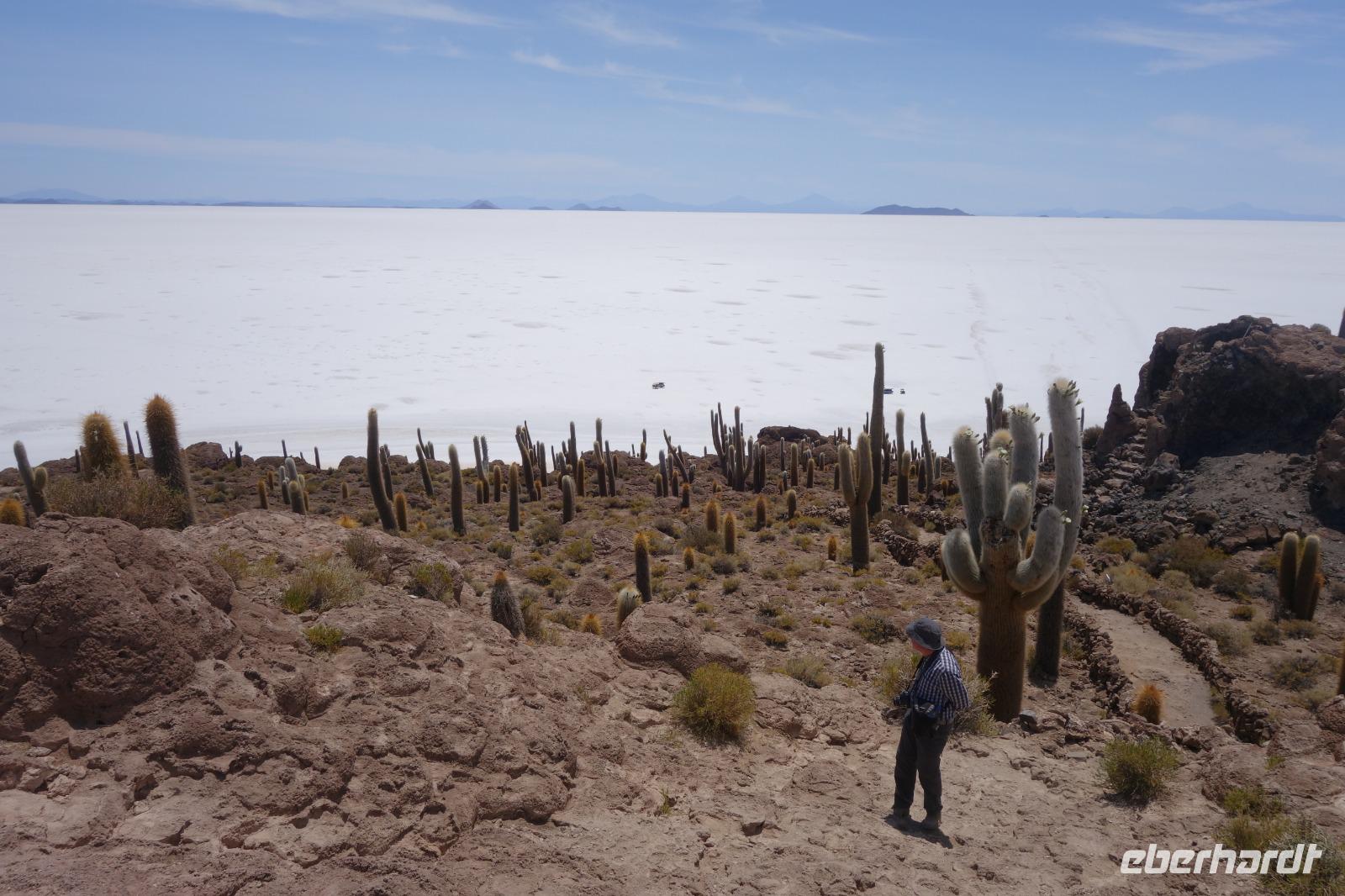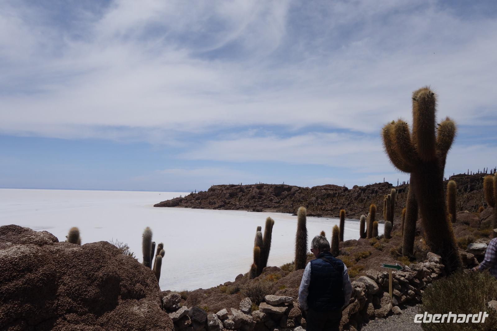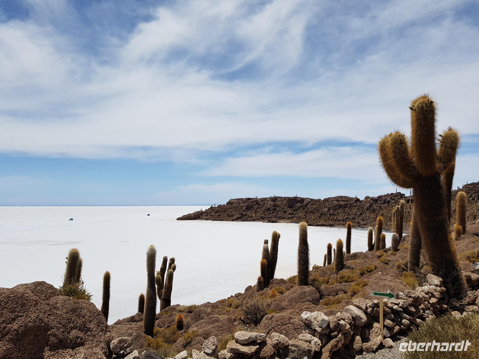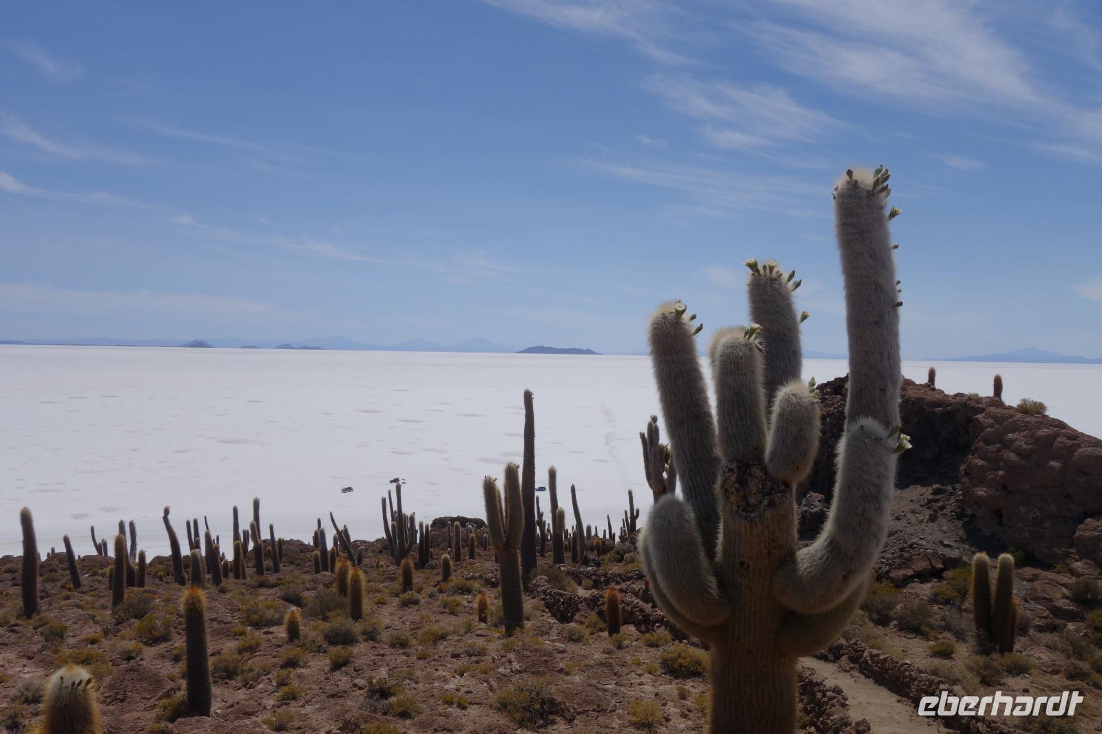 Alles kommt im Leben und heute ist der Tag gekommen. Wir freuen uns auf die kommende 3-tägige Jeepsafari durch das Andenhochland zum Uyuni-Salzsee, zur Laguna Colorada, zu den Lagunen Canapa, Honda und Hedionda sowie zu den Geysiren Sol de Manana. Als Höhepunkt unserer Rundreise schließt sich ab heute das bolivianische Andenhochland mit dem größten Salzsee der Welt, Uyuni, farbenfrohen Lagunen und unzähligen Andenflamingos an. Wir genießen eine aufregende Jeepfahrt auf dem Salzsee von Uyuni, der größten Salzfläche der Erde. In den nächsten 3 Tage bewegen wir uns in 2 Jeeps fort und überqueren den strahlend weißen Salzsee von Uyuni. Sonnenbrillen, Sonnenschutz, Zwiebel-Jacken-Prinzip und Mütze nicht vergessen. Um 9 Uhr holen uns Cesar und Gustavo, unsere 2 Jeep-Fahrer der nächsten 3 Tage, ab. Wir erleben heute einen unvergesslichen Tag auf dem größten Salzsee der Welt, der einem riesigen Gletscher gleicht. Den ersten Stopp machen wir bei Colchani, wo wir bei einem Familienbetrieb sehen, wie das Salz des Salzsees verarbeitet und direkt verkauft wird. Es war sehr interessant den ganzen Prozess zu sehen und jeder hat ein bisschen Salz mit nach Deutschland gebracht. Wir fahren weiter zu "Los Ojos del Salar" oder zu den "Augen des Salzsees", wo klares und frisches Wasser von unten direkt nach oben fließt. Einige von uns testeten die Temperatur mit der Hand und als das Wasser verschwand, blieb eine Hand voller Salz zurück. Es ist ein unvergessliches Erlebnis auf diesem Salzsee zu fahren und rechts, links, vorne und hinten nur strahlendes Weiß und weißes Salz bis in die Ferne sehen zu können. Man fühlt sich wie auf einem anderen Planeten oder auf dem Mond. Der nächste Stopp ist auf der Insel Incahuasi, inmitten des ausgetrockneten Sees gelegen. Dort bestimmen exotisch wirkende Kakteen das Bild und bieten sich einfach perfekt als Fotomotive an. Hier machen wir eine 40-minütige Wanderung bis zum höchsten Punkt der Insel. Von hier aus realisiert man erst, wo wir uns befinden. Vor 10.000 Jahren gab es hier einen See aus Salz, Korallen, Fische und alles was es im Meer gibt. Und heute nur Salz. Die Sonne und das Salz sehen aus, wie schneebedeckte Berge auf denen man im Winter Ski fährt. Es blendet die Sonne und Salz wie verrückt. Wir hatten Glück und die Kakteen waren gerade voll in Blüte. Herrlich. Der Tag ist voll mit Highlights und der nächste Tag steht schon bevor. Wir fahren mitten über den Salzsee und Cesar und Gustavo bereiteten für uns ein Luxus-Mittagessen. Es ist einfach ein Traum. Purer Luxus und es hat wunderbar geschmeckt. Es gab sogar zum Anstoßen Rotwein aus Bolivien. Wir haben auch hier lustige und verrückte Bilder gemacht, da die Entfernung auf dem See eine optische Täuschung verursacht.