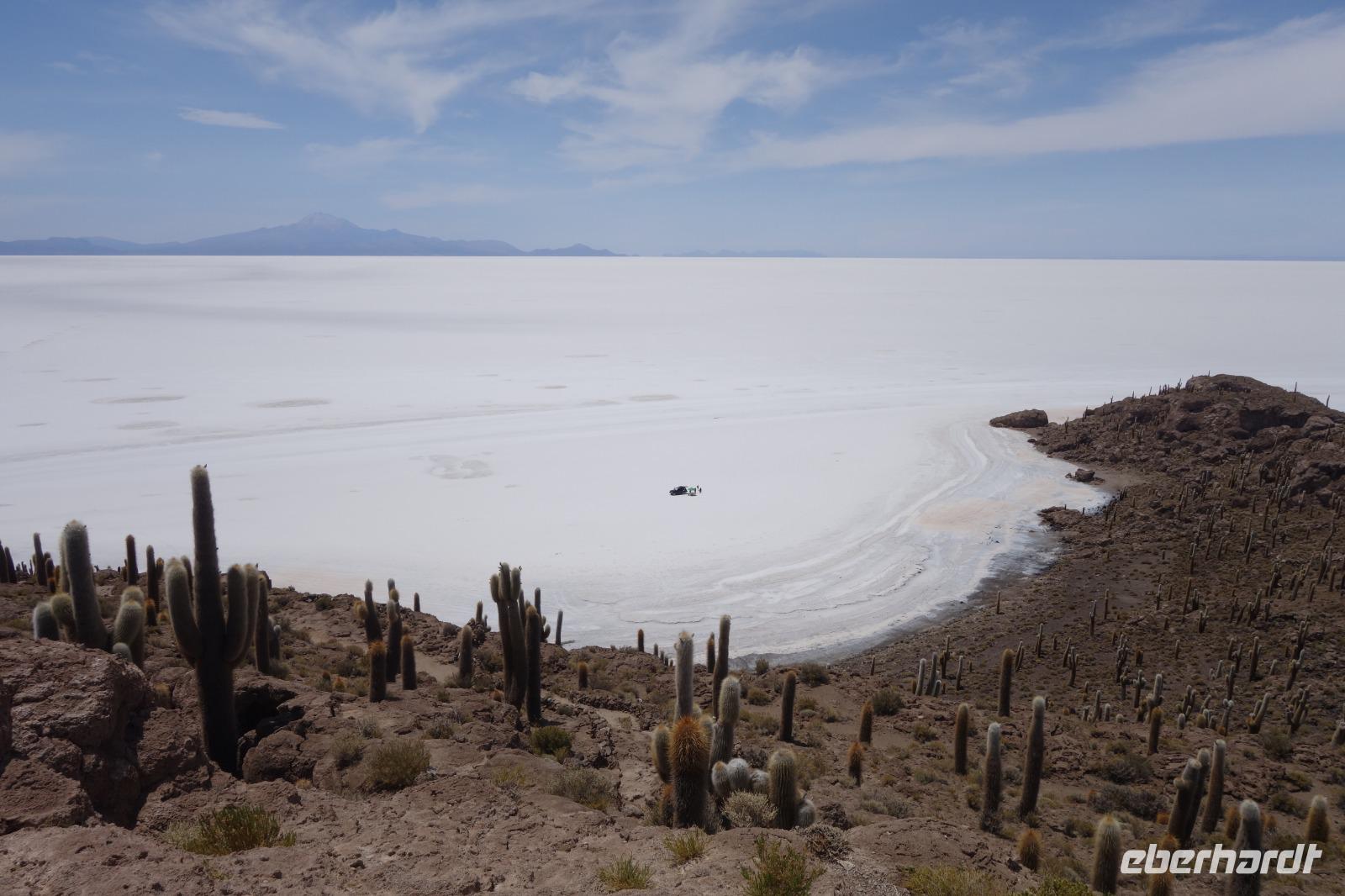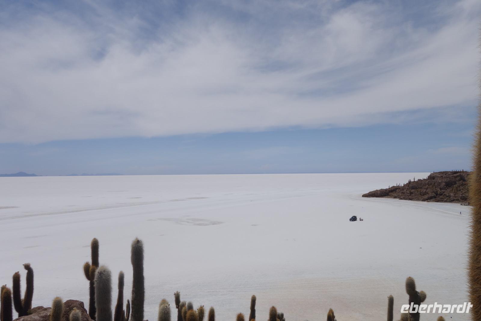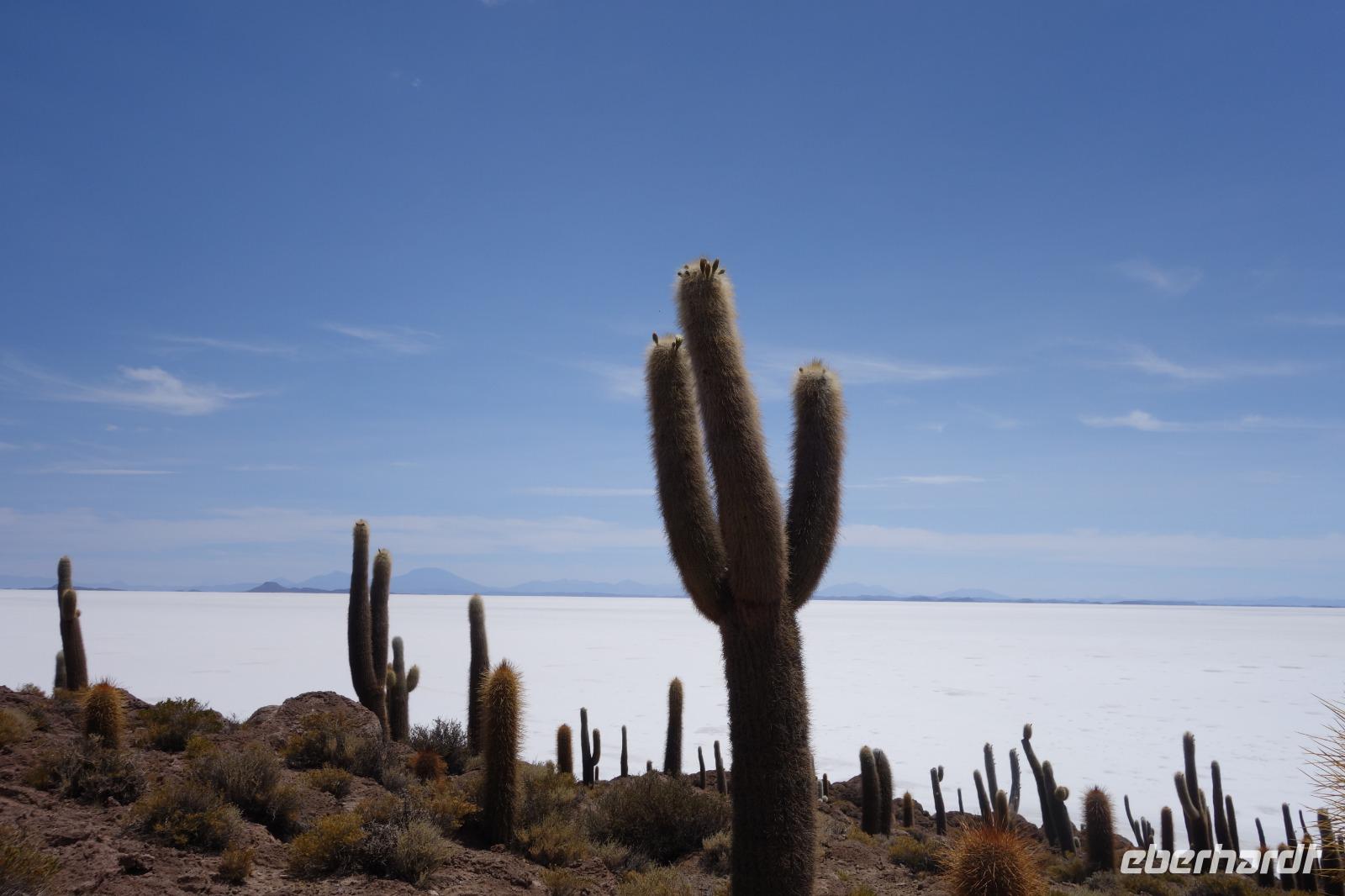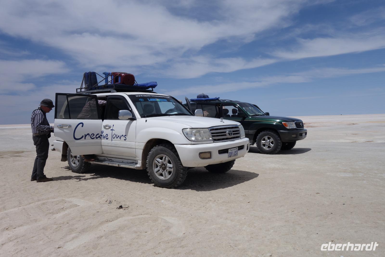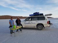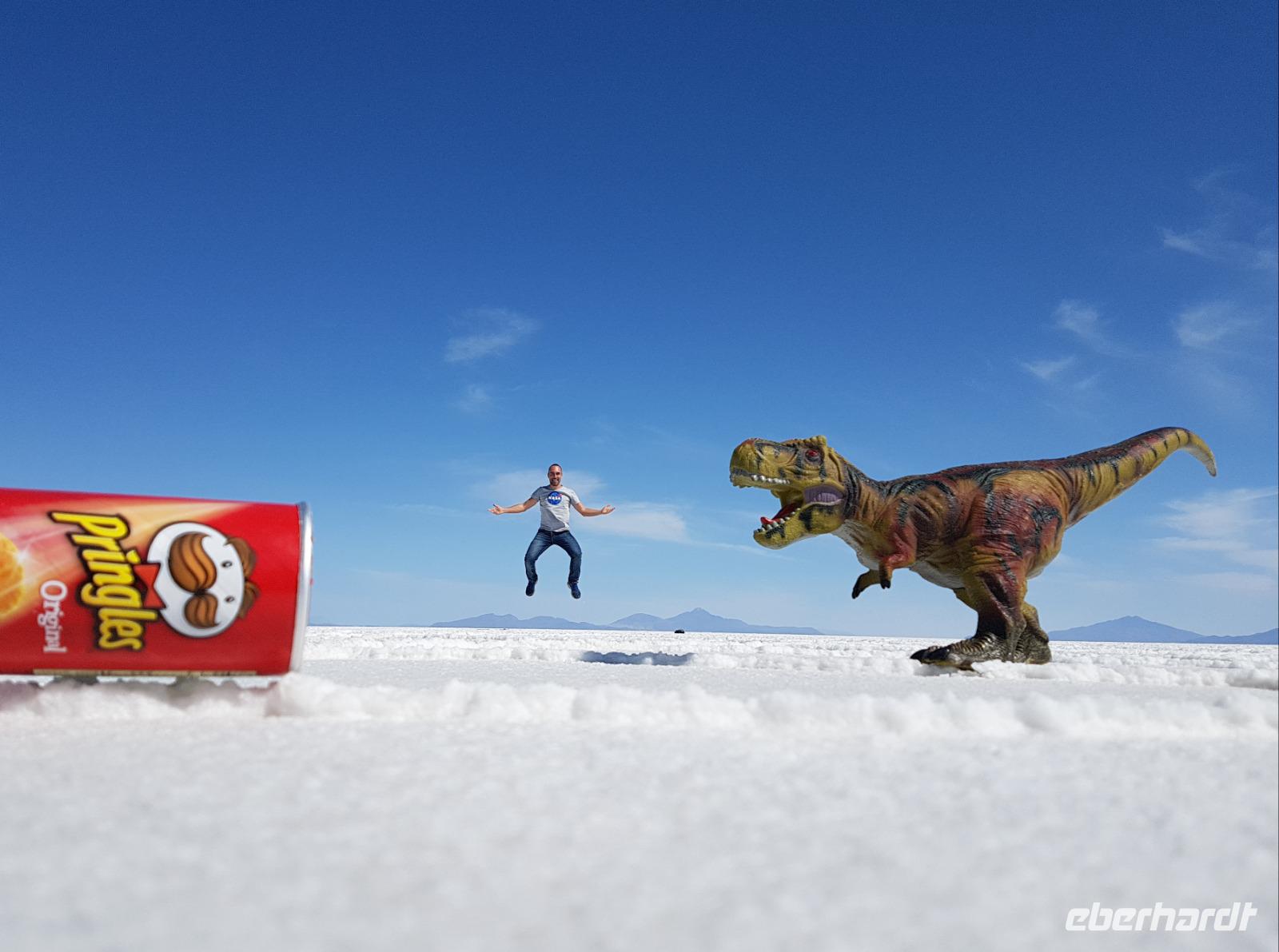 Alles kommt im Leben und heute ist der Tag gekommen. Wir freuen uns auf die kommende 3-tägige Jeepsafari durch das Andenhochland zum Uyuni-Salzsee, zur Laguna Colorada, zu den Lagunen Canapa, Honda und Hedionda sowie zu den Geysiren Sol de Manana. Als Höhepunkt unserer Rundreise schließt sich ab heute das bolivianische Andenhochland mit dem größten Salzsee der Welt, Uyuni, farbenfrohen Lagunen und unzähligen Andenflamingos an. Wir genießen eine aufregende Jeepfahrt auf dem Salzsee von Uyuni, der größten Salzfläche der Erde. In den nächsten 3 Tage bewegen wir uns in 2 Jeeps fort und überqueren den strahlend weißen Salzsee von Uyuni. Sonnenbrillen, Sonnenschutz, Zwiebel-Jacken-Prinzip und Mütze nicht vergessen. Um 9 Uhr holen uns Cesar und Gustavo, unsere 2 Jeep-Fahrer der nächsten 3 Tage, ab. Wir erleben heute einen unvergesslichen Tag auf dem größten Salzsee der Welt, der einem riesigen Gletscher gleicht. Den ersten Stopp machen wir bei Colchani, wo wir bei einem Familienbetrieb sehen, wie das Salz des Salzsees verarbeitet und direkt verkauft wird. Es war sehr interessant den ganzen Prozess zu sehen und jeder hat ein bisschen Salz mit nach Deutschland gebracht. Wir fahren weiter zu "Los Ojos del Salar" oder zu den "Augen des Salzsees", wo klares und frisches Wasser von unten direkt nach oben fließt. Einige von uns testeten die Temperatur mit der Hand und als das Wasser verschwand, blieb eine Hand voller Salz zurück. Es ist ein unvergessliches Erlebnis auf diesem Salzsee zu fahren und rechts, links, vorne und hinten nur strahlendes Weiß und weißes Salz bis in die Ferne sehen zu können. Man fühlt sich wie auf einem anderen Planeten oder auf dem Mond. Der nächste Stopp ist auf der Insel Incahuasi, inmitten des ausgetrockneten Sees gelegen. Dort bestimmen exotisch wirkende Kakteen das Bild und bieten sich einfach perfekt als Fotomotive an. Hier machen wir eine 40-minütige Wanderung bis zum höchsten Punkt der Insel. Von hier aus realisiert man erst, wo wir uns befinden. Vor 10.000 Jahren gab es hier einen See aus Salz, Korallen, Fische und alles was es im Meer gibt. Und heute nur Salz. Die Sonne und das Salz sehen aus, wie schneebedeckte Berge auf denen man im Winter Ski fährt. Es blendet die Sonne und Salz wie verrückt. Wir hatten Glück und die Kakteen waren gerade voll in Blüte. Herrlich. Der Tag ist voll mit Highlights und der nächste Tag steht schon bevor. Wir fahren mitten über den Salzsee und Cesar und Gustavo bereiteten für uns ein Luxus-Mittagessen. Es ist einfach ein Traum. Purer Luxus und es hat wunderbar geschmeckt. Es gab sogar zum Anstoßen Rotwein aus Bolivien. Wir haben auch hier lustige und verrückte Bilder gemacht, da die Entfernung auf dem See eine optische Täuschung verursacht.