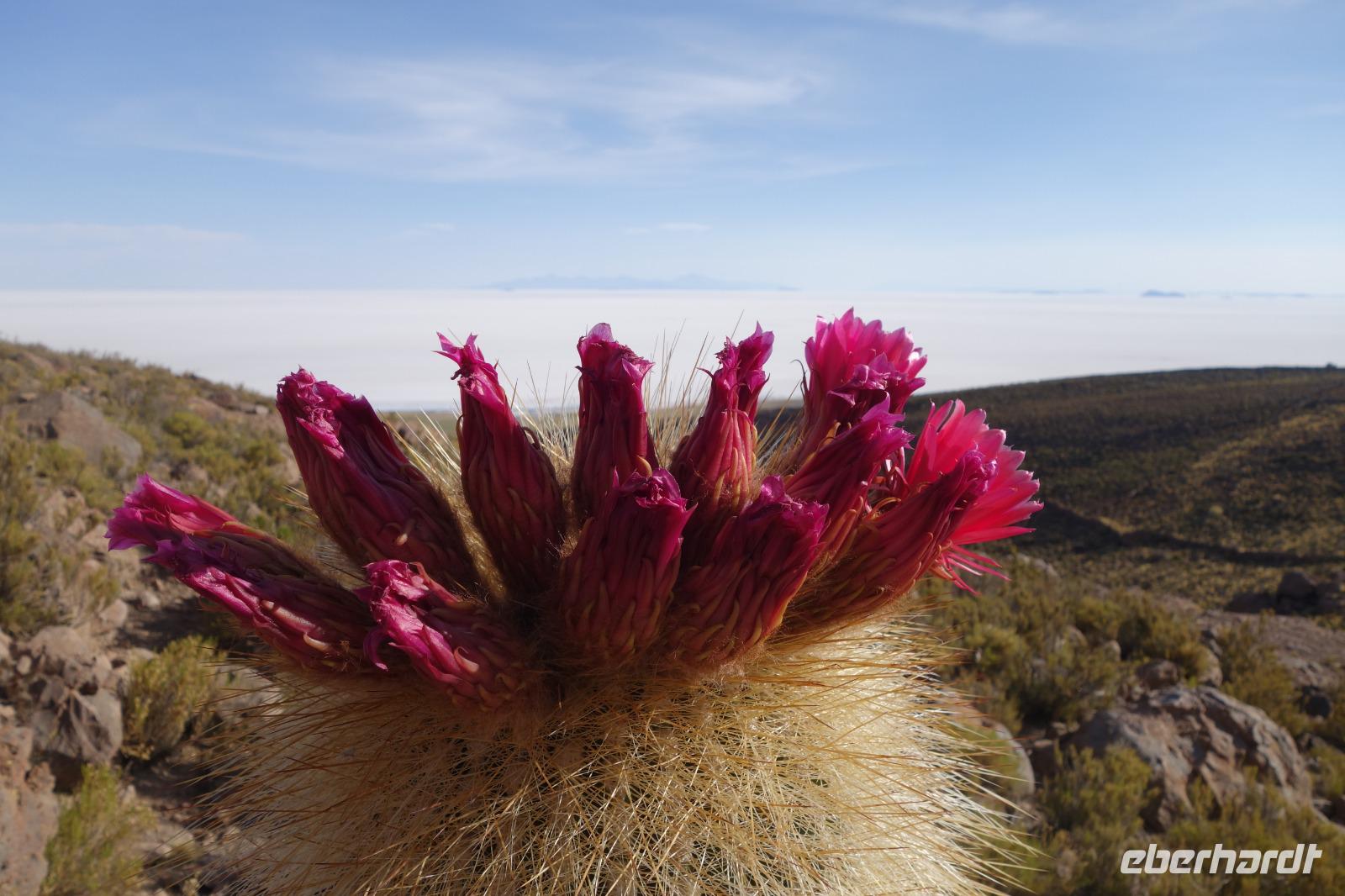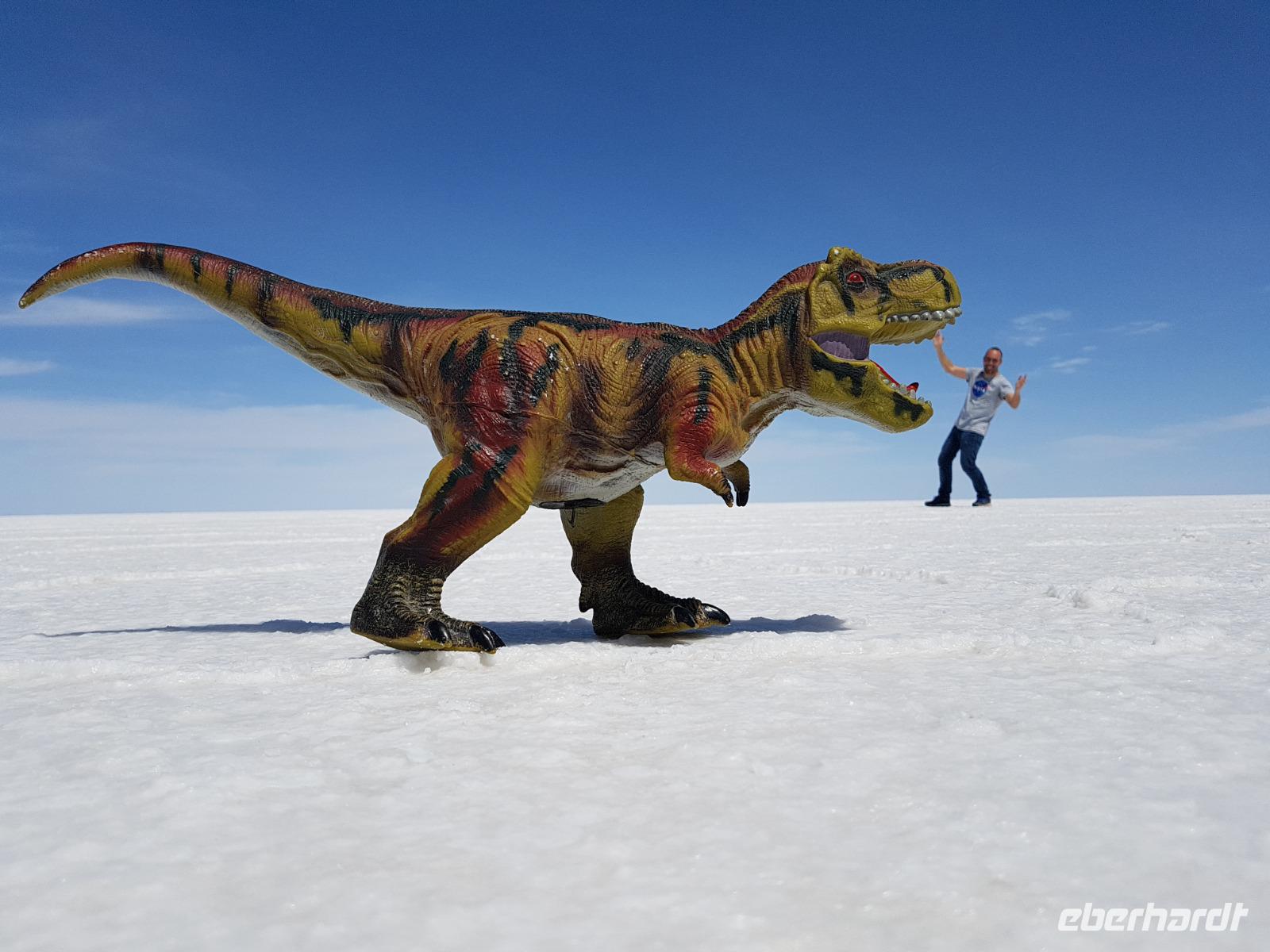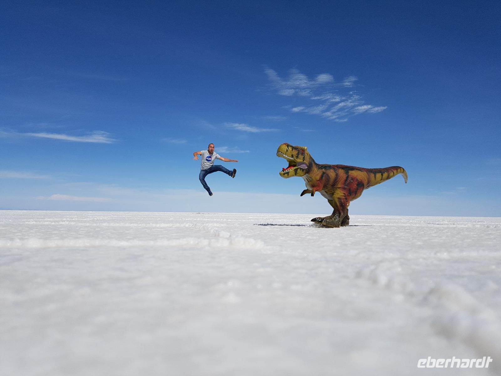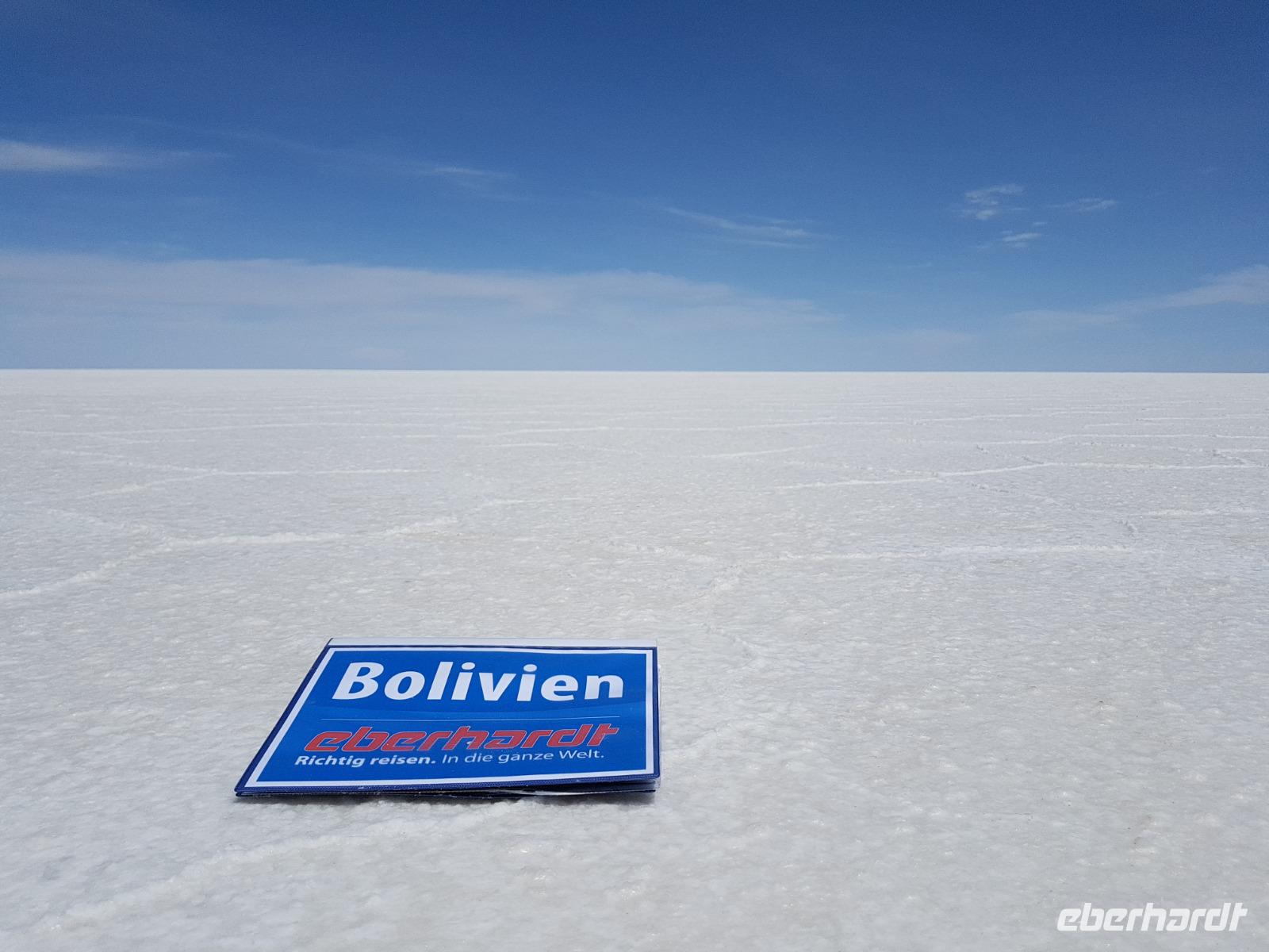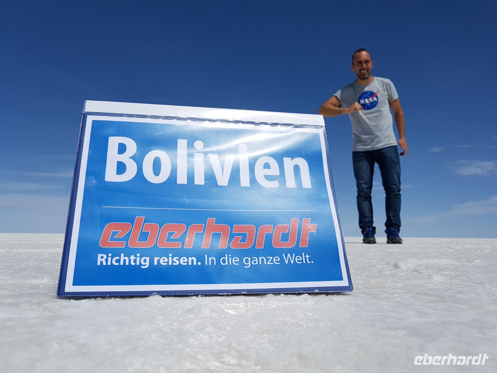 Alles kommt im Leben und heute ist der Tag gekommen. Wir freuen uns auf die kommende 3-tägige Jeepsafari durch das Andenhochland zum Uyuni-Salzsee, zur Laguna Colorada, zu den Lagunen Canapa, Honda und Hedionda sowie zu den Geysiren Sol de Manana. Als Höhepunkt unserer Rundreise schließt sich ab heute das bolivianische Andenhochland mit dem größten Salzsee der Welt, Uyuni, farbenfrohen Lagunen und unzähligen Andenflamingos an. Wir genießen eine aufregende Jeepfahrt auf dem Salzsee von Uyuni, der größten Salzfläche der Erde. In den nächsten 3 Tage bewegen wir uns in 2 Jeeps fort und überqueren den strahlend weißen Salzsee von Uyuni. Sonnenbrillen, Sonnenschutz, Zwiebel-Jacken-Prinzip und Mütze nicht vergessen. Um 9 Uhr holen uns Cesar und Gustavo, unsere 2 Jeep-Fahrer der nächsten 3 Tage, ab. Wir erleben heute einen unvergesslichen Tag auf dem größten Salzsee der Welt, der einem riesigen Gletscher gleicht. Den ersten Stopp machen wir bei Colchani, wo wir bei einem Familienbetrieb sehen, wie das Salz des Salzsees verarbeitet und direkt verkauft wird. Es war sehr interessant den ganzen Prozess zu sehen und jeder hat ein bisschen Salz mit nach Deutschland gebracht. Wir fahren weiter zu "Los Ojos del Salar" oder zu den "Augen des Salzsees", wo klares und frisches Wasser von unten direkt nach oben fließt. Einige von uns testeten die Temperatur mit der Hand und als das Wasser verschwand, blieb eine Hand voller Salz zurück. Es ist ein unvergessliches Erlebnis auf diesem Salzsee zu fahren und rechts, links, vorne und hinten nur strahlendes Weiß und weißes Salz bis in die Ferne sehen zu können. Man fühlt sich wie auf einem anderen Planeten oder auf dem Mond. Der nächste Stopp ist auf der Insel Incahuasi, inmitten des ausgetrockneten Sees gelegen. Dort bestimmen exotisch wirkende Kakteen das Bild und bieten sich einfach perfekt als Fotomotive an. Hier machen wir eine 40-minütige Wanderung bis zum höchsten Punkt der Insel. Von hier aus realisiert man erst, wo wir uns befinden. Vor 10.000 Jahren gab es hier einen See aus Salz, Korallen, Fische und alles was es im Meer gibt. Und heute nur Salz. Die Sonne und das Salz sehen aus, wie schneebedeckte Berge auf denen man im Winter Ski fährt. Es blendet die Sonne und Salz wie verrückt. Wir hatten Glück und die Kakteen waren gerade voll in Blüte. Herrlich. Der Tag ist voll mit Highlights und der nächste Tag steht schon bevor. Wir fahren mitten über den Salzsee und Cesar und Gustavo bereiteten für uns ein Luxus-Mittagessen. Es ist einfach ein Traum. Purer Luxus und es hat wunderbar geschmeckt. Es gab sogar zum Anstoßen Rotwein aus Bolivien. Wir haben auch hier lustige und verrückte Bilder gemacht, da die Entfernung auf dem See eine optische Täuschung verursacht.