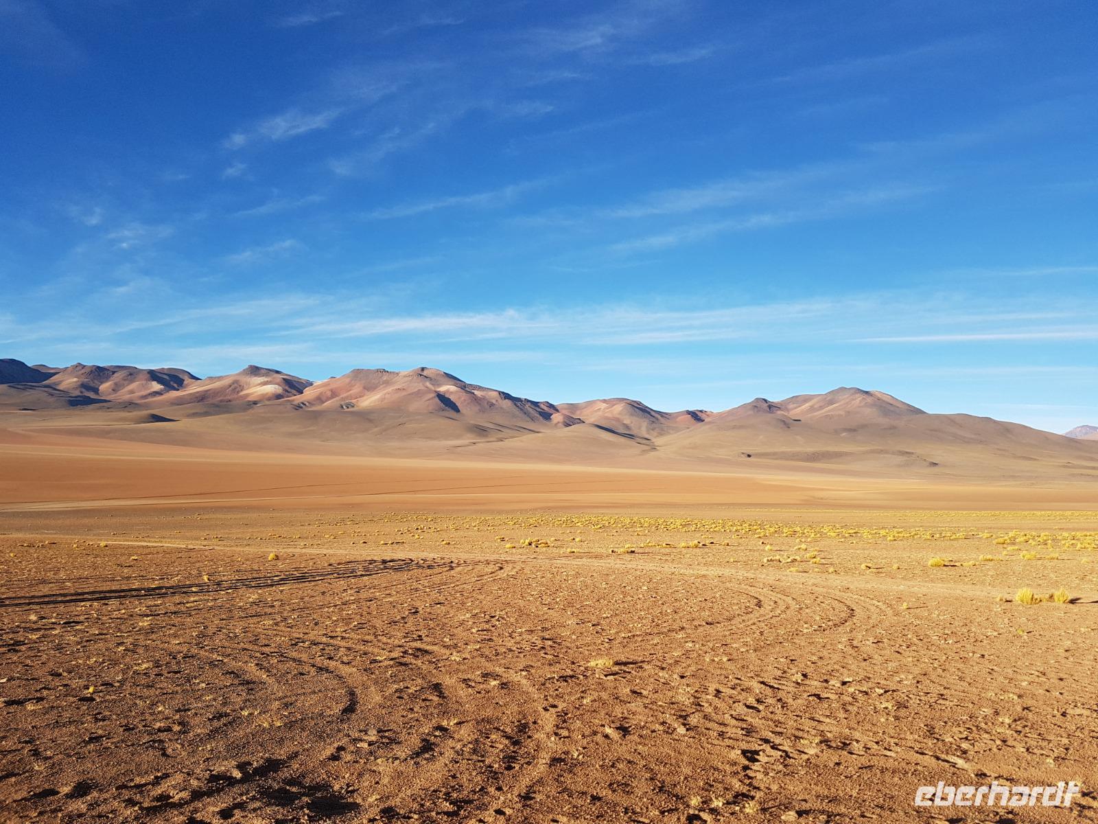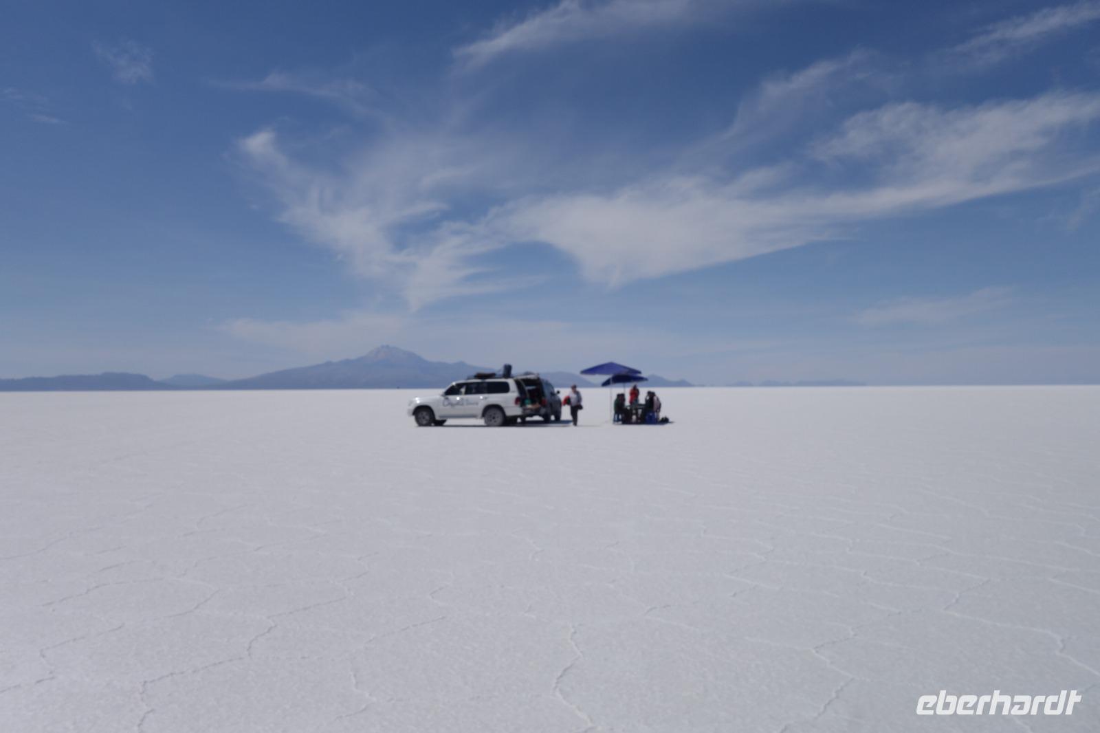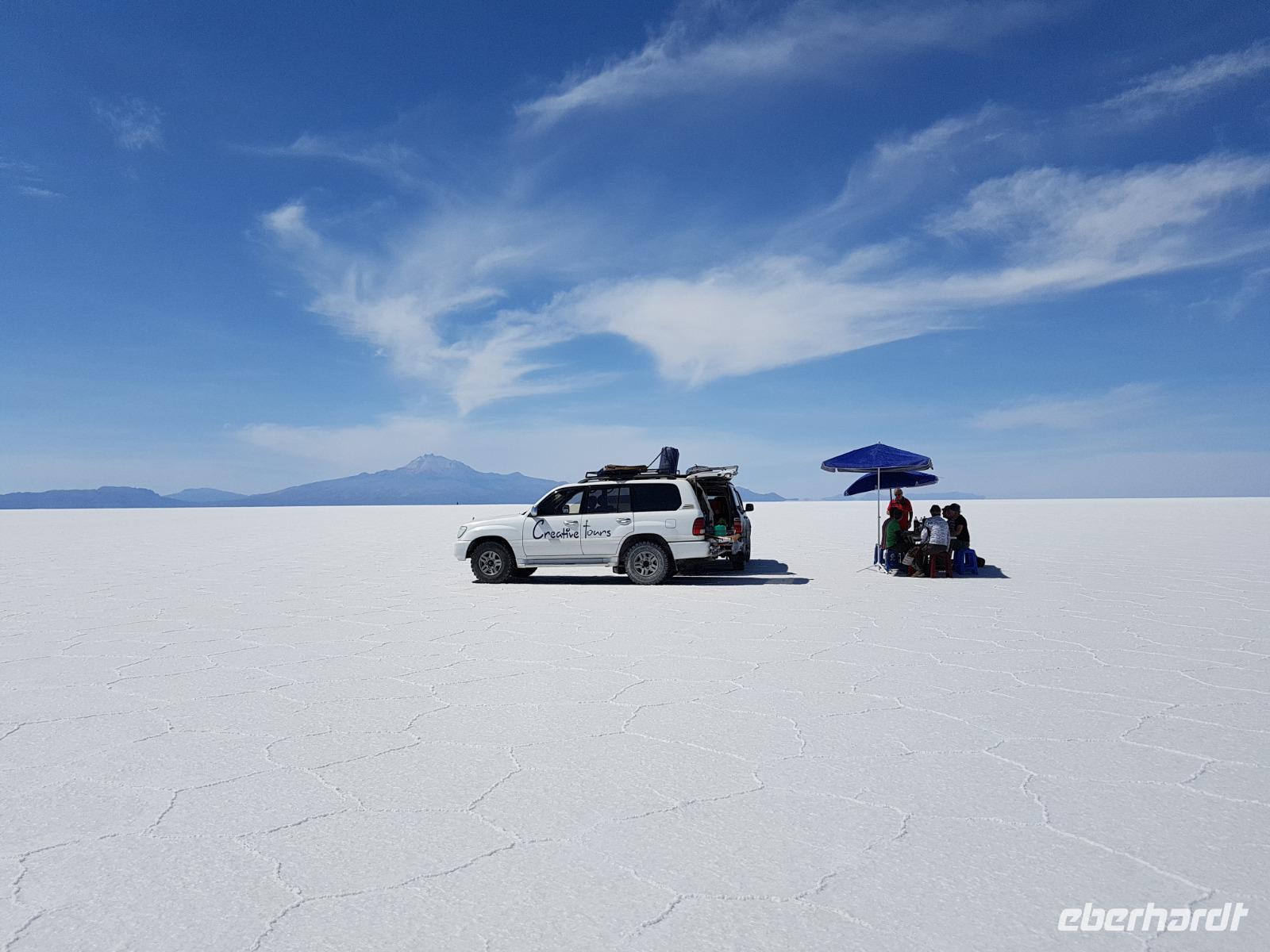Heute hat Benjamin von Eberhardt Travel gemeinsam mit Cinthia im Supermarkt eingekauft und alle Gäste zu einem gemeinsamen Picknick eingeladen. Wir verlassen Potosi und Cerro Rico voll Mineralien und fahren weiter in den kleinen Wüstenort Uyuni. Die Fahrt heute ist besonders schön, wir sehen endlose Straßen und die Landschaft und Fauna, die sich langsam verändert. Wir sehen schon die ersten Lamas und Vicunas. Im Hintergrund sieht man auch ein Vulkan. Das Wetter verändert sich im laufe des Tages und ab und zu regnet es ein bisschen. Wir machen auf dem Weg verschieden Photo-Stopps, einen am Ort ds Picknicks und einen von einem höheren gelegenen Punkt aus, von wo man den Uyuni Salz See im Hintergrund sehen kann. Wir freuen uns schon sehr auf morgen und die nächsten 3 Tage. Ein Highlight der Reise.