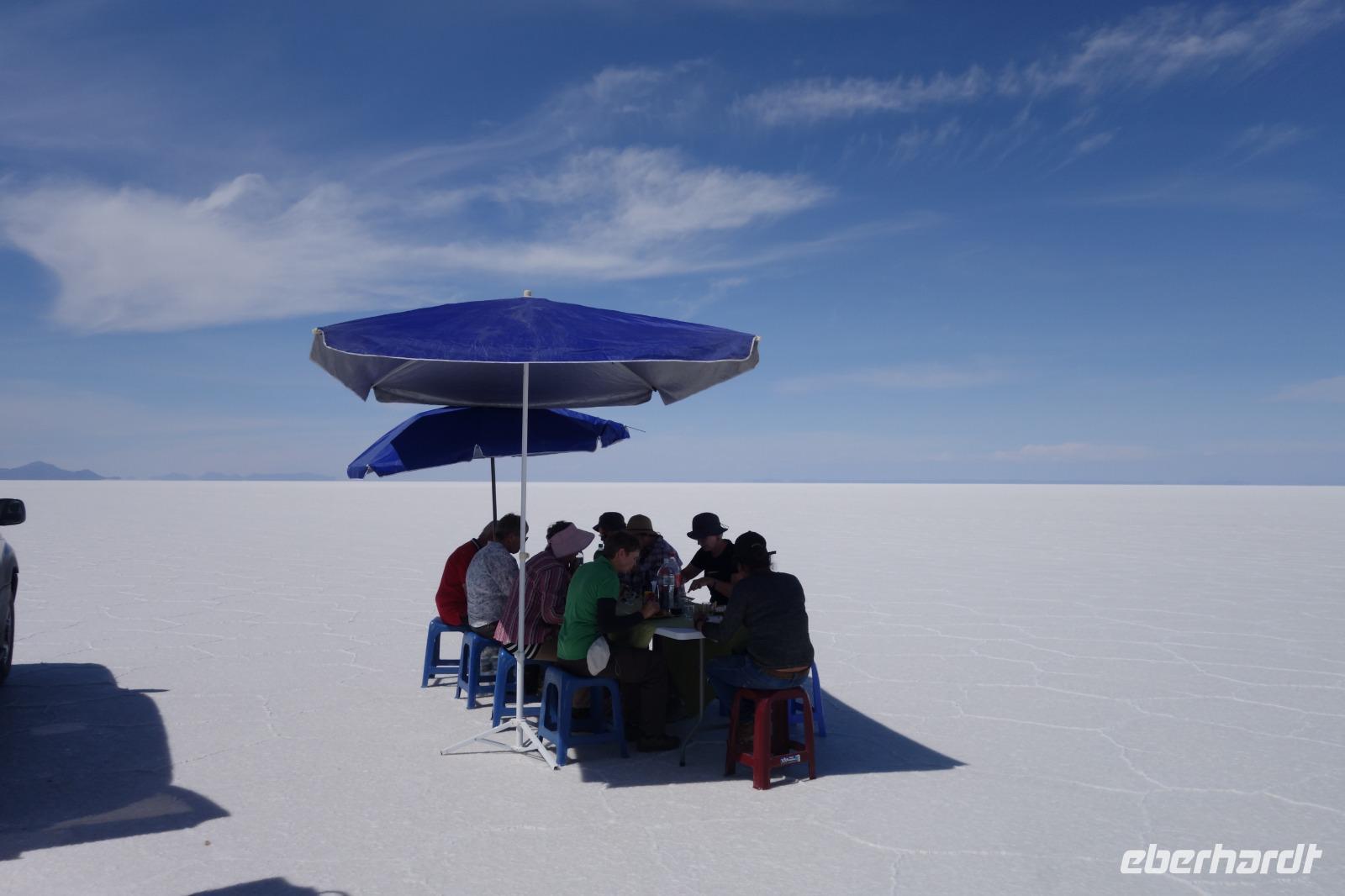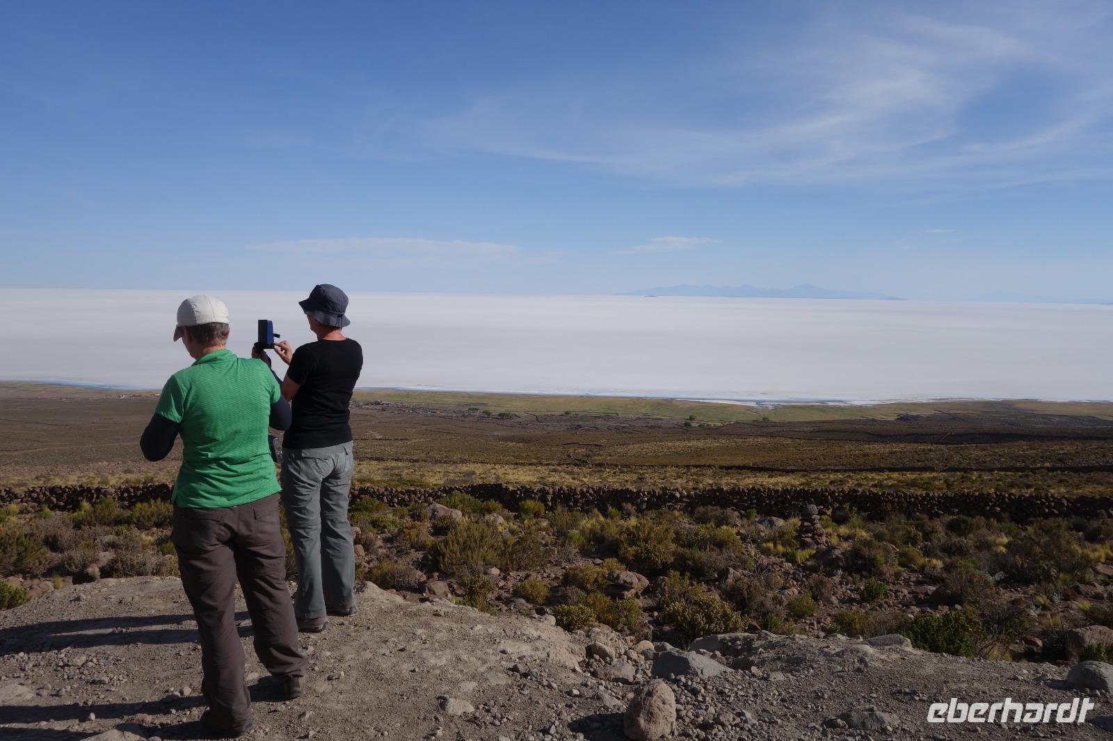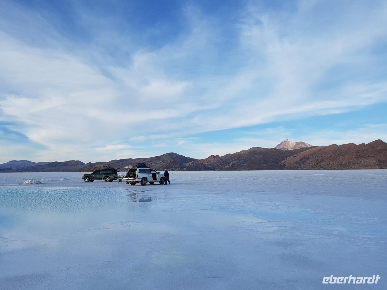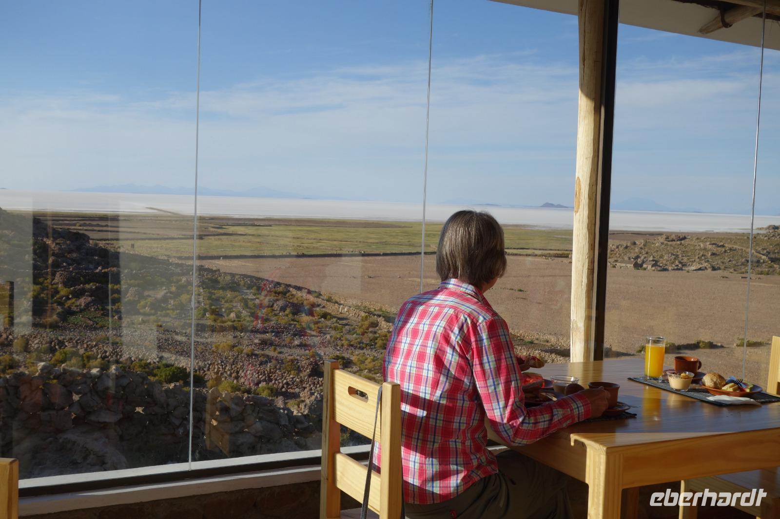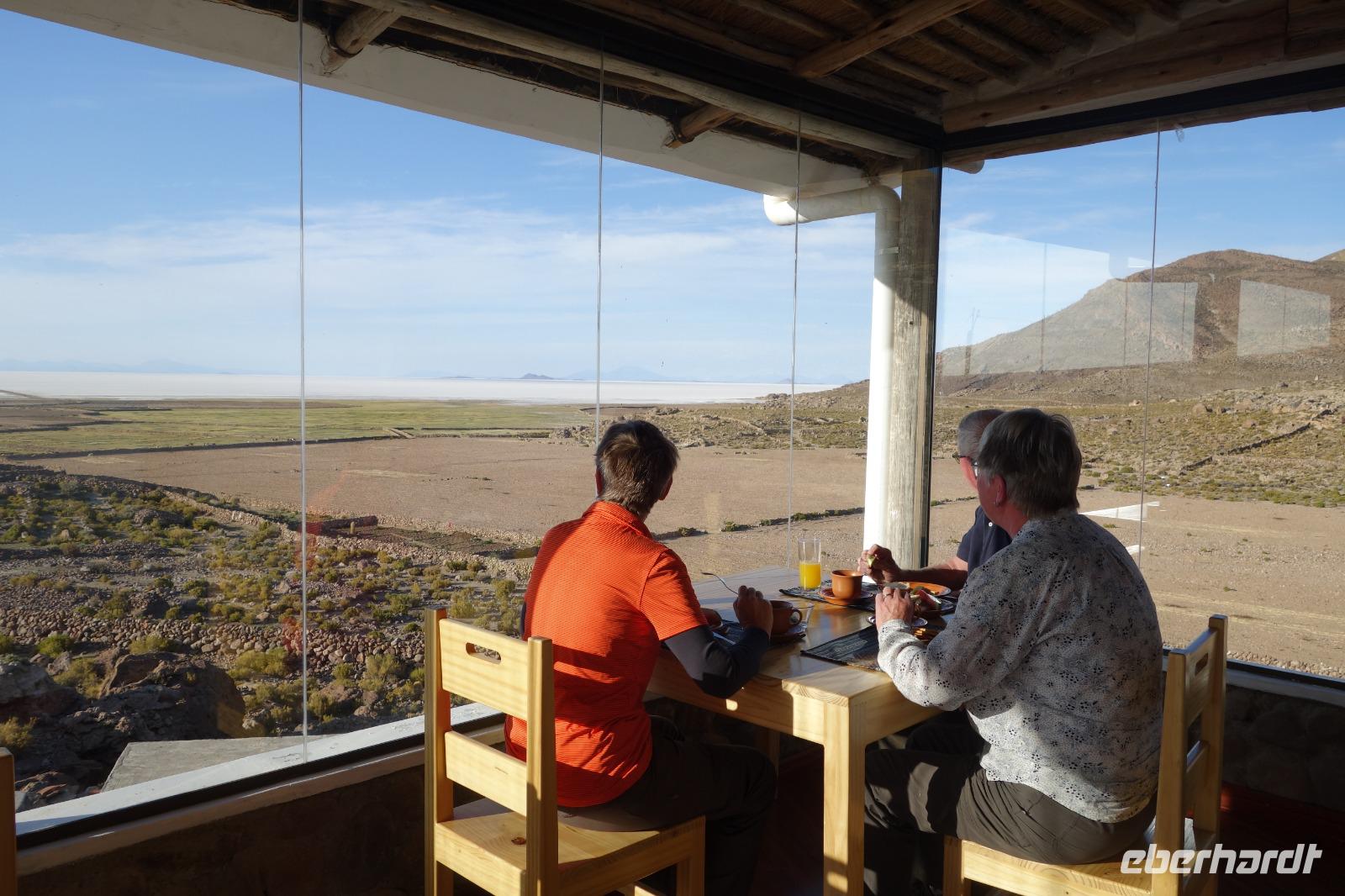 Wir haben sehr gut geschlafen und langsam akklimatisieren wir uns mit der Höhe. Heute und morgen werden wir Höhen von bis zu 5.000 Meter erreichen. Wir genießen eine unvergessliches Frühstück mit Blick auf den Salzsee. Man sieht den Salzsee tausendmal und jedes mal ist es faszinierend. Wir haben heute viel schönes vor und fahren daher schon um 8 Uhr los.