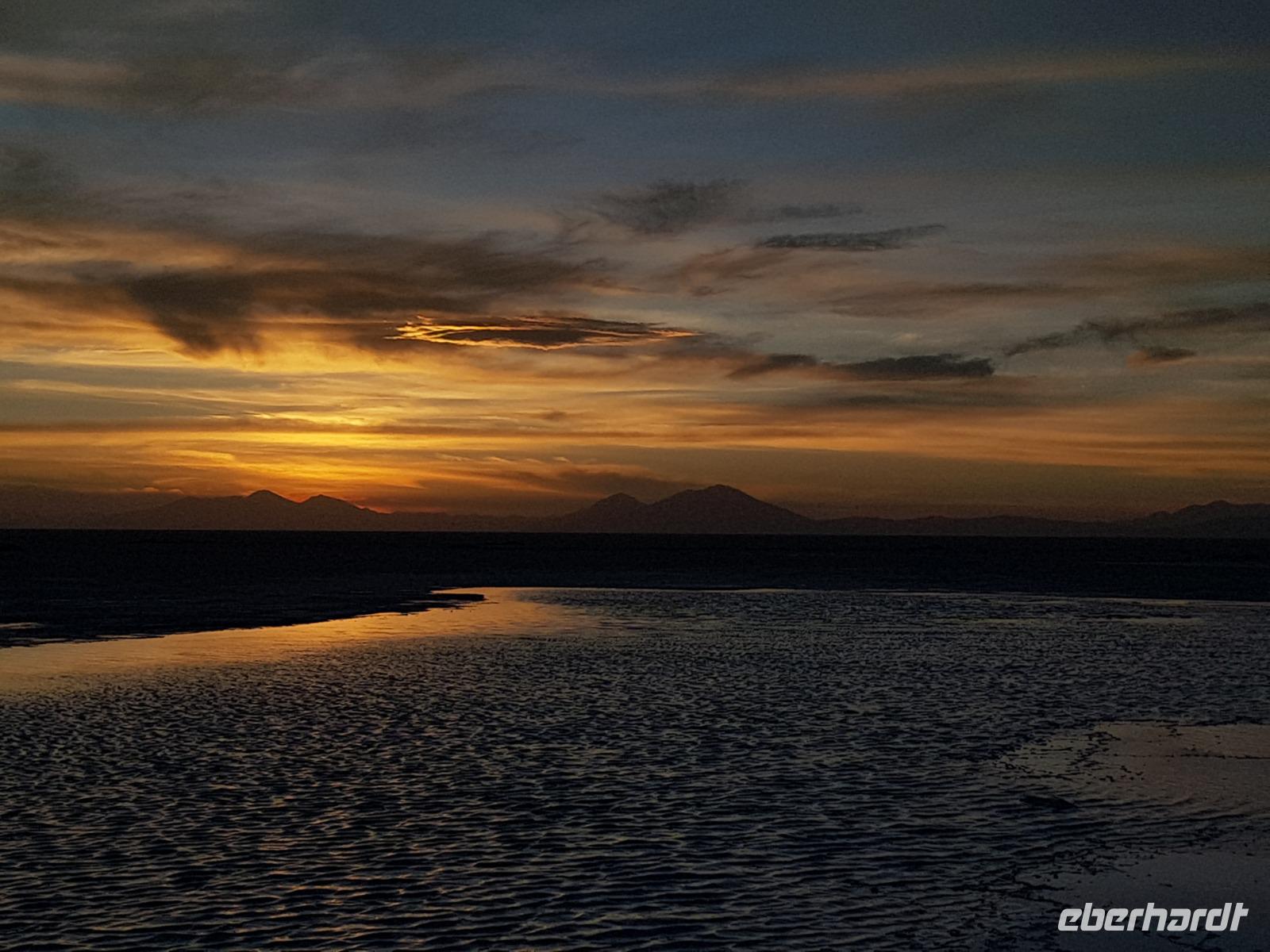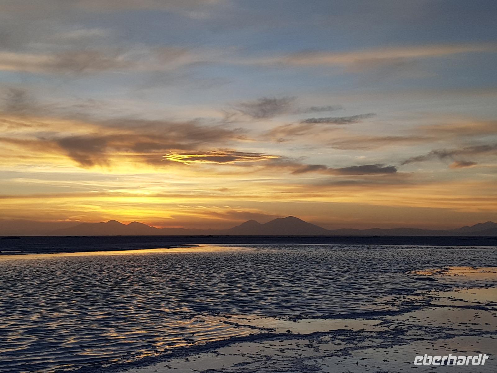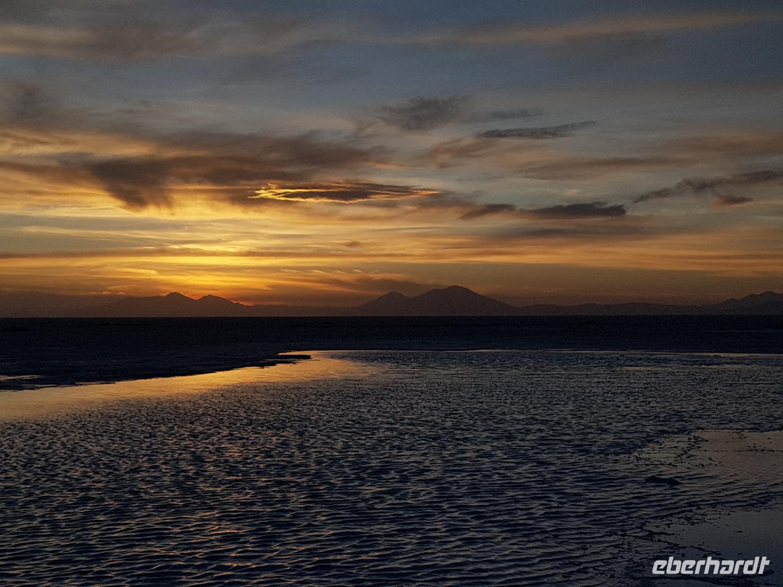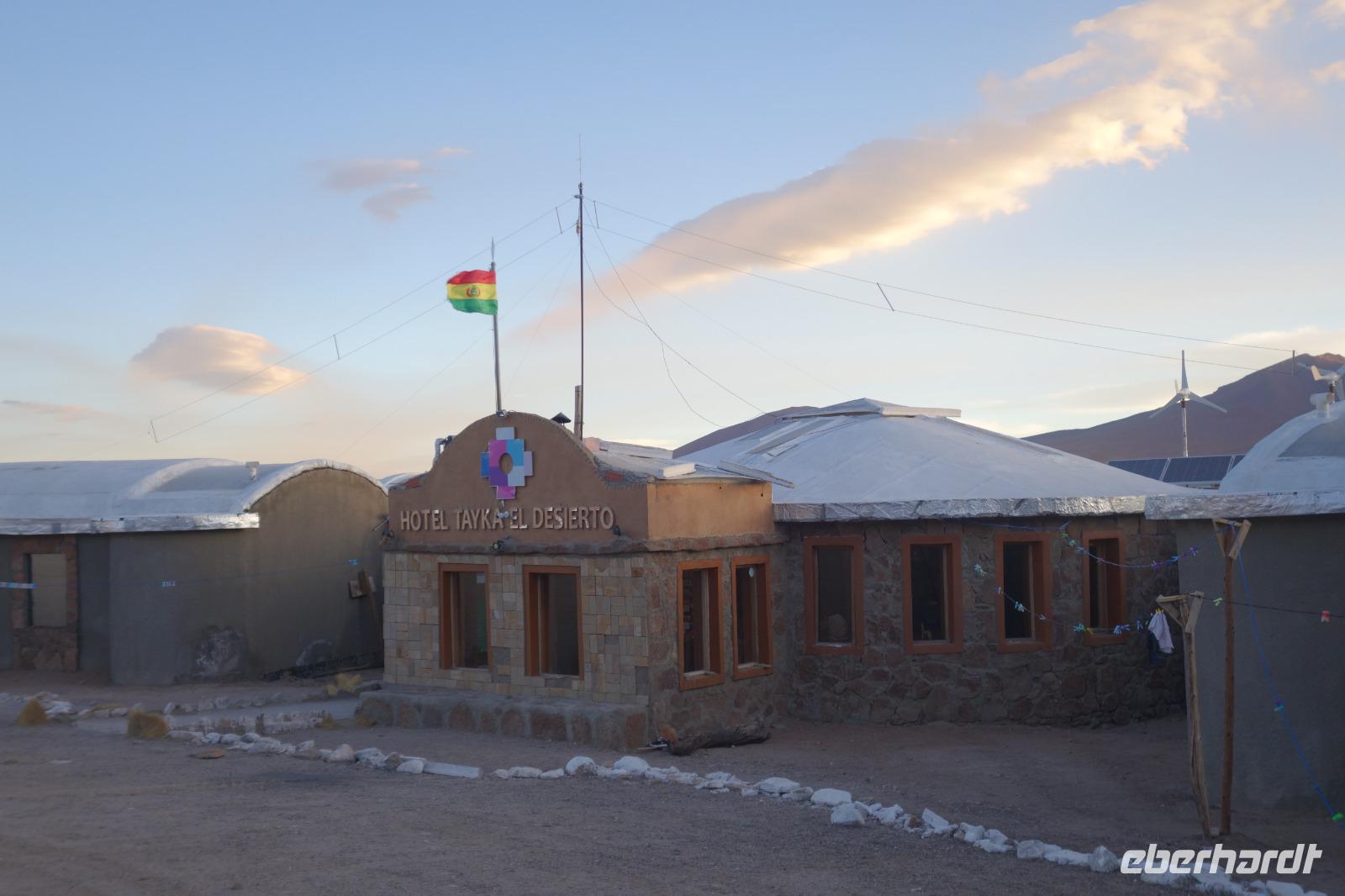 Der Tag ist noch nicht vorbei und wir fahren noch am späten Nachmittag zu einer Stelle mit Wasser am Salzsee, um den Sonnenuntergang zu sehen. Am Abend bereiten Cesar, Gustavo, Cinthia und Benjamin für die Gäste einen Sundowner vor. Es ist irre hier zu sein. Sonnenuntergang am Salzsee mit Vulkanen um uns herum. Die Farben und die Wolken machen einen unvergesslichen Sonnenuntergang möglich. Danach fahren wir weiter und erreichen kurz danach unser komfortables Hotel Tayka de Sal, welches klomplett aus Salz erbaut wurde (Höhe 3.700 Meter üNN). Ein einmaliges Erlebnis, oder? Es gibt ein leckeres Abendessen mit Quinoa Suppe und Rindfleisch mit Süßkartoffeln. So ein Tag bleibt immer im Herz und im Gedächtnis.