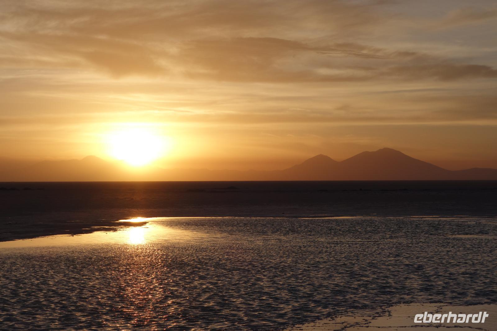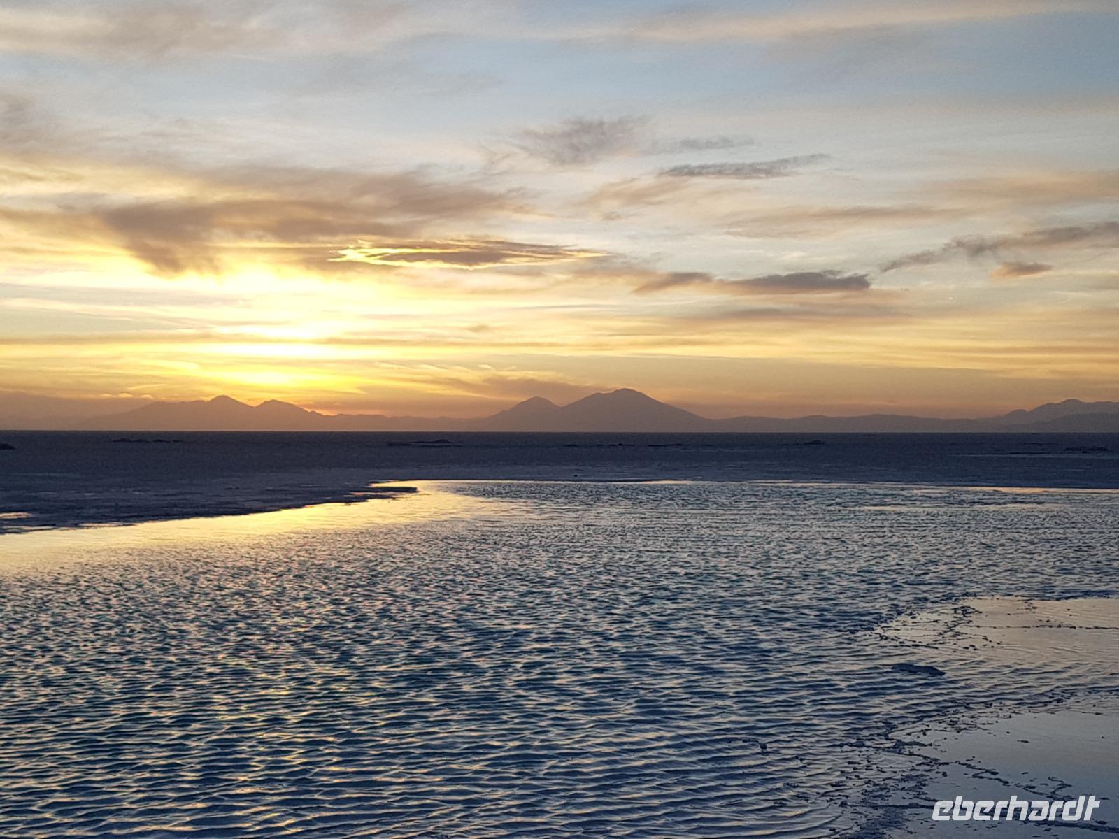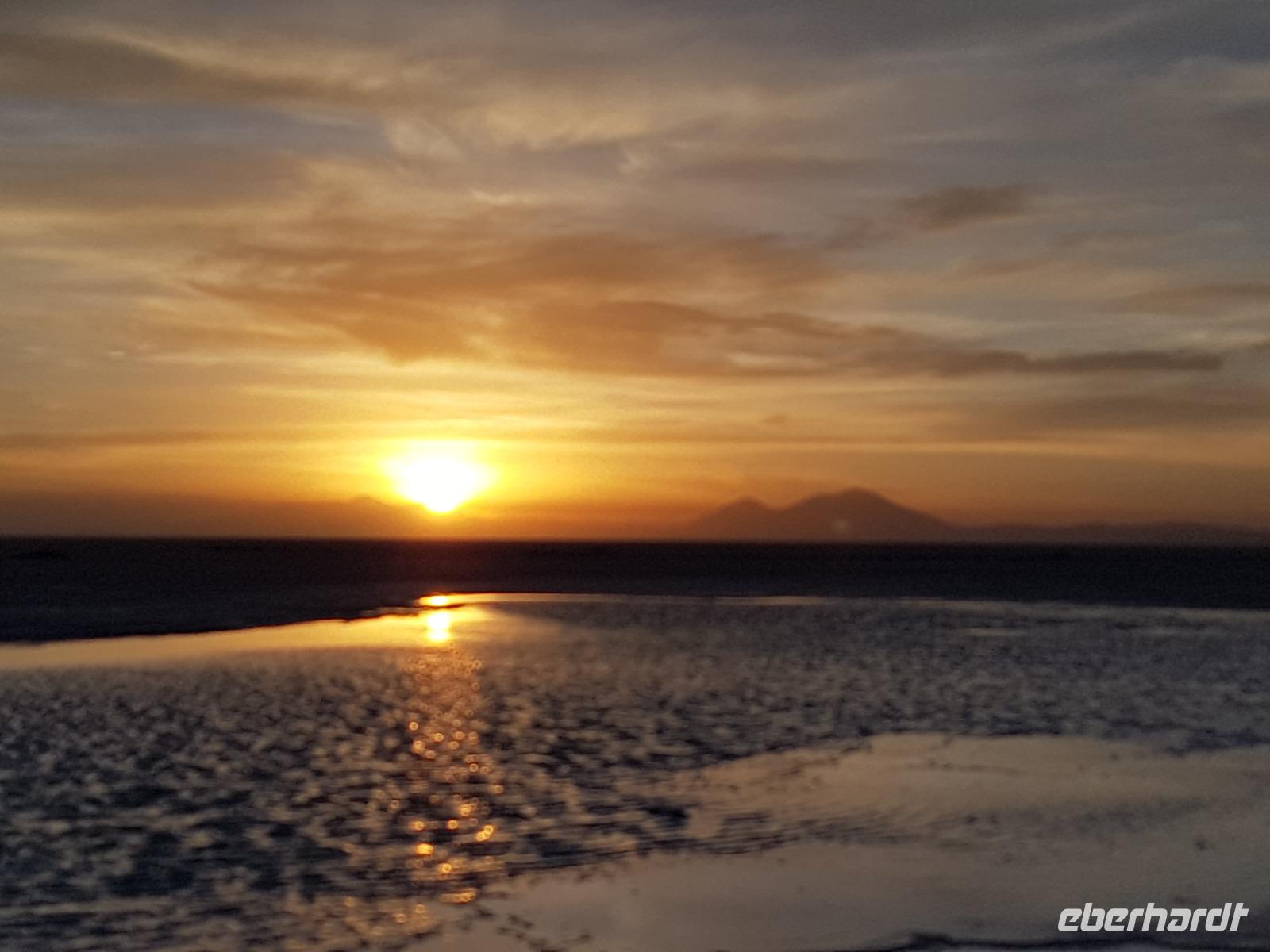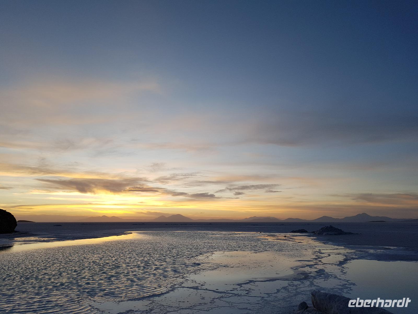 Der Tag ist noch nicht vorbei und wir fahren noch am späten Nachmittag zu einer Stelle mit Wasser am Salzsee, um den Sonnenuntergang zu sehen. Am Abend bereiten Cesar, Gustavo, Cinthia und Benjamin für die Gäste einen Sundowner vor. Es ist irre hier zu sein. Sonnenuntergang am Salzsee mit Vulkanen um uns herum. Die Farben und die Wolken machen einen unvergesslichen Sonnenuntergang möglich. Danach fahren wir weiter und erreichen kurz danach unser komfortables Hotel Tayka de Sal, welches klomplett aus Salz erbaut wurde (Höhe 3.700 Meter üNN). Ein einmaliges Erlebnis, oder? Es gibt ein leckeres Abendessen mit Quinoa Suppe und Rindfleisch mit Süßkartoffeln. So ein Tag bleibt immer im Herz und im Gedächtnis.