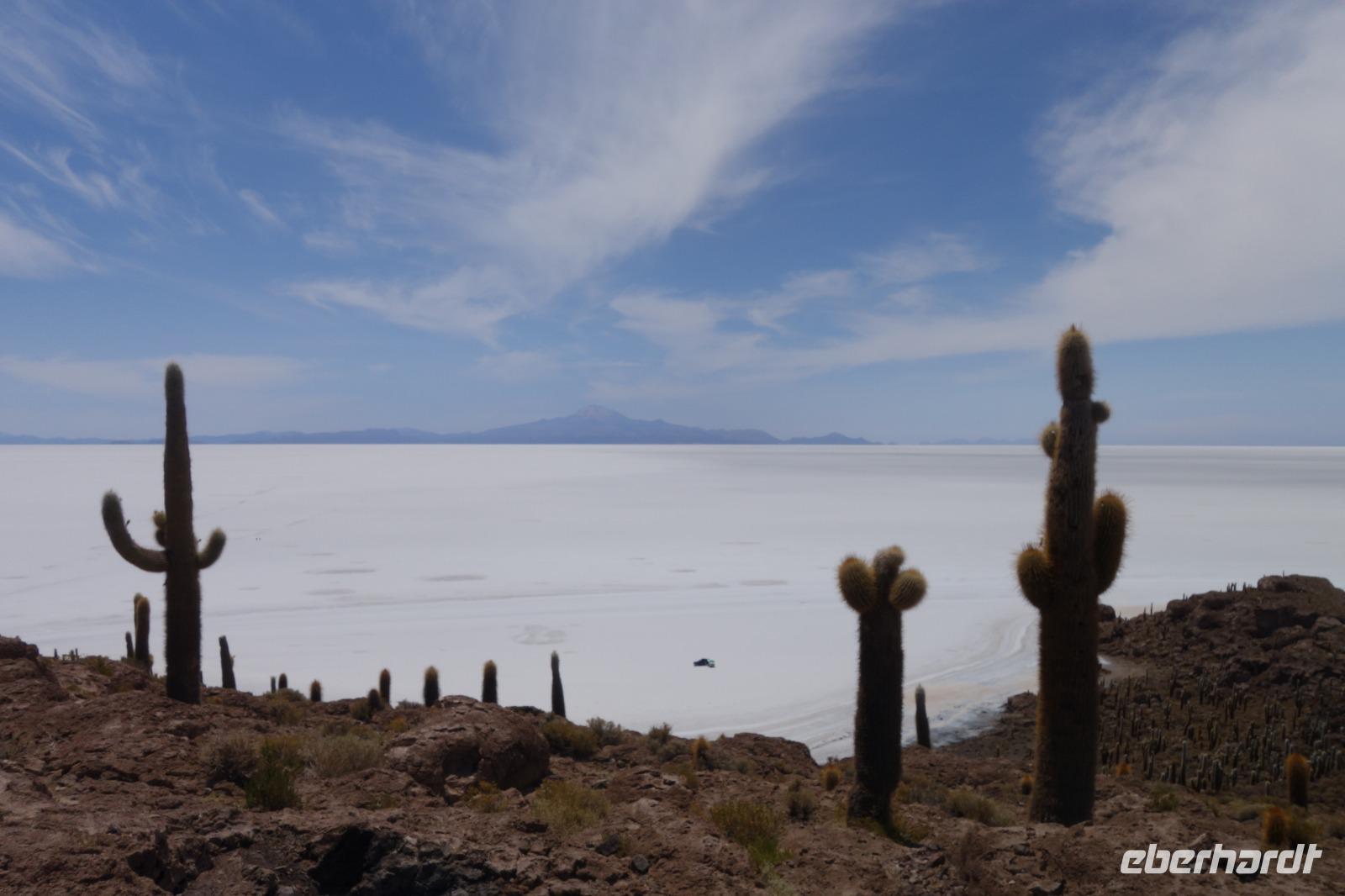 Wir fahren ca. 2 Stunden über den Salzsee. Zuerst halten wir bei den Felsen, die wie eine Kathedrale aussehen. Kurz danach besuchen wir die Höhle "Cueva Chiquini", in der wir viele Stalagmiten und Stalagtiten besichtigen können. Wir wollen uns noch vom Salzsee verabschieden und halten daher noch kurz, um die letzten lustigen Bildern zu machen. Unglaublich schön ist es mit einer Geschwindigkeit von 95 Km/h den weißen Salzsee zu überqueren. Wir verlassen den Salzsee Uyuni und sehen schon den Vulkan Kaltama und den dahinter gelegenen Vulkan Julina. Danach gehen wir nach San Pedro de Quemes zum Mittagessen. Das Dorf blickt auf eine lange Geschichte zurück. Hier herrschte früher Krieg zwischen Bolivien und seinem Nachbarland Chile. Cinthia erklärt uns, wie Bolivien damals einen Meerzugang hatte. Doch der internationale Gerichtshof entschied, dass Chile rechtlich nicht verpflichtet ist, über diesen Zugang zum Pazifik zu verhandeln. Daher bleibt Bolivien der Zugang bis heute verwehrt.