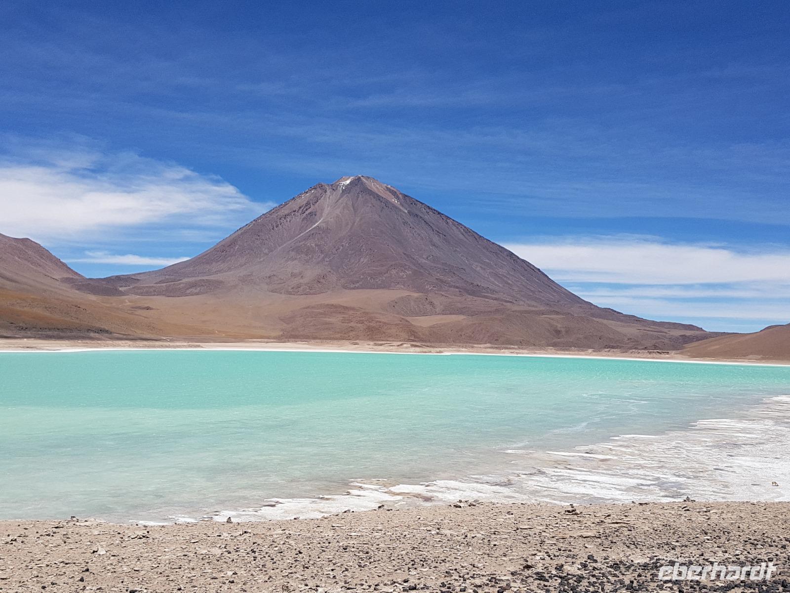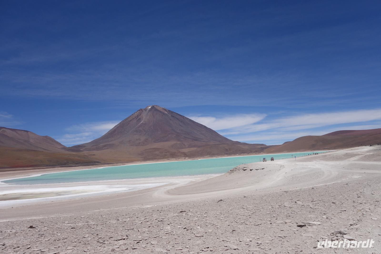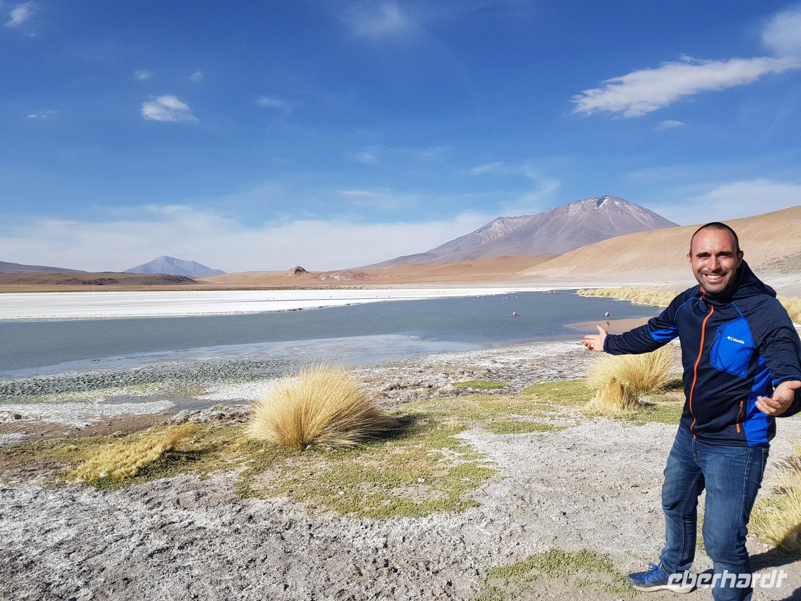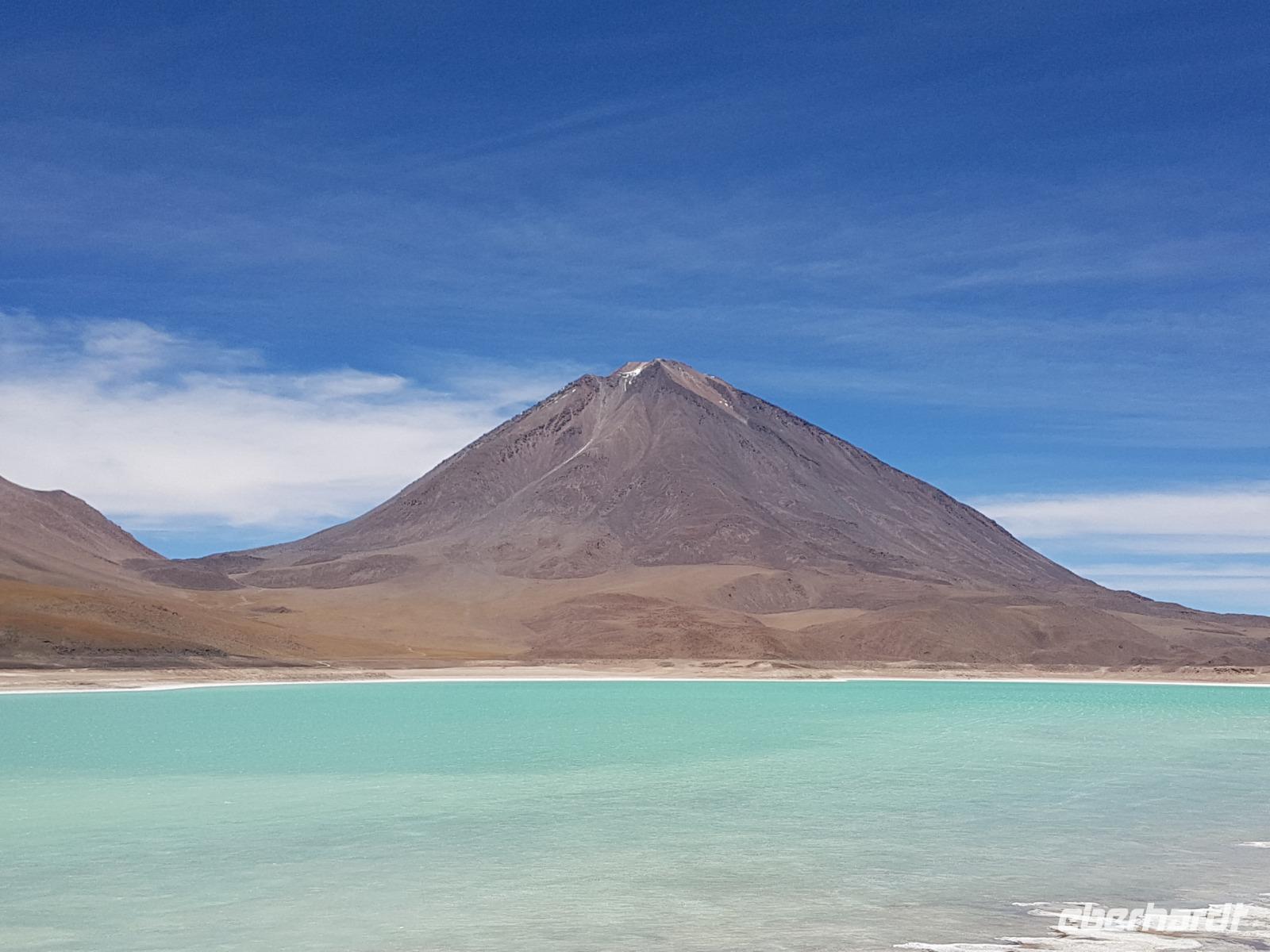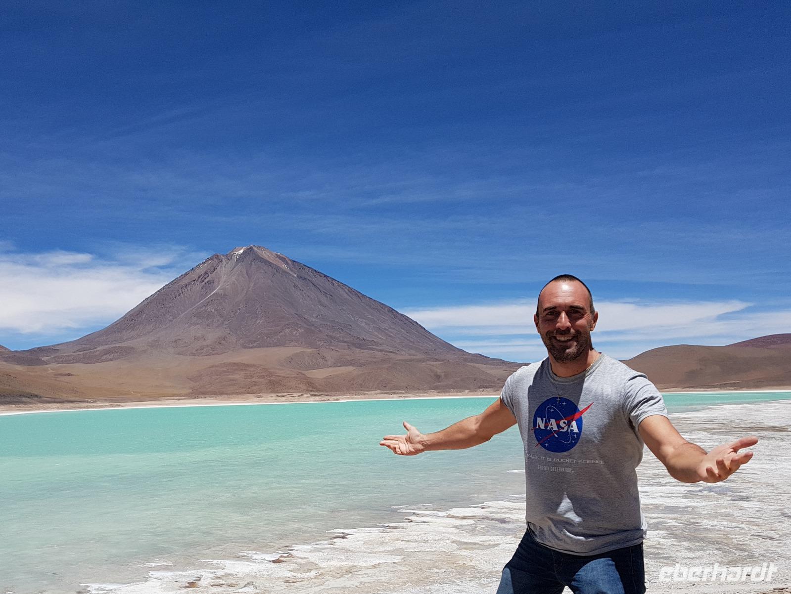 Anschließend fahren wir zur Salvador Dali Wüste. Es gibt mindestens ein Bild von Dali (die verlorene Zeit), das genau wie die Landschaft hier aussieht. Und Dali war nie hier... Echt schön. Wir sehen viele Lagunen aber die schönste wird noch kommen. Die Laguna Verde oder grüne Lagune. Wir haben Glück mit dem Wetter und die Lagune ist heute grün. Warum Glück? Man sieht nur die grüne Farbe, wenn der Wind bläst. Denn dann werden die Mineralien im Wasser aufgewirbelt und das Wasser erscheint in der grünen Farbe. Ich sehe die vielen Bilder tausend mal und jedes mal ist es schön. Diese besondere Lagune befindet sich ganz in der Nähe der chilenischen Grenze. Am Rand der grünen Lagune befindet sich der höchste Vulkan in der Region "Licancabur". Ein Vulkan, wie im Bilderbuch. Perfekt. Viele von uns haben, Gott sei Dank, viele schöne Dinge auf der Welt gesehen aber was wir in diesen Tagen sehen ist wie von einem anderen Planeten. Und das alles befindet sich im Naturschutzgebiet und National Park Eduardo Avaroa.