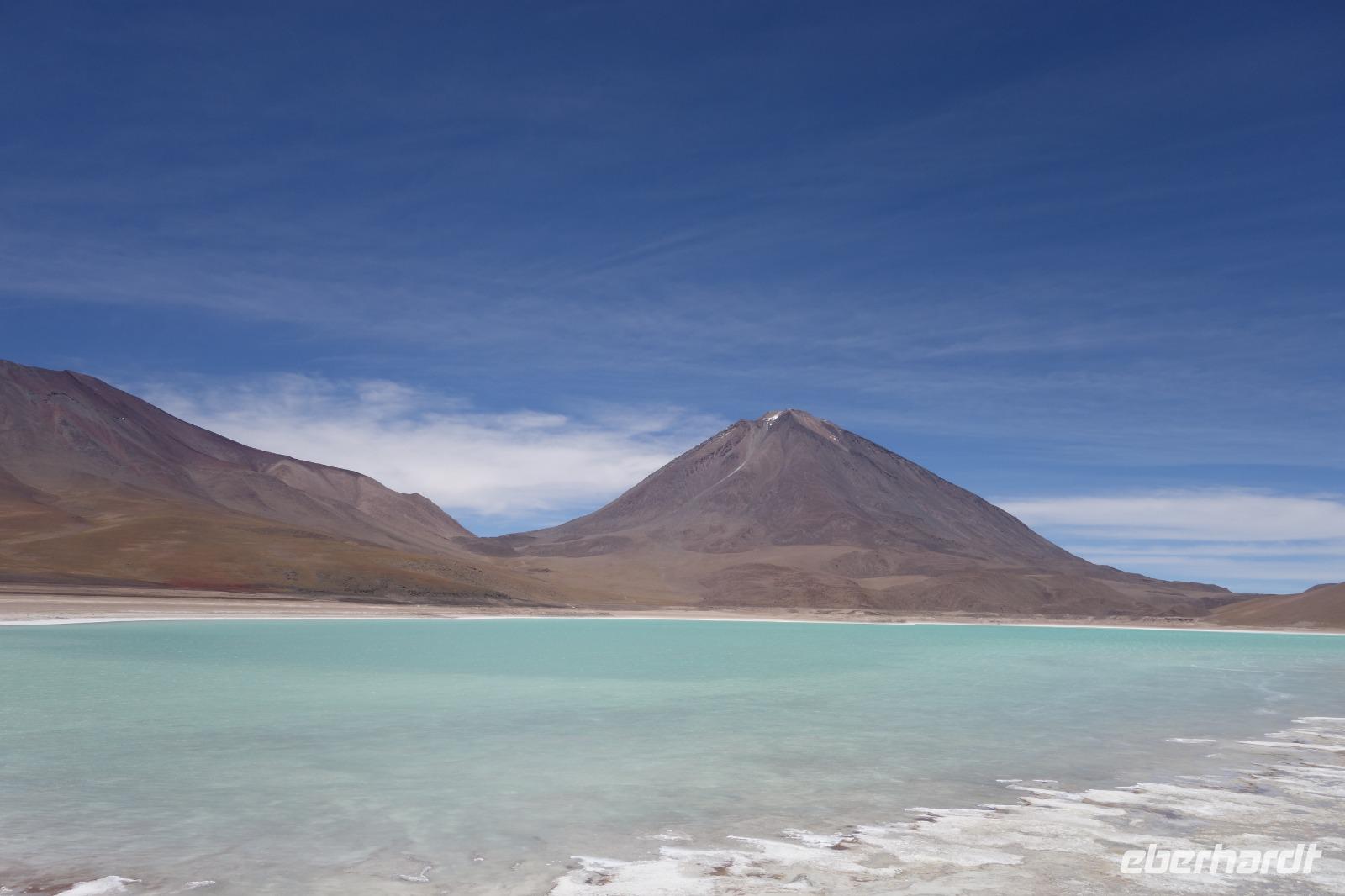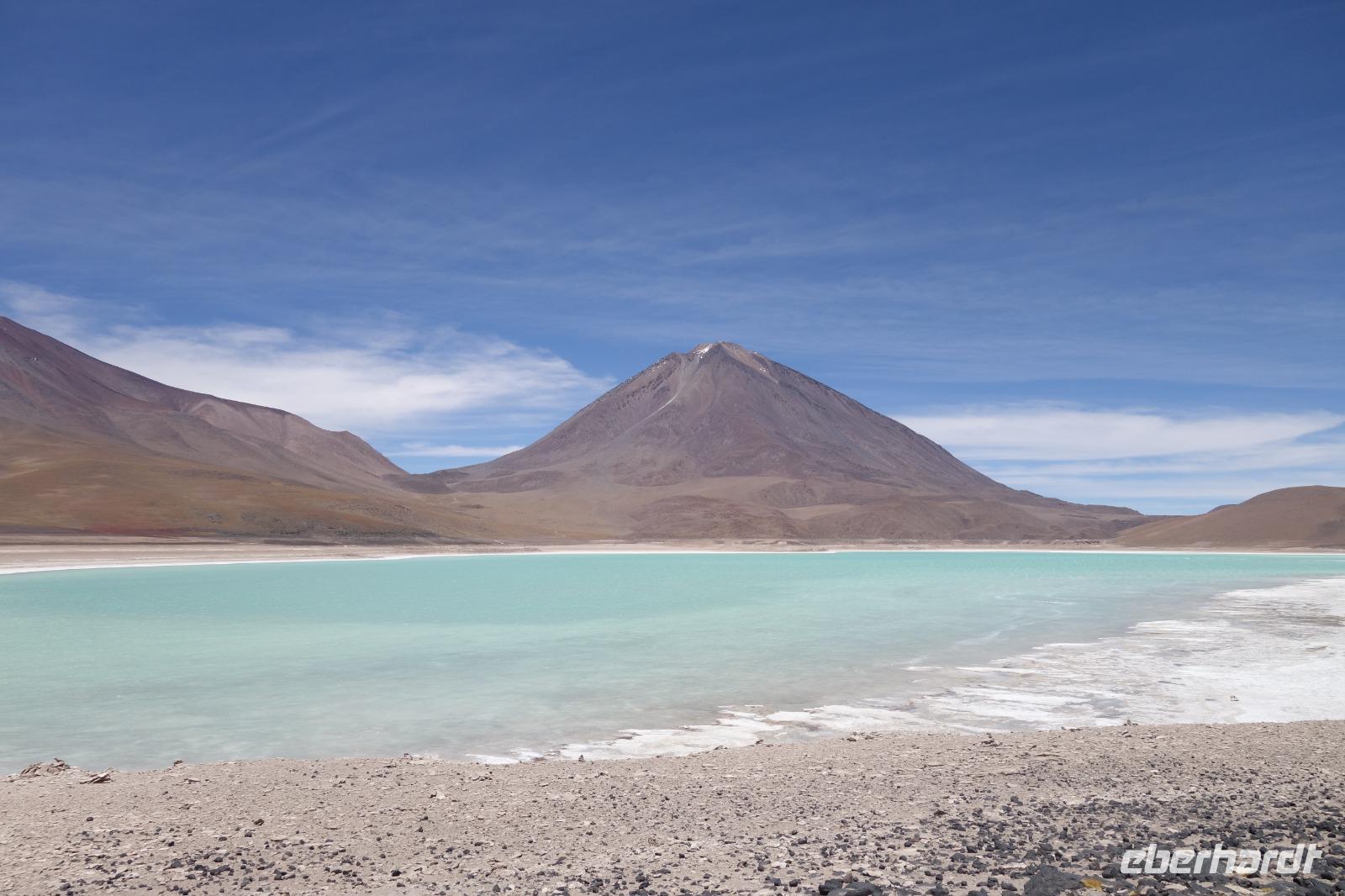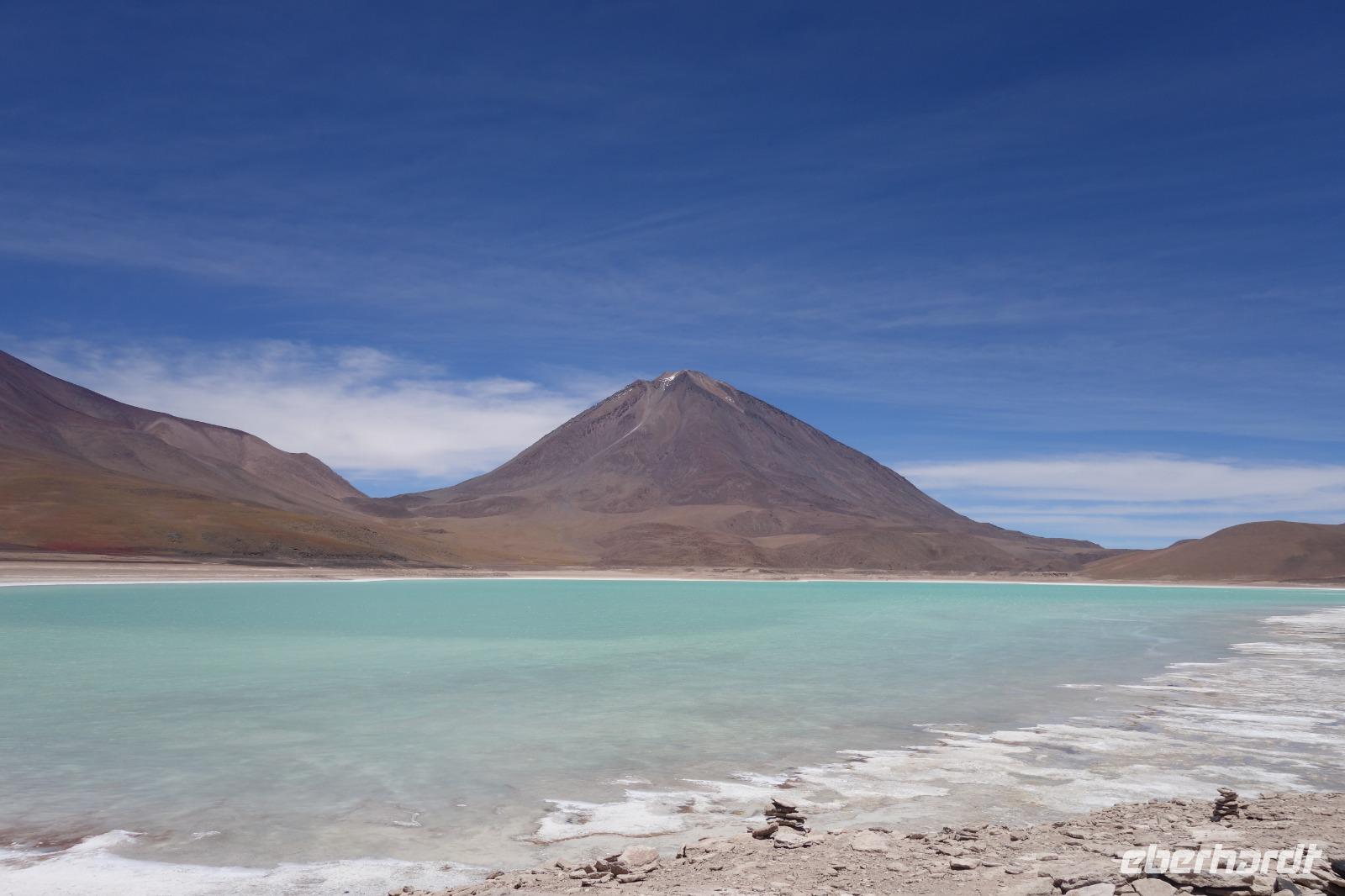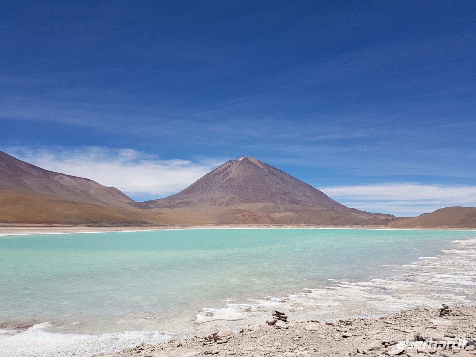 Anschließend fahren wir zur Salvador Dali Wüste. Es gibt mindestens ein Bild von Dali (die verlorene Zeit), das genau wie die Landschaft hier aussieht. Und Dali war nie hier... Echt schön. Wir sehen viele Lagunen aber die schönste wird noch kommen. Die Laguna Verde oder grüne Lagune. Wir haben Glück mit dem Wetter und die Lagune ist heute grün. Warum Glück? Man sieht nur die grüne Farbe, wenn der Wind bläst. Denn dann werden die Mineralien im Wasser aufgewirbelt und das Wasser erscheint in der grünen Farbe. Ich sehe die vielen Bilder tausend mal und jedes mal ist es schön. Diese besondere Lagune befindet sich ganz in der Nähe der chilenischen Grenze. Am Rand der grünen Lagune befindet sich der höchste Vulkan in der Region "Licancabur". Ein Vulkan, wie im Bilderbuch. Perfekt. Viele von uns haben, Gott sei Dank, viele schöne Dinge auf der Welt gesehen aber was wir in diesen Tagen sehen ist wie von einem anderen Planeten. Und das alles befindet sich im Naturschutzgebiet und National Park Eduardo Avaroa.