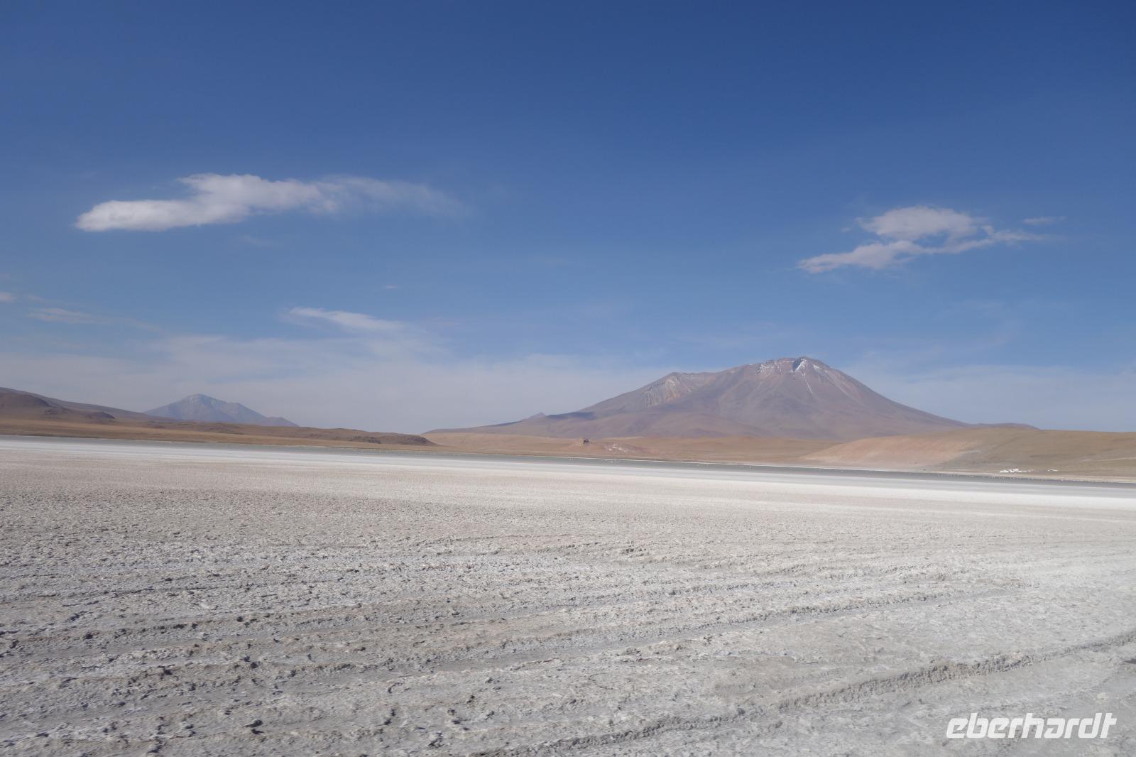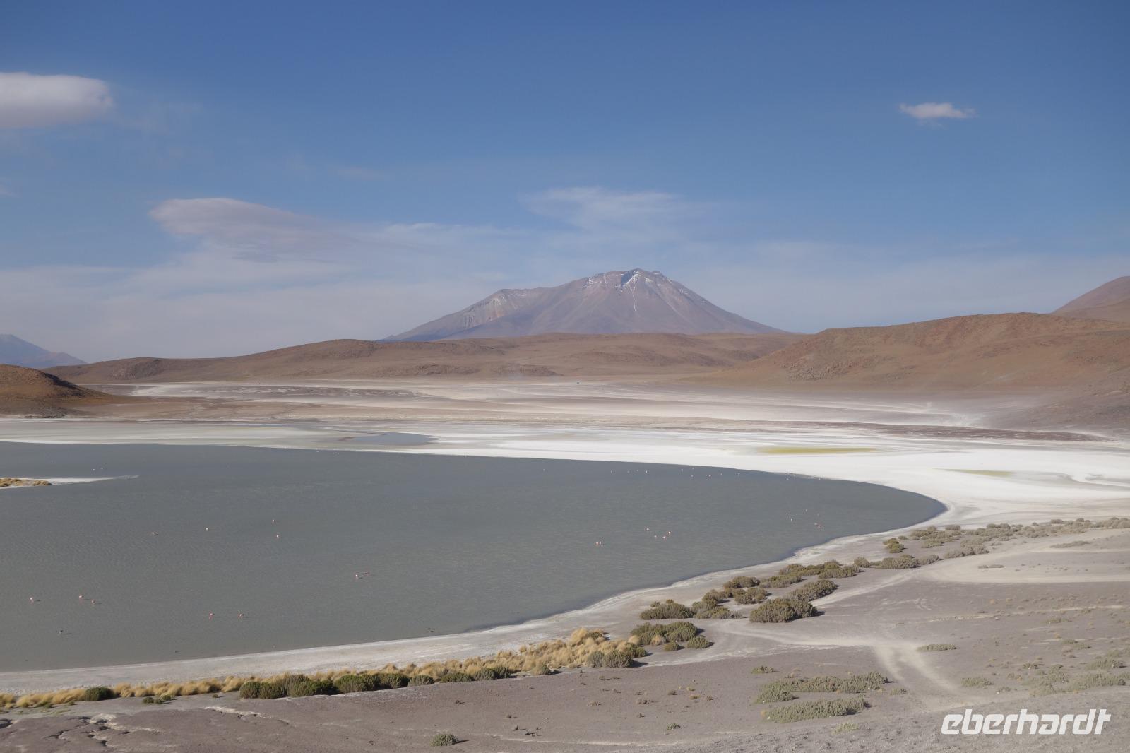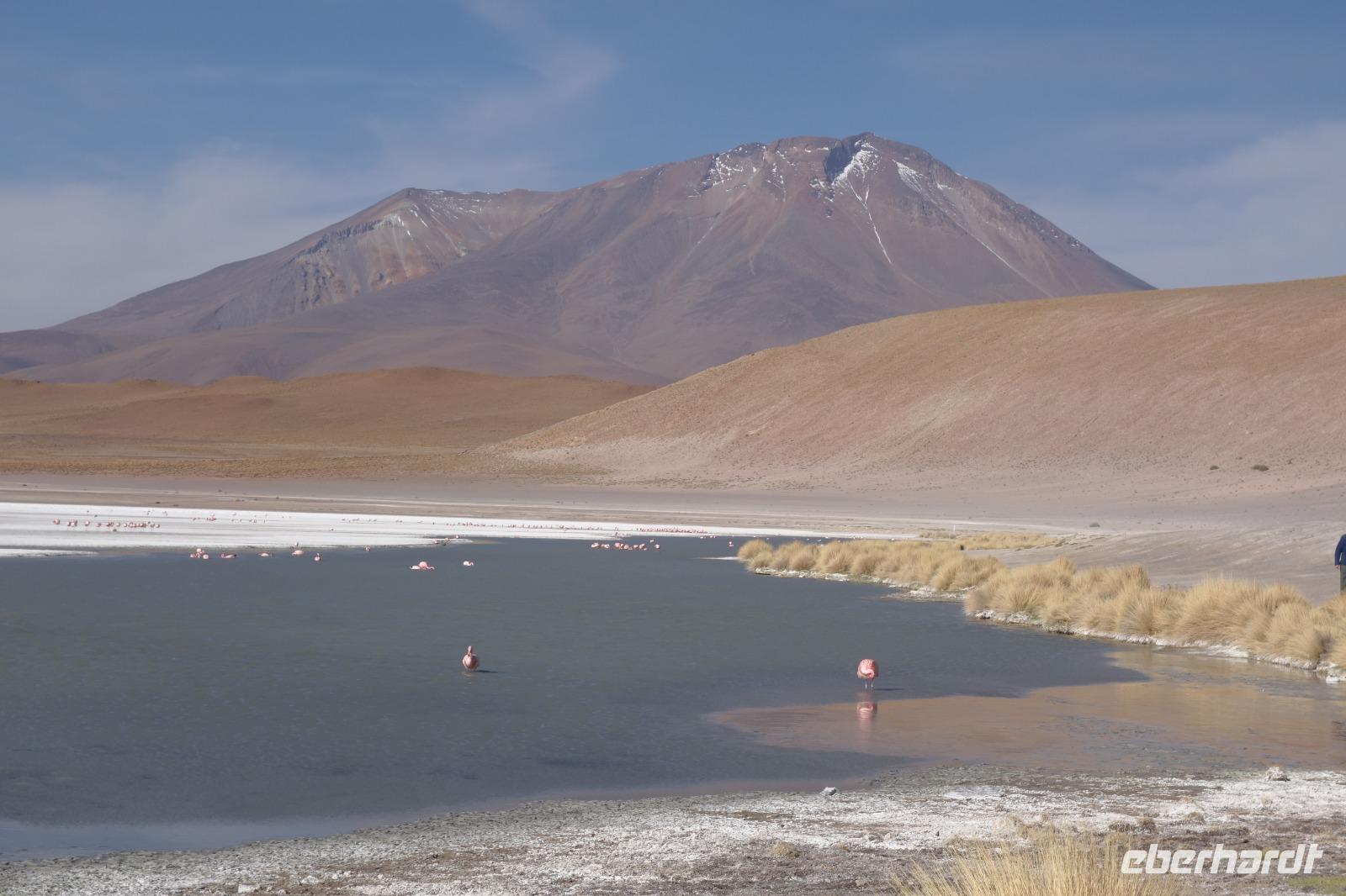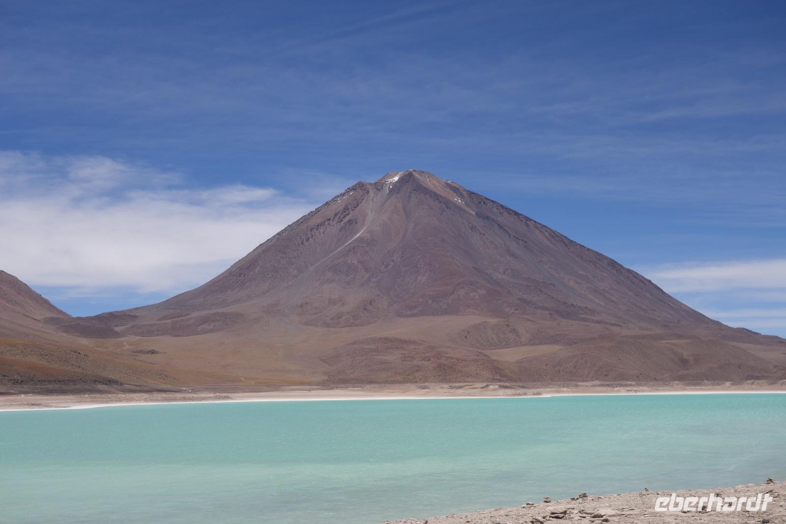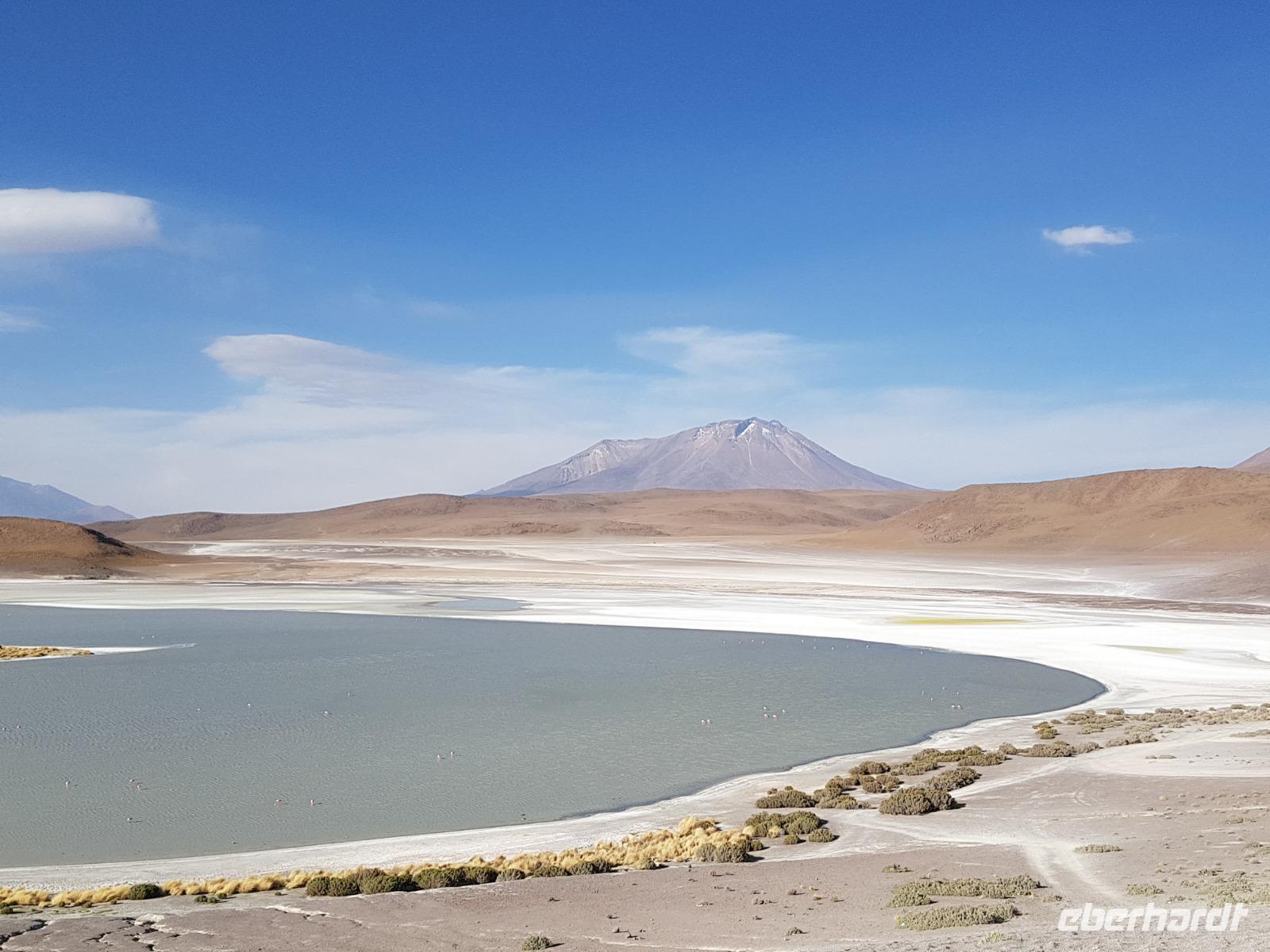 Anschließend fahren wir zur Salvador Dali Wüste. Es gibt mindestens ein Bild von Dali (die verlorene Zeit), das genau wie die Landschaft hier aussieht. Und Dali war nie hier... Echt schön. Wir sehen viele Lagunen aber die schönste wird noch kommen. Die Laguna Verde oder grüne Lagune. Wir haben Glück mit dem Wetter und die Lagune ist heute grün. Warum Glück? Man sieht nur die grüne Farbe, wenn der Wind bläst. Denn dann werden die Mineralien im Wasser aufgewirbelt und das Wasser erscheint in der grünen Farbe. Ich sehe die vielen Bilder tausend mal und jedes mal ist es schön. Diese besondere Lagune befindet sich ganz in der Nähe der chilenischen Grenze. Am Rand der grünen Lagune befindet sich der höchste Vulkan in der Region "Licancabur". Ein Vulkan, wie im Bilderbuch. Perfekt. Viele von uns haben, Gott sei Dank, viele schöne Dinge auf der Welt gesehen aber was wir in diesen Tagen sehen ist wie von einem anderen Planeten. Und das alles befindet sich im Naturschutzgebiet und National Park Eduardo Avaroa.