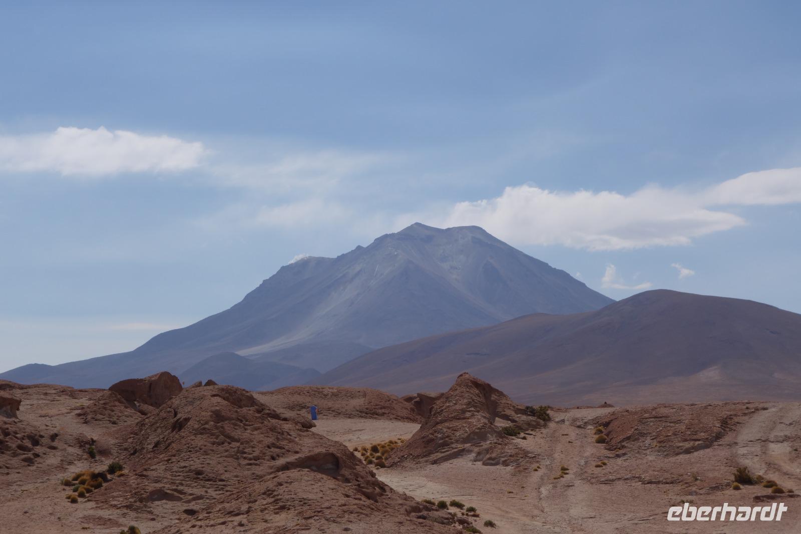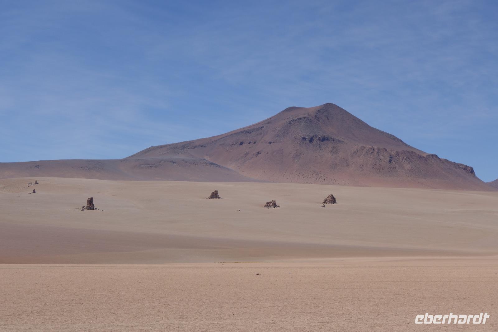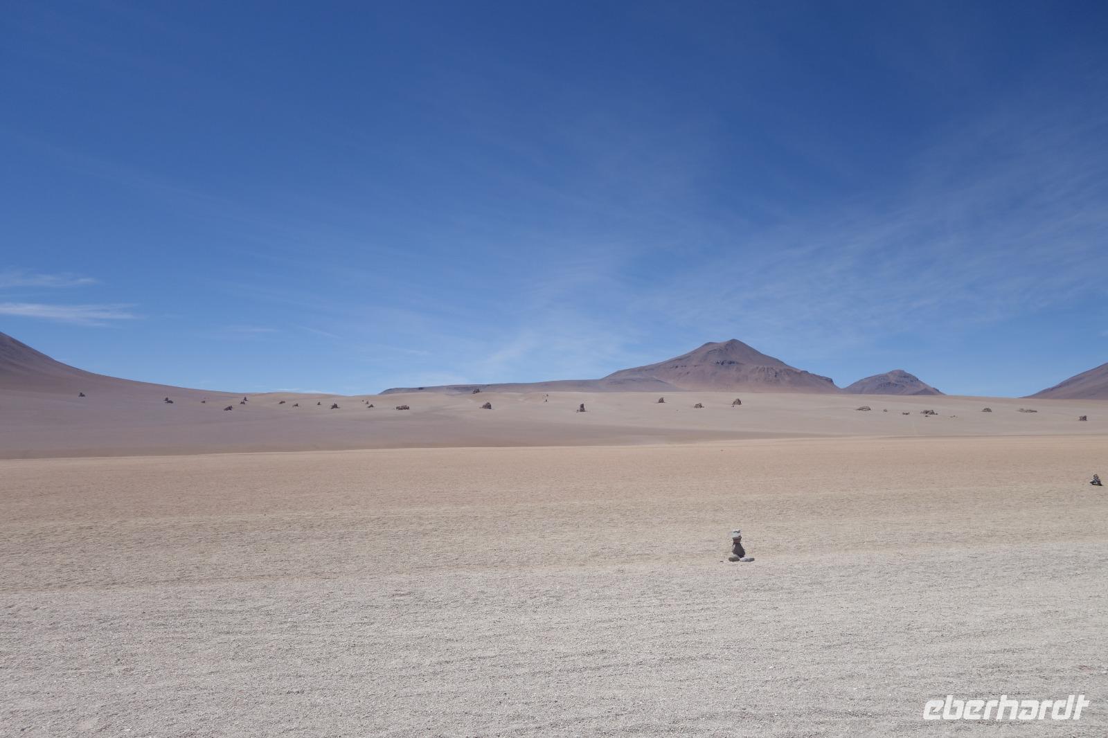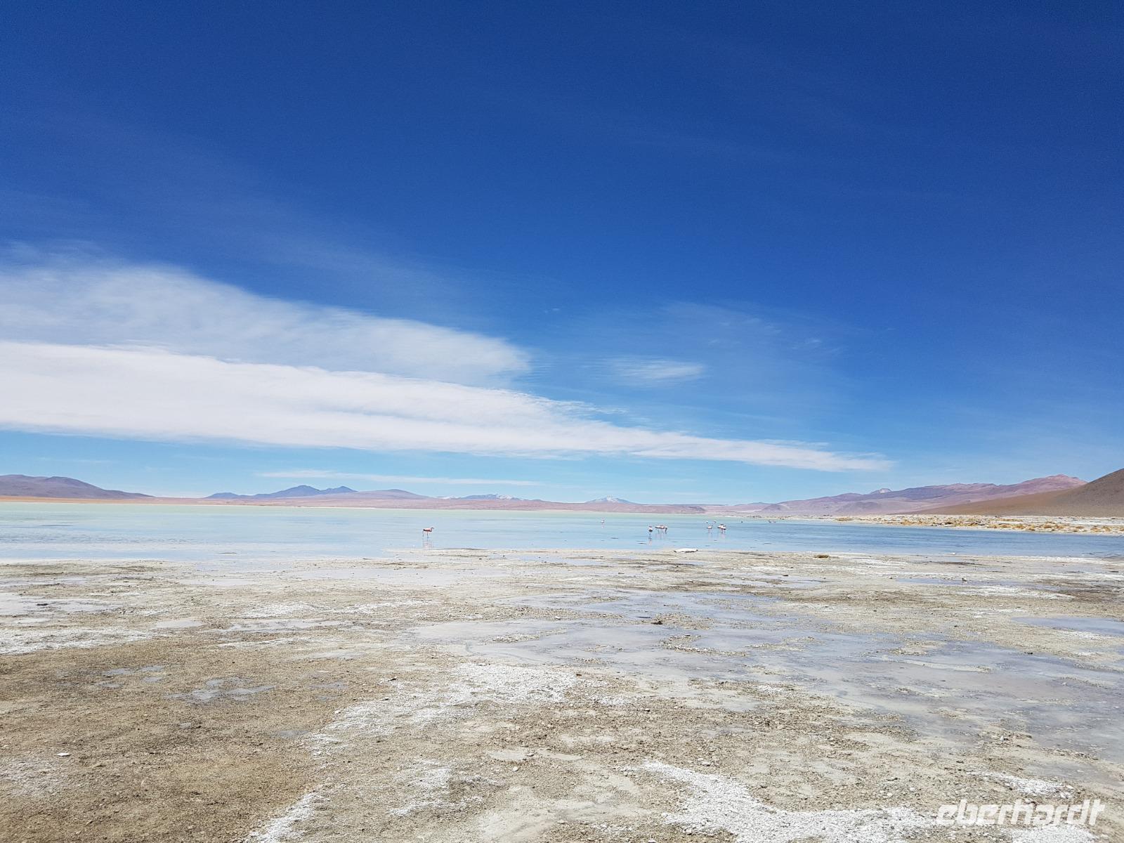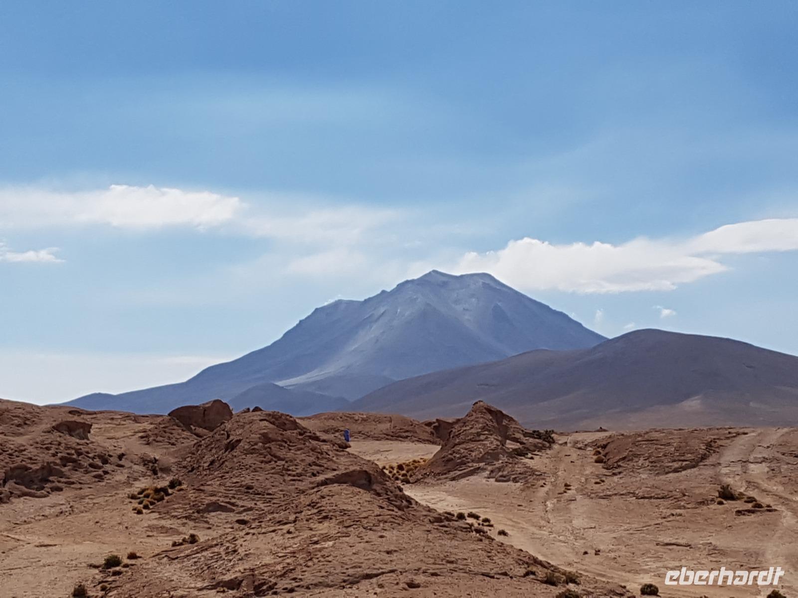 Anschließend fahren wir zur Salvador Dali Wüste. Es gibt mindestens ein Bild von Dali (die verlorene Zeit), das genau wie die Landschaft hier aussieht. Und Dali war nie hier... Echt schön. Wir sehen viele Lagunen aber die schönste wird noch kommen. Die Laguna Verde oder grüne Lagune. Wir haben Glück mit dem Wetter und die Lagune ist heute grün. Warum Glück? Man sieht nur die grüne Farbe, wenn der Wind bläst. Denn dann werden die Mineralien im Wasser aufgewirbelt und das Wasser erscheint in der grünen Farbe. Ich sehe die vielen Bilder tausend mal und jedes mal ist es schön. Diese besondere Lagune befindet sich ganz in der Nähe der chilenischen Grenze. Am Rand der grünen Lagune befindet sich der höchste Vulkan in der Region "Licancabur". Ein Vulkan, wie im Bilderbuch. Perfekt. Viele von uns haben, Gott sei Dank, viele schöne Dinge auf der Welt gesehen aber was wir in diesen Tagen sehen ist wie von einem anderen Planeten. Und das alles befindet sich im Naturschutzgebiet und National Park Eduardo Avaroa.