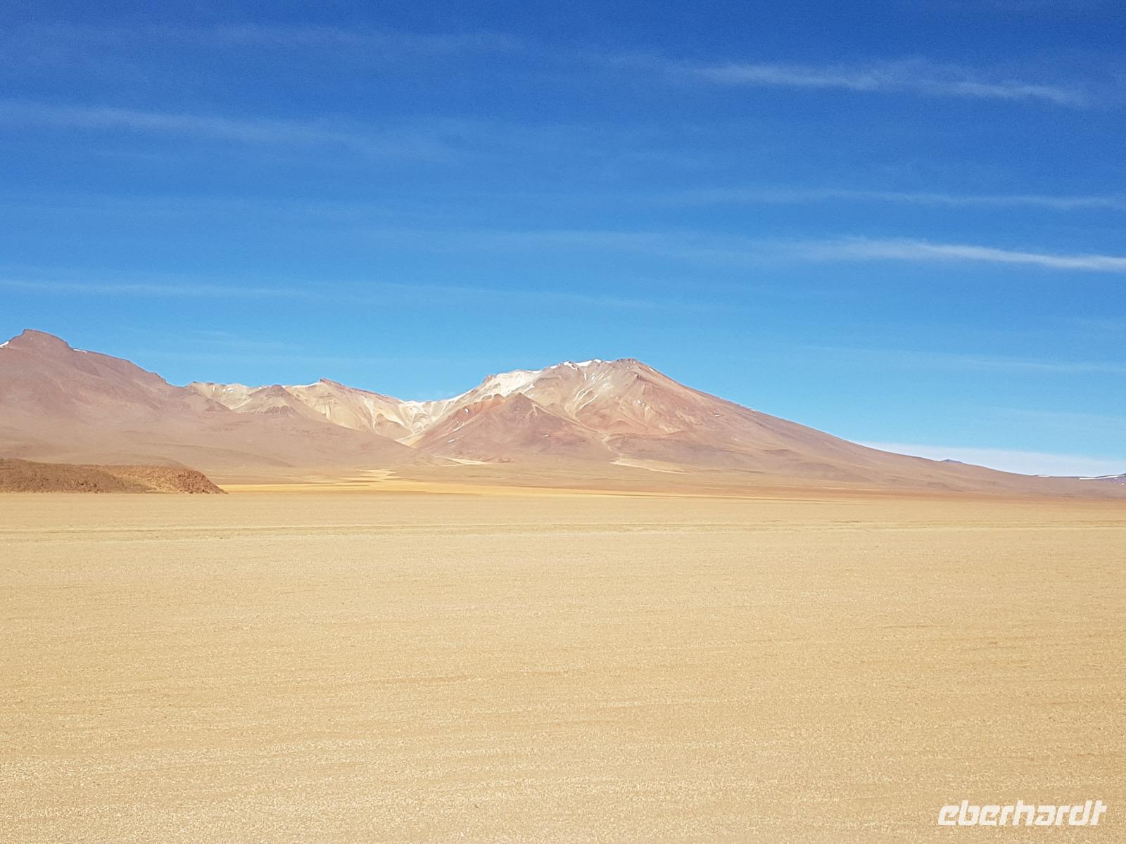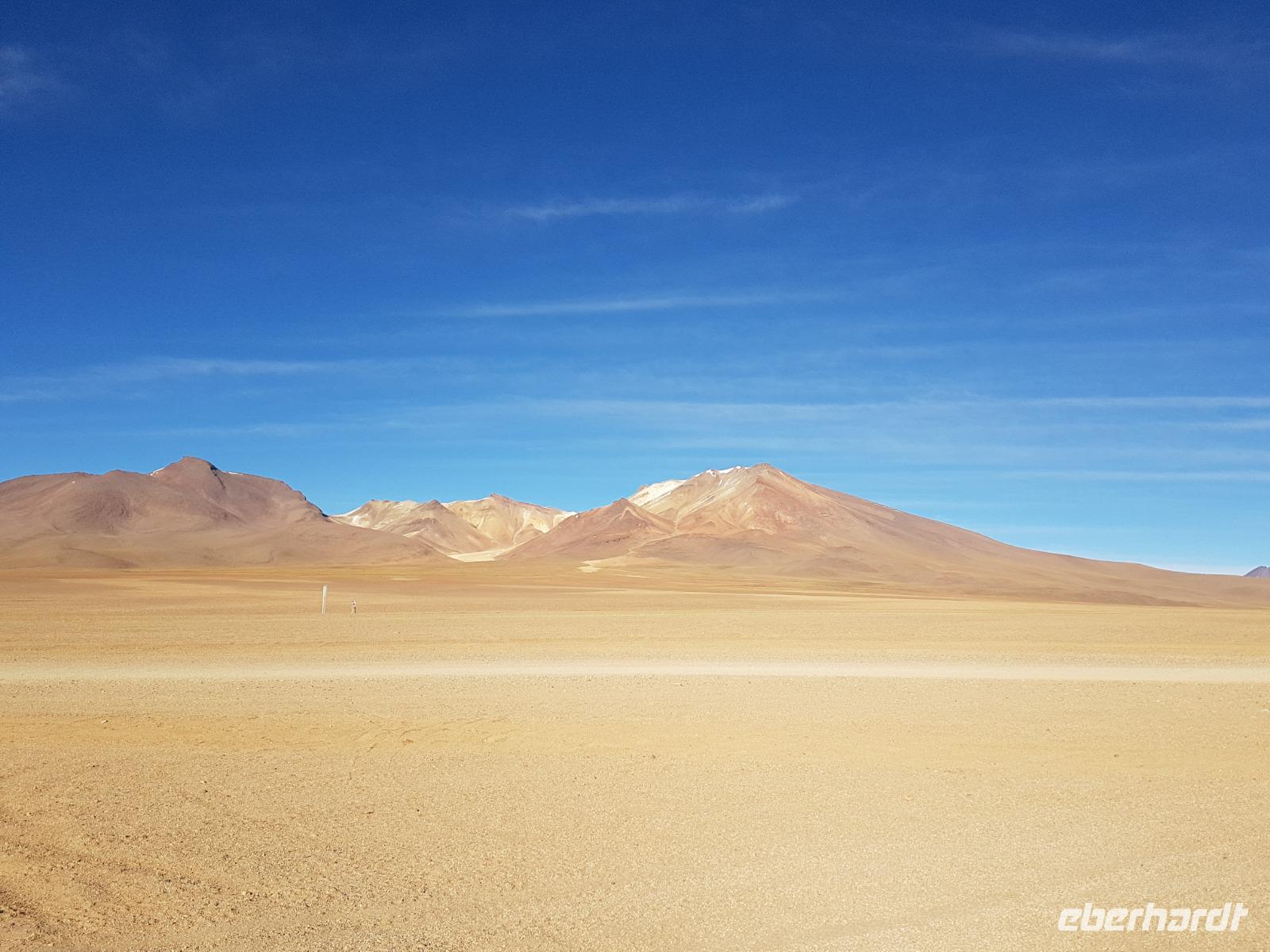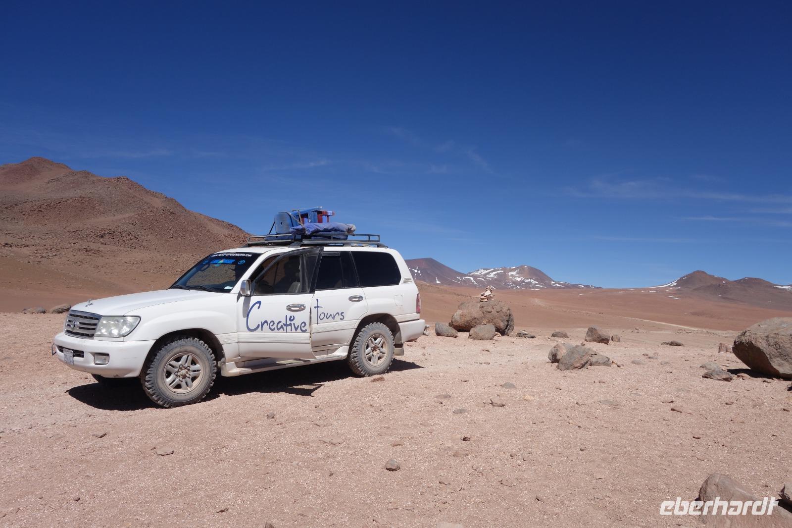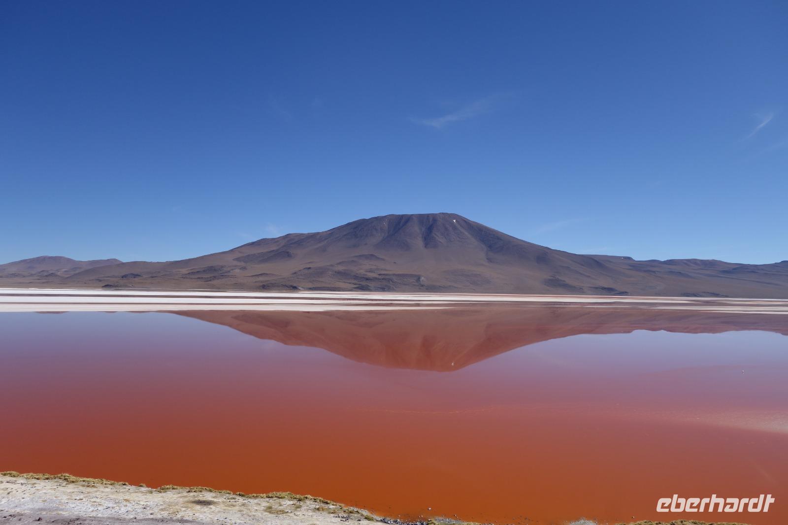 Anschließend fahren wir zur Salvador Dali Wüste. Es gibt mindestens ein Bild von Dali (die verlorene Zeit), das genau wie die Landschaft hier aussieht. Und Dali war nie hier... Echt schön. Wir sehen viele Lagunen aber die schönste wird noch kommen. Die Laguna Verde oder grüne Lagune. Wir haben Glück mit dem Wetter und die Lagune ist heute grün. Warum Glück? Man sieht nur die grüne Farbe, wenn der Wind bläst. Denn dann werden die Mineralien im Wasser aufgewirbelt und das Wasser erscheint in der grünen Farbe. Ich sehe die vielen Bilder tausend mal und jedes mal ist es schön. Diese besondere Lagune befindet sich ganz in der Nähe der chilenischen Grenze. Am Rand der grünen Lagune befindet sich der höchste Vulkan in der Region "Licancabur". Ein Vulkan, wie im Bilderbuch. Perfekt. Viele von uns haben, Gott sei Dank, viele schöne Dinge auf der Welt gesehen aber was wir in diesen Tagen sehen ist wie von einem anderen Planeten. Und das alles befindet sich im Naturschutzgebiet und National Park Eduardo Avaroa.