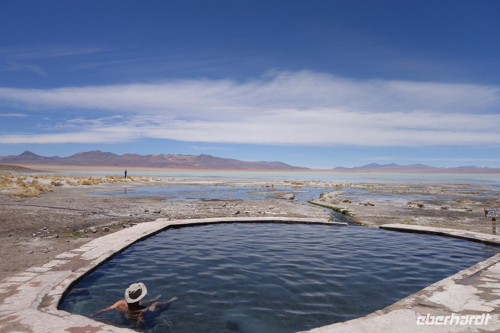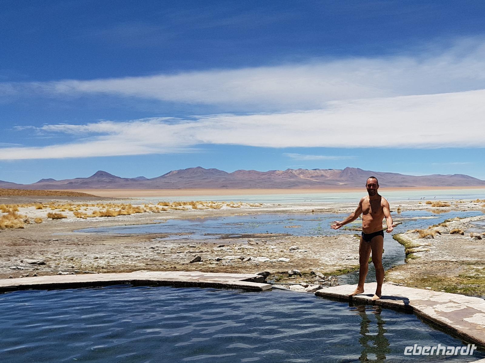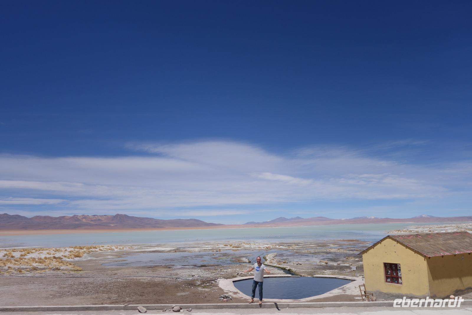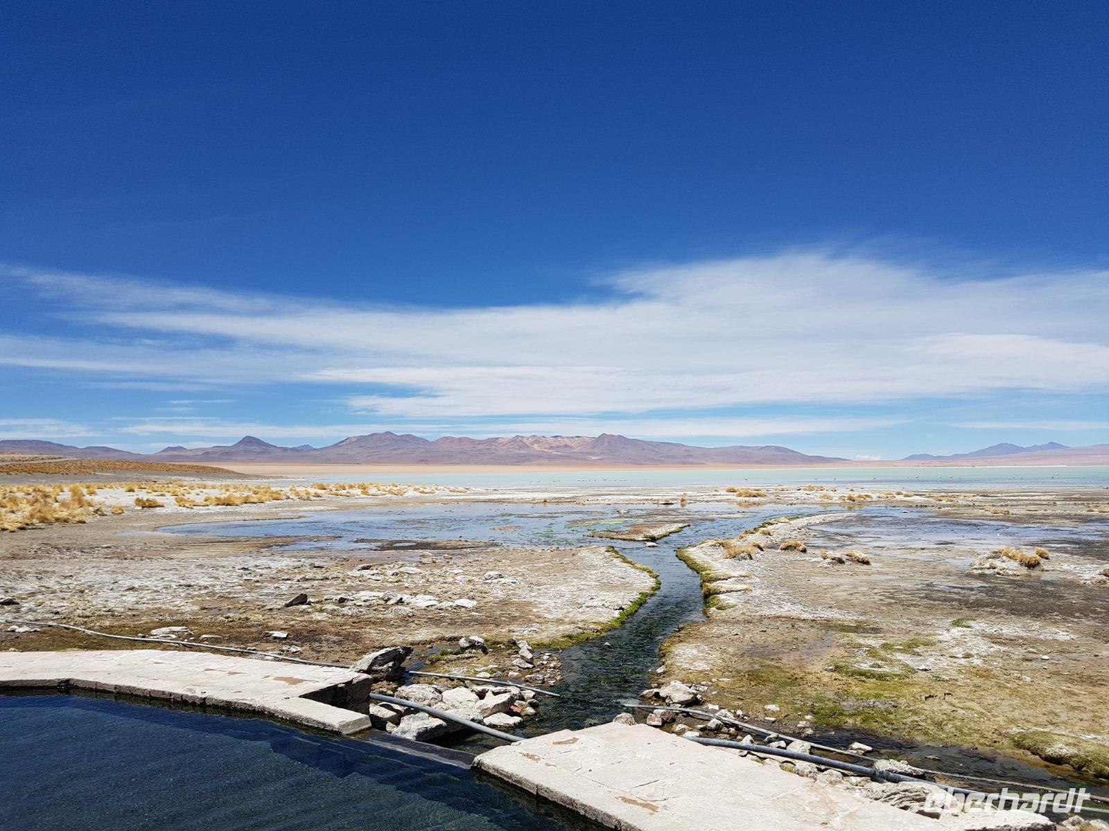 Wir fahren nochmal bei Aguas Termales vorbei und während unsere 2 Fahrer das Mittagessen vorbereiten, können wir kurz in den heißen Quellen, die mit warmem Wasser direkt aus der Erde gefüllt sind, baden. Herrlich, so wie das Mittagessen mit Blick auf die Lagune und den Flamingos und Vulkanen im Hintergrund. Bolivien sollte jeder Weltreisende einmal besuchen. Aber richtig, so wie wir. Wir fahren am Nachmittag zurück und erreichen am Abend wieder das schöne Uyuni. Nach einer 3-stündigen Fahrt erreichen wir unser Hotel. Auf dem Weg machen wir noch schöne Photostops. Die Landschaft ist ein Traum. Wir übernachten wieder im selben Hotel "Jardines de Uyuni". Wir wollen erstmal eine warme Dusche nehmen und da das Mittagessen so gut war, brauchen wir abends nicht mehr viel zu essen.