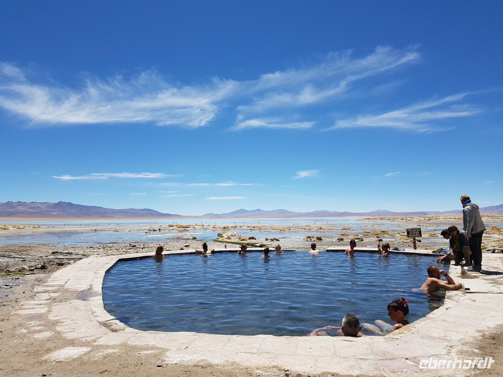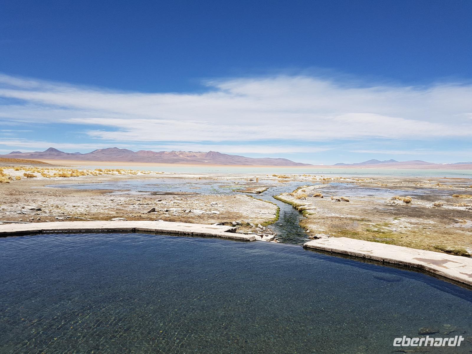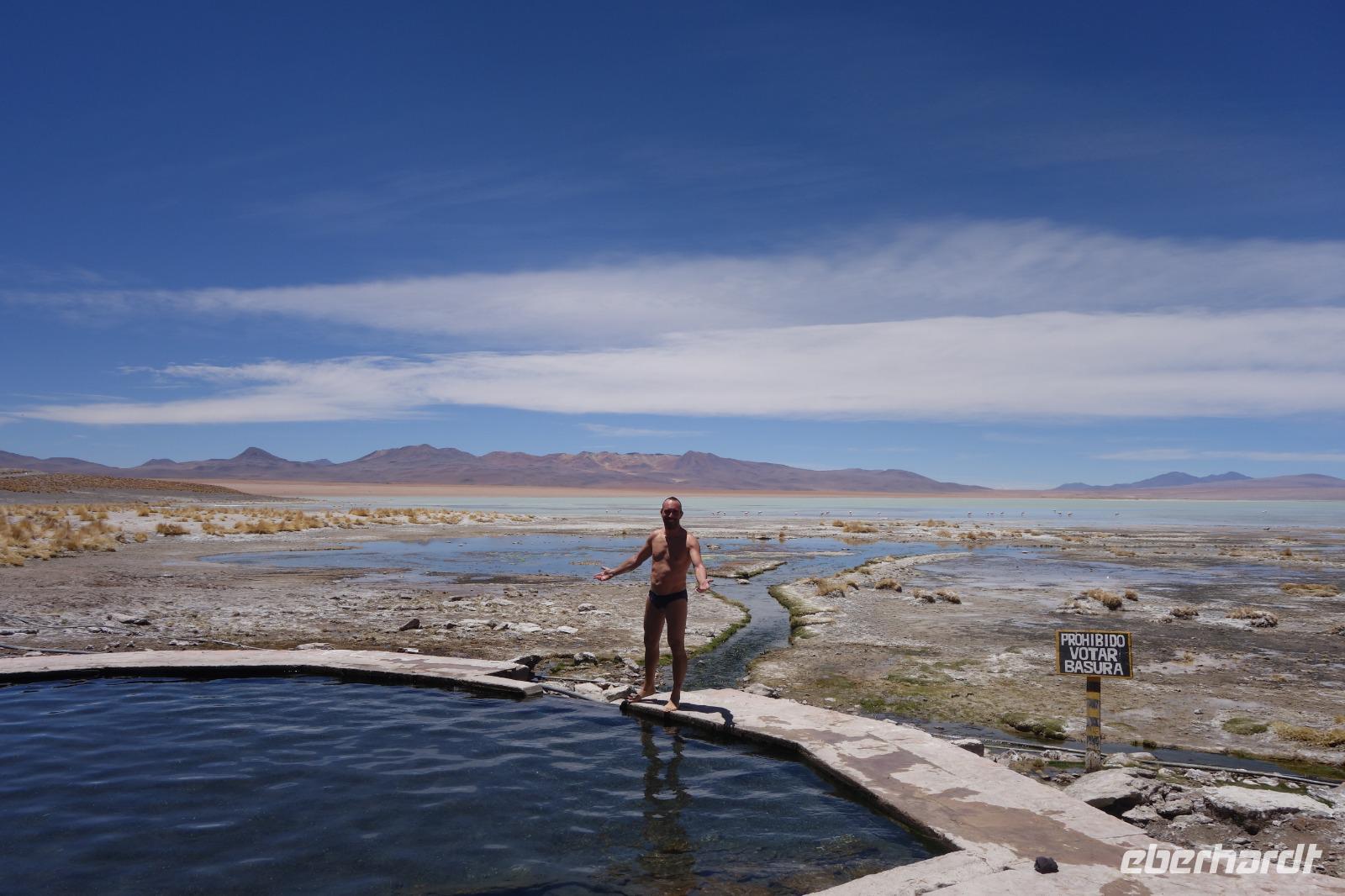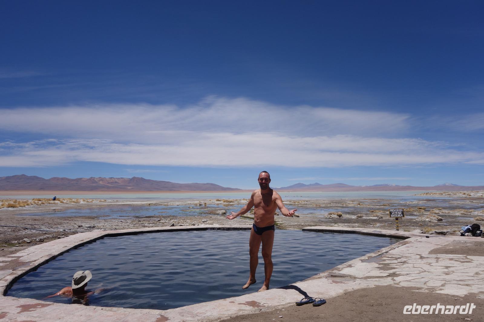 Wir fahren nochmal bei Aguas Termales vorbei und während unsere 2 Fahrer das Mittagessen vorbereiten, können wir kurz in den heißen Quellen, die mit warmem Wasser direkt aus der Erde gefüllt sind, baden. Herrlich, so wie das Mittagessen mit Blick auf die Lagune und den Flamingos und Vulkanen im Hintergrund. Bolivien sollte jeder Weltreisende einmal besuchen. Aber richtig, so wie wir. Wir fahren am Nachmittag zurück und erreichen am Abend wieder das schöne Uyuni. Nach einer 3-stündigen Fahrt erreichen wir unser Hotel. Auf dem Weg machen wir noch schöne Photostops. Die Landschaft ist ein Traum. Wir übernachten wieder im selben Hotel "Jardines de Uyuni". Wir wollen erstmal eine warme Dusche nehmen und da das Mittagessen so gut war, brauchen wir abends nicht mehr viel zu essen.